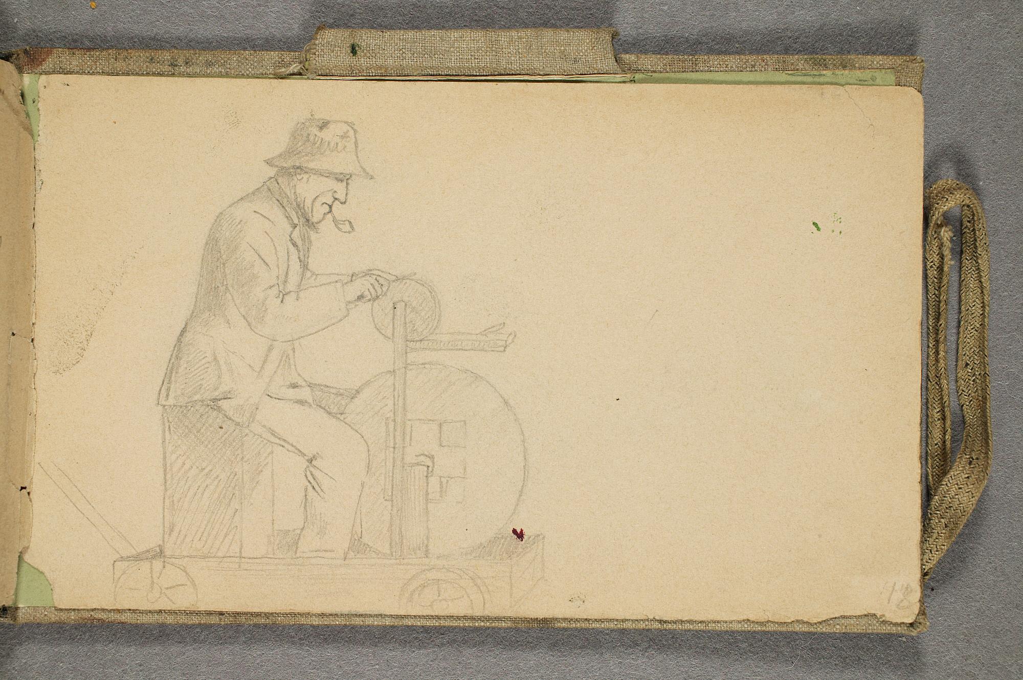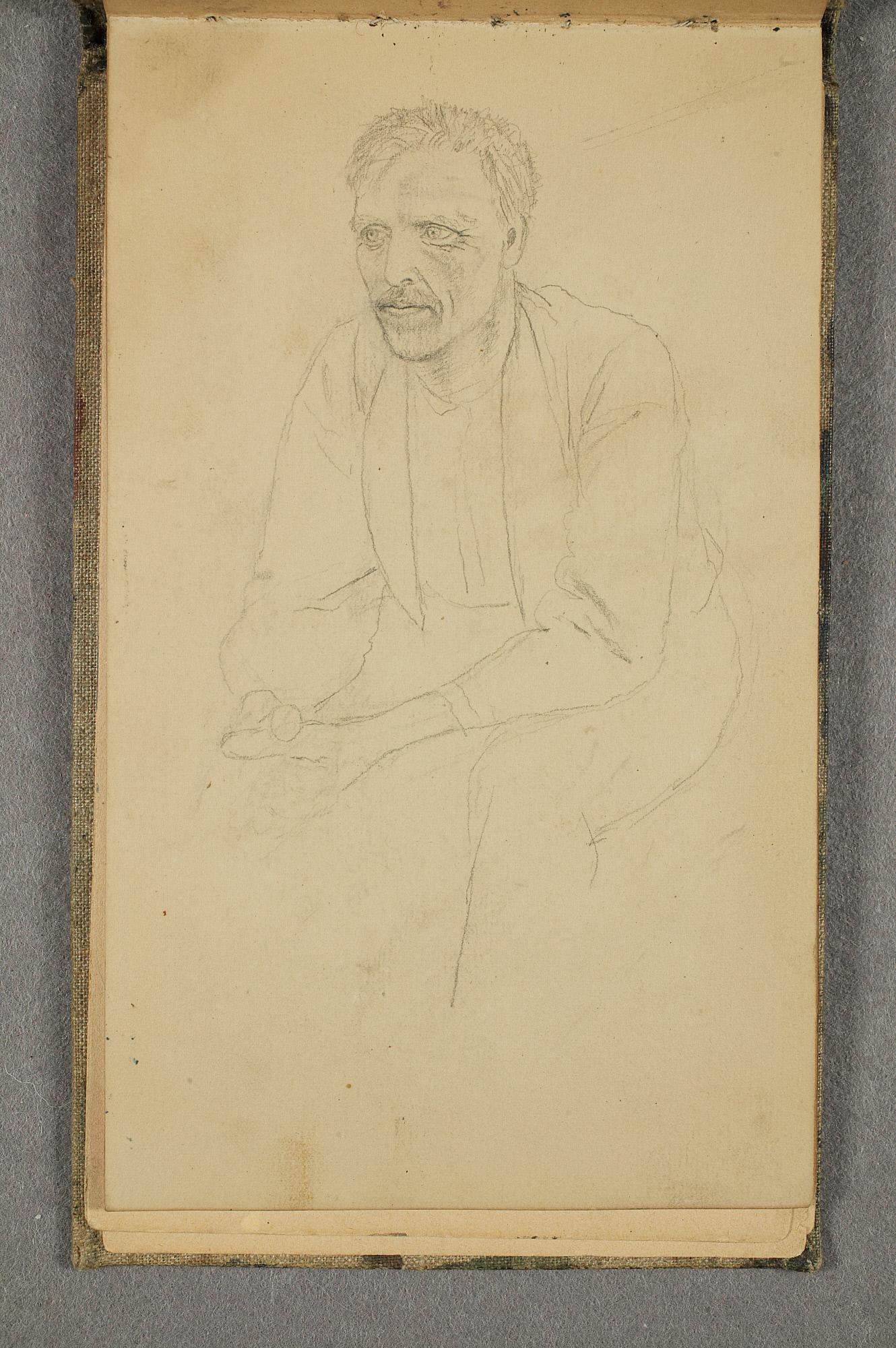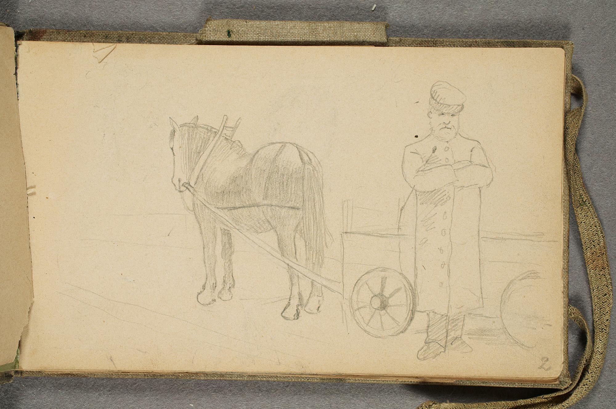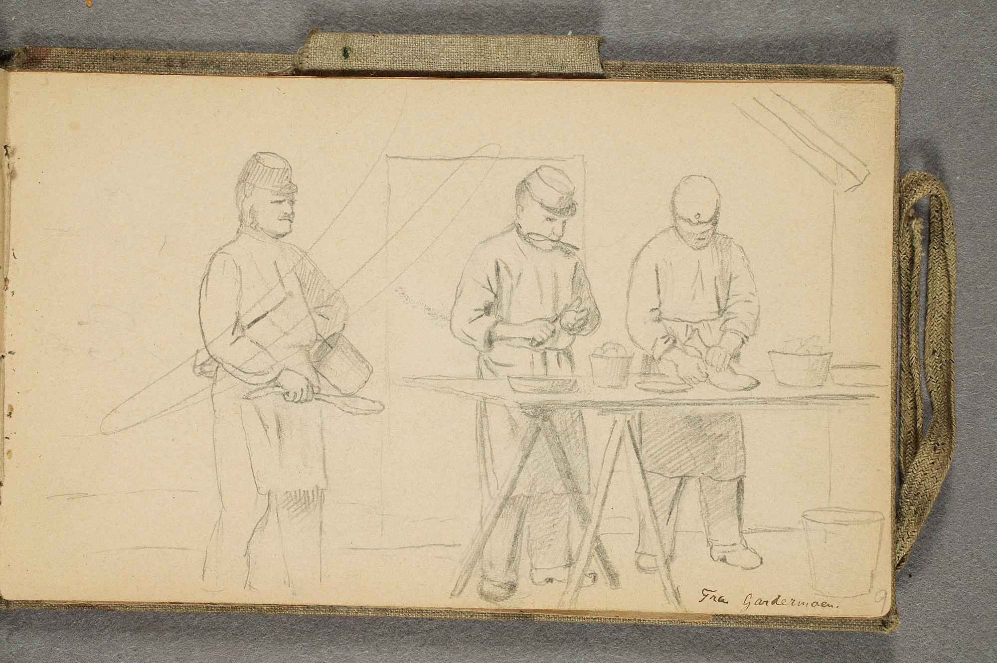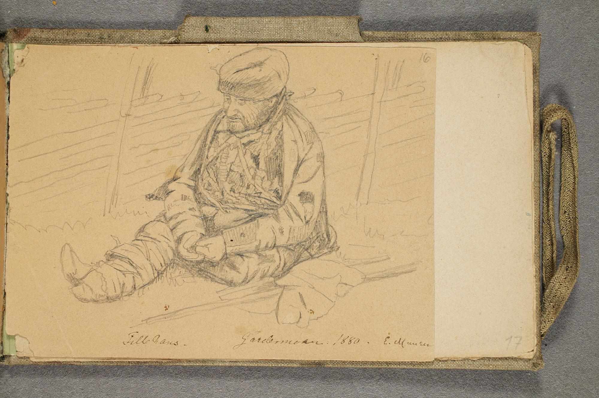 Comment:From the age of thirteen Edvard was allowed to accompany his father, the military doctor Christian Munch, to the military camps at Gardermoen and Helgelandsmoen. The atmosphere inside as well as outside the camps was strange and fascinating for young Edvard, with soldiers, horse traders, itinerate knife sharpeners, beggars and even travelling jugglers. In this sketchbook he has depicted many sides of life at Gerdermoen in summer 1880.