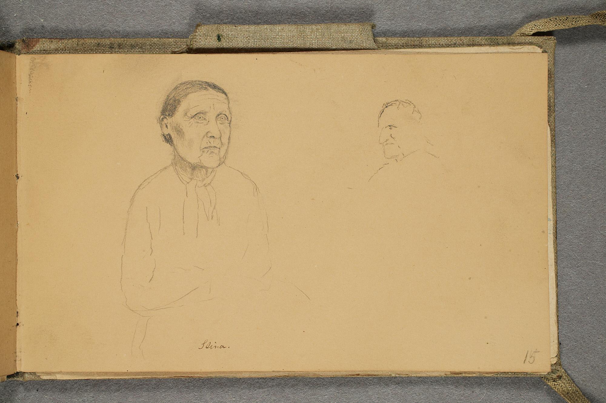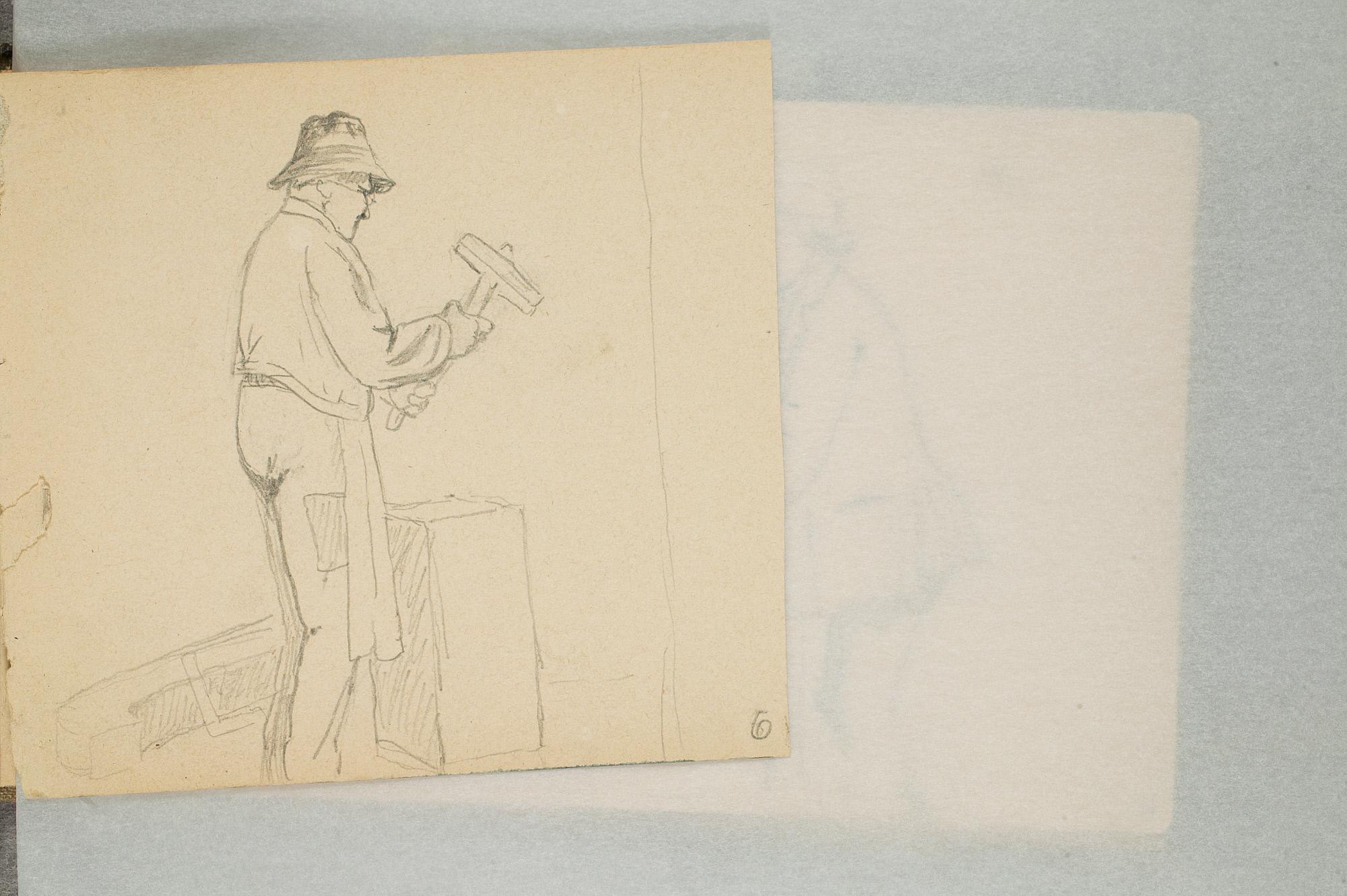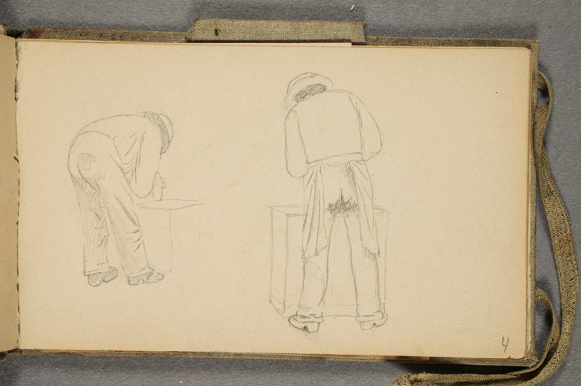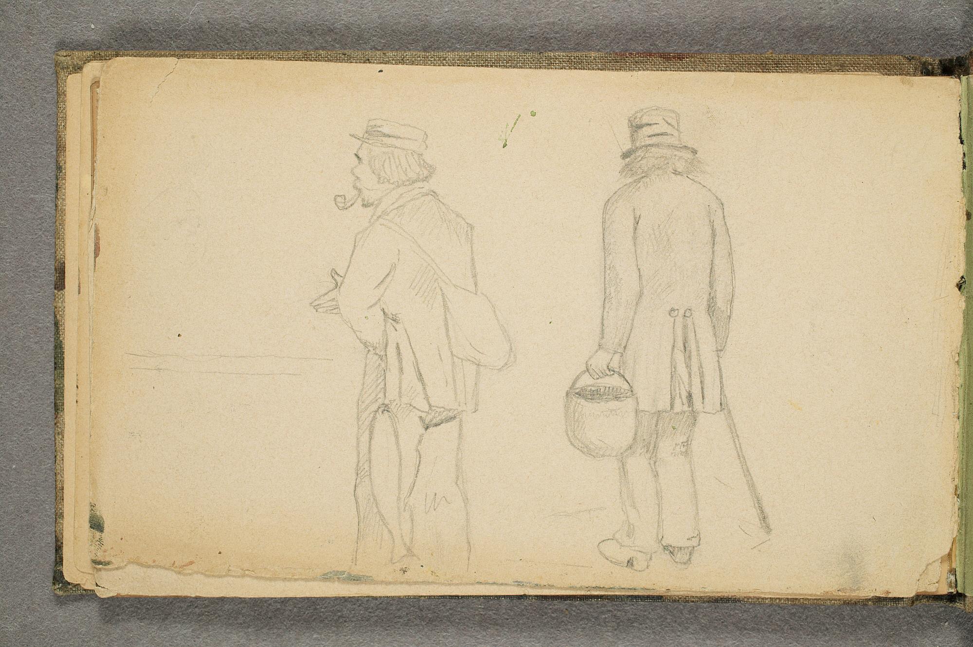 Comment:From the age of thirteen Edvard was allowed to accompany his father, the military doctor Christian Munch, to the military camps at Gardermoen and Helgelandsmoen. The atmosphere inside as well as outside the camps was strange and fascinating for young Edvard, with soldiers, horse traders, itinerate knife sharpeners, beggars and even travelling jugglers. In this sketchbook he has depicted many sides of life at Gerdermoen in summer 1880.
