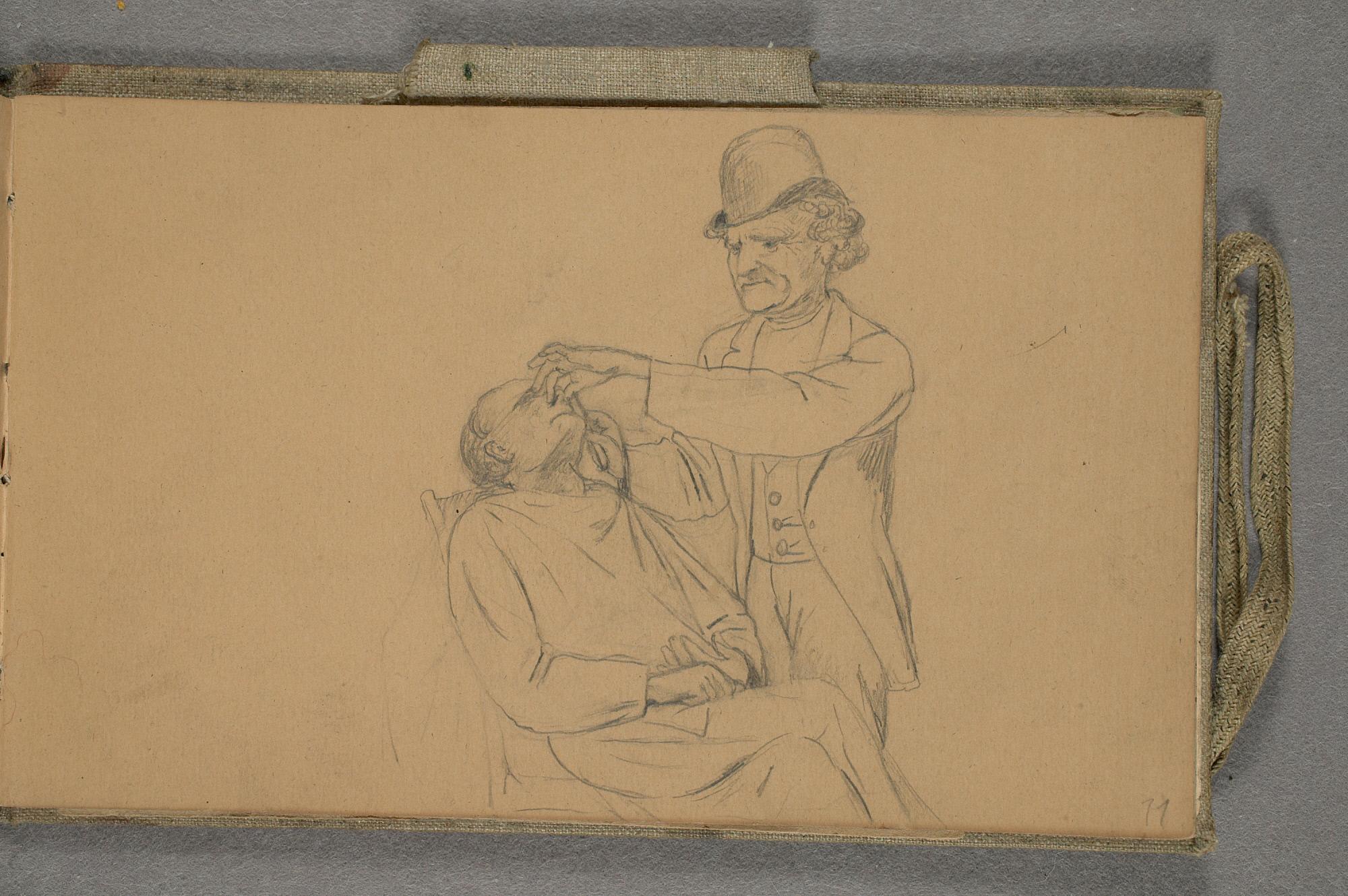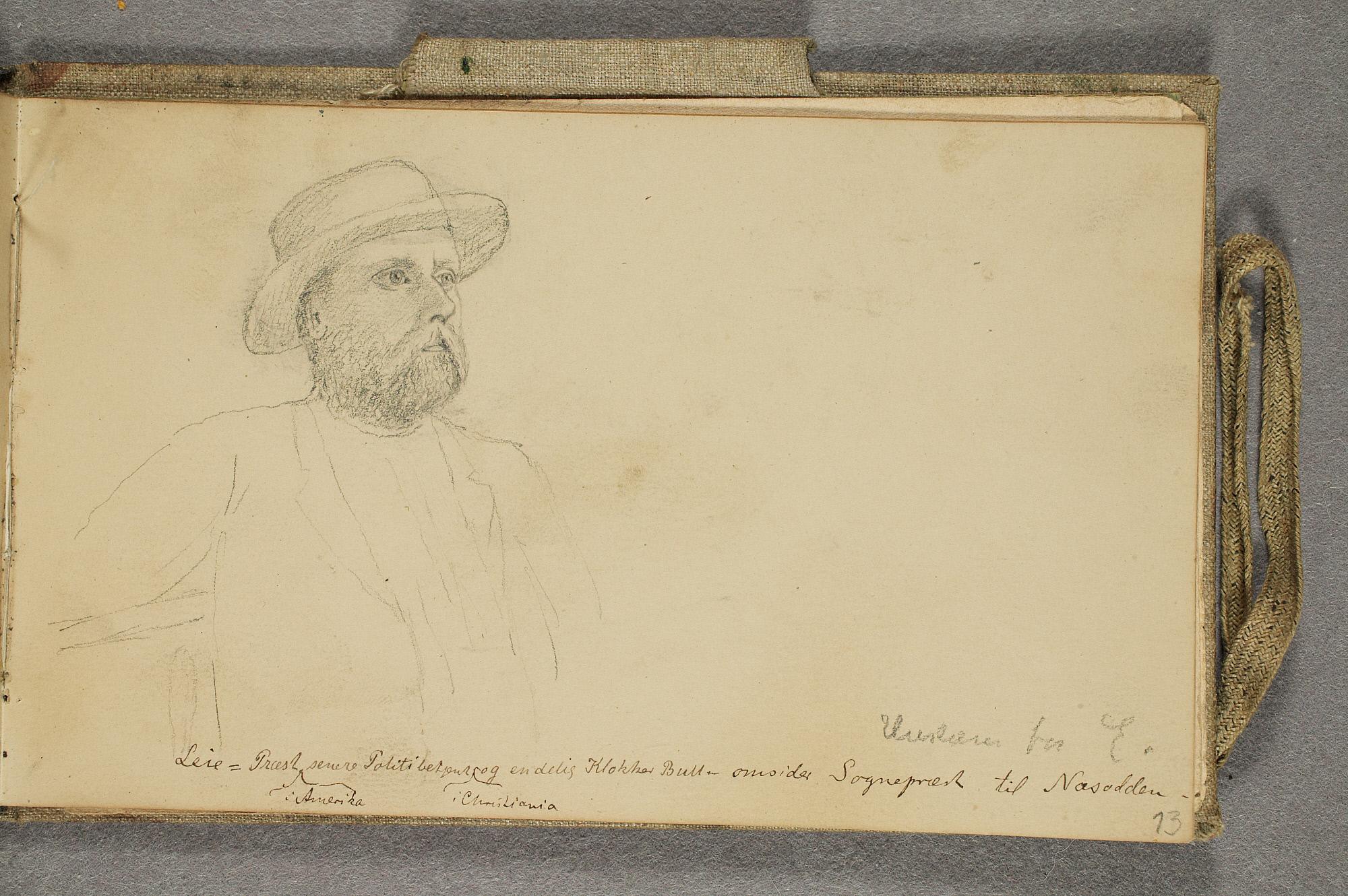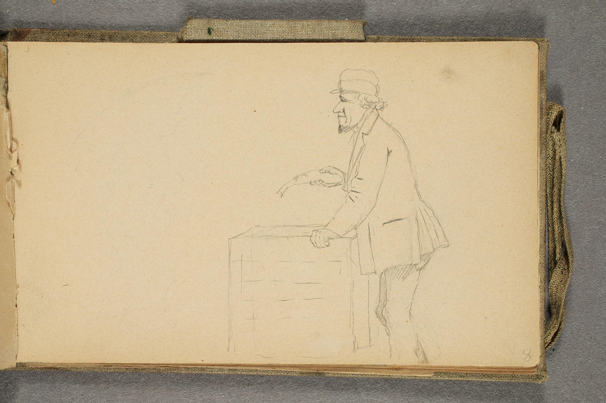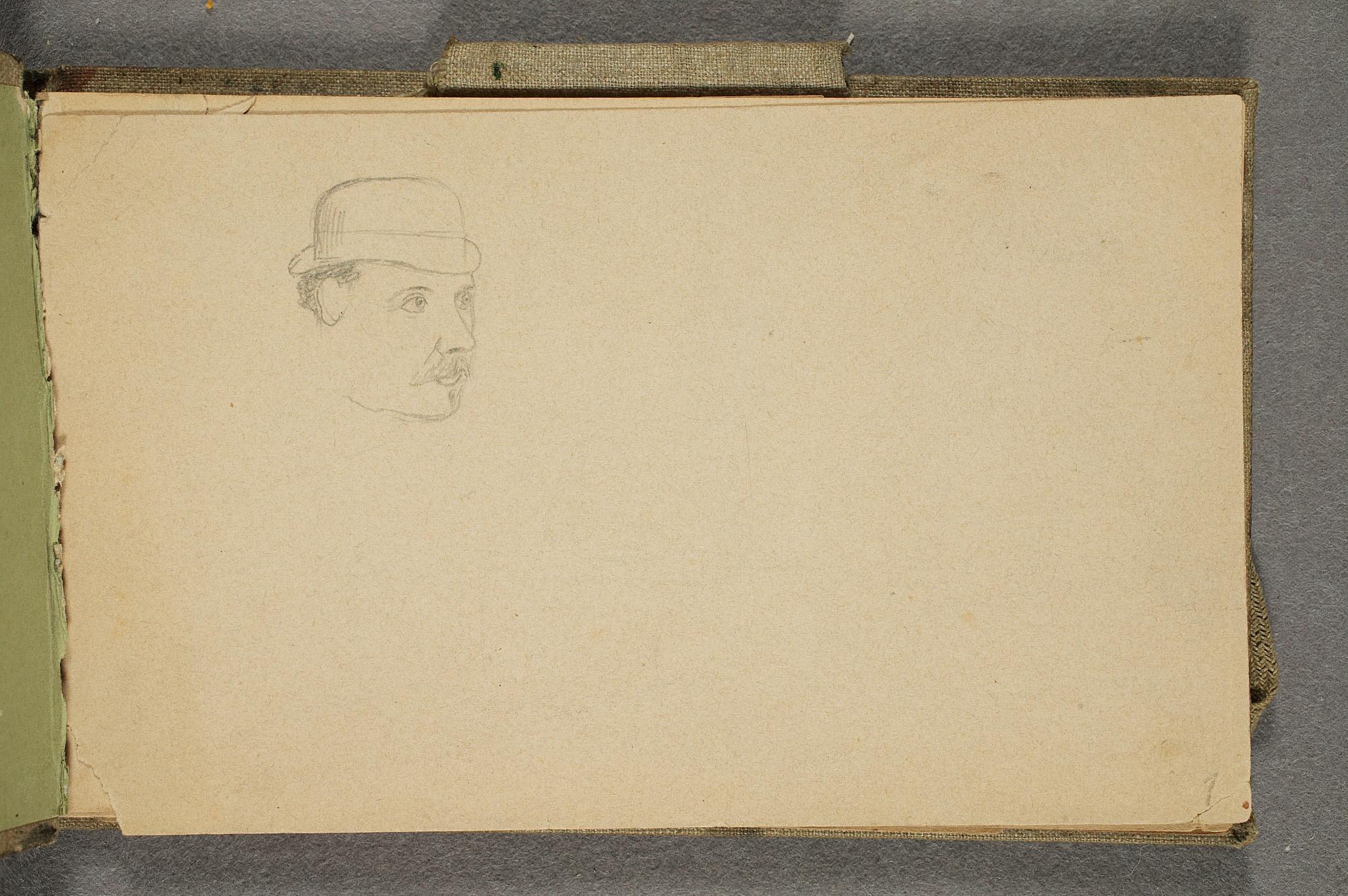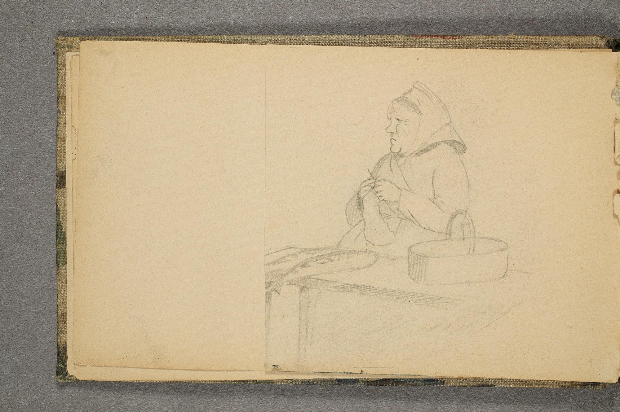 Comment:From the age of thirteen Edvard was allowed to accompany his father, the military doctor Christian Munch, to the military camps at Gardermoen and Helgelandsmoen. The atmosphere inside as well as outside the camps was strange and fascinating for young Edvard, with soldiers, horse traders, itinerate knife sharpeners, beggars and even travelling jugglers. In this sketchbook he has depicted many sides of life at Gerdermoen in summer 1880.