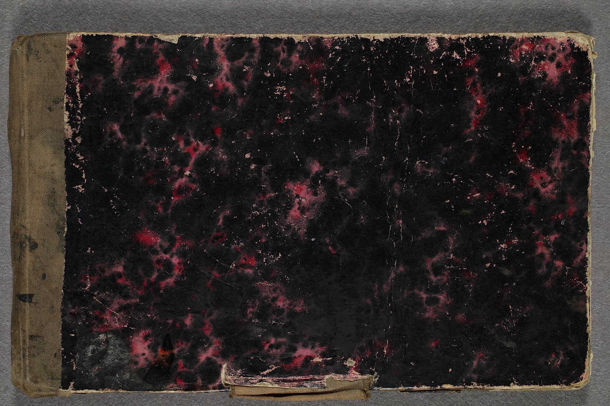Perm: lerret pålimt mønstret papir i svart og rødlig. 103 × 173 mm (h × b × t)