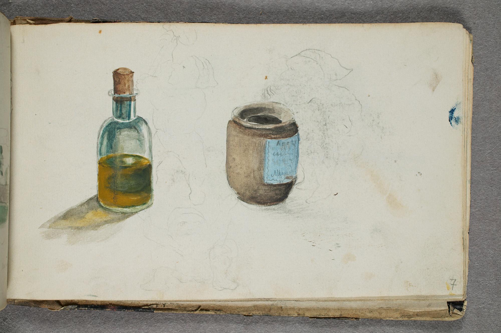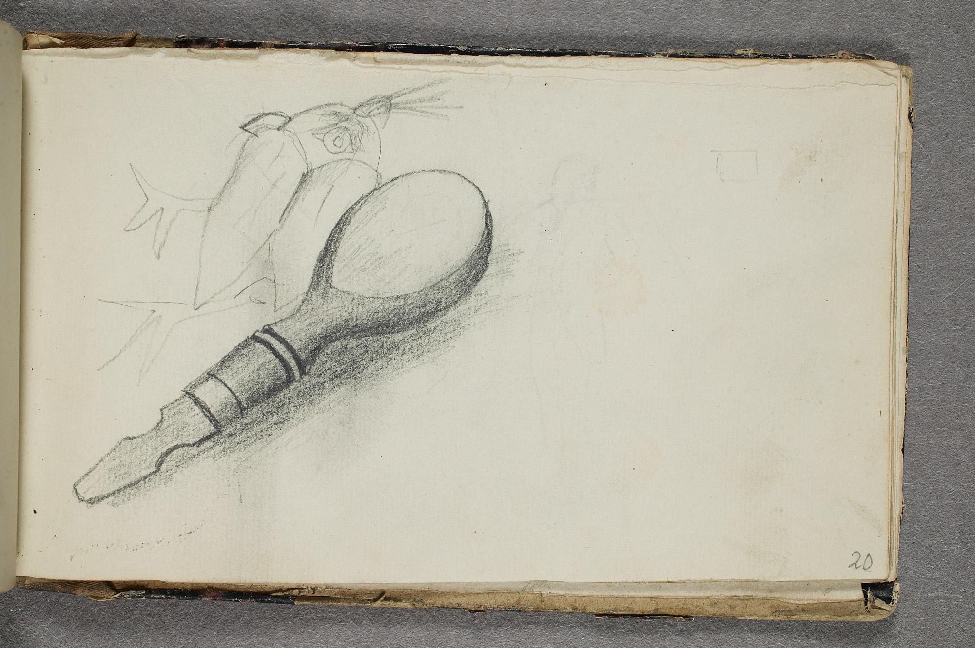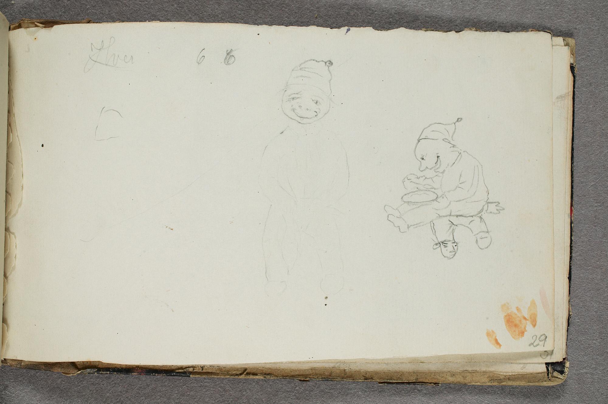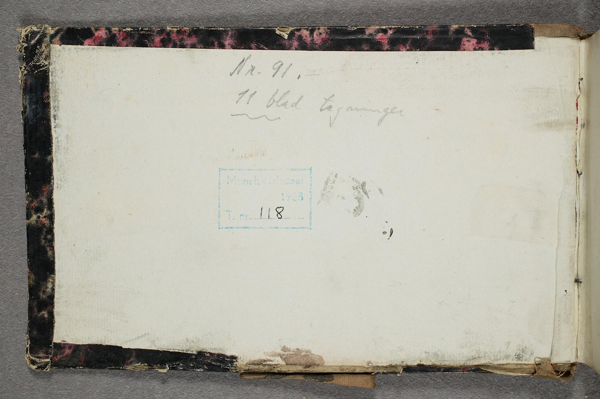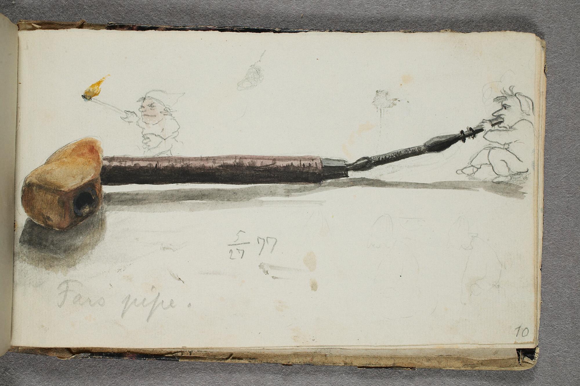 This is one of the earliest preserved sketchbooks after Edvard Munch. He has devoted considerable attention to some of the drawings contained here. See for example the depiction of the drawing tools on page 8. We also find examples of his creative imagination and sense of humour, such as the nisse clandestinely smoking his father’s pipe on page 10.