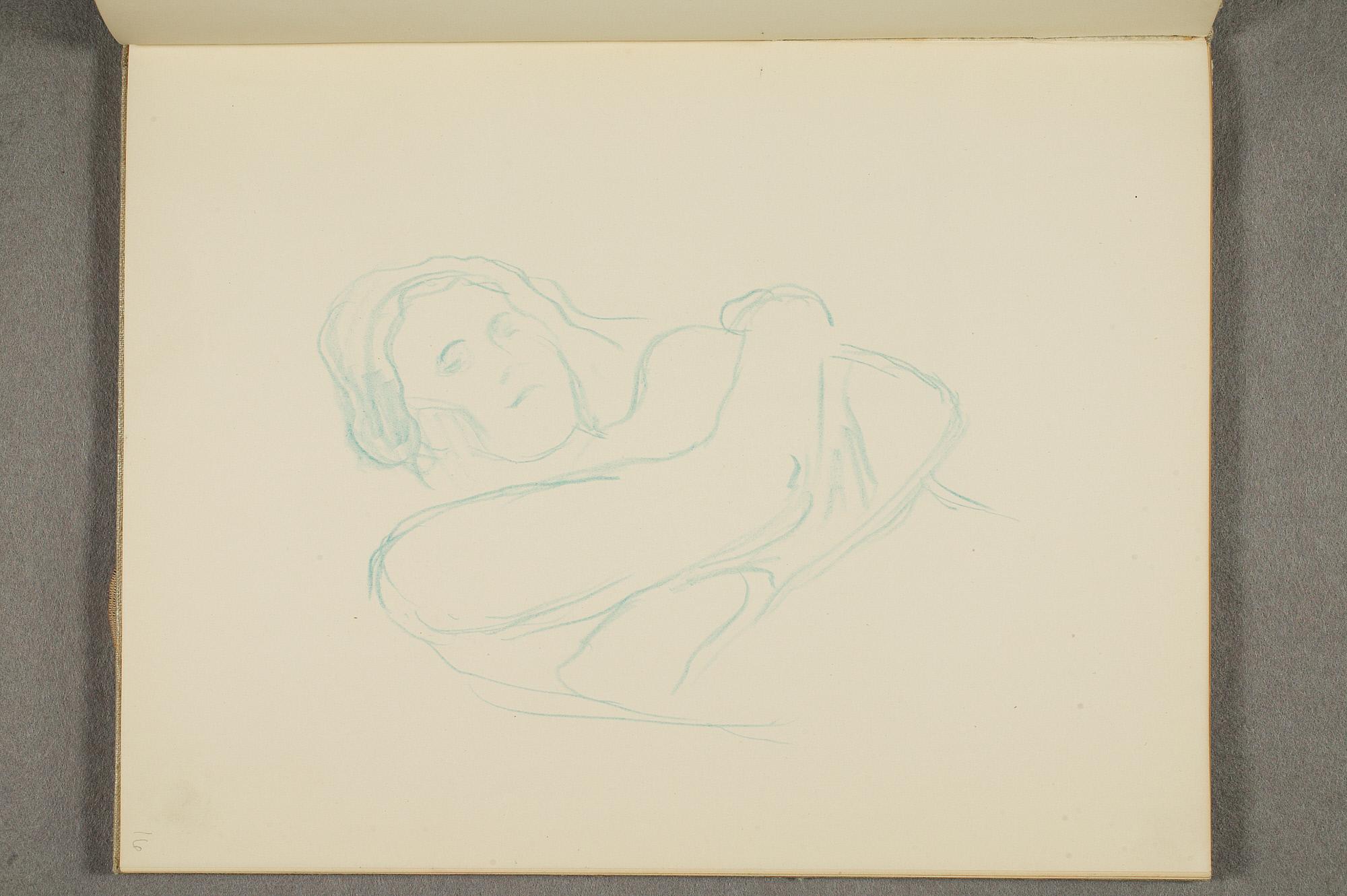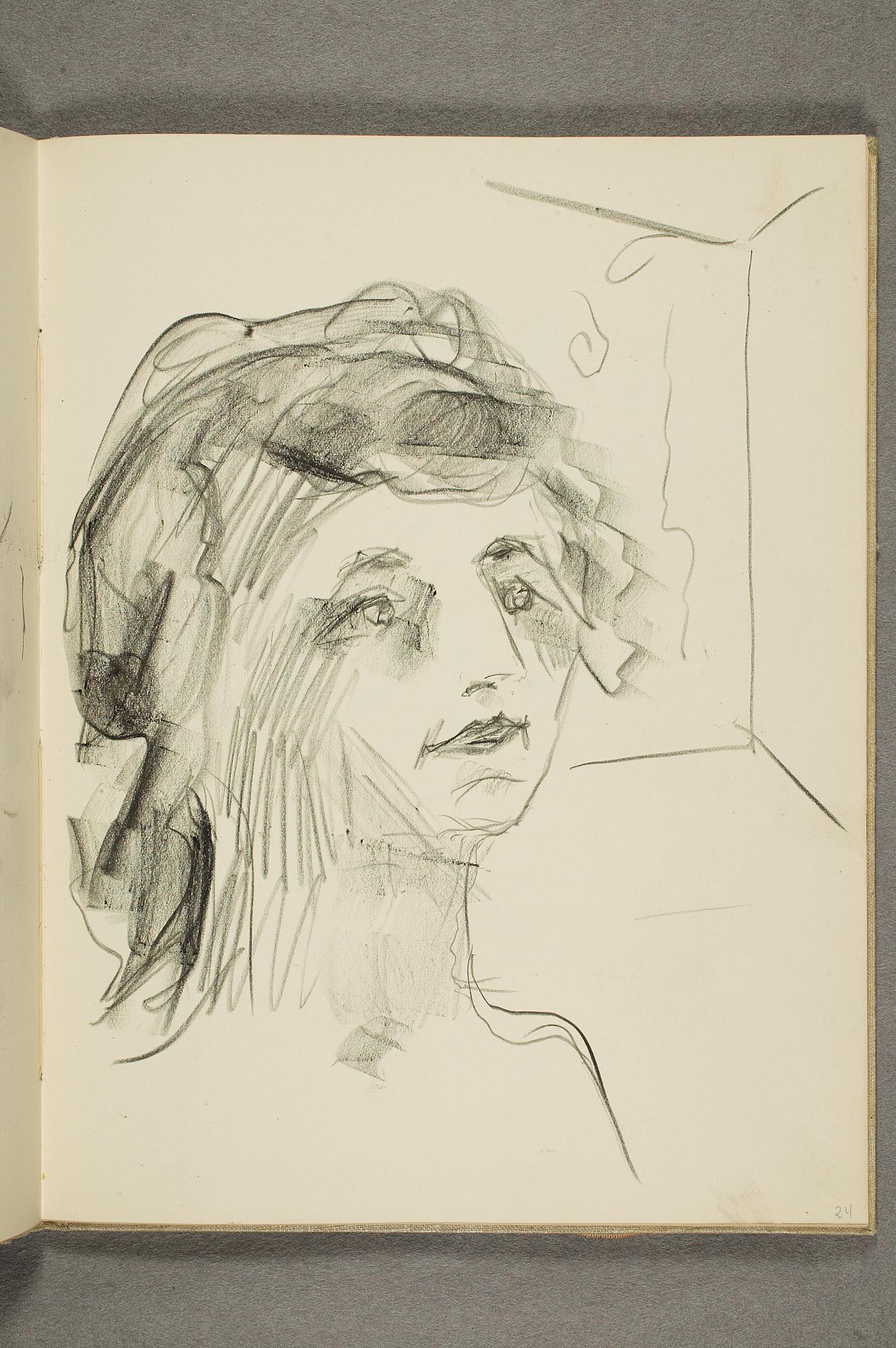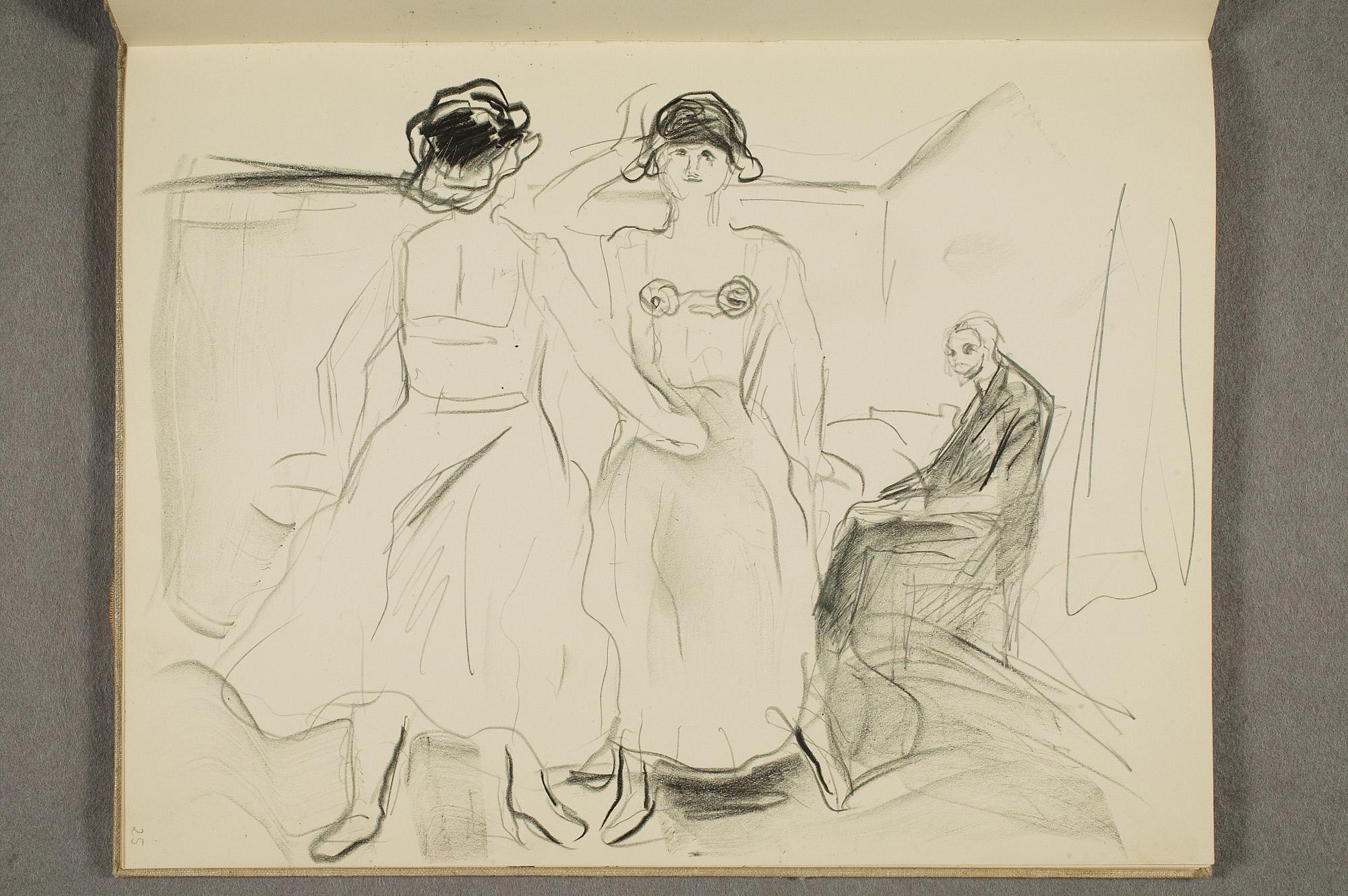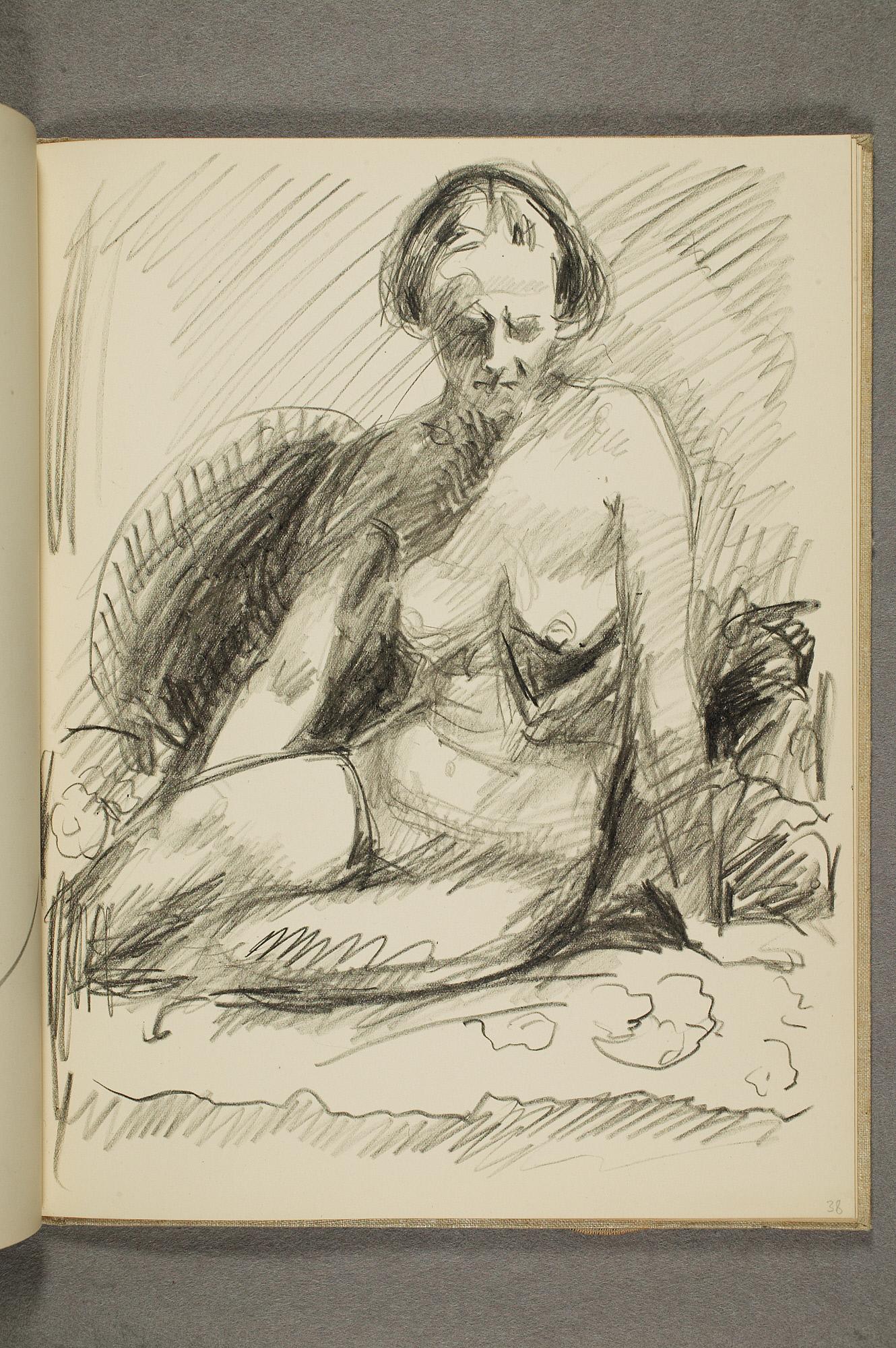 Comment:Flere motiver i denne skisseboken, bl.a. tegningene med kabaretscener, synes å ha tilknytning til 1916, mens andre er av senere dato. Hildur Christensen begynte hos Munch som husholderske i 1923, og ble også benyttet som modell. Hennes karakteristiske skikkelse er lett å kjenne igjen i akttegningen på side 38. Skisseboken var trolig i bruk i tidsrommet 1916–25. (PP)