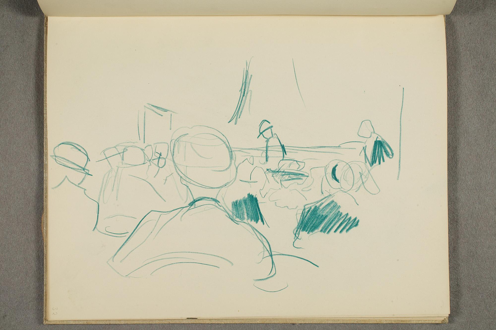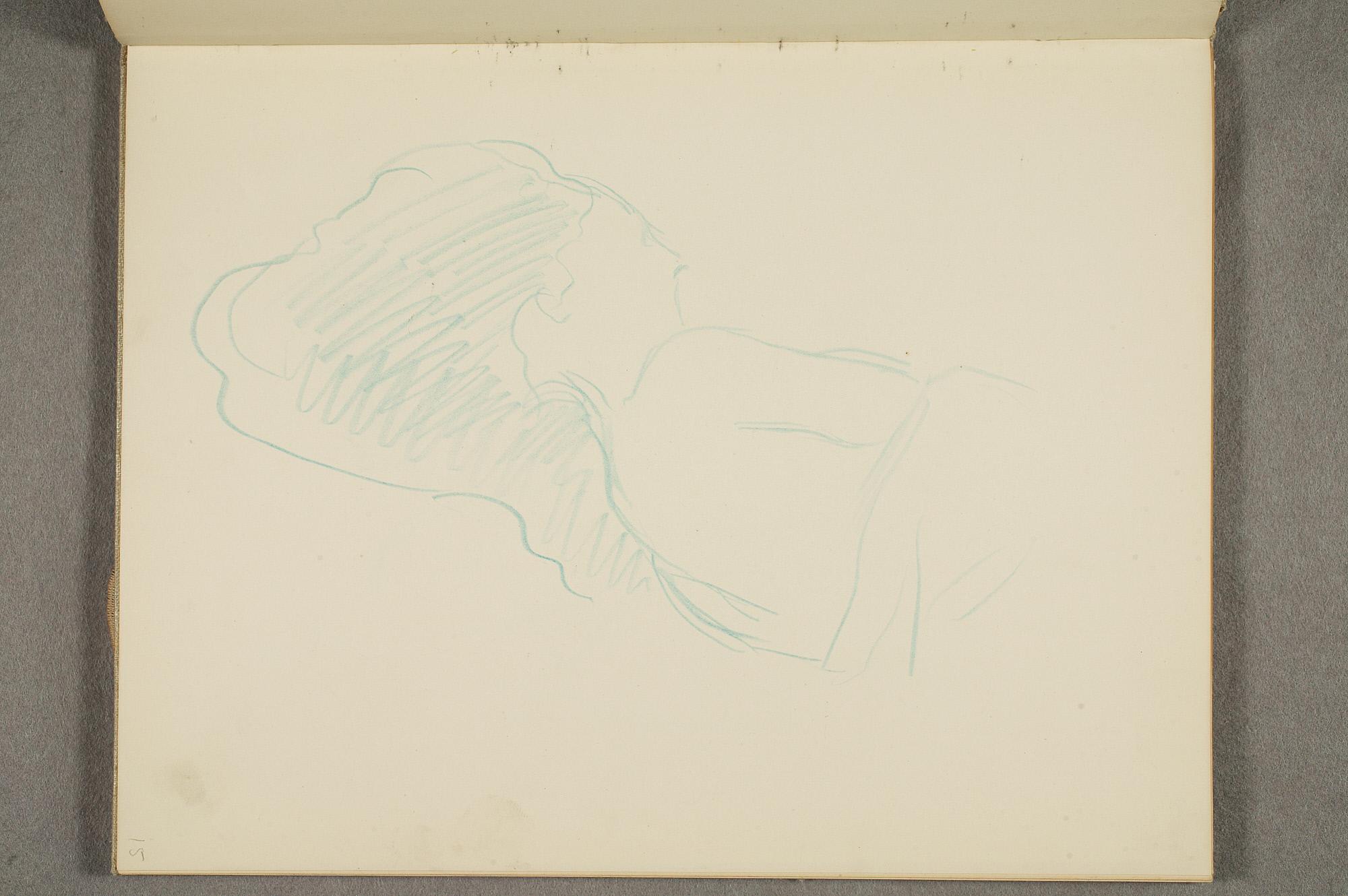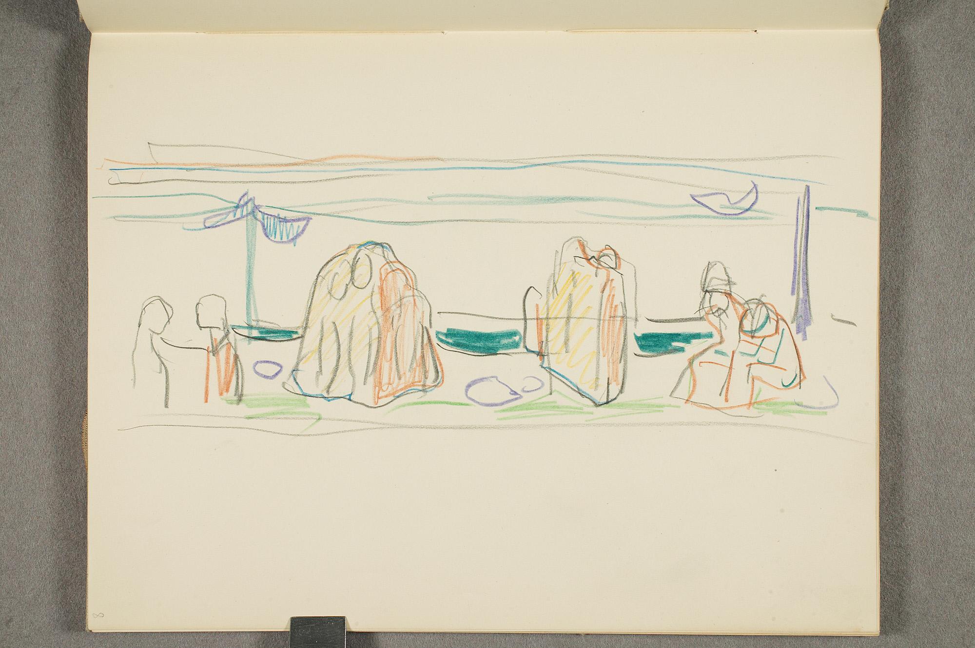 Comment:Flere motiver i denne skisseboken, bl.a. tegningene med kabaretscener, synes å ha tilknytning til 1916, mens andre er av senere dato. Hildur Christensen begynte hos Munch som husholderske i 1923, og ble også benyttet som modell. Hennes karakteristiske skikkelse er lett å kjenne igjen i akttegningen på side 38. Skisseboken var trolig i bruk i tidsrommet 1916–25. (PP)