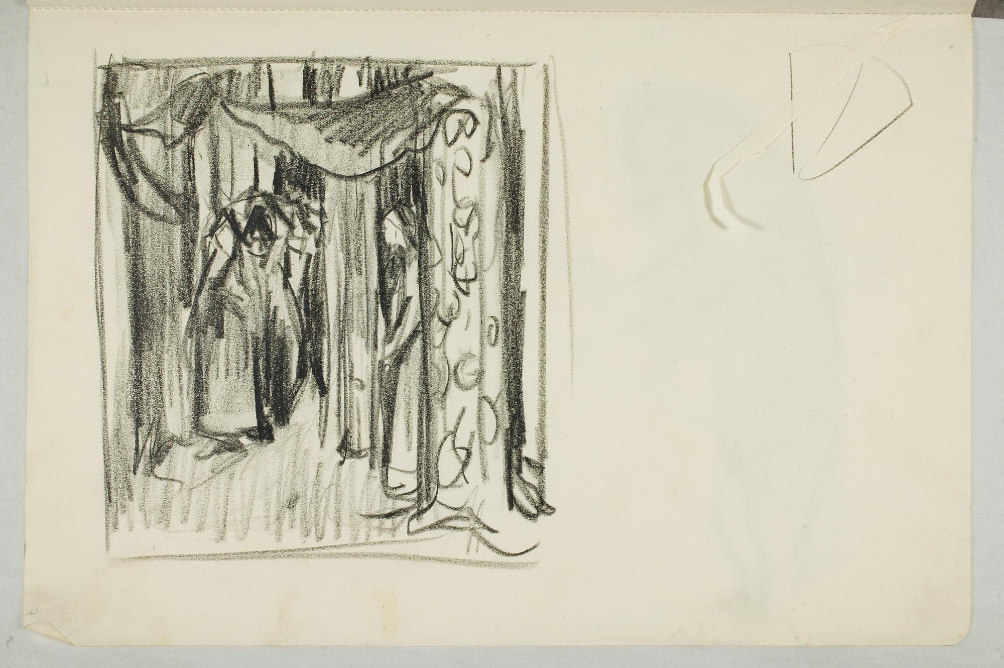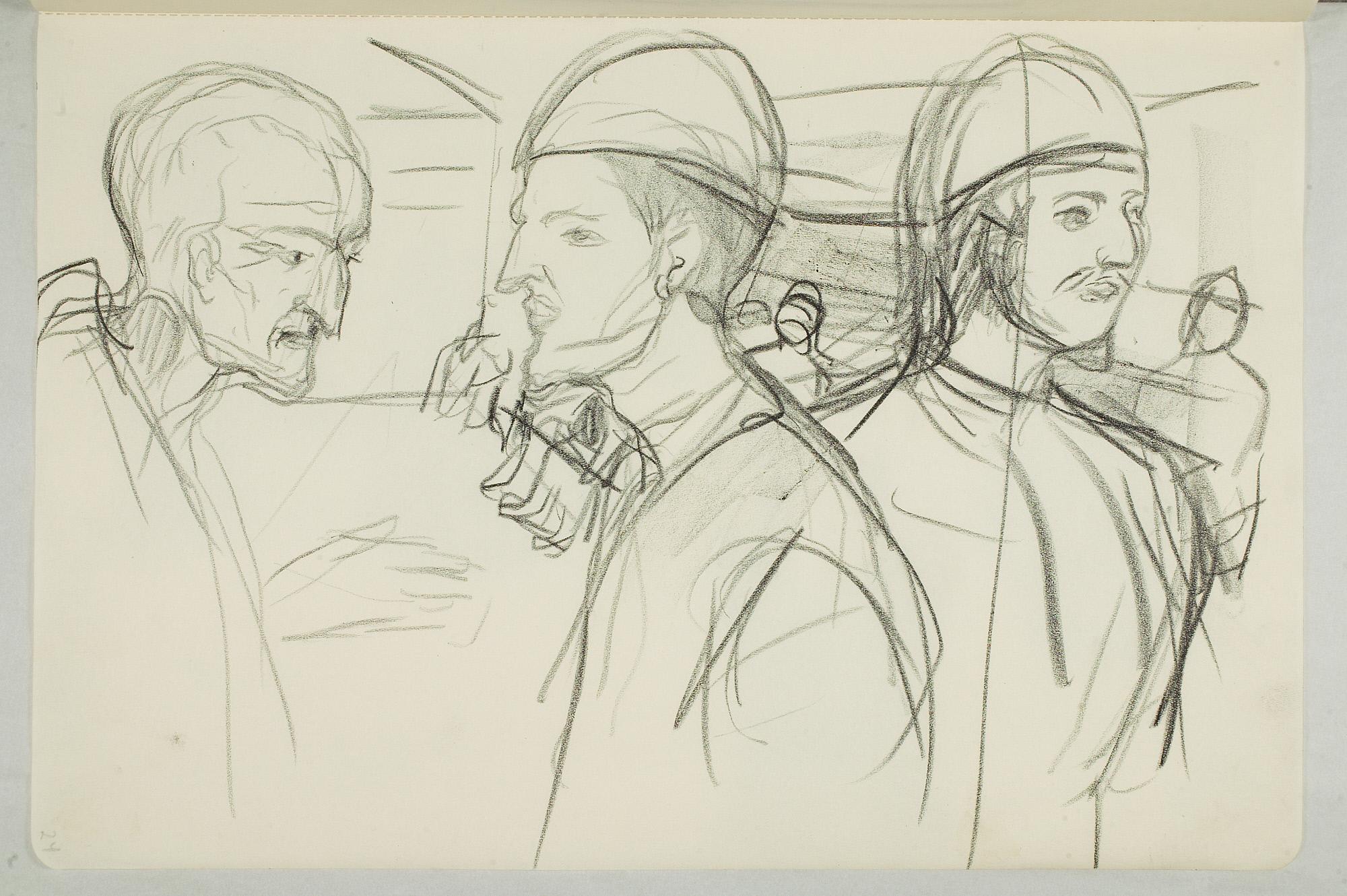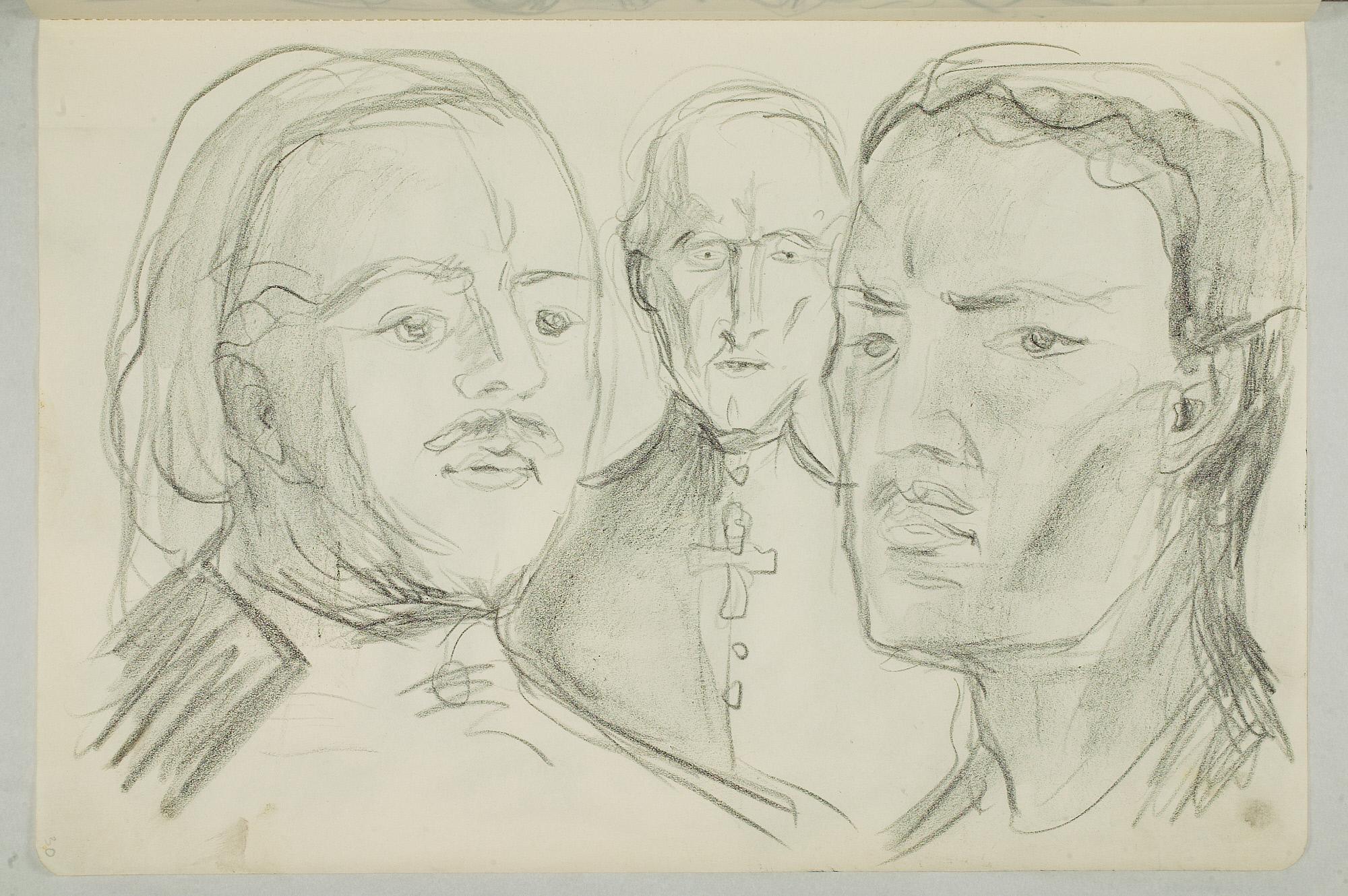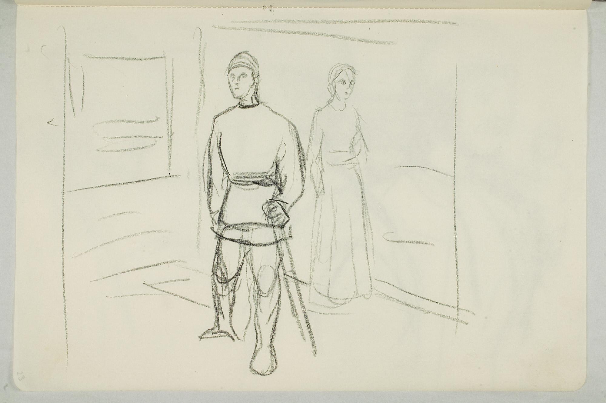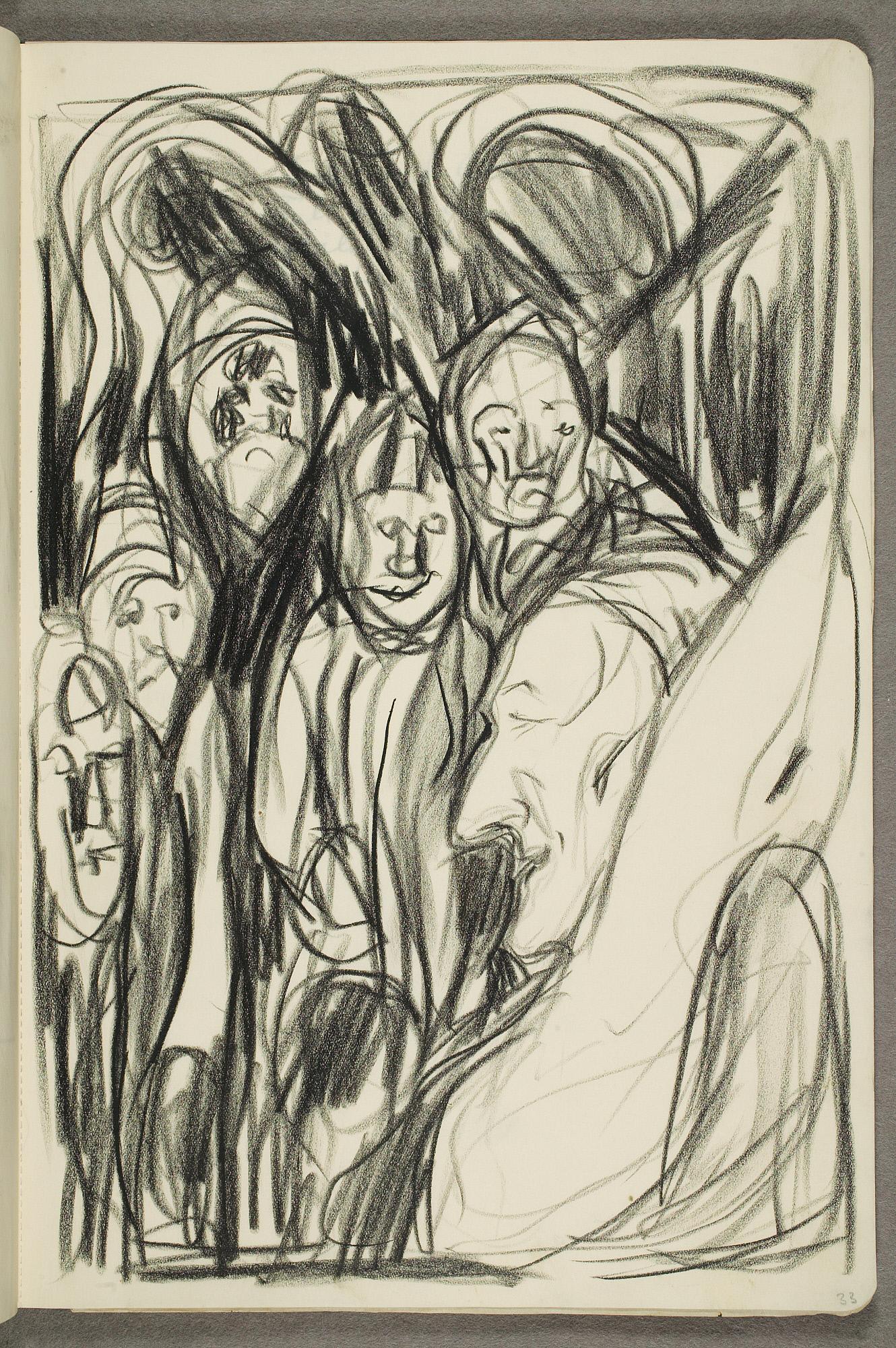 Comment:Det er naturlig å se de mange tegningene med motiv fra Ibsens "Kongsemnene" i sammenheng med serien av tresnitt med samme motiv som Munch utførte i 1917. Skisseboken gis derfor samme datering. (MB)