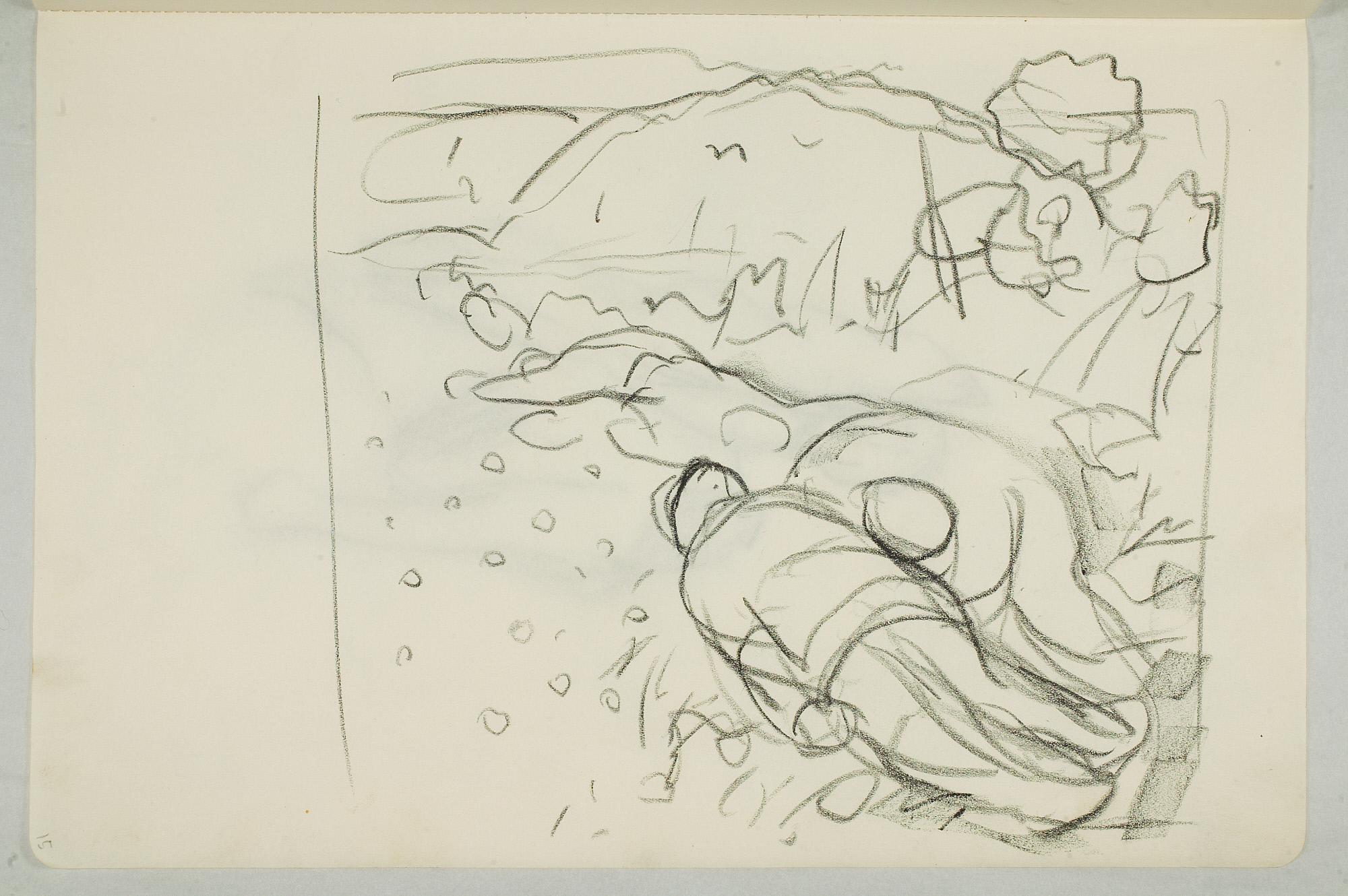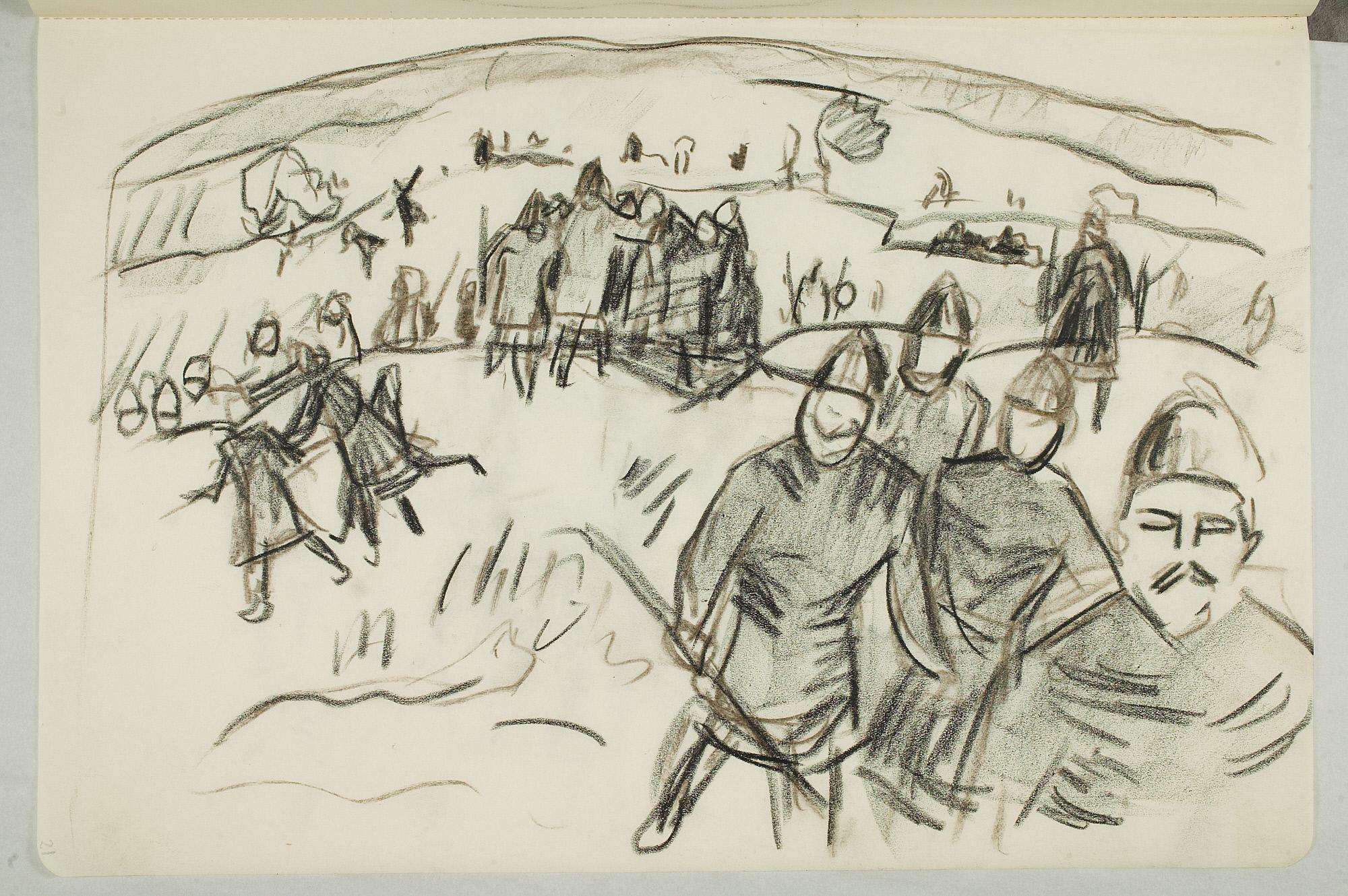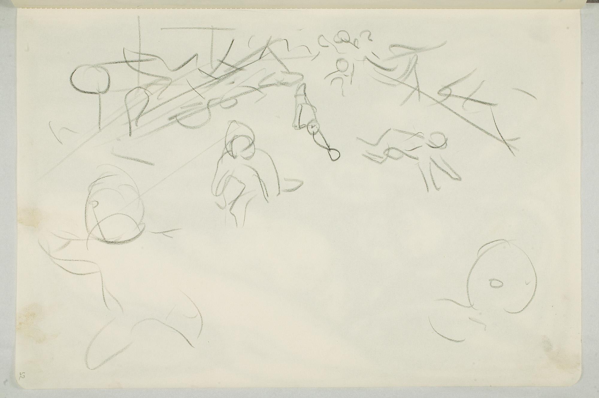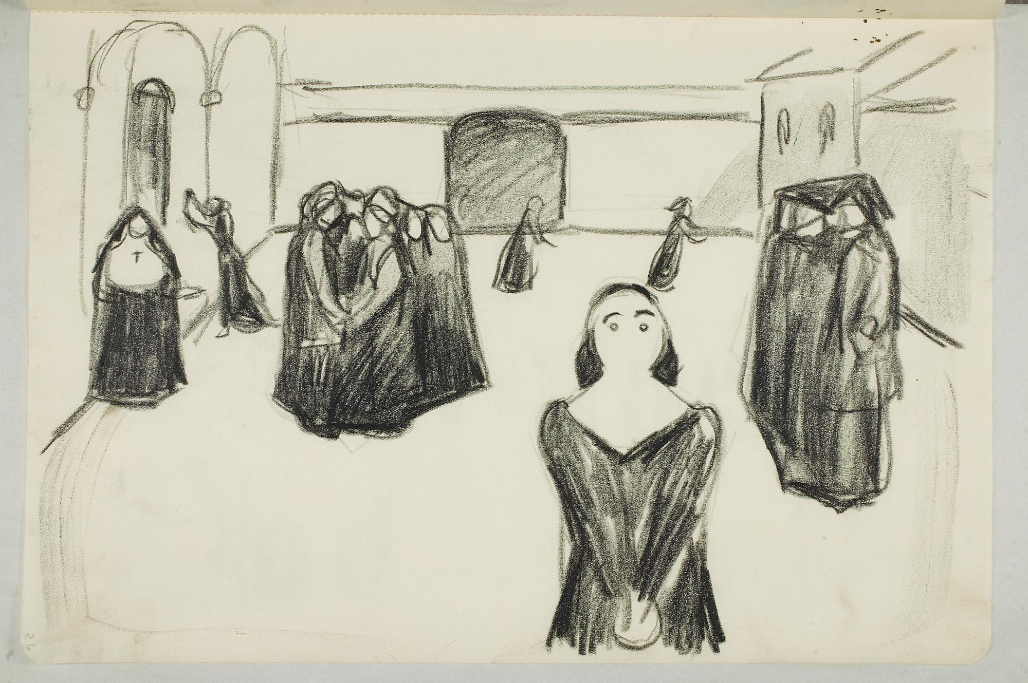 Comment:Det er naturlig å se de mange tegningene med motiv fra Ibsens "Kongsemnene" i sammenheng med serien av tresnitt med samme motiv som Munch utførte i 1917. Skisseboken gis derfor samme datering. (MB)