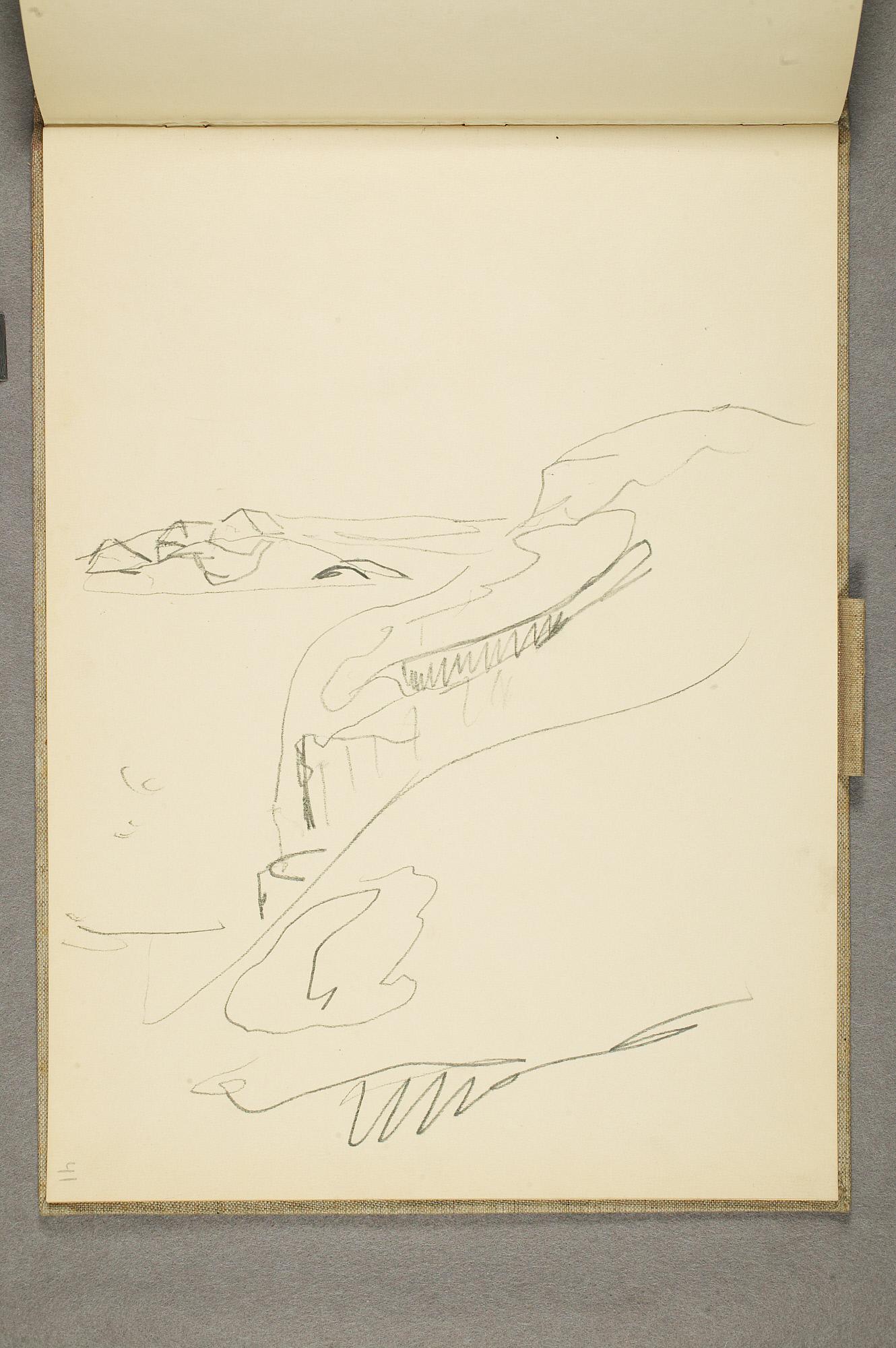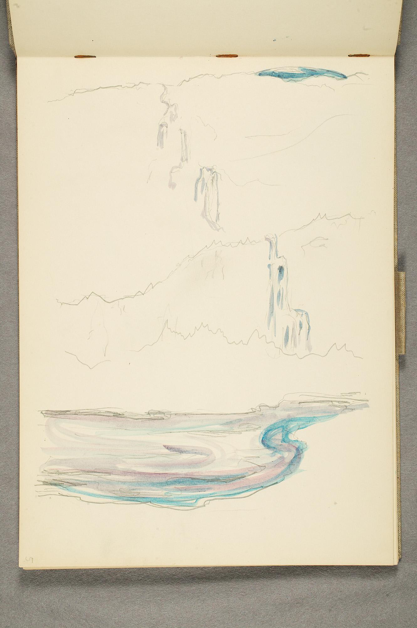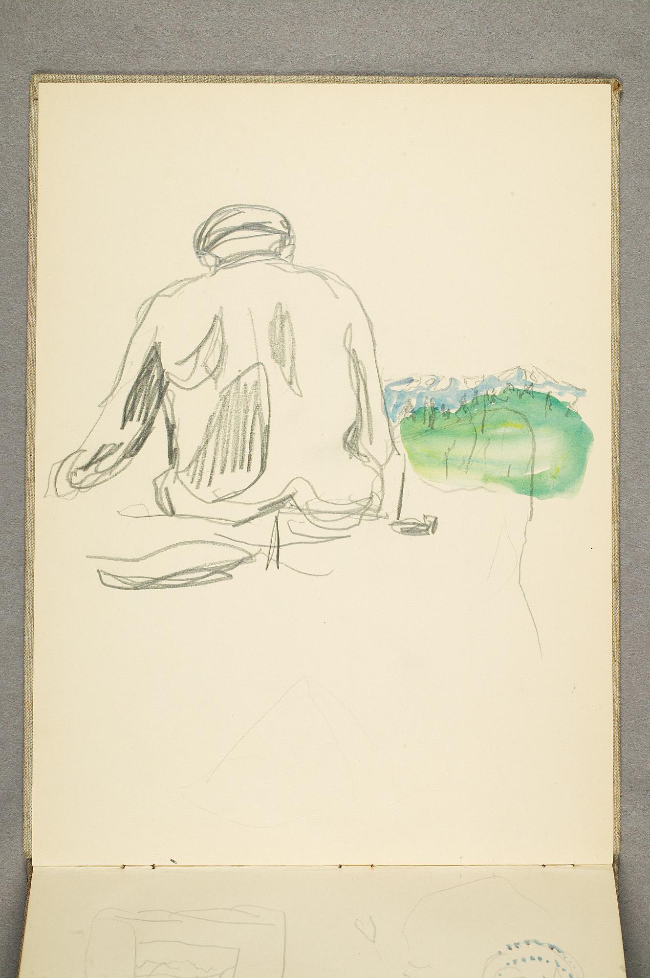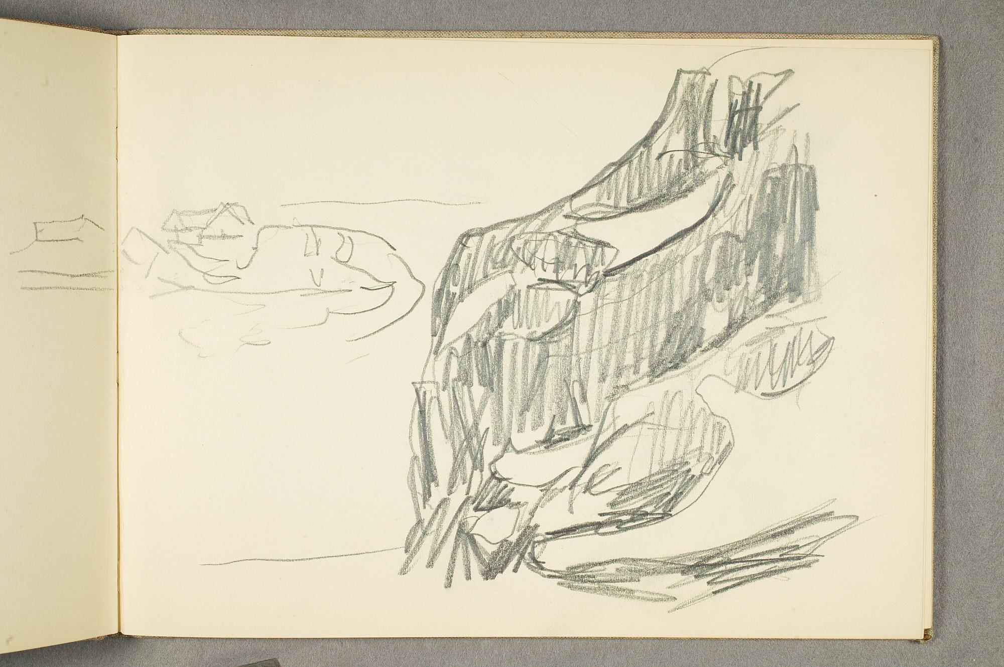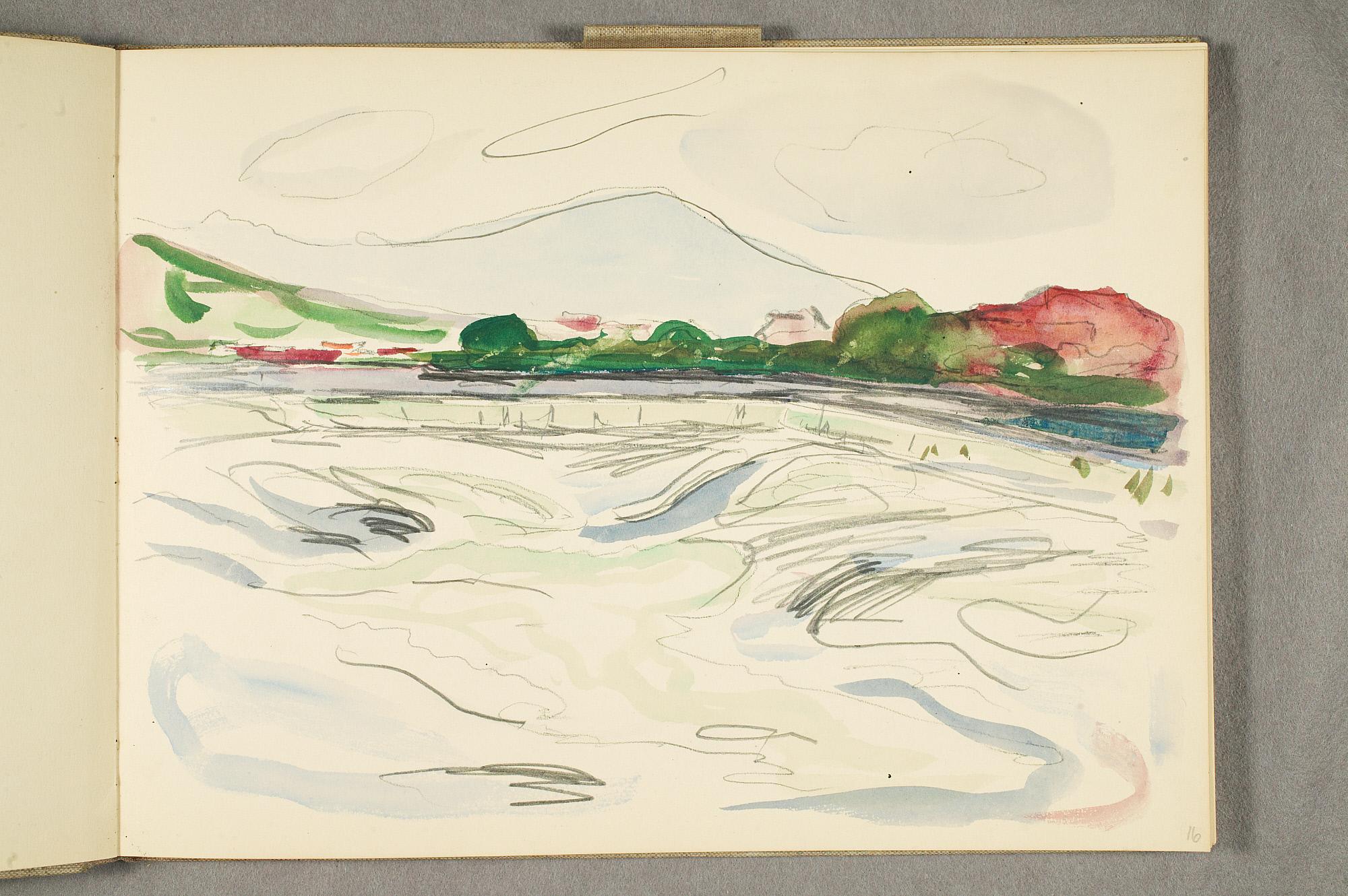 Comment:The first part of this sketchbook contans sketches and watercolours made during a travel from Bergen to Kragerø in June 1909. He travelled by boat, horse, and carriage and part of the way on the recently opened Bergen railway, and his travelling companion was his cousin Ludvig Ravensberg, who kept a detailed diary of the tour. Among other things, he writes about the drive by horse and carriage between Eide and Voss on Thursday, 1 July: "We had a wonderful drive. M was in good spirits the whole time and made a lot of brilliant remarks. He wanted to show me a number of things and demonstrated them with drawings, all of which were excellent, because, said M, this is how art was originally … created."