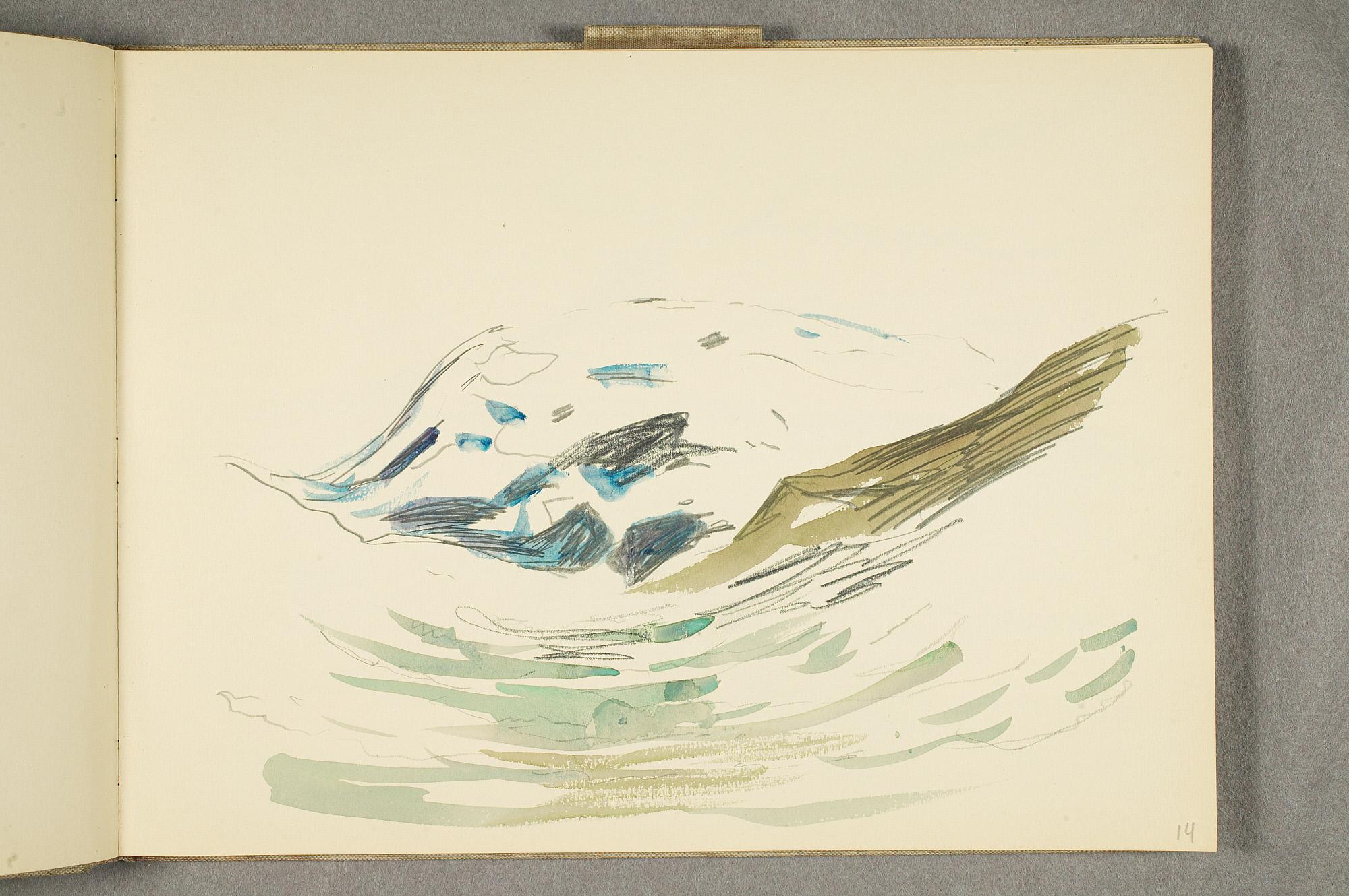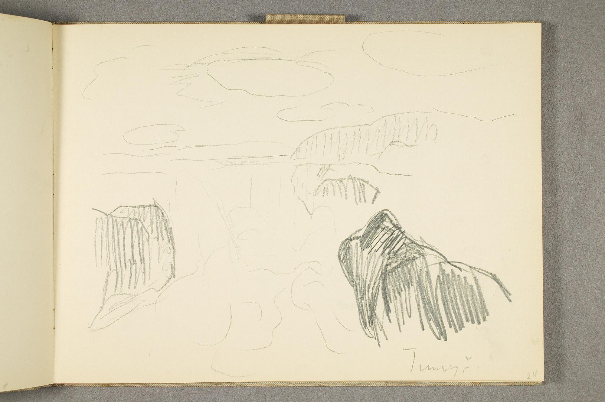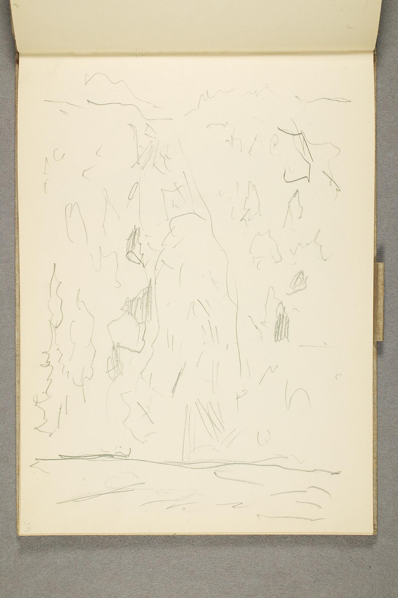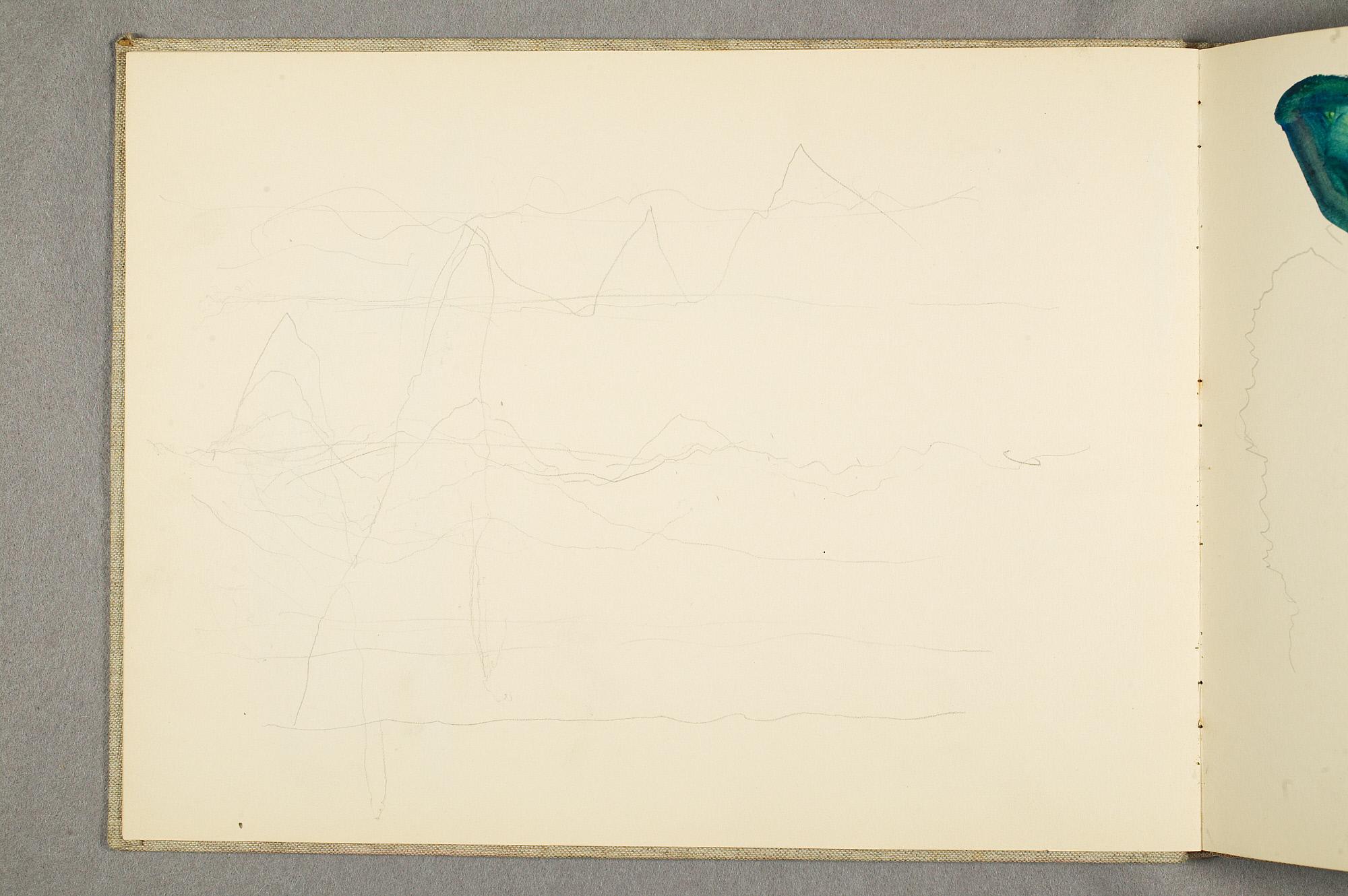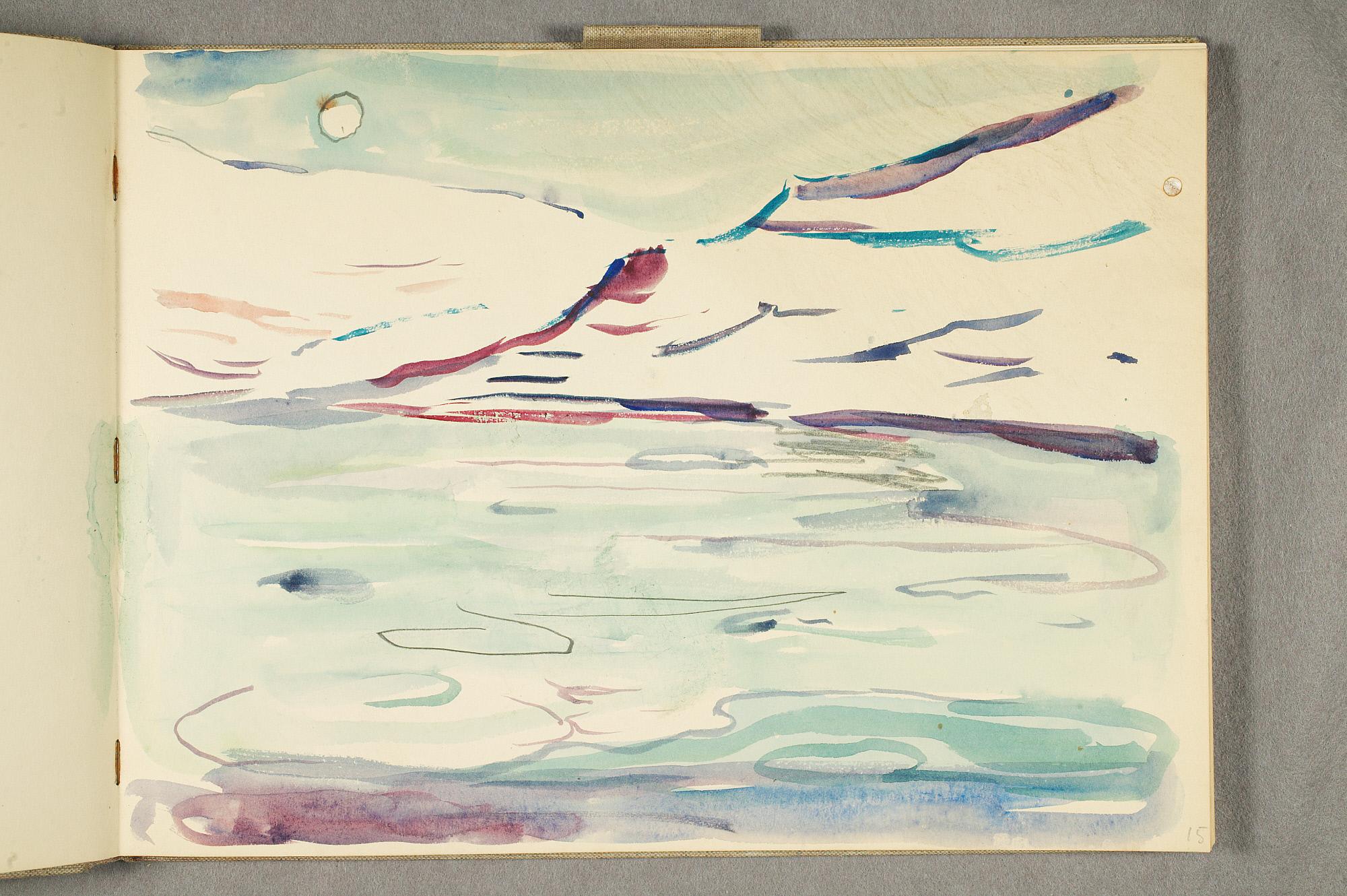 Comment:The first part of this sketchbook contans sketches and watercolours made during a travel from Bergen to Kragerø in June 1909. He travelled by boat, horse, and carriage and part of the way on the recently opened Bergen railway, and his travelling companion was his cousin Ludvig Ravensberg, who kept a detailed diary of the tour. Among other things, he writes about the drive by horse and carriage between Eide and Voss on Thursday, 1 July: "We had a wonderful drive. M was in good spirits the whole time and made a lot of brilliant remarks. He wanted to show me a number of things and demonstrated them with drawings, all of which were excellent, because, said M, this is how art was originally … created."