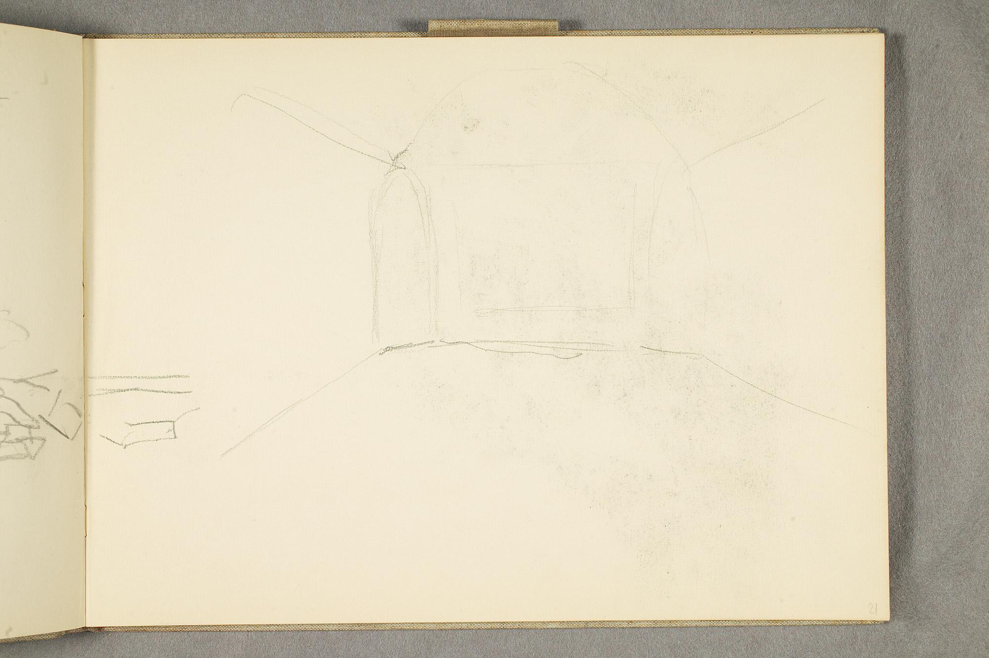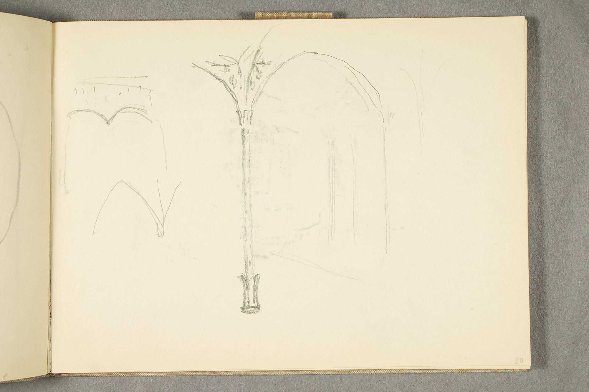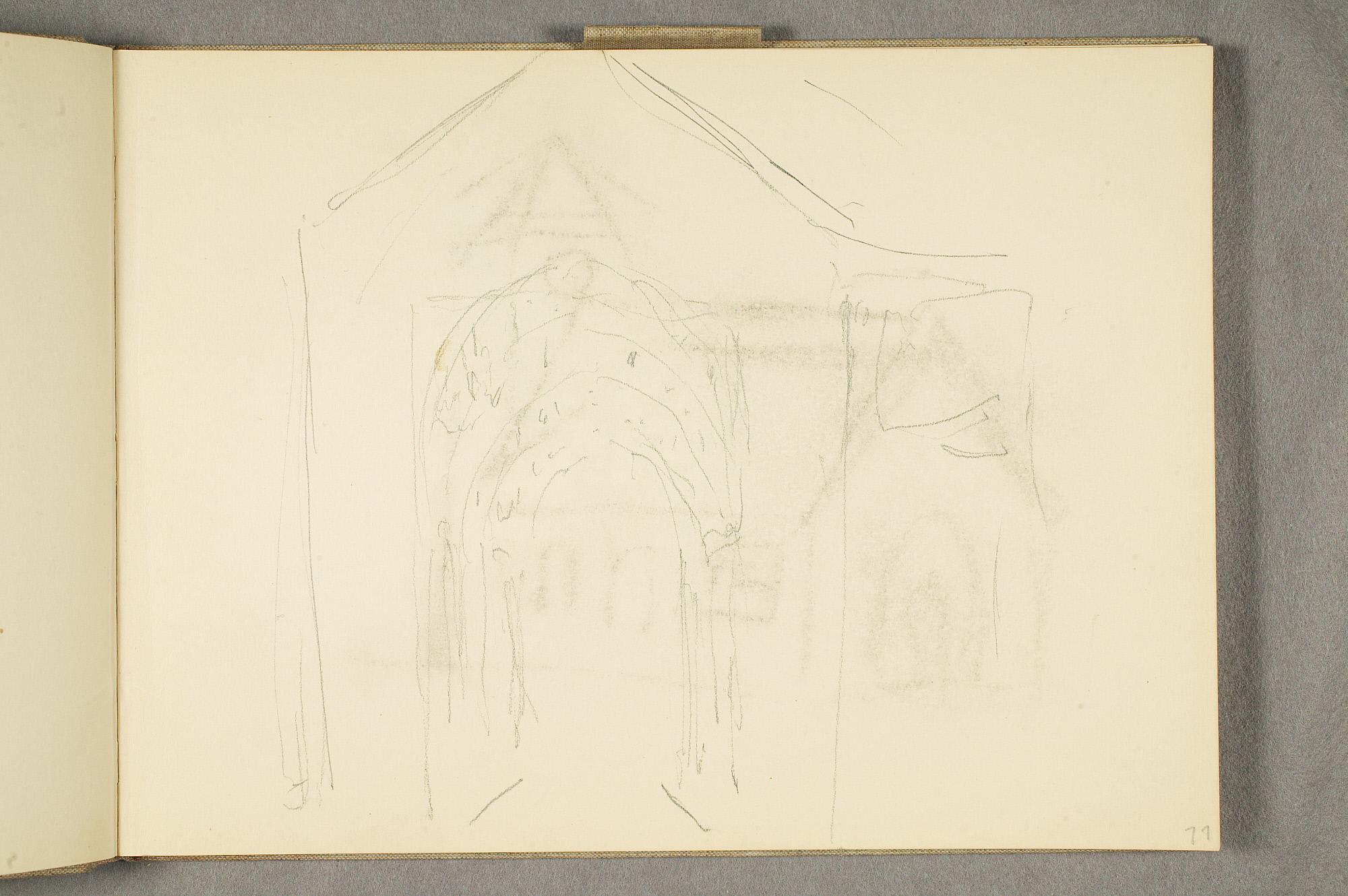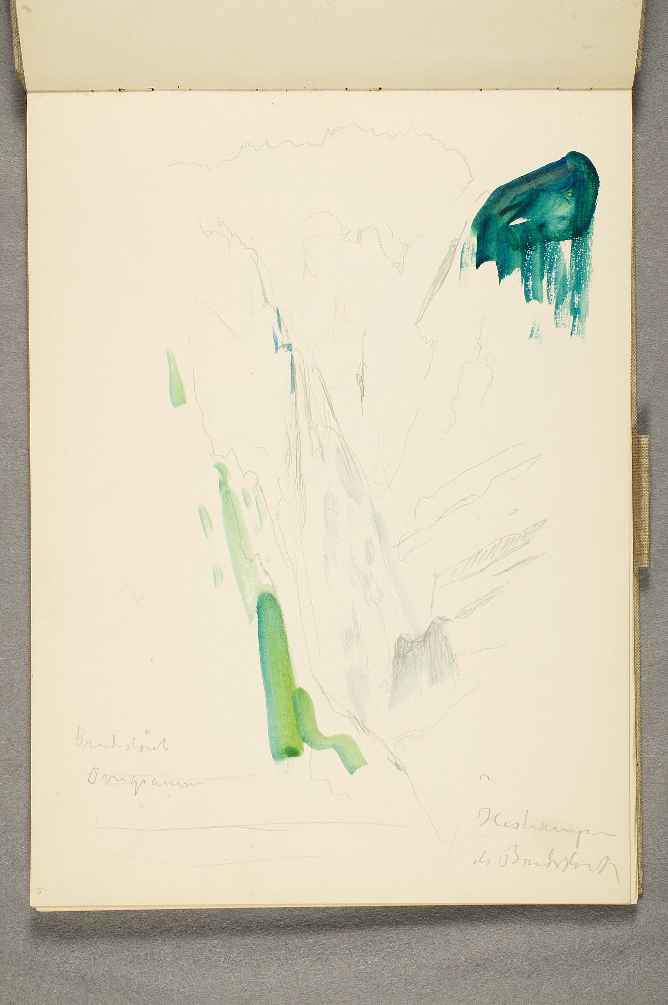 Apparently, they visited several churches on this trip, as we find sketches of church interiors, even detailed studies of ceiling constructions and portals. However, perhaps most interesting in this sketchbook are a number of watercolour landscapes depicting waterfalls, high mountains, and rapids along their route. Watercolour is not a particularly handy medium when you are on the move; you need a paint box, brushes, mixing bowls, and water, and somewhere to put them. Of course Munch may have applied the colour later in his hotel room, or after he was back in Kragerø, for that matter. But if so, this kind of addition to sketches is also quite unusual. On two of the pencil sketches from this tour he has noted indications of colour for possible working-up later. Perhaps he used watercolour to reproduce the colours more precisely than ‘light green’ and ‘deep blue’? Whatever the case may be, none of these sketches appear later as paintings, and the watercolours remain between the canvas covers as well-kept secrets.