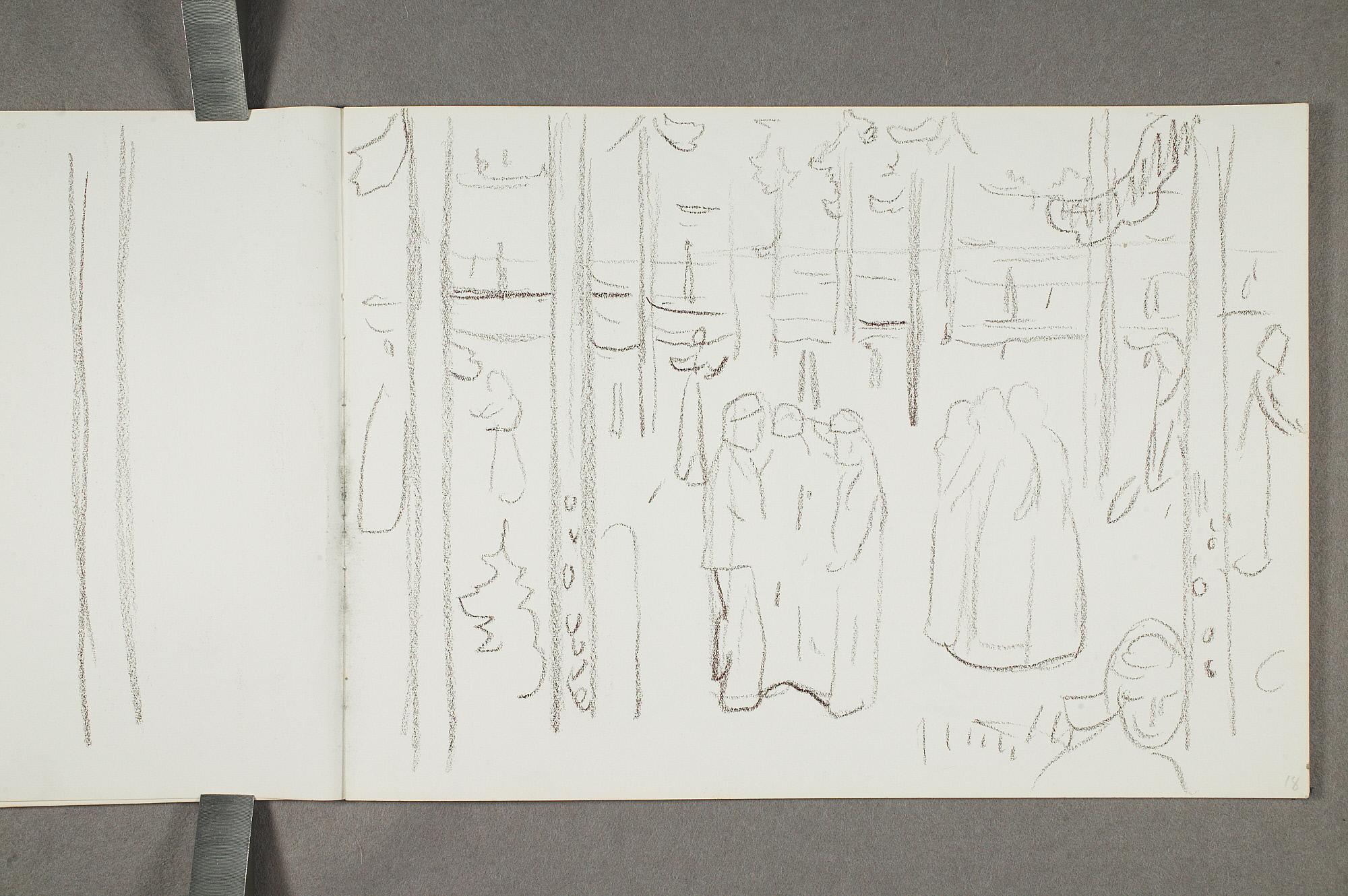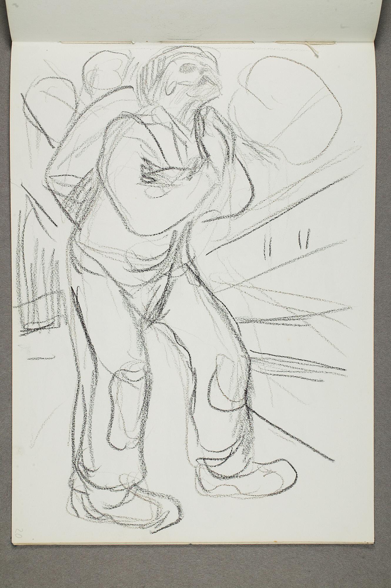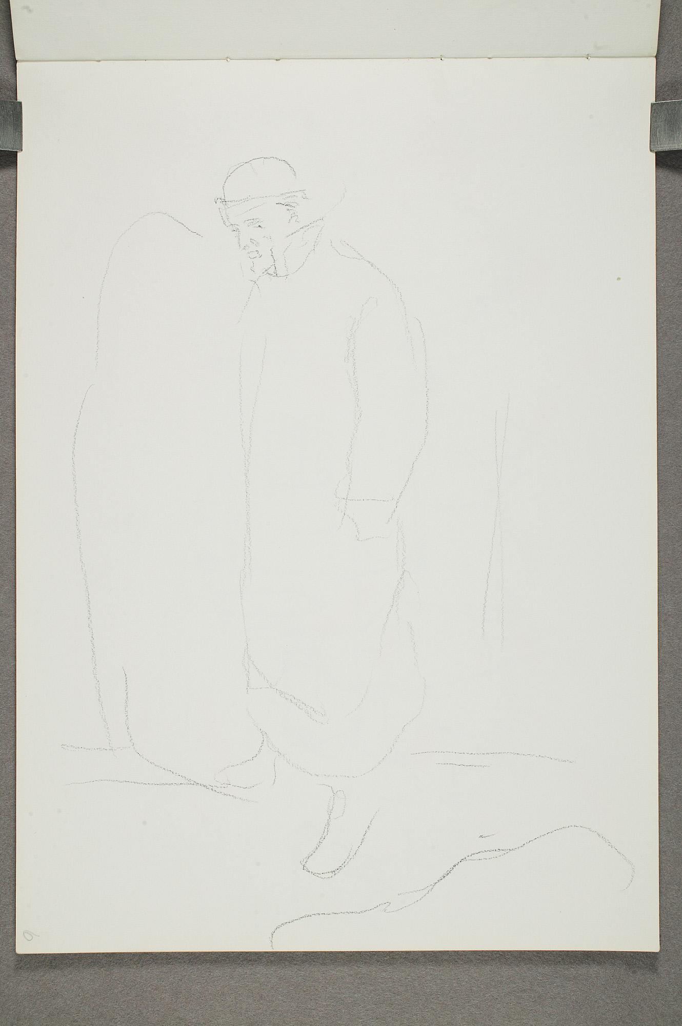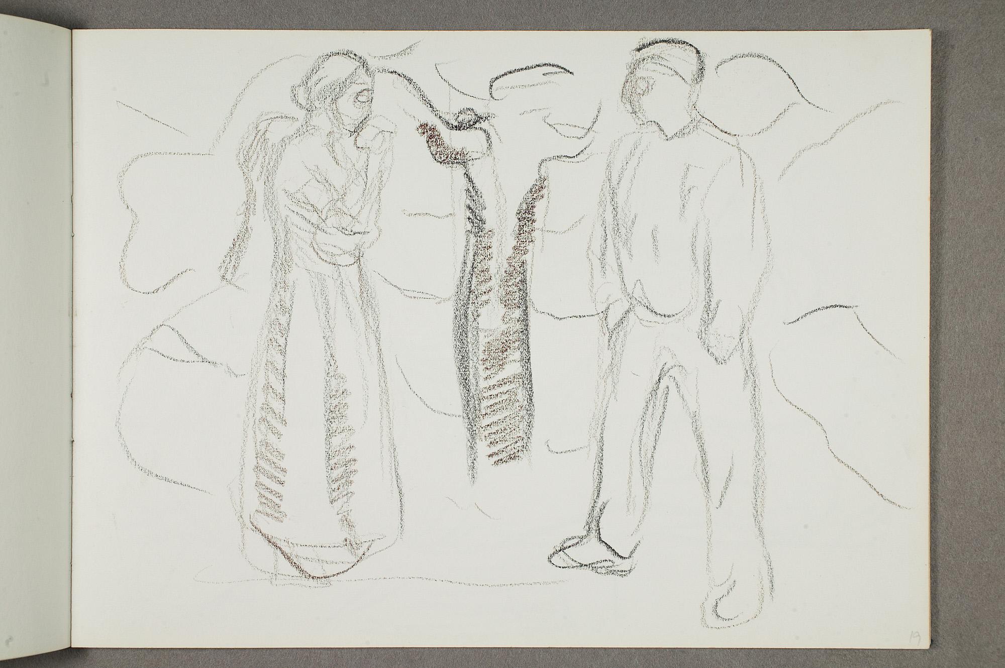 Comment:Denne typen skissebok, fra Winsor & Newton, finnes det 10 av i Munchmuseets samling, og alle er blitt brukt i Kragerø-perioden, 1909–15. Tegningene i denne skisseboken består av blant annet aulamotiver, «Adam og Eva», «Skogskatedral», «Klutesamleren» og «Arbeidere i snø». Flere er utført i samme teknikk – fargestift i flere farger, som følger etter hverandre i boken, noe som er med på avgjøre skissebokens datering. (PP)