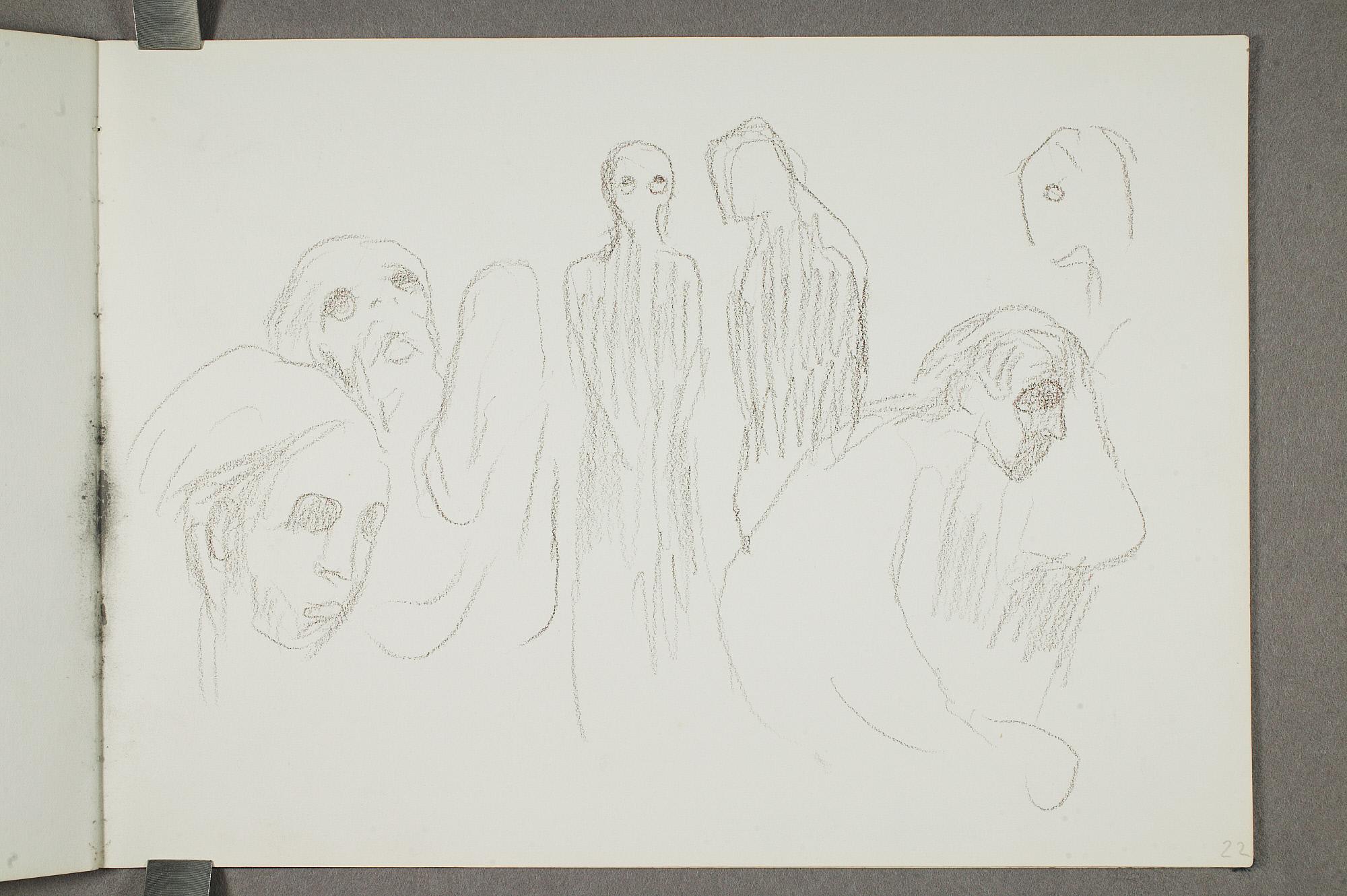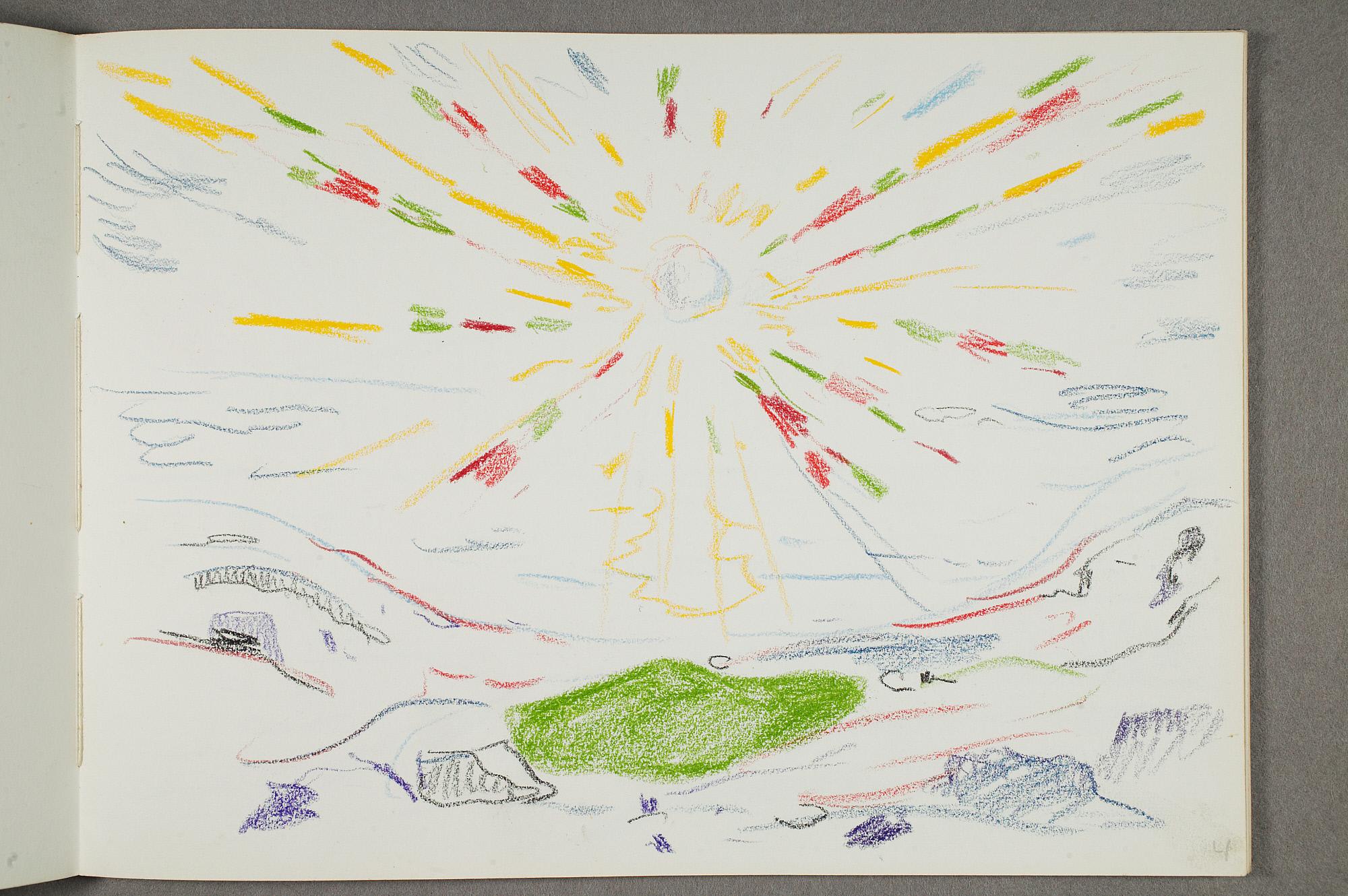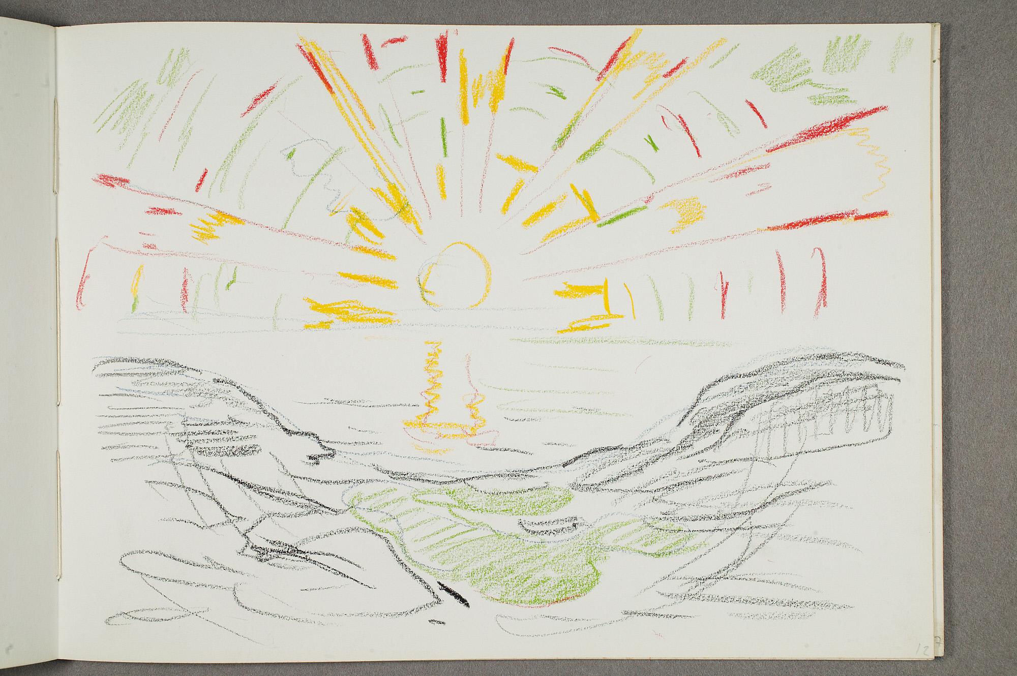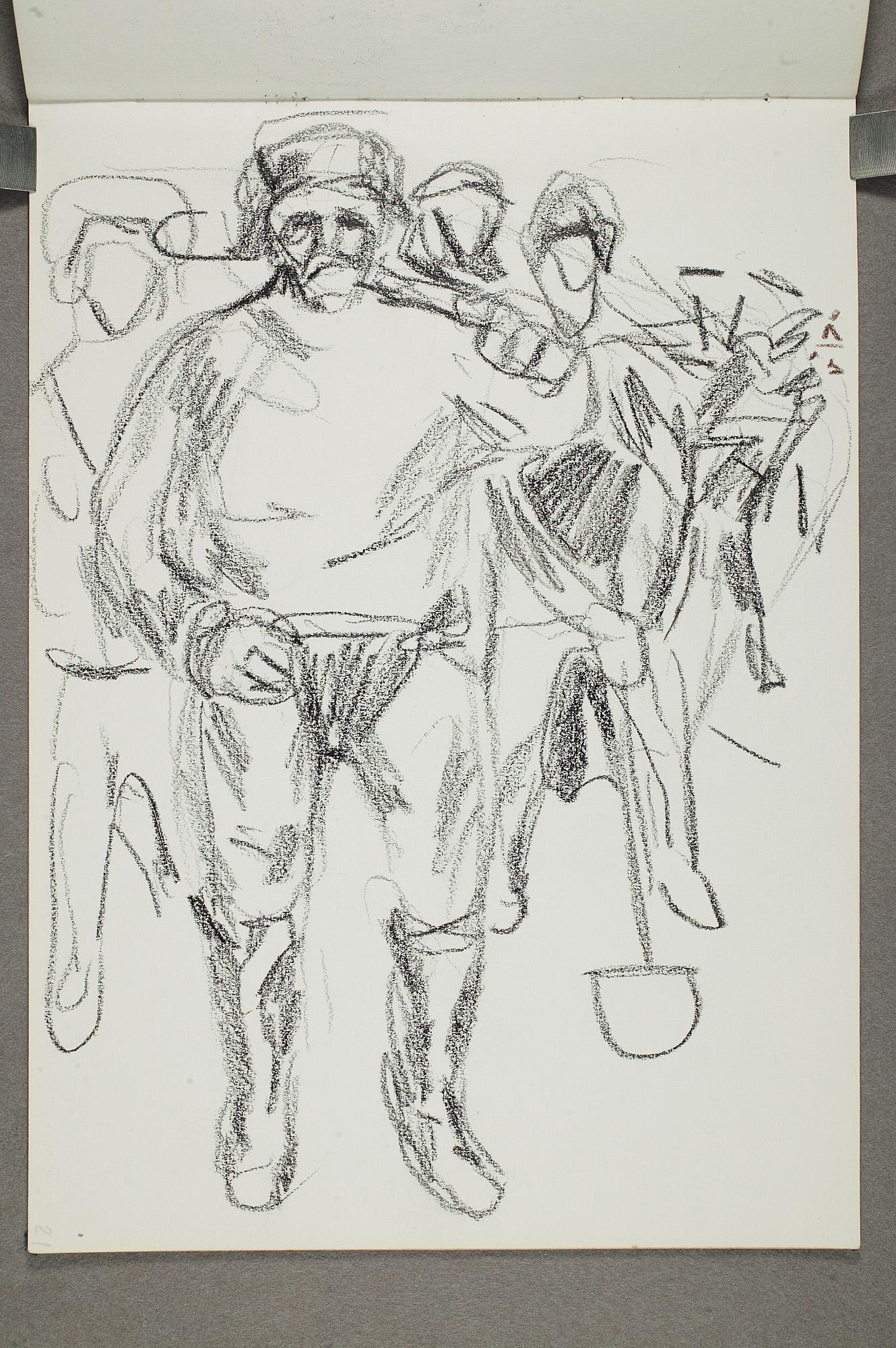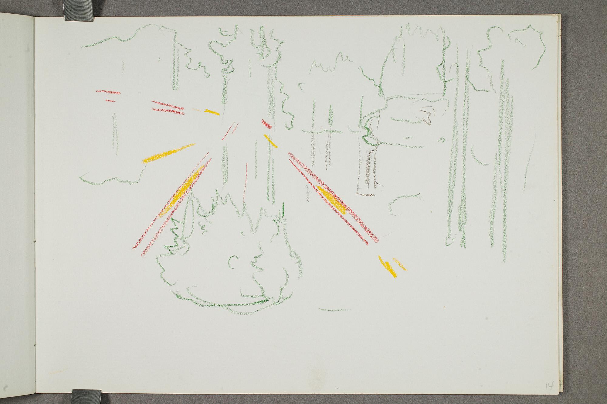 Comment:Denne typen skissebok, fra Winsor & Newton, finnes det 10 av i Munchmuseets samling, og alle er blitt brukt i Kragerø-perioden, 1909–15. Tegningene i denne skisseboken består av blant annet aulamotiver, «Adam og Eva», «Skogskatedral», «Klutesamleren» og «Arbeidere i snø». Flere er utført i samme teknikk – fargestift i flere farger, som følger etter hverandre i boken, noe som er med på avgjøre skissebokens datering. (PP)