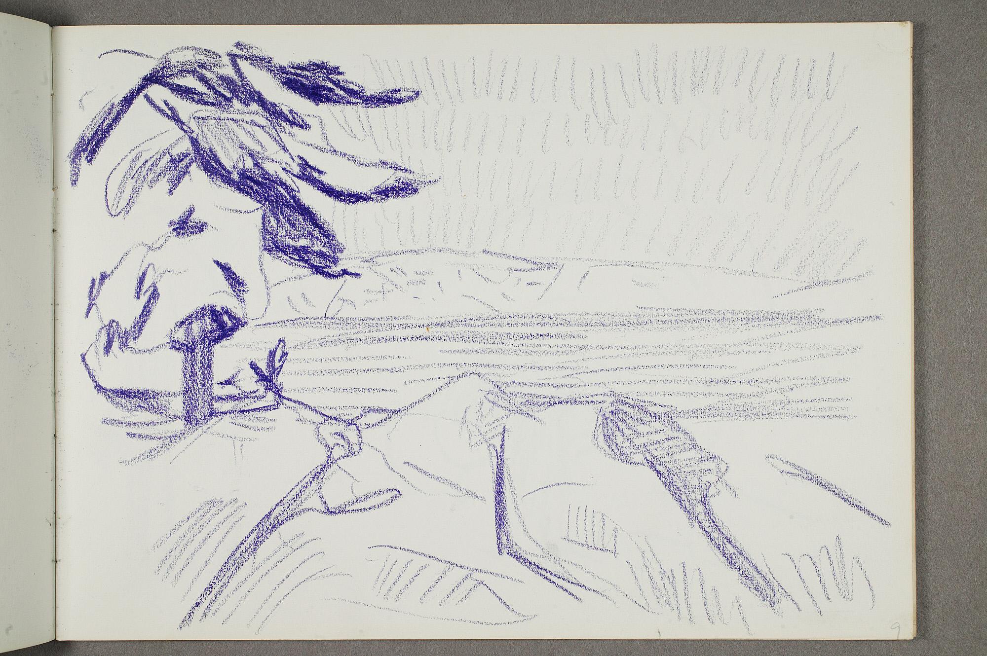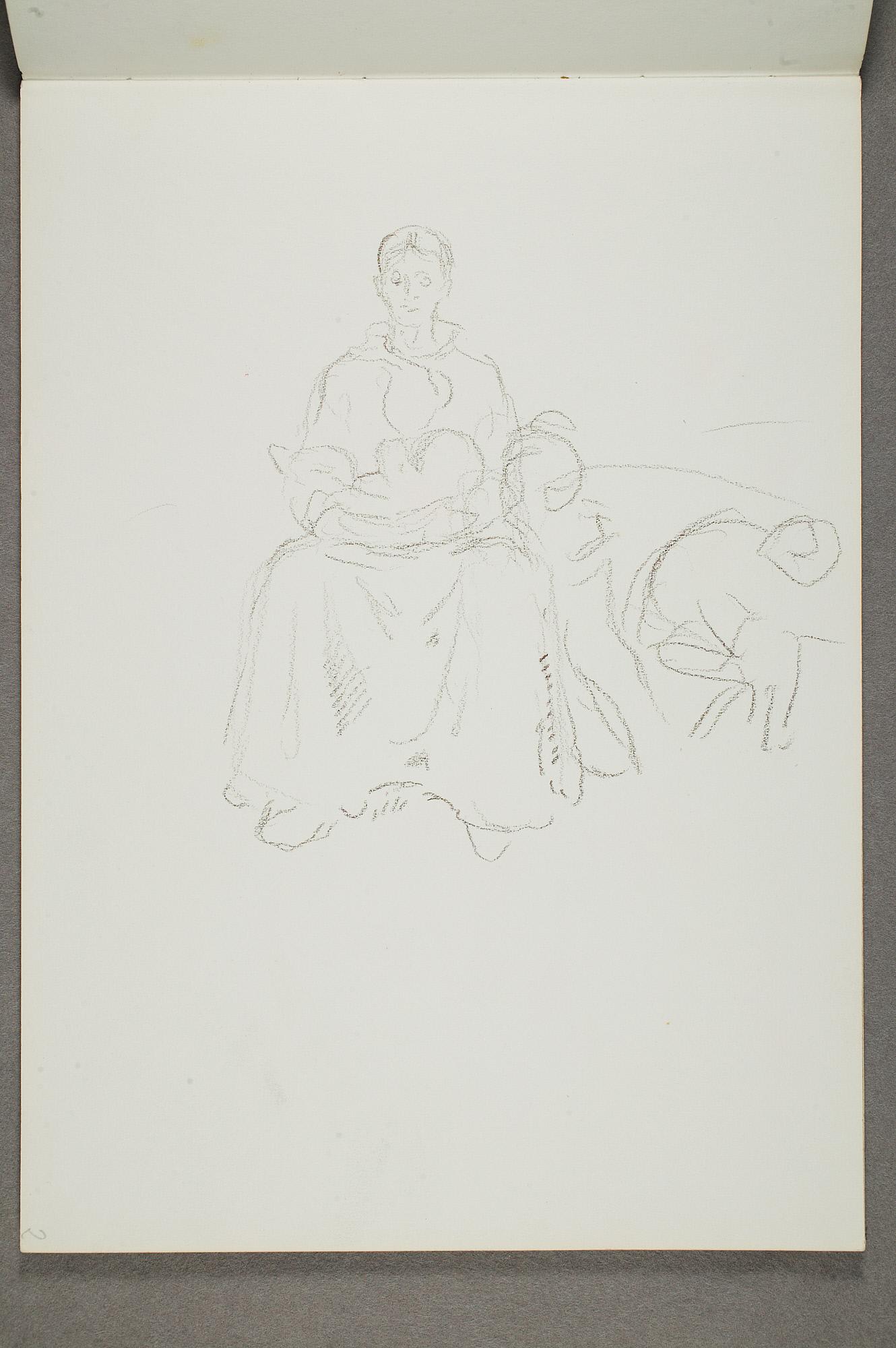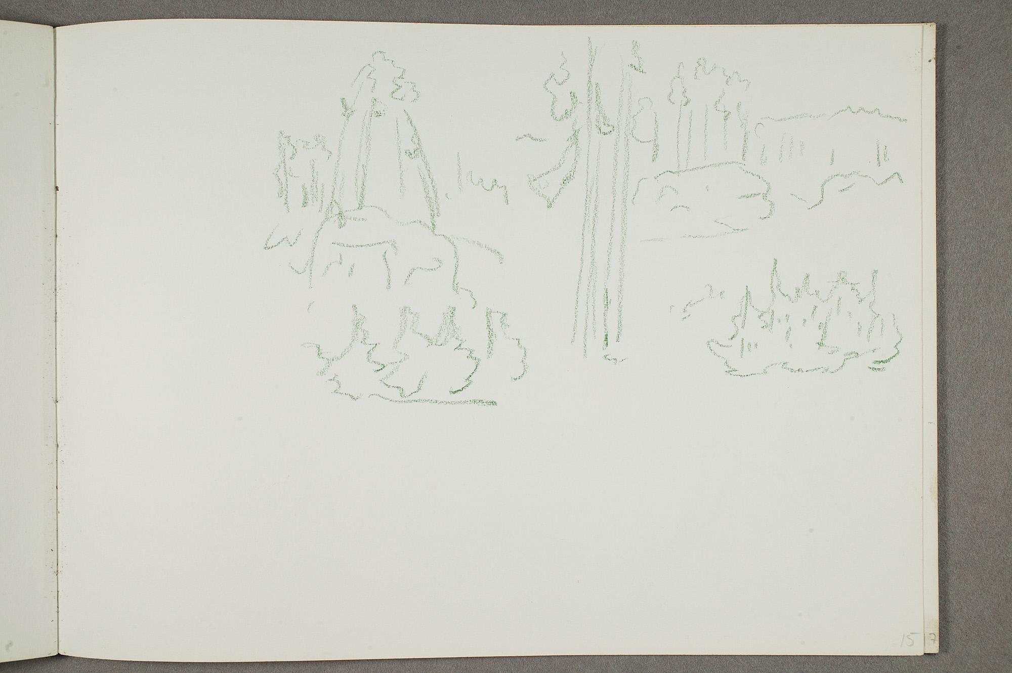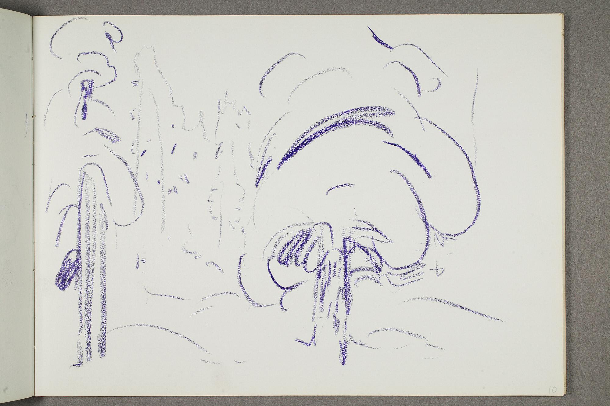 Comment:Denne typen skissebok, fra Winsor & Newton, finnes det 10 av i Munchmuseets samling, og alle er blitt brukt i Kragerø-perioden, 1909–15. Tegningene i denne skisseboken består av blant annet aulamotiver, «Adam og Eva», «Skogskatedral», «Klutesamleren» og «Arbeidere i snø». Flere er utført i samme teknikk – fargestift i flere farger, som følger etter hverandre i boken, noe som er med på avgjøre skissebokens datering. (PP)