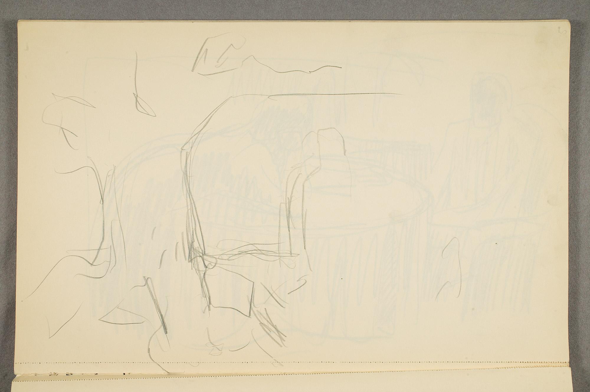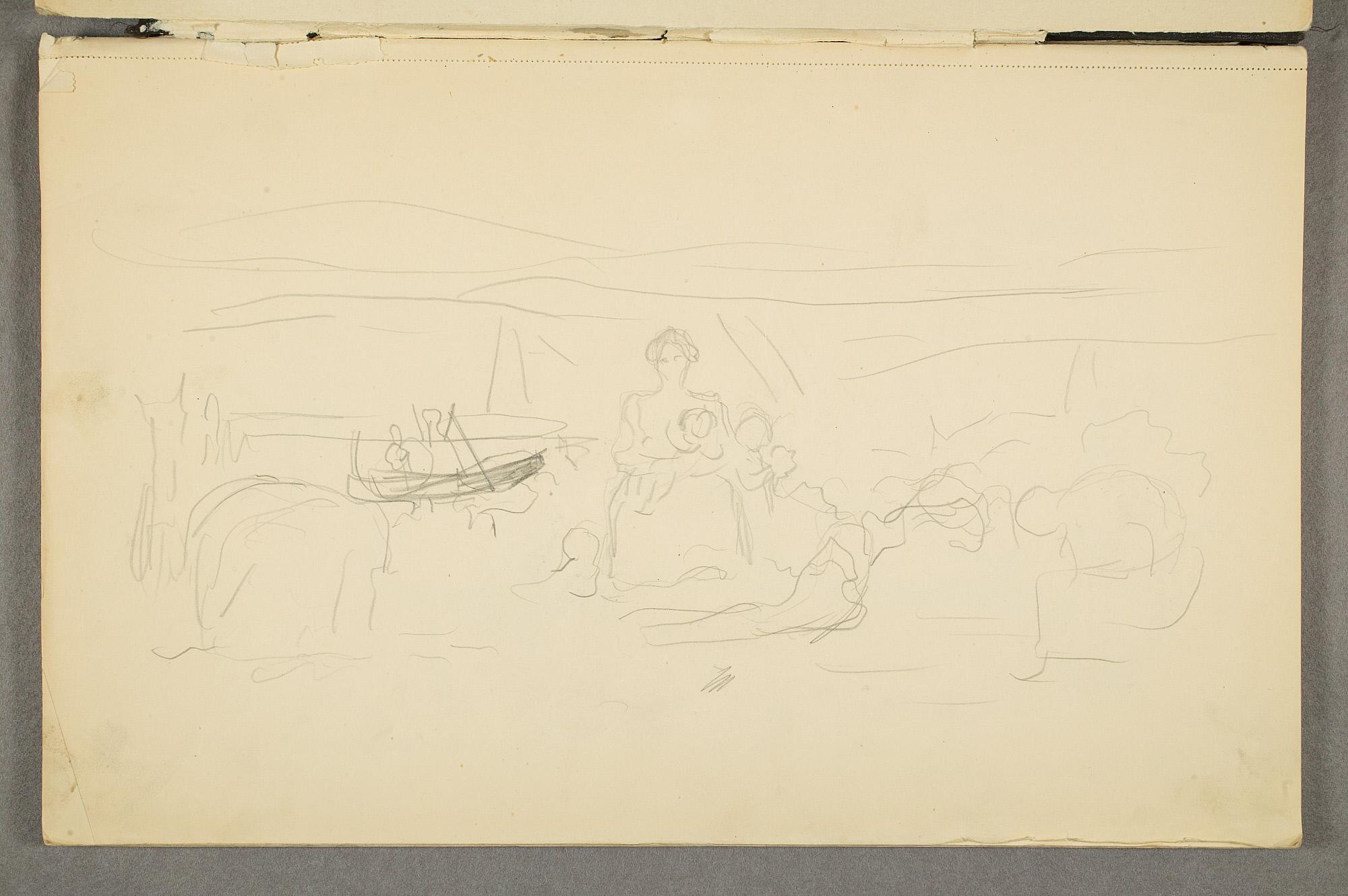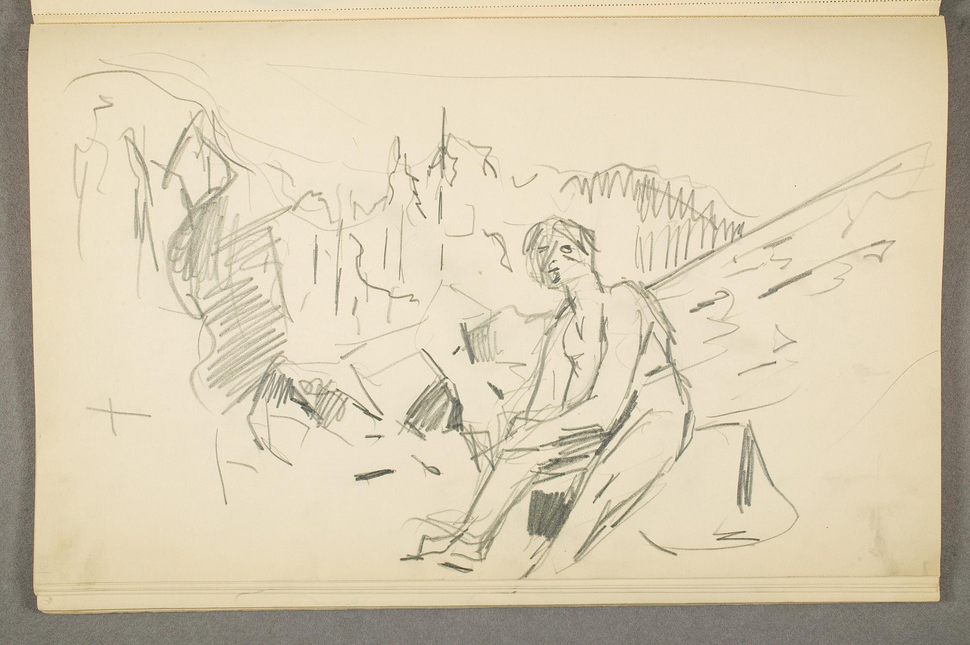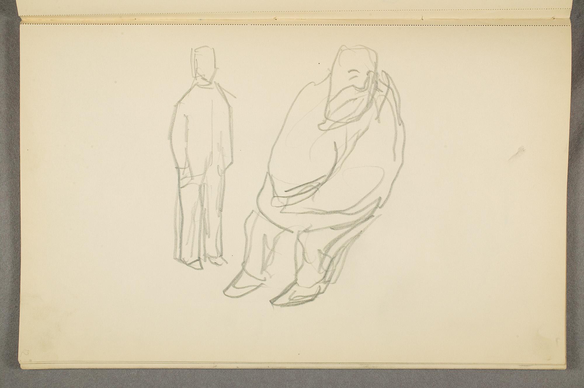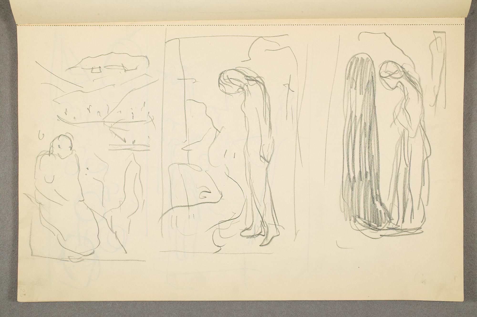 Comment:Det er stor motivvariasjon i denne skisseboken, og flere av tegningene har få eller ingen holdepunkter for datering. Mange kan likevel dateres innenfor perioden 1910–15, og alle er utført med enten blyant eller svart fargestift. Ingen av tegningene skiller seg nevneverdig ut med hensyn til stil, og det kan se ut som om alle ble utført innenfor en tidsramme på få år. En usikkerhet knyttes til tegningene med «Alma Mater. Forskerne» som er plassert helt mot slutten av skisseboken og der en sen datering kan være mulig. (PP)