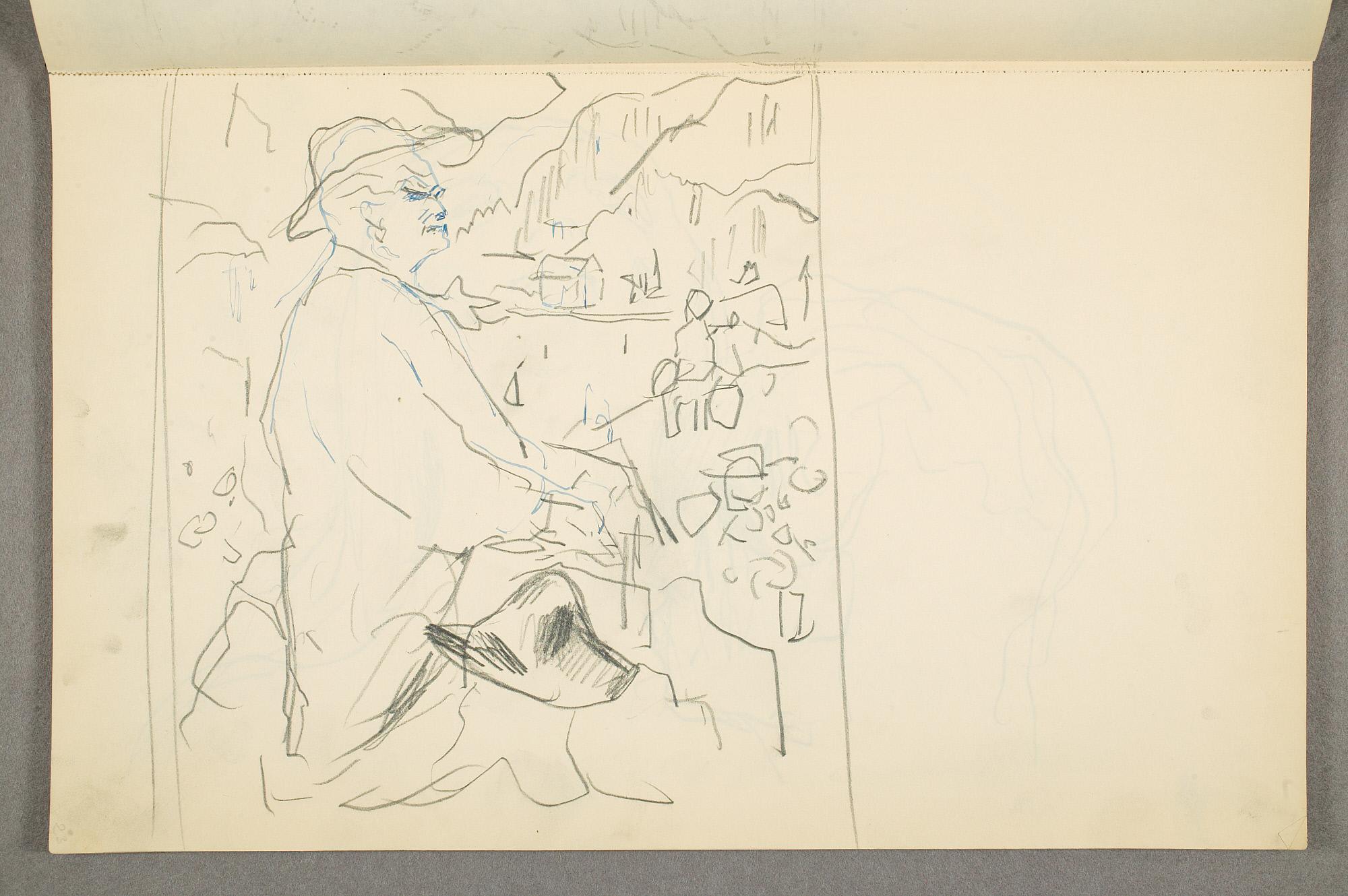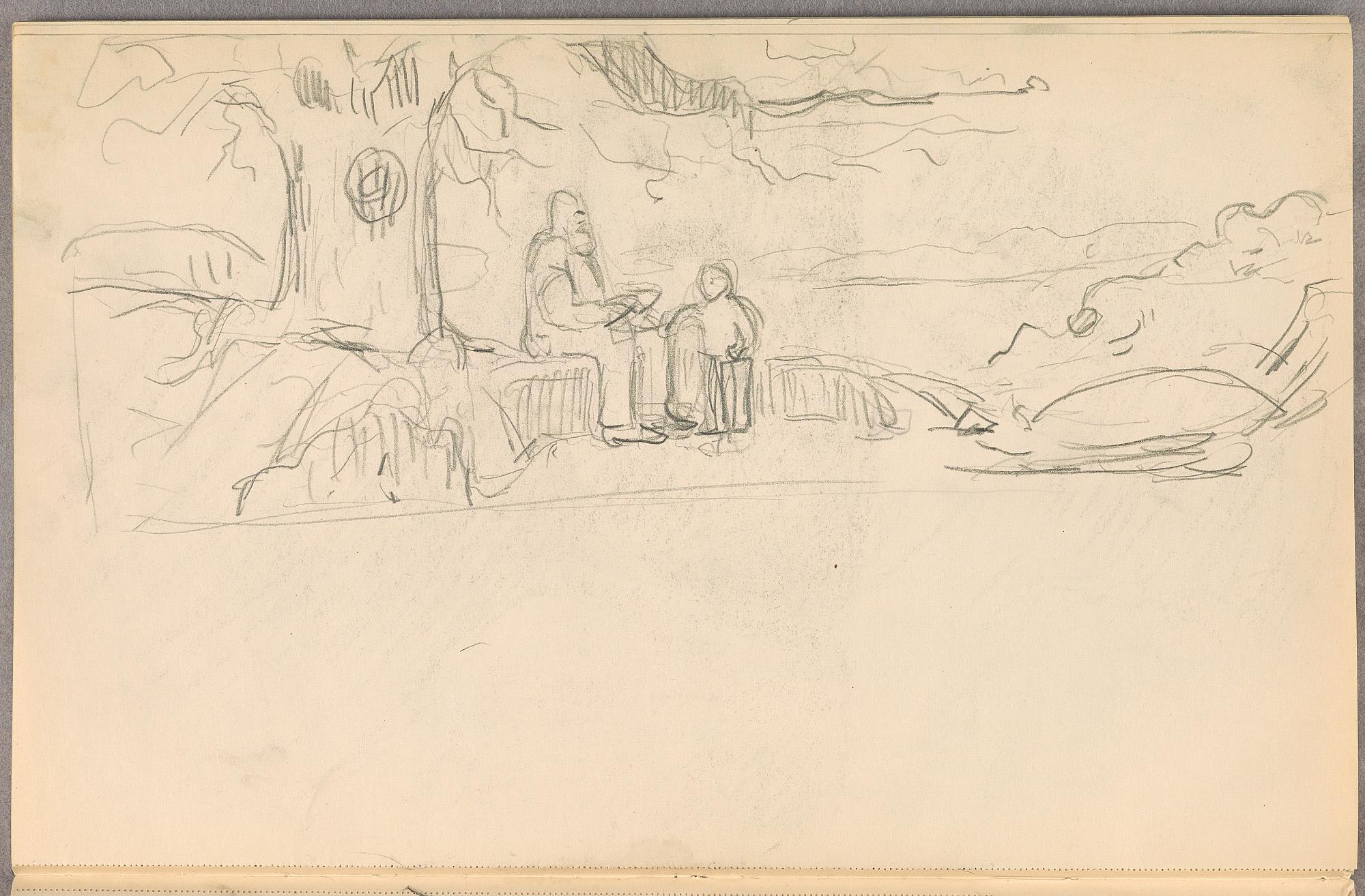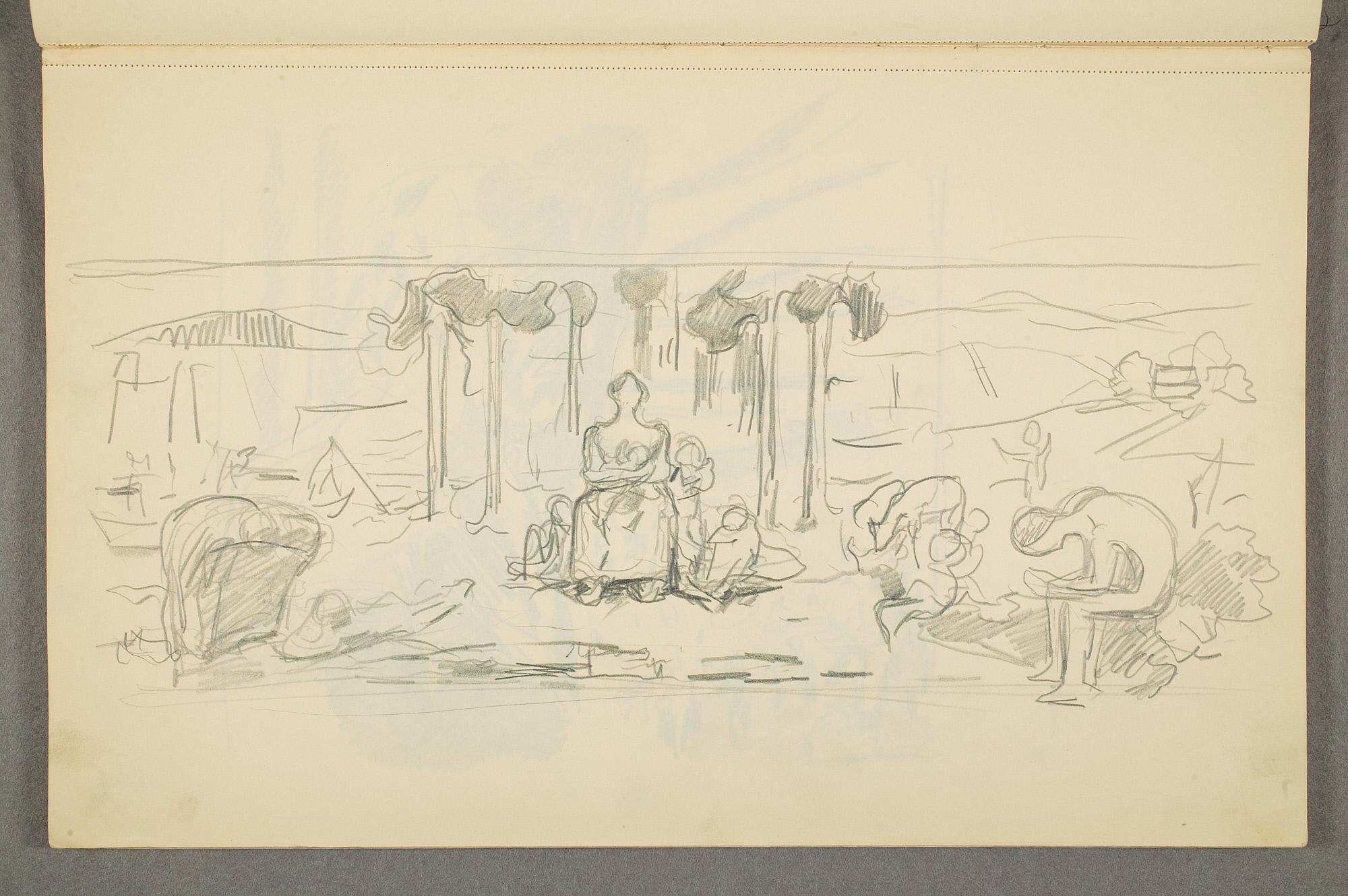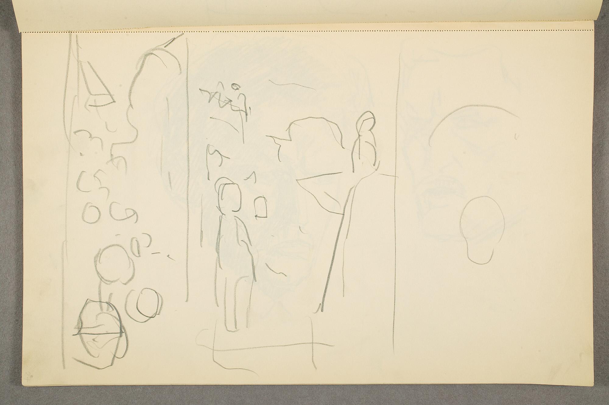 Comment:Det er stor motivvariasjon i denne skisseboken, og flere av tegningene har få eller ingen holdepunkter for datering. Mange kan likevel dateres innenfor perioden 1910–15, og alle er utført med enten blyant eller svart fargestift. Ingen av tegningene skiller seg nevneverdig ut med hensyn til stil, og det kan se ut som om alle ble utført innenfor en tidsramme på få år. En usikkerhet knyttes til tegningene med «Alma Mater. Forskerne» som er plassert helt mot slutten av skisseboken og der en sen datering kan være mulig. (PP)