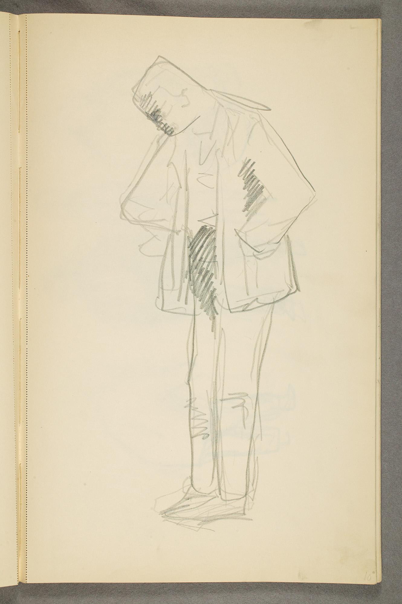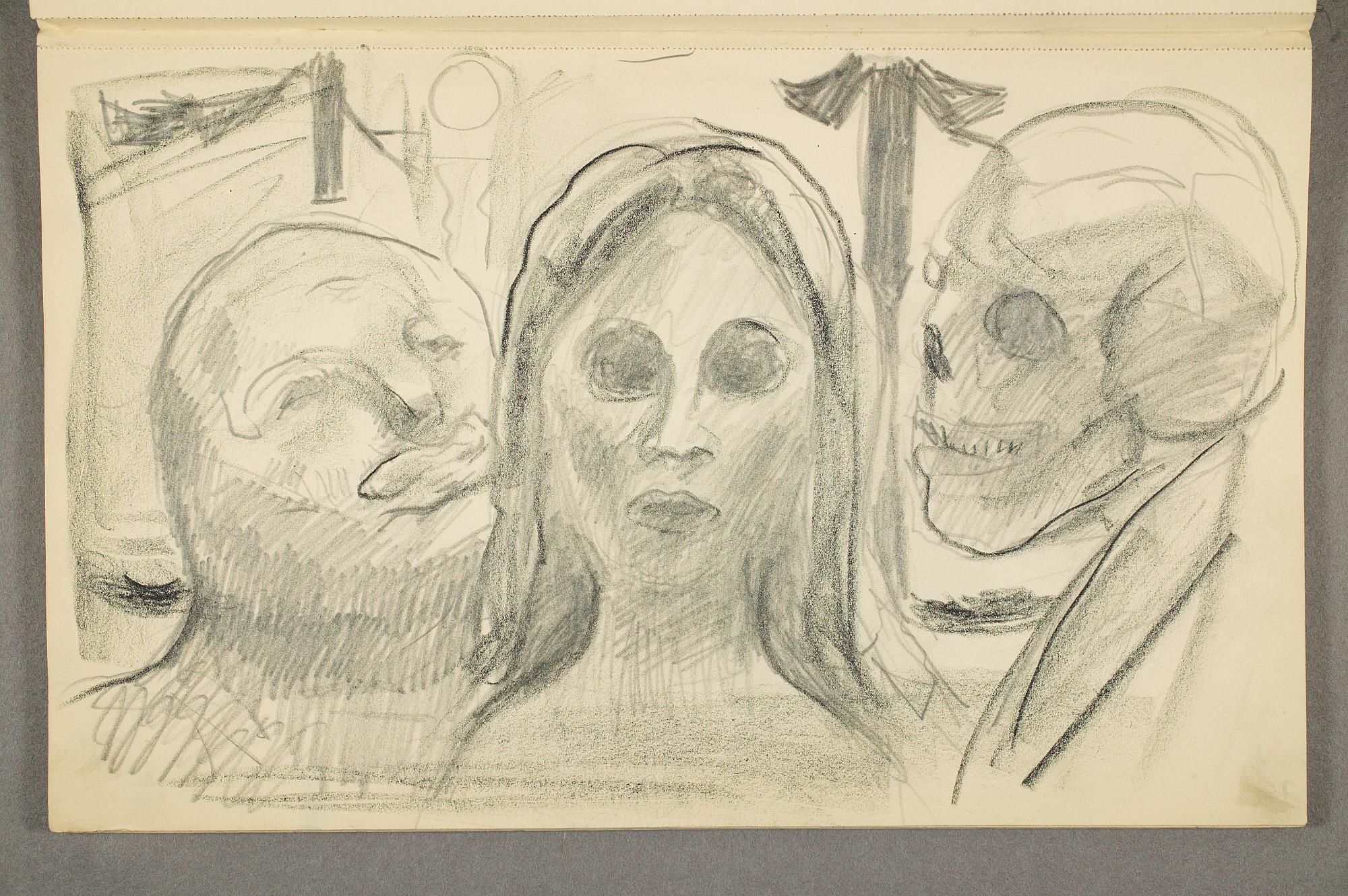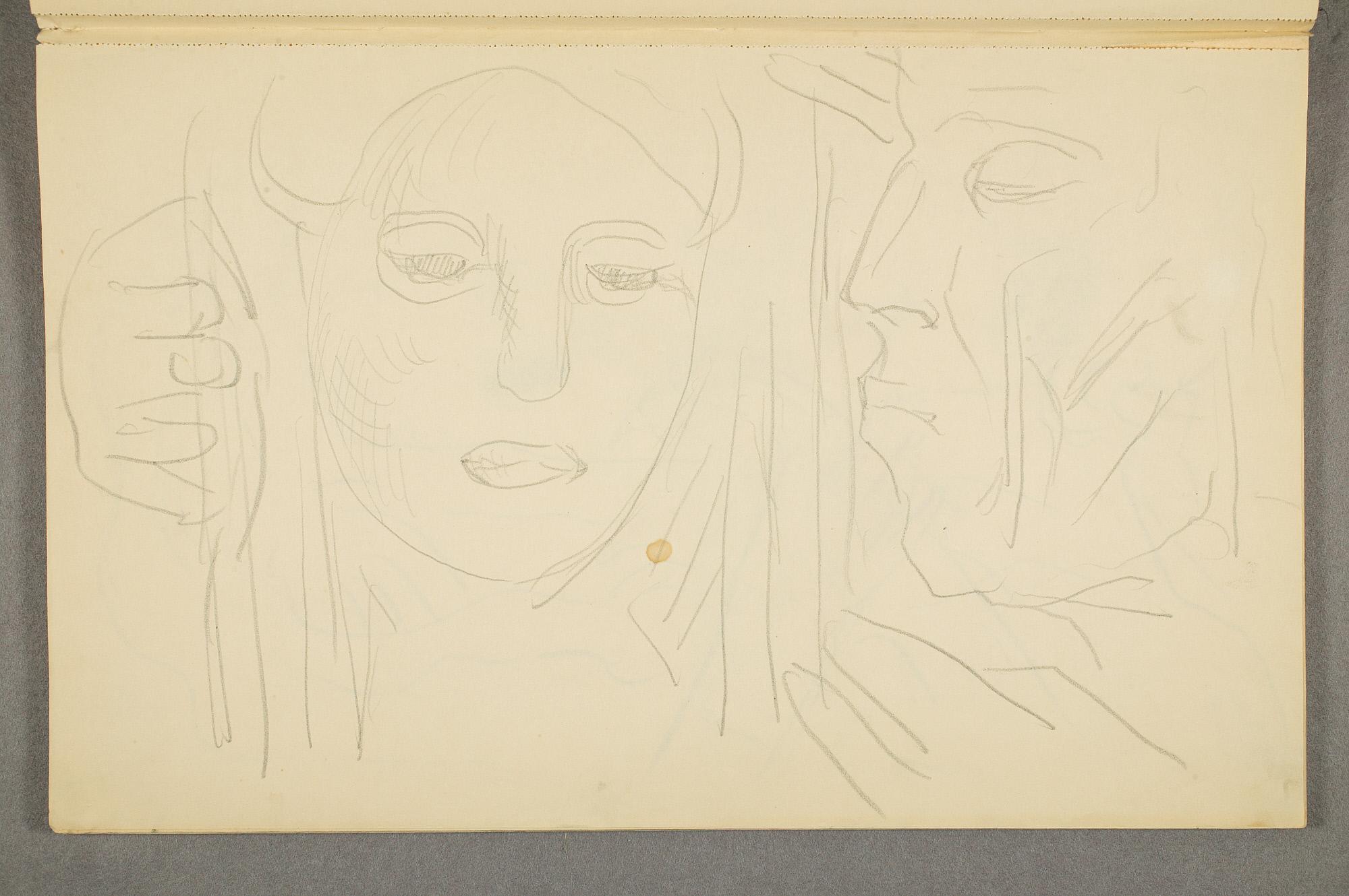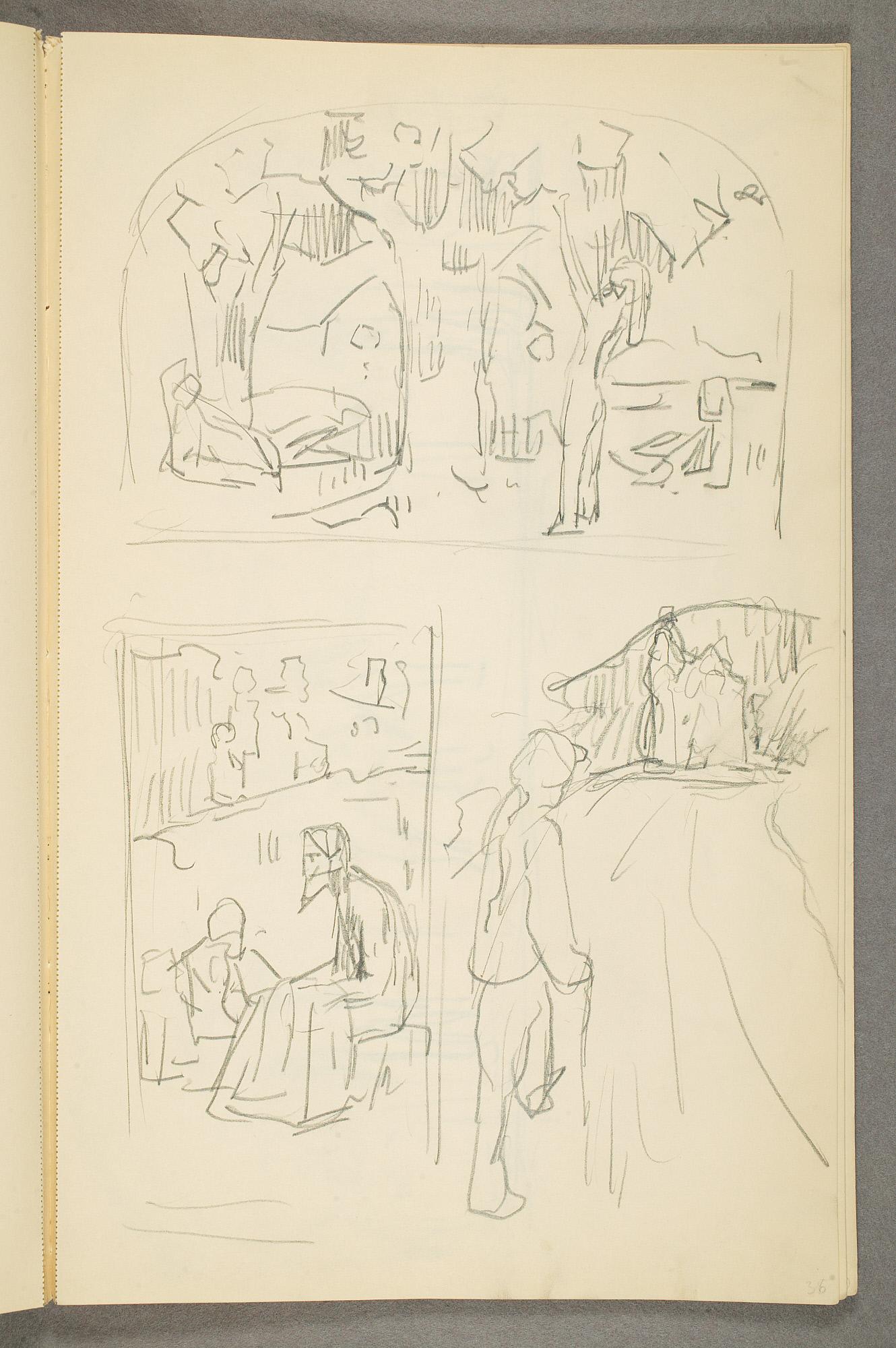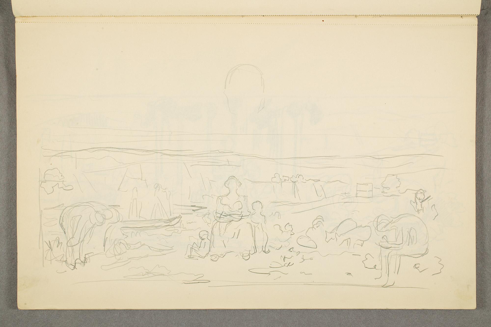 Comment:Det er stor motivvariasjon i denne skisseboken, og flere av tegningene har få eller ingen holdepunkter for datering. Mange kan likevel dateres innenfor perioden 1910–15, og alle er utført med enten blyant eller svart fargestift. Ingen av tegningene skiller seg nevneverdig ut med hensyn til stil, og det kan se ut som om alle ble utført innenfor en tidsramme på få år. En usikkerhet knyttes til tegningene med «Alma Mater. Forskerne» som er plassert helt mot slutten av skisseboken og der en sen datering kan være mulig. (PP)