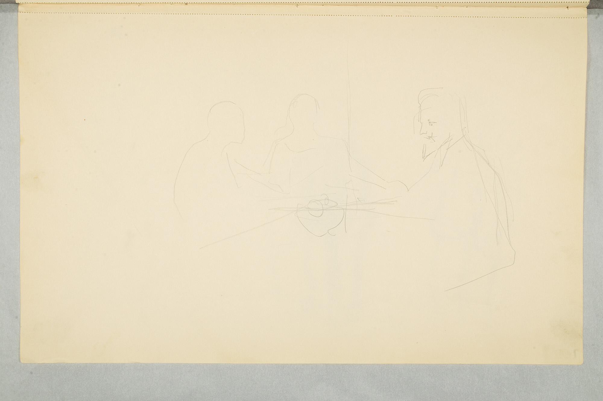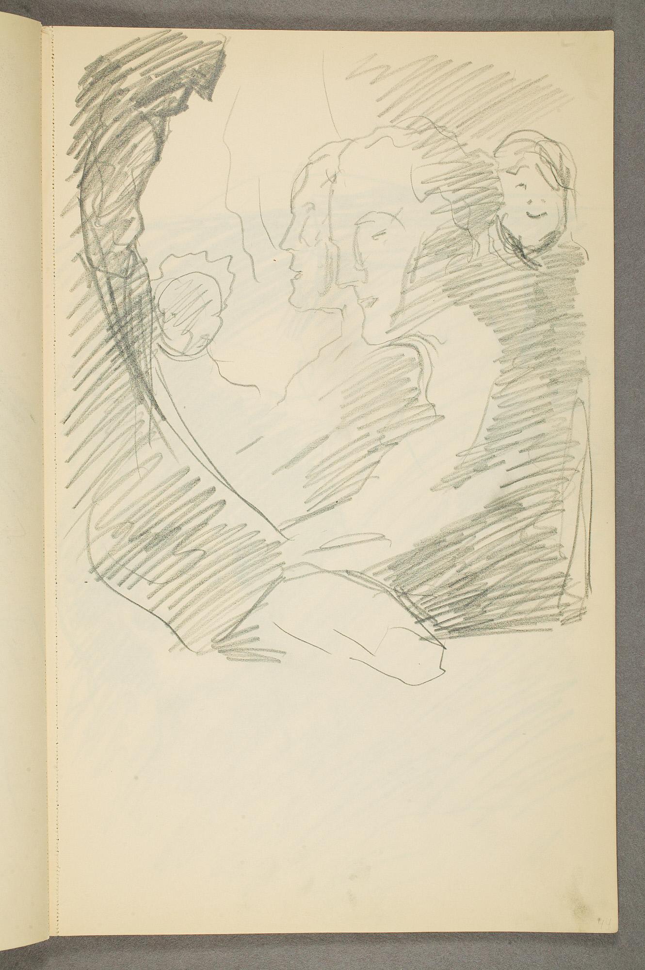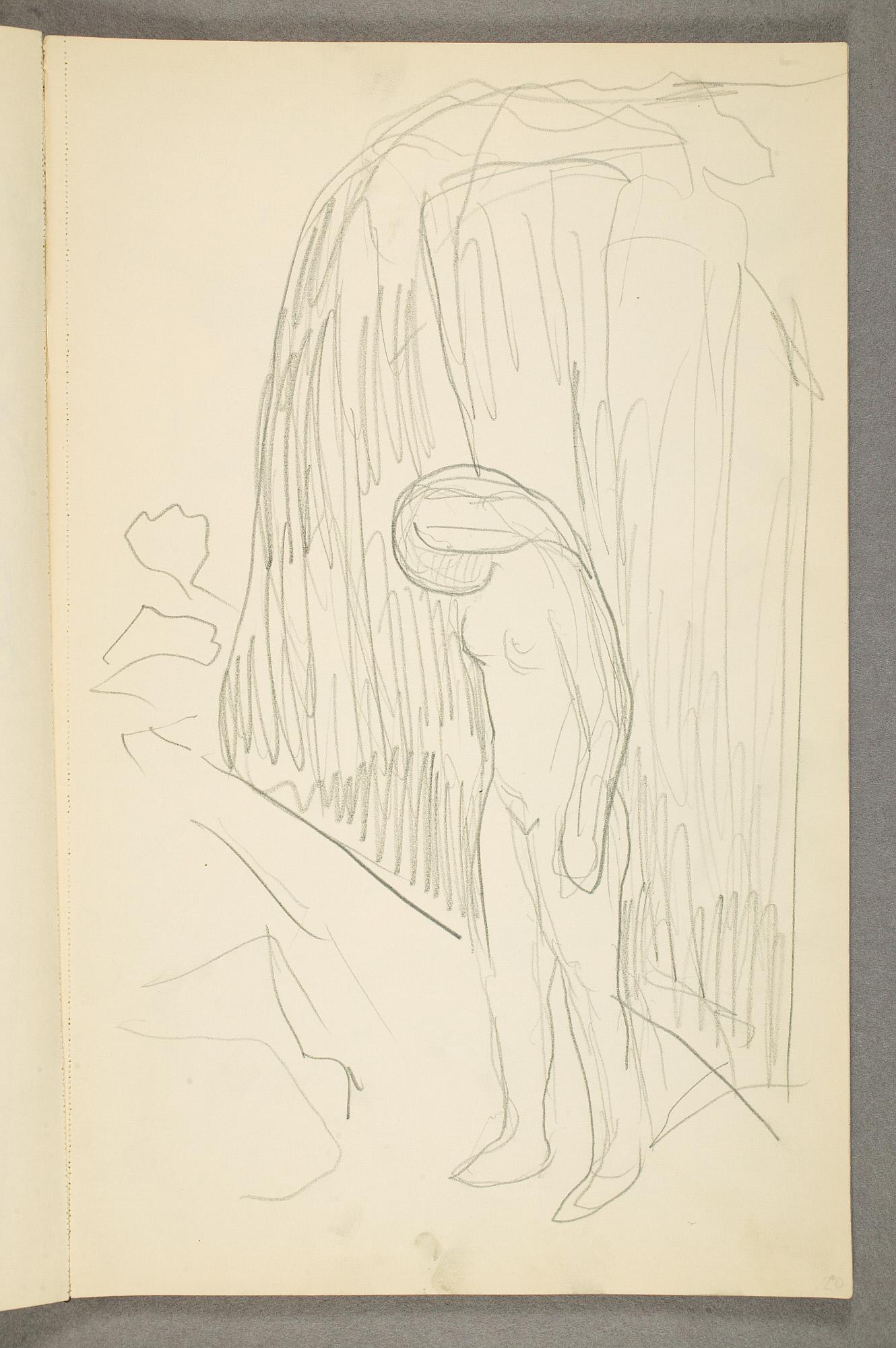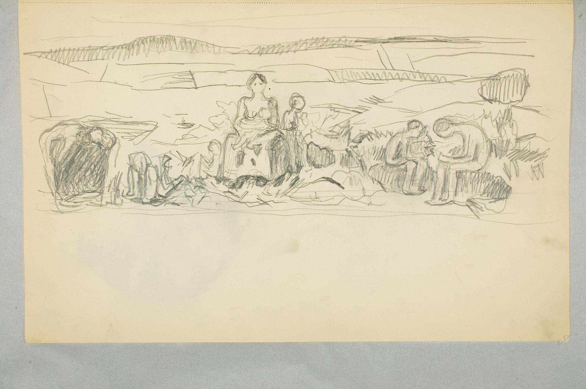Comment:Det er stor motivvariasjon i denne skisseboken, og flere av tegningene har få eller ingen holdepunkter for datering. Mange kan likevel dateres innenfor perioden 1910–15, og alle er utført med enten blyant eller svart fargestift. Ingen av tegningene skiller seg nevneverdig ut med hensyn til stil, og det kan se ut som om alle ble utført innenfor en tidsramme på få år. En usikkerhet knyttes til tegningene med «Alma Mater. Forskerne» som er plassert helt mot slutten av skisseboken og der en sen datering kan være mulig. (PP)