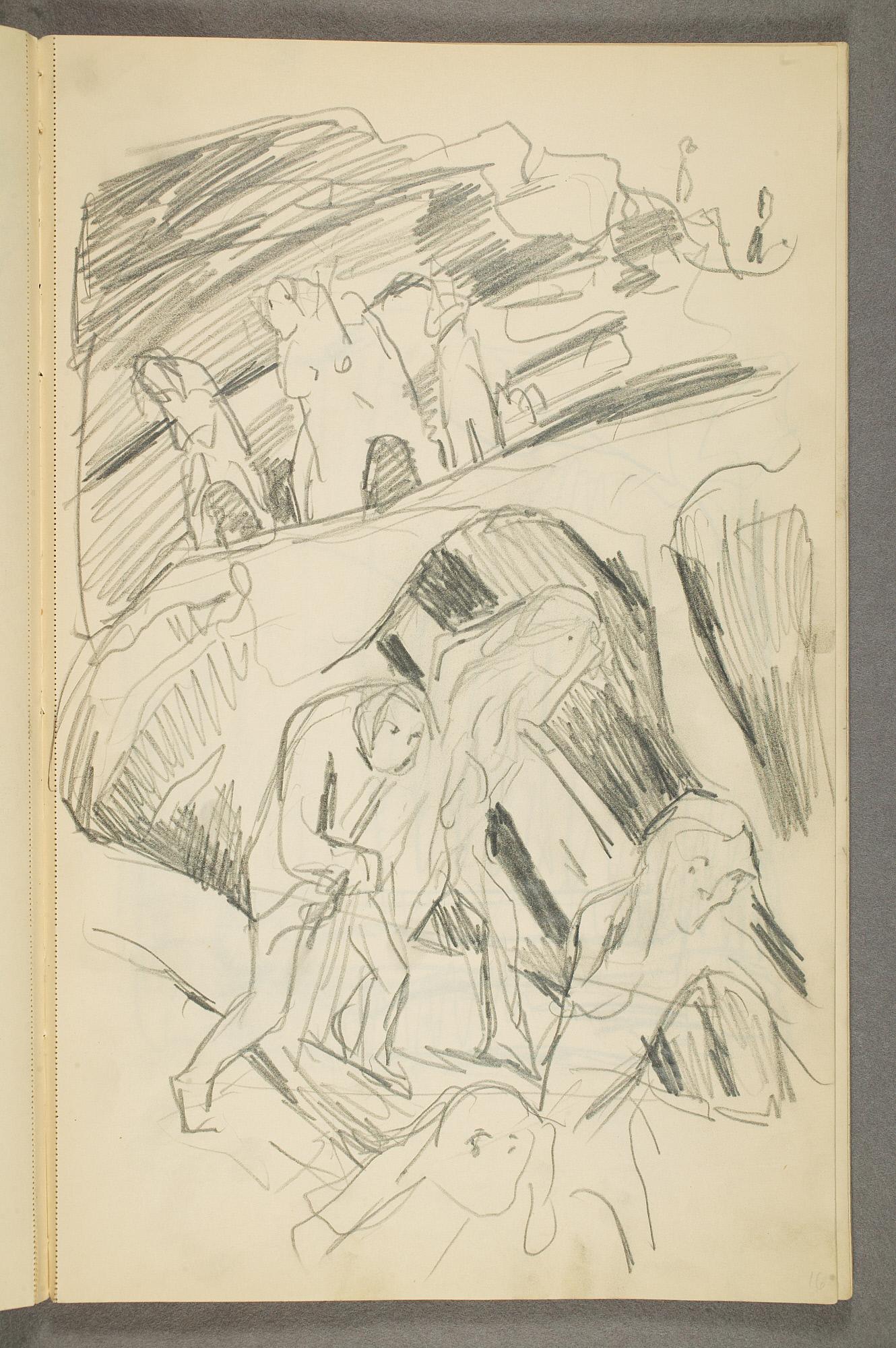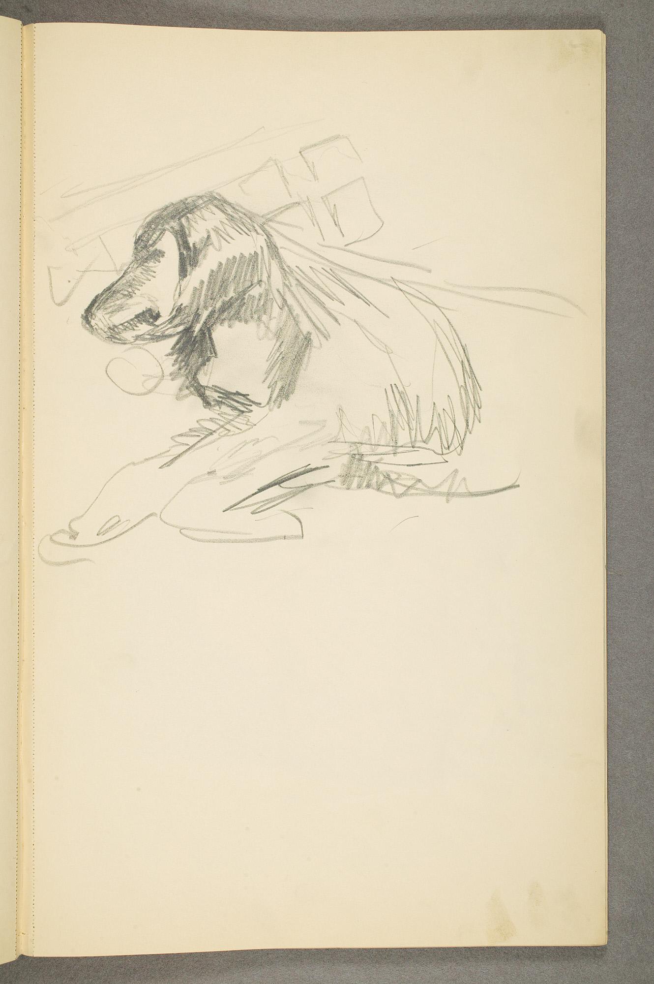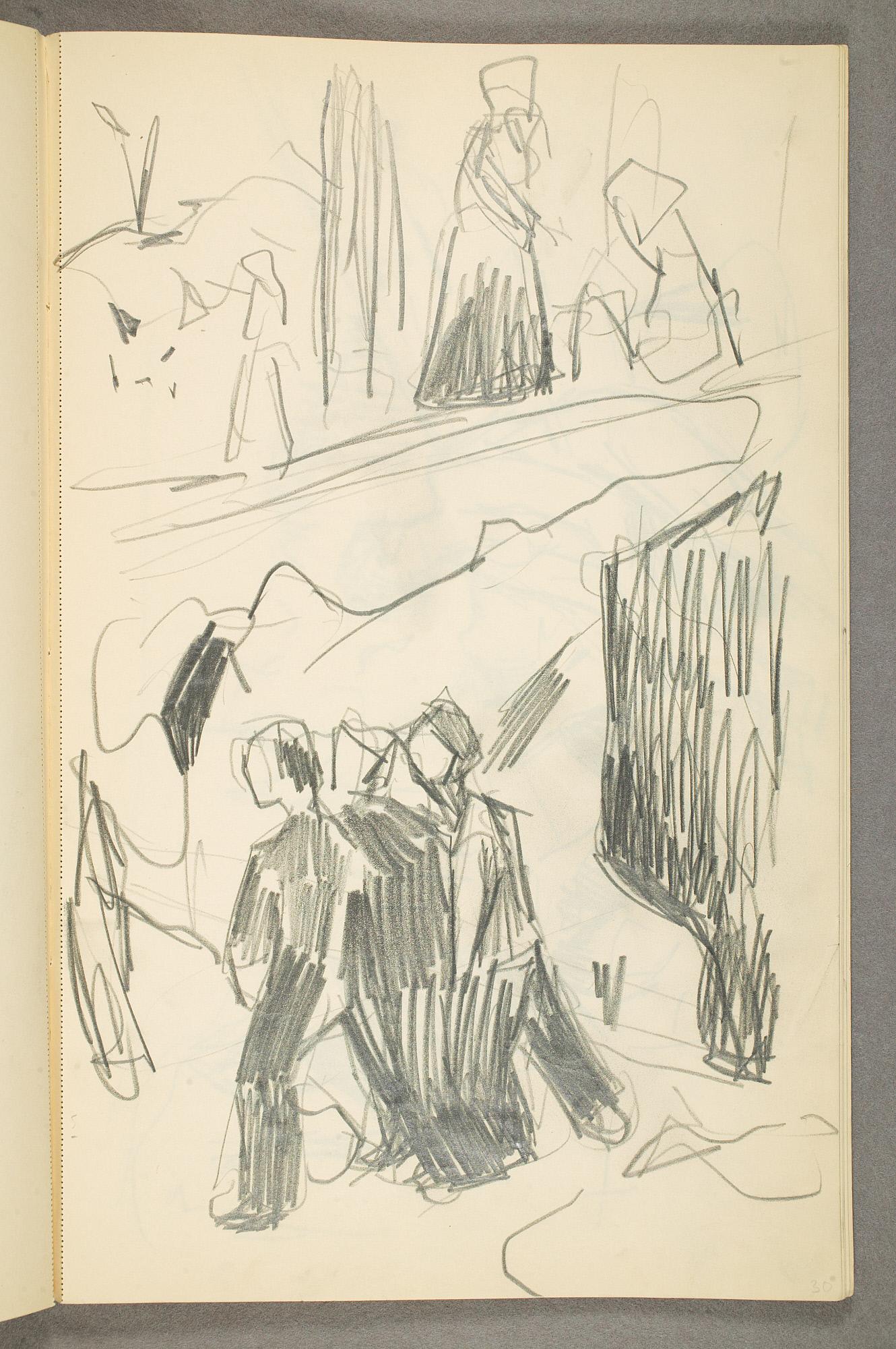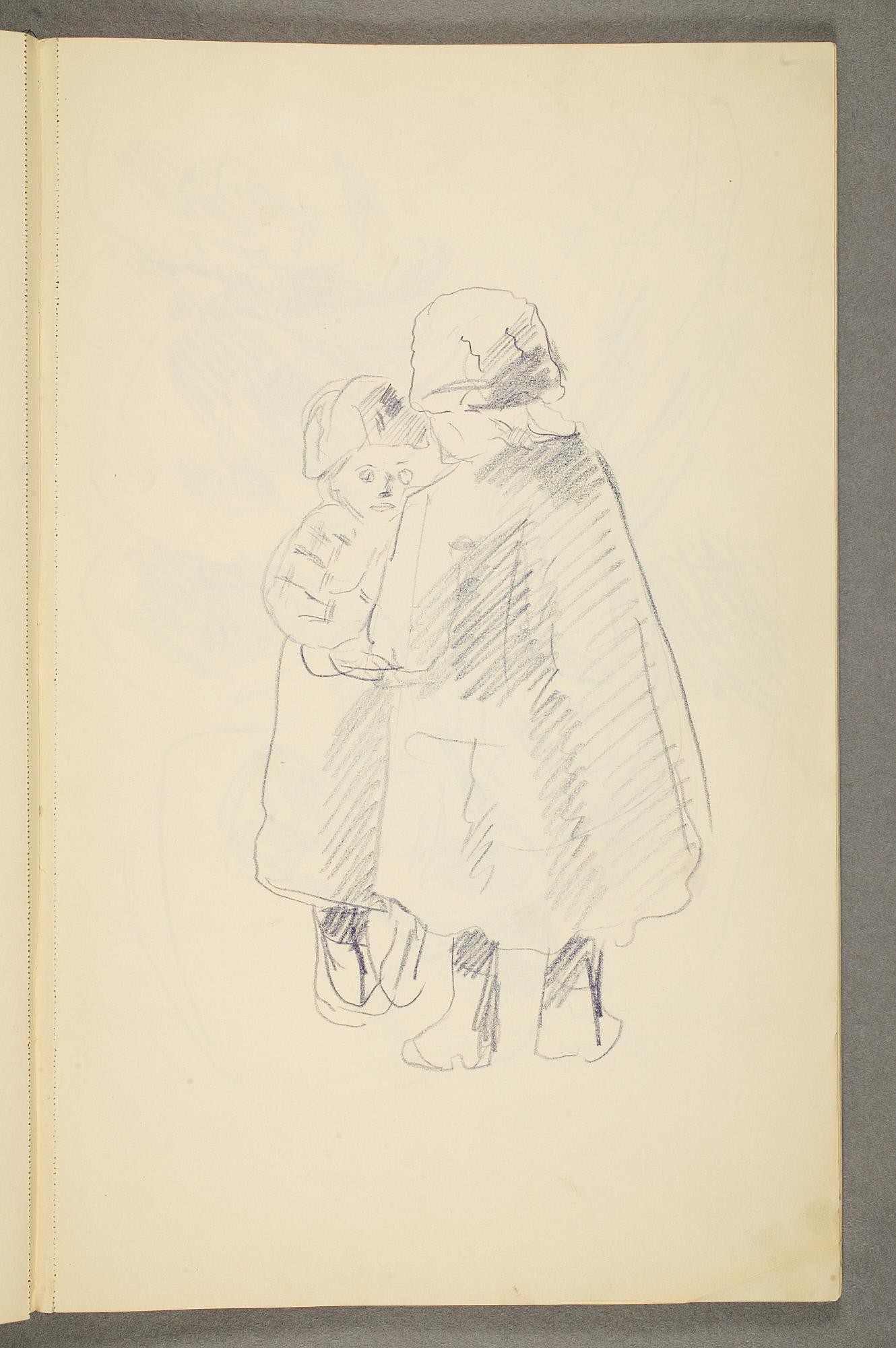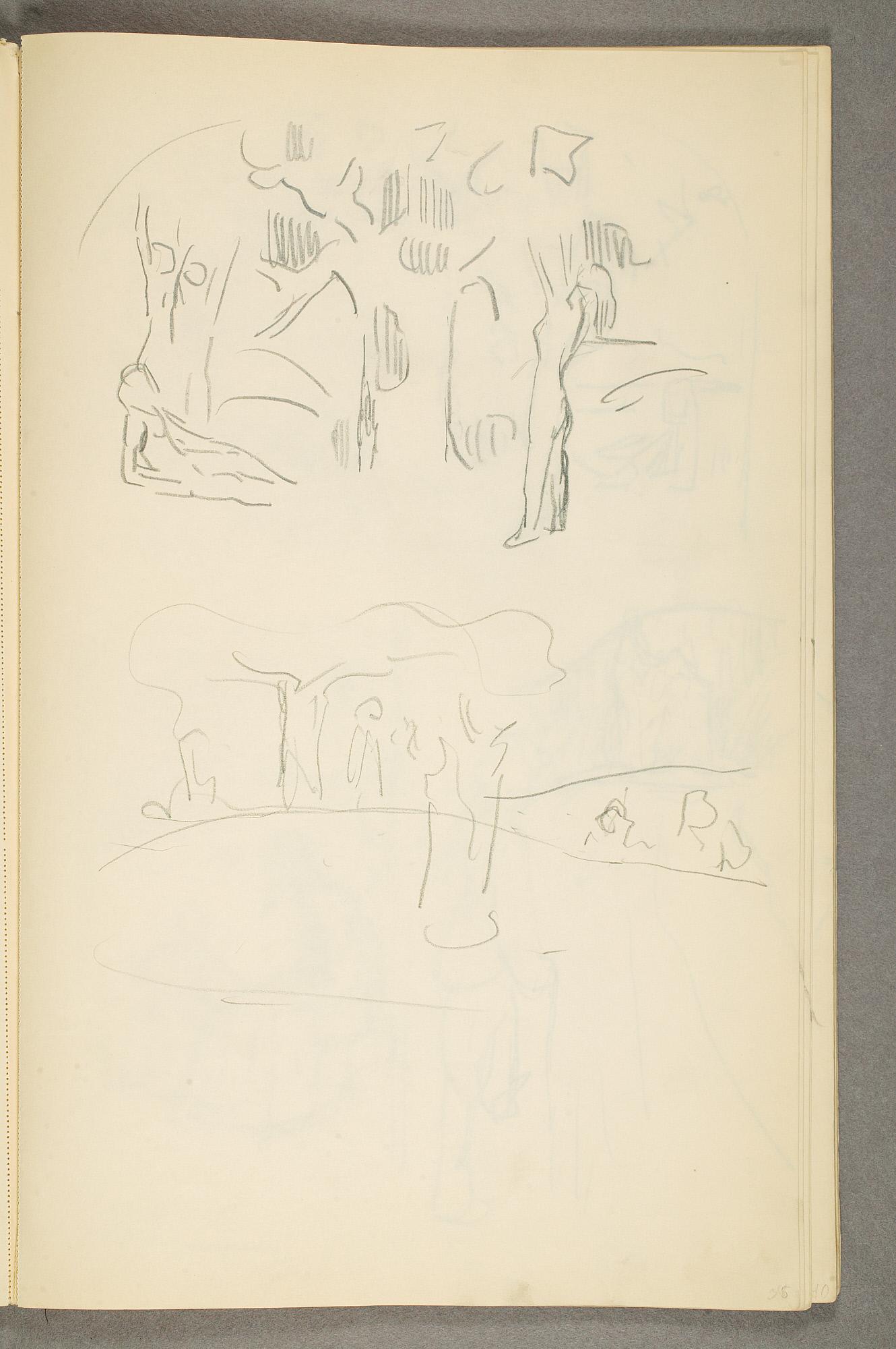 Comment:Det er stor motivvariasjon i denne skisseboken, og flere av tegningene har få eller ingen holdepunkter for datering. Mange kan likevel dateres innenfor perioden 1910–15, og alle er utført med enten blyant eller svart fargestift. Ingen av tegningene skiller seg nevneverdig ut med hensyn til stil, og det kan se ut som om alle ble utført innenfor en tidsramme på få år. En usikkerhet knyttes til tegningene med «Alma Mater. Forskerne» som er plassert helt mot slutten av skisseboken og der en sen datering kan være mulig. (PP)