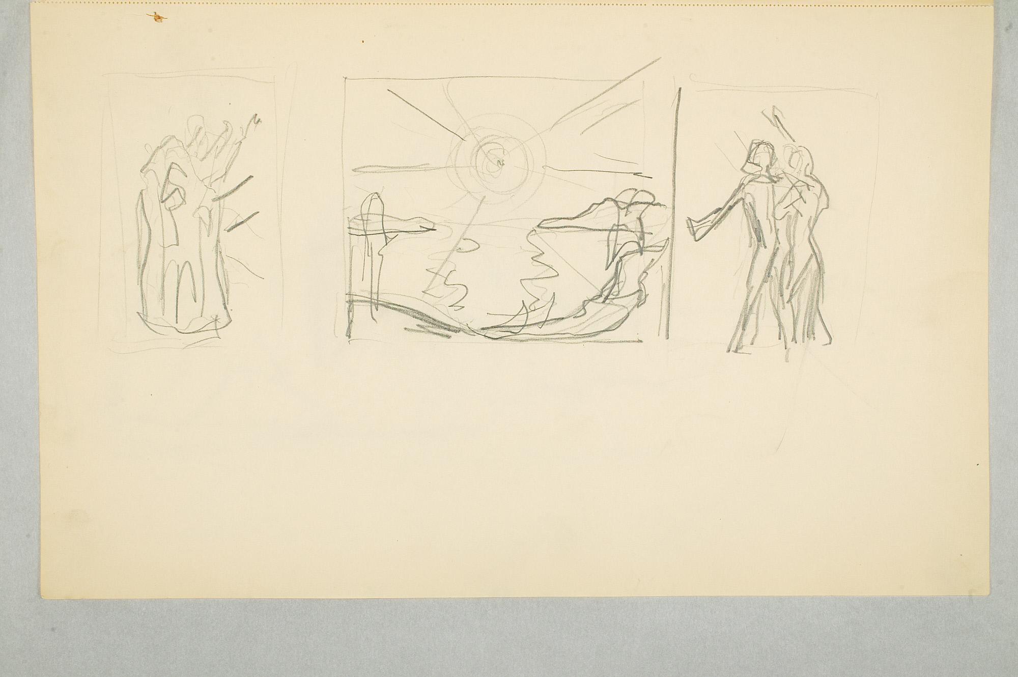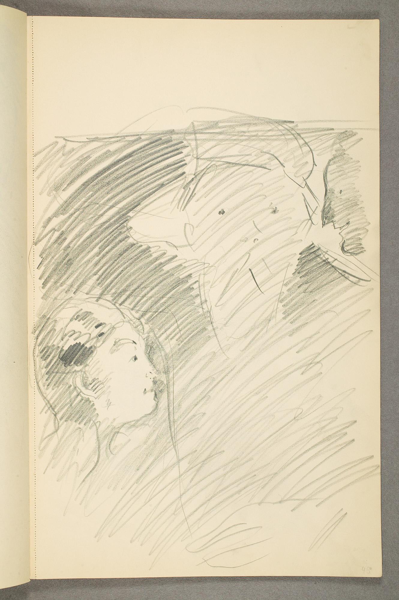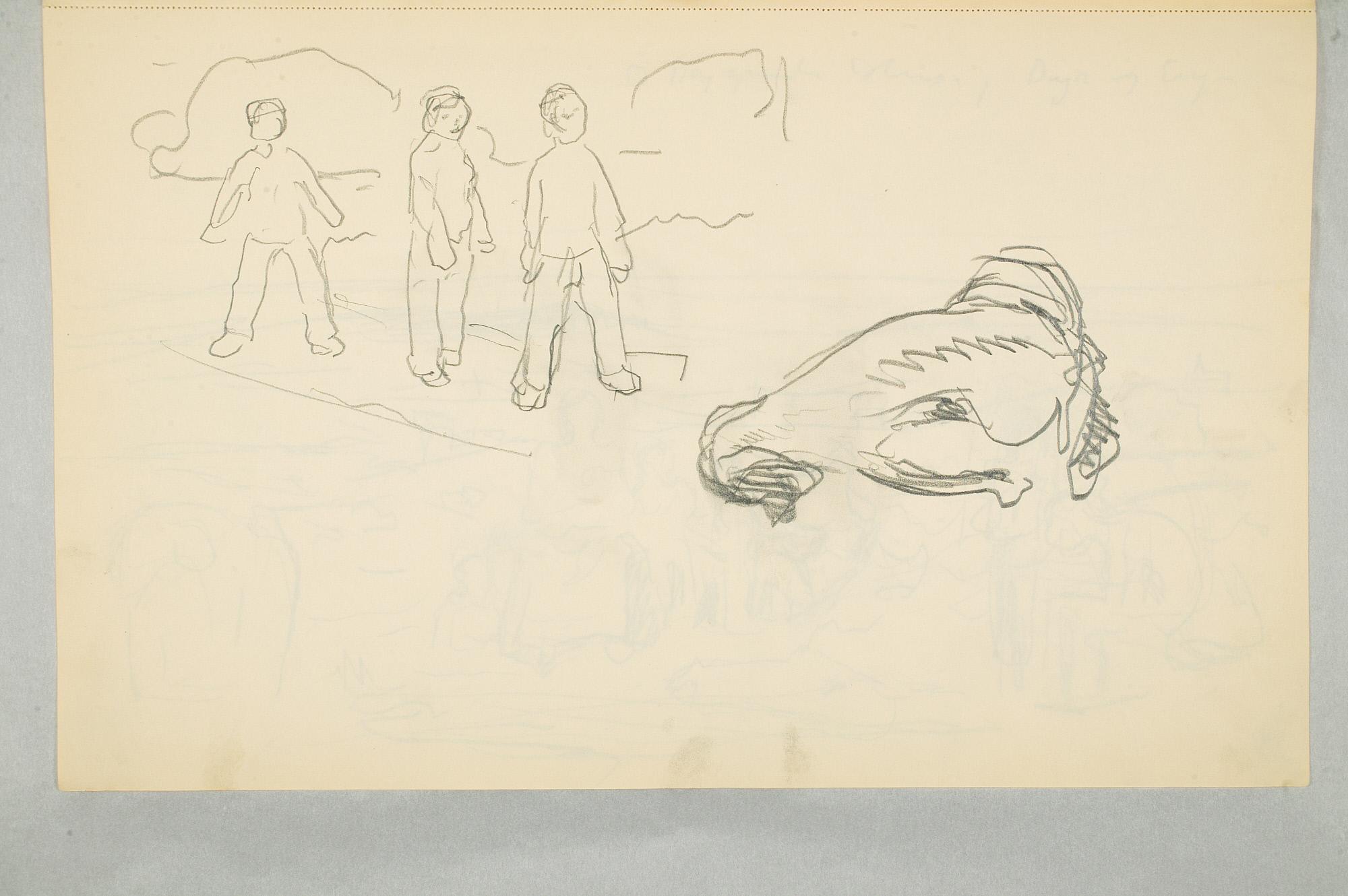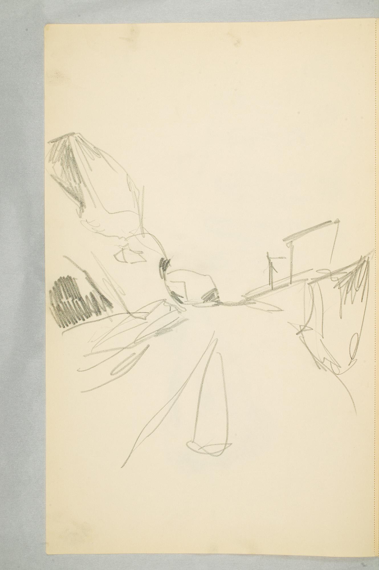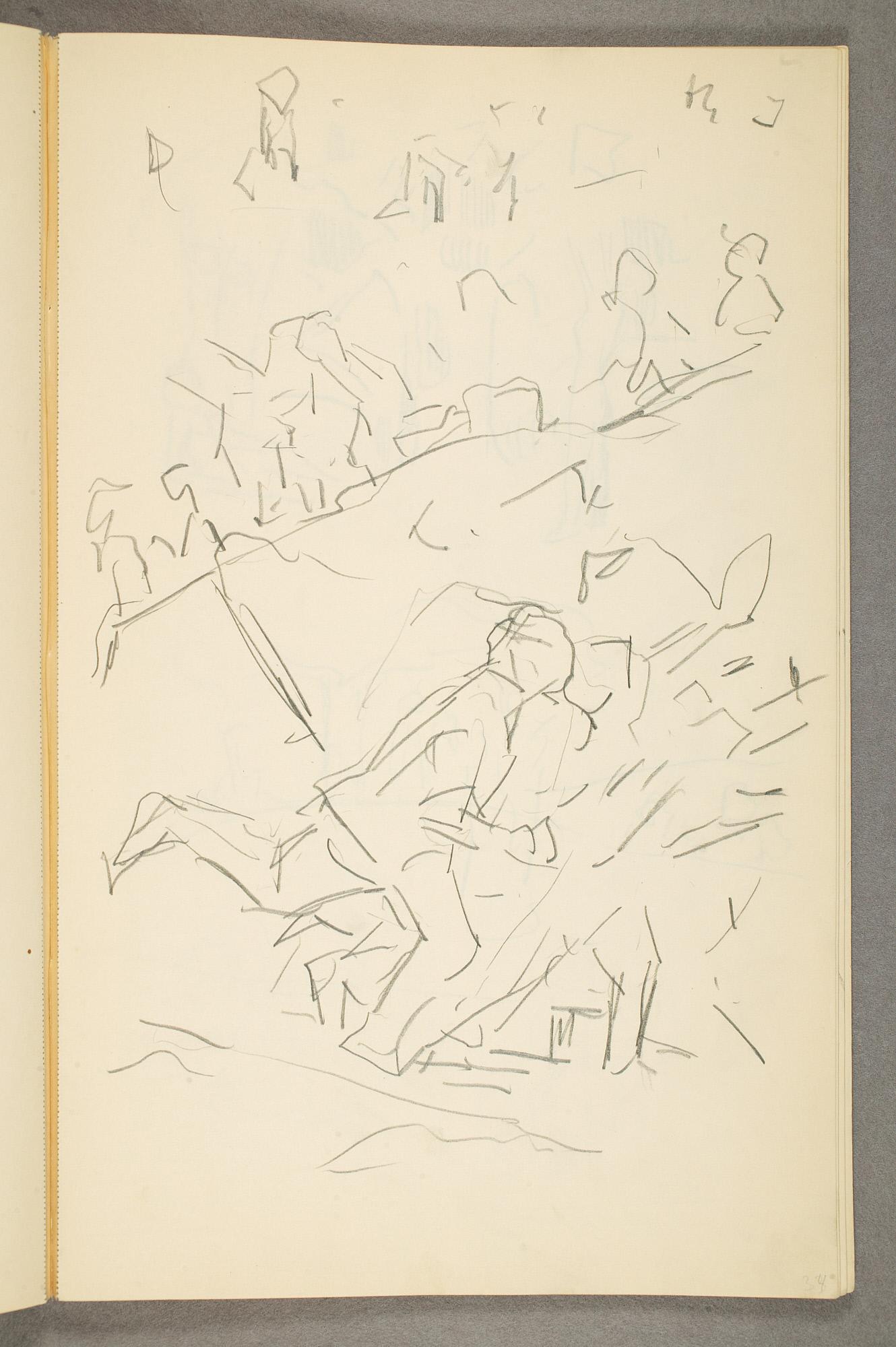 Comment:Det er stor motivvariasjon i denne skisseboken, og flere av tegningene har få eller ingen holdepunkter for datering. Mange kan likevel dateres innenfor perioden 1910–15, og alle er utført med enten blyant eller svart fargestift. Ingen av tegningene skiller seg nevneverdig ut med hensyn til stil, og det kan se ut som om alle ble utført innenfor en tidsramme på få år. En usikkerhet knyttes til tegningene med «Alma Mater. Forskerne» som er plassert helt mot slutten av skisseboken og der en sen datering kan være mulig. (PP)