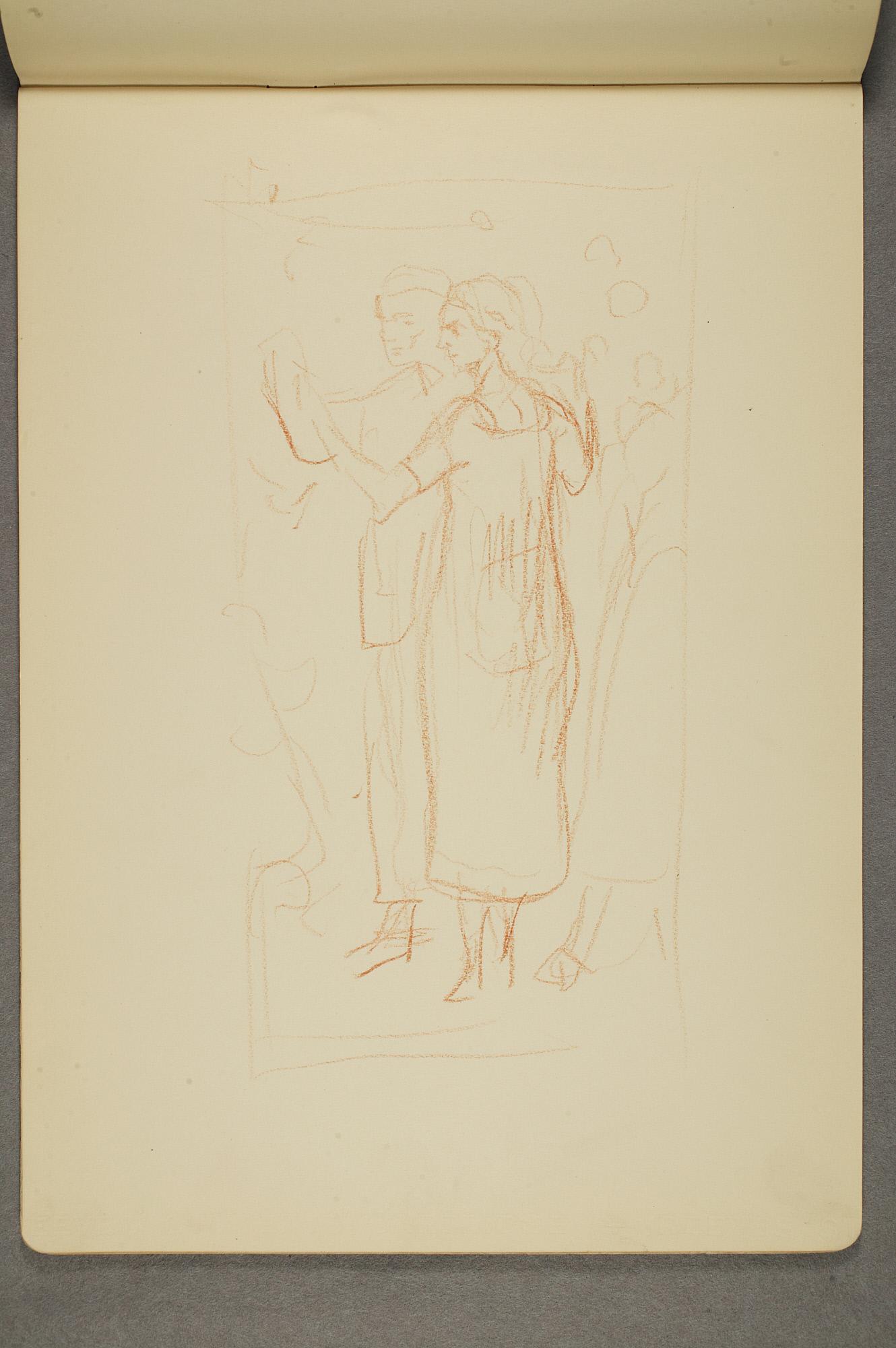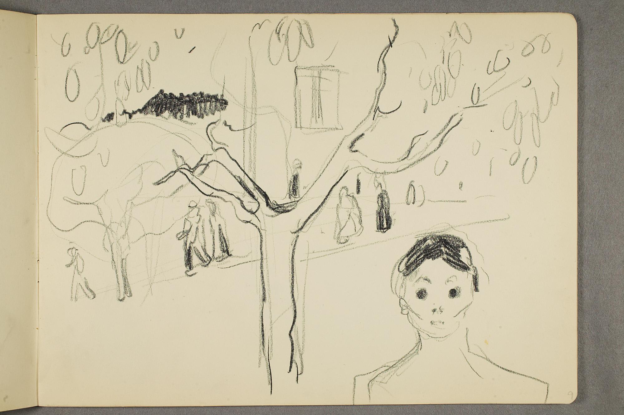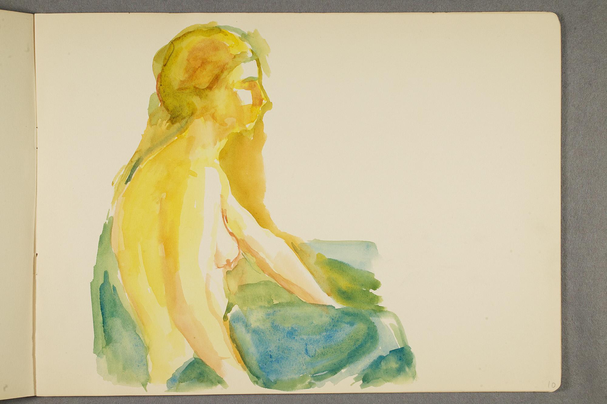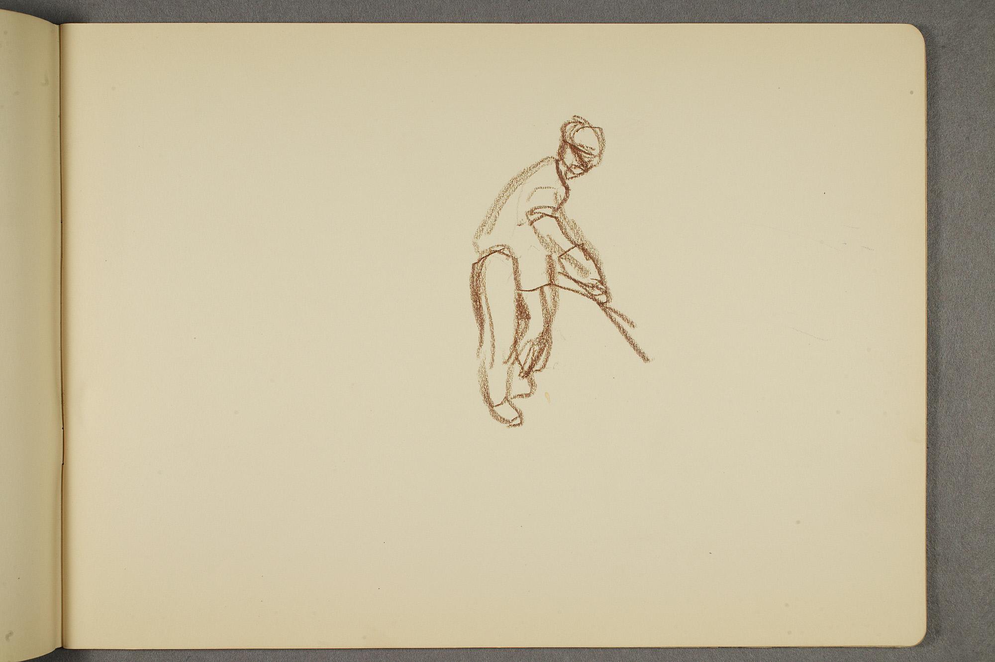 Comment:En del av tegningene i skisseboken er datert innenfor tidsspennet 1916–24, og det er vanskelig å tidfeste flere av dem mer nøyaktig. Skisseboken ble sannsynligvis kjøpt i København 1912–15, sammen med en annen, identisk skissebok (MM.T.00196). Ut fra tegningene i de to bøkene kan det virke som Munch begynte på den andre boken først, og at de første tegningene i denne stammer fra 1916. Akvarellen på side 10 er sannsynligvis av Hildur Christensen, Munchs husholderske og modell 1923–33. (PP)
