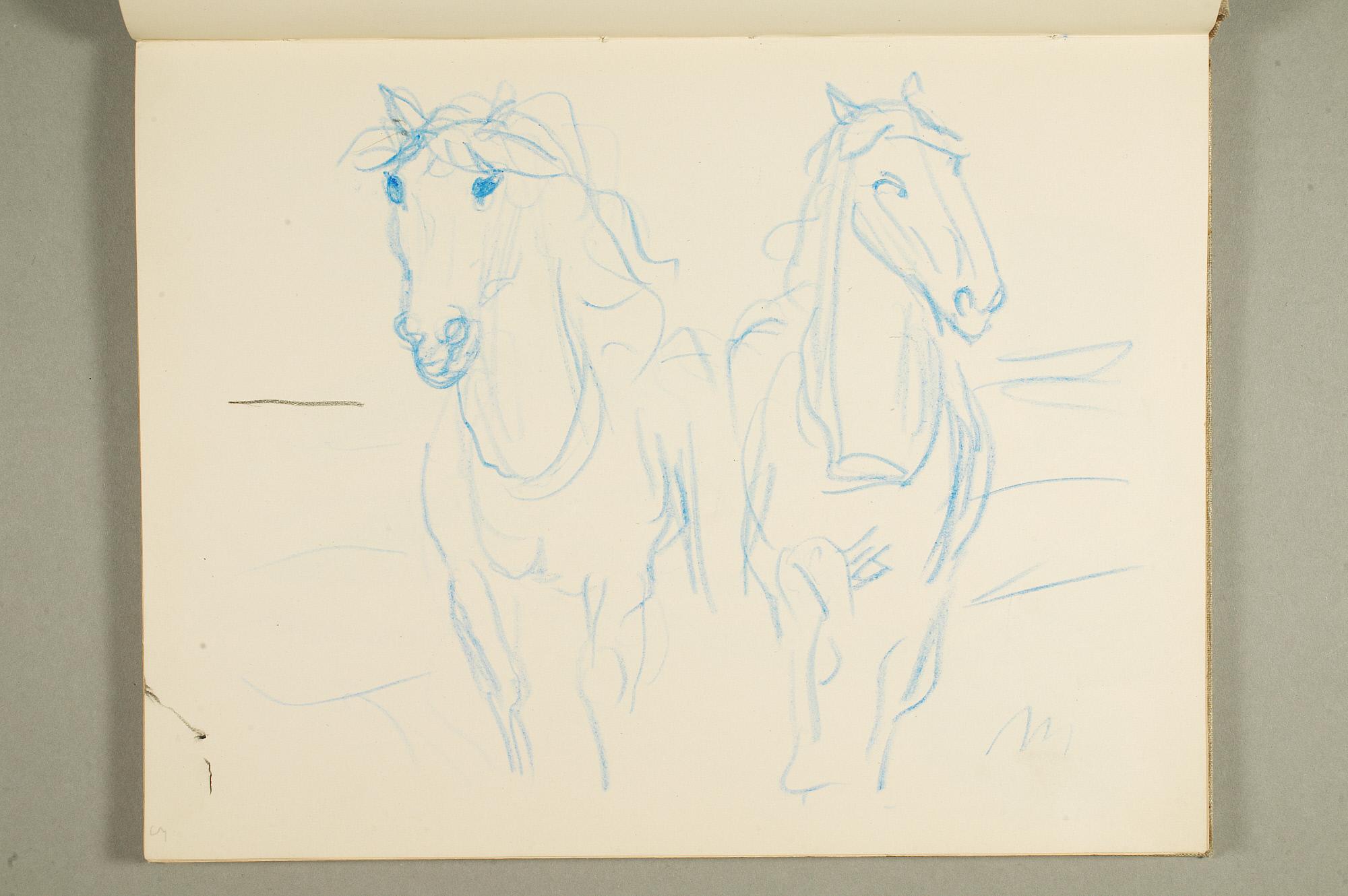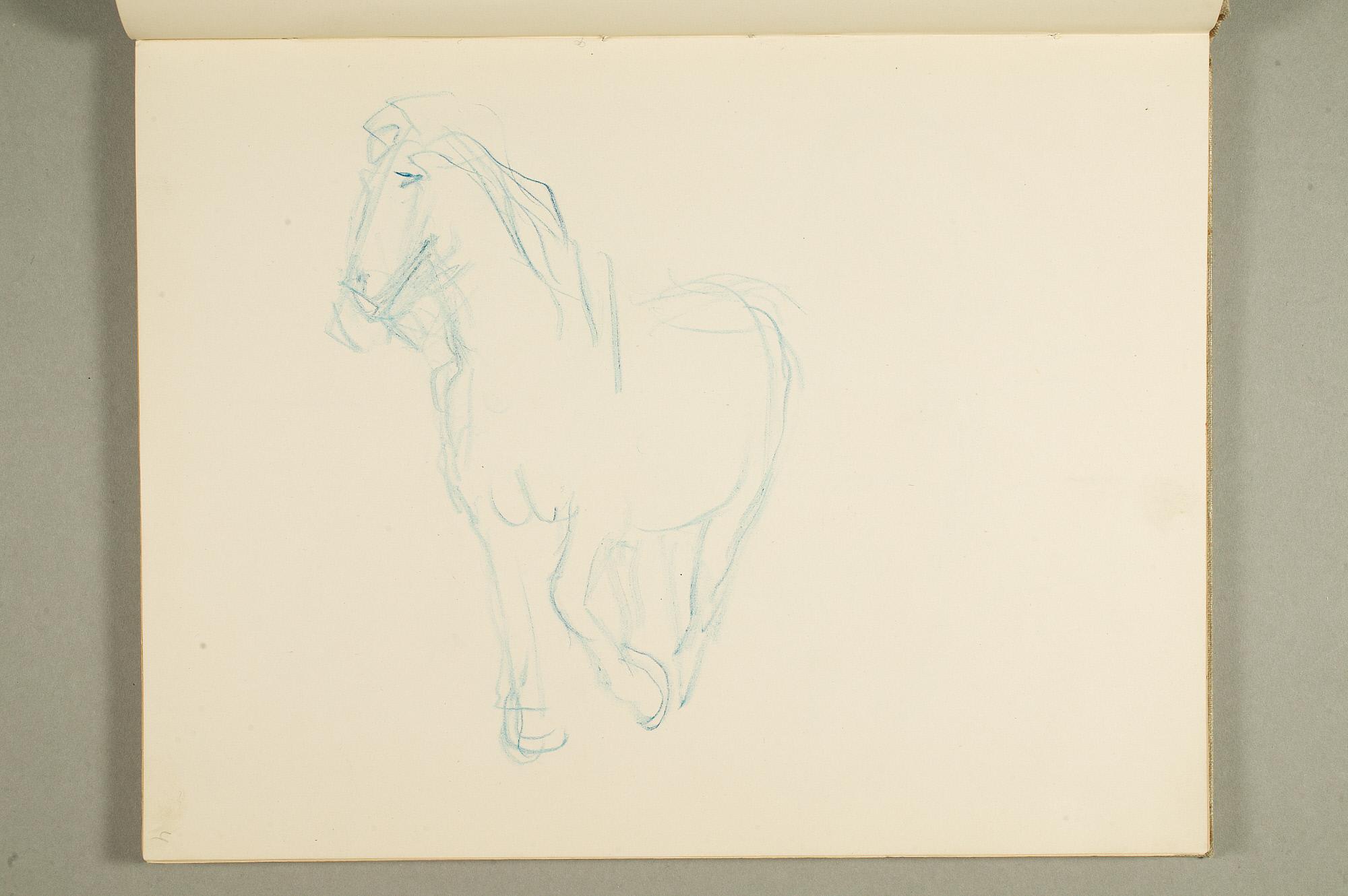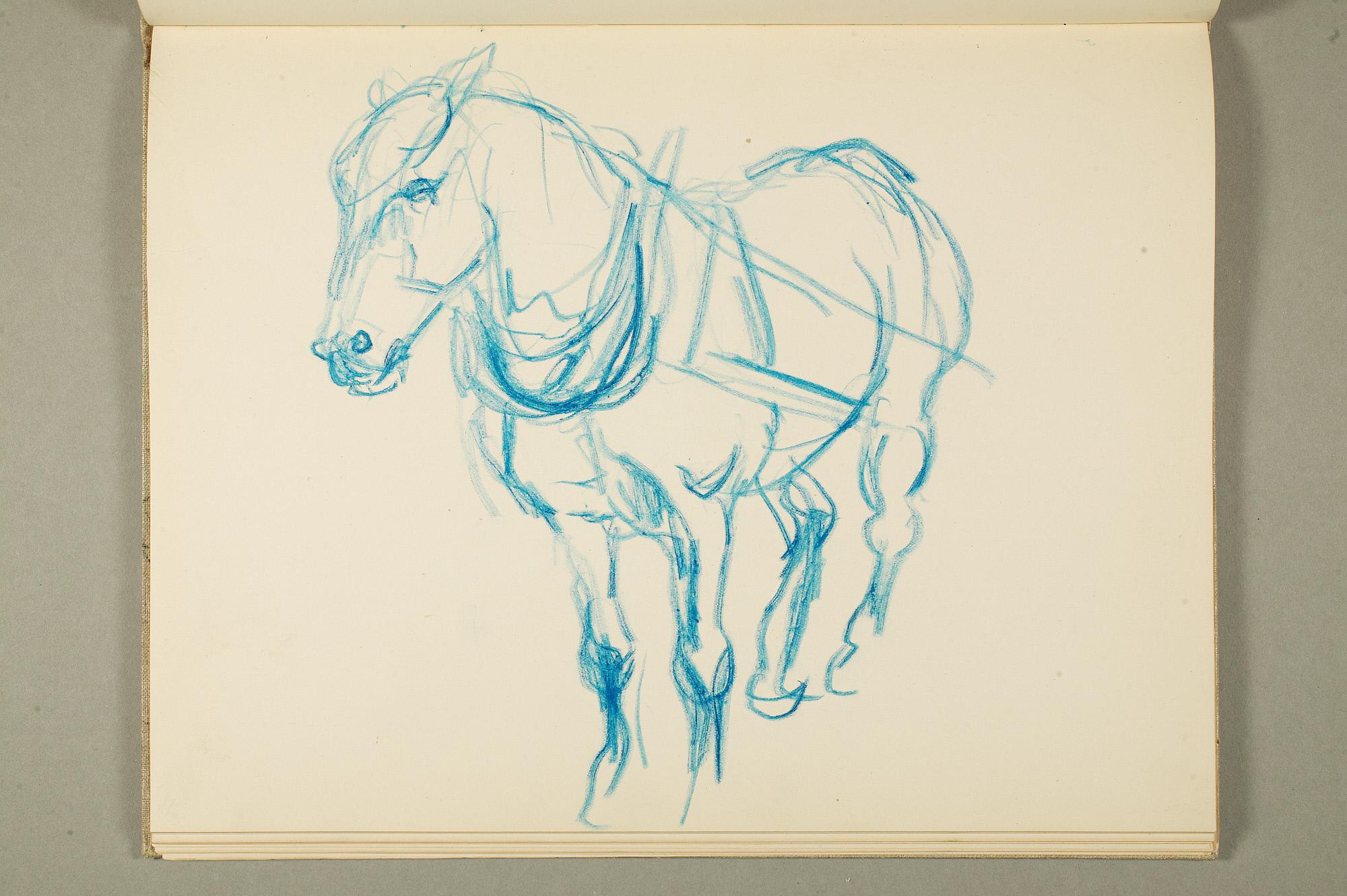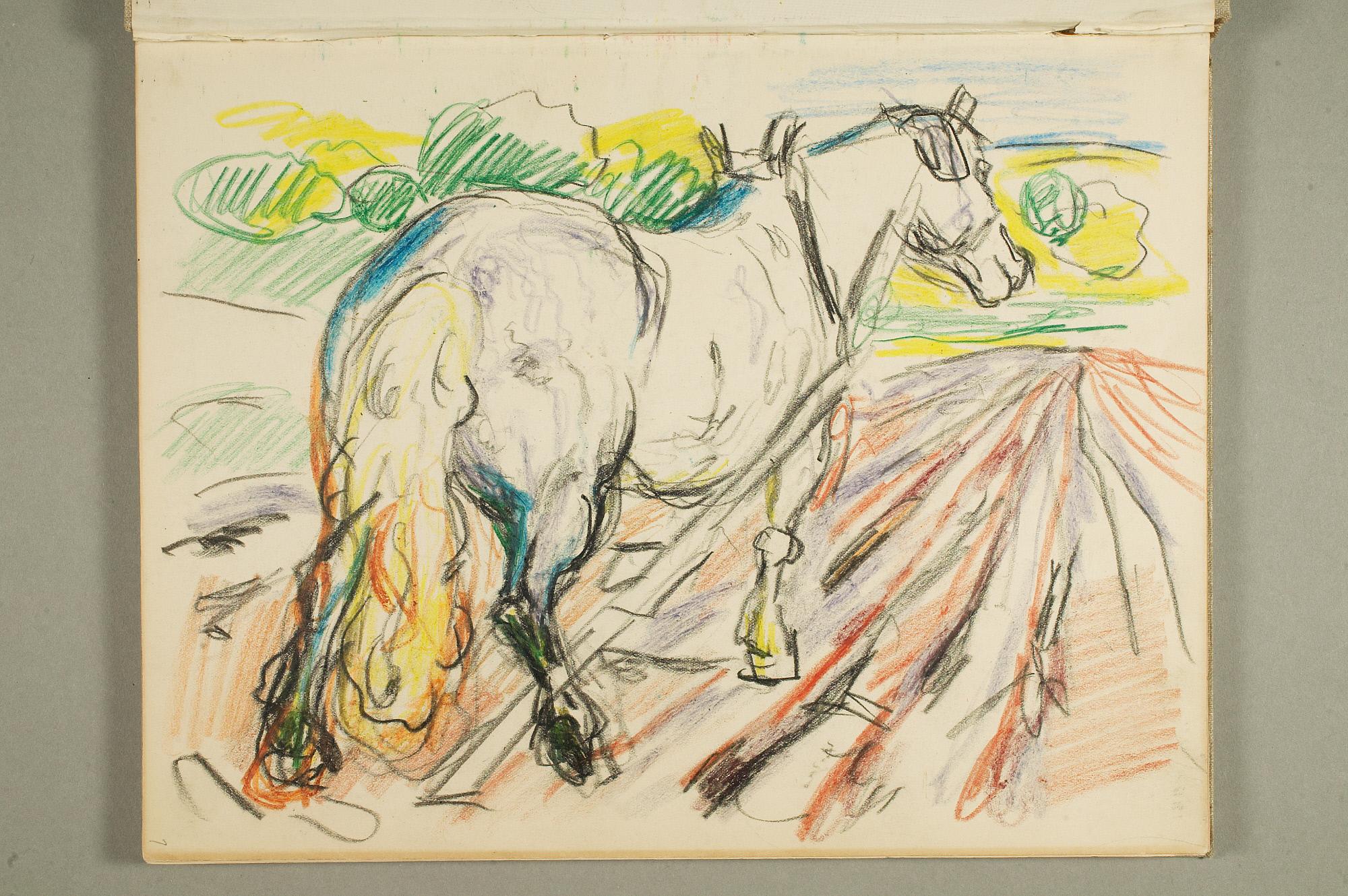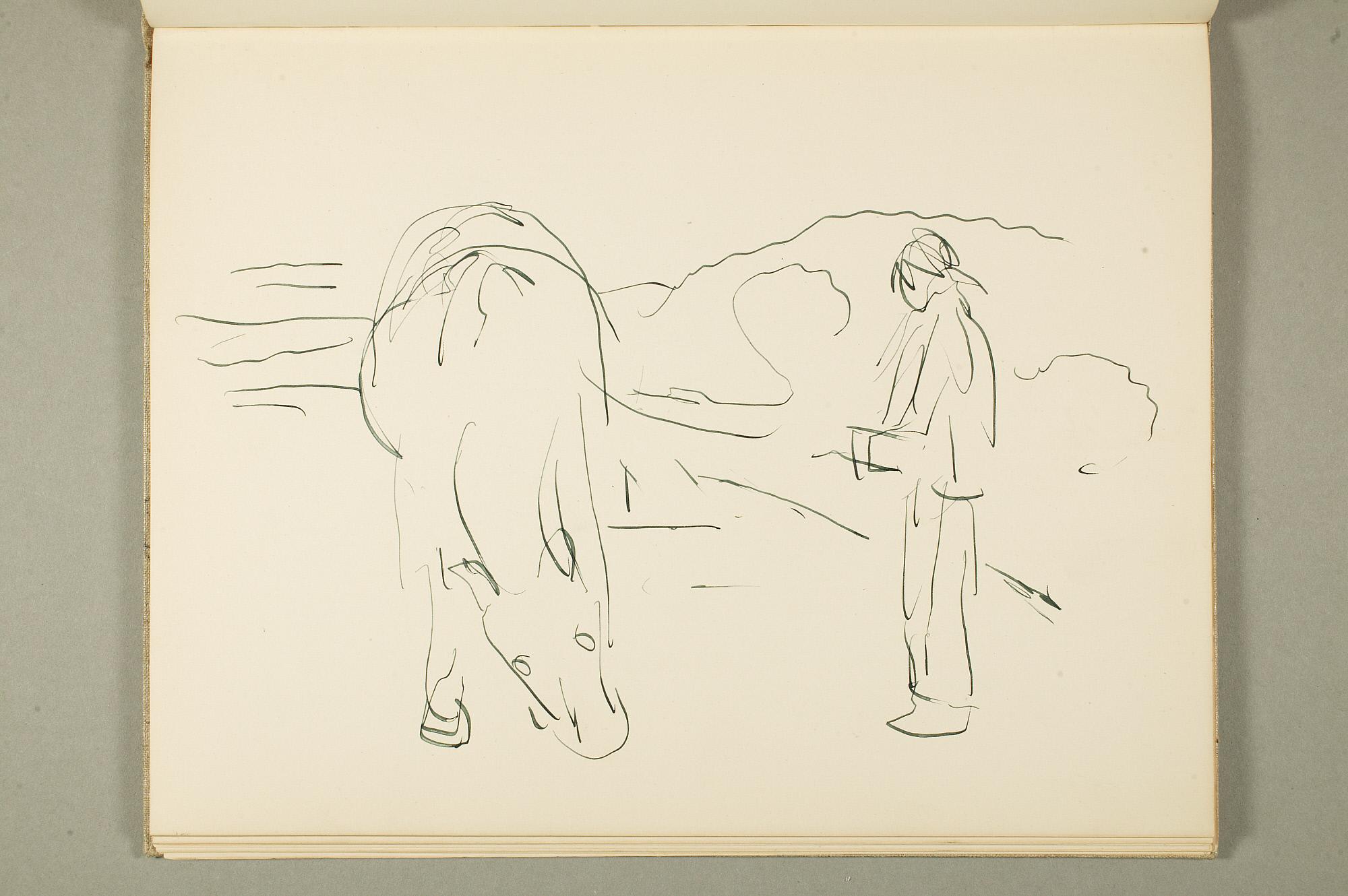 Comment:Det er særlig skisser av hester og landskap fra Ekely som danner grunnlaget for datering av denne skisseboken. Flere av tegningene kan relateres direkte til malerier, som f.eks. «Vinternatt» (side 64-verso PE.M.00231), «Treklynge i landskap» (side 69-verso PE.M.00230), «Pløyende hest» (side 1, MM.M.00356 og MM.M.00596) og andre. Tegningen «Allé» på side 63-verso ser ut til være en skisse til maleriet «Mord i alleen» signert og datert av Munch 1919 (MM.M.00268). Ut fra dette skulle skissebokens datering til 1918–19 være uproblematisk. (PP)