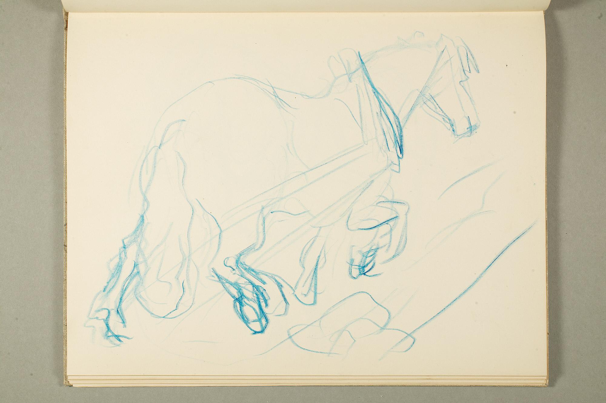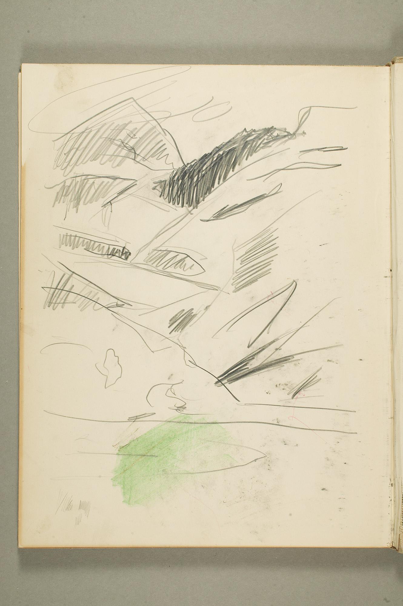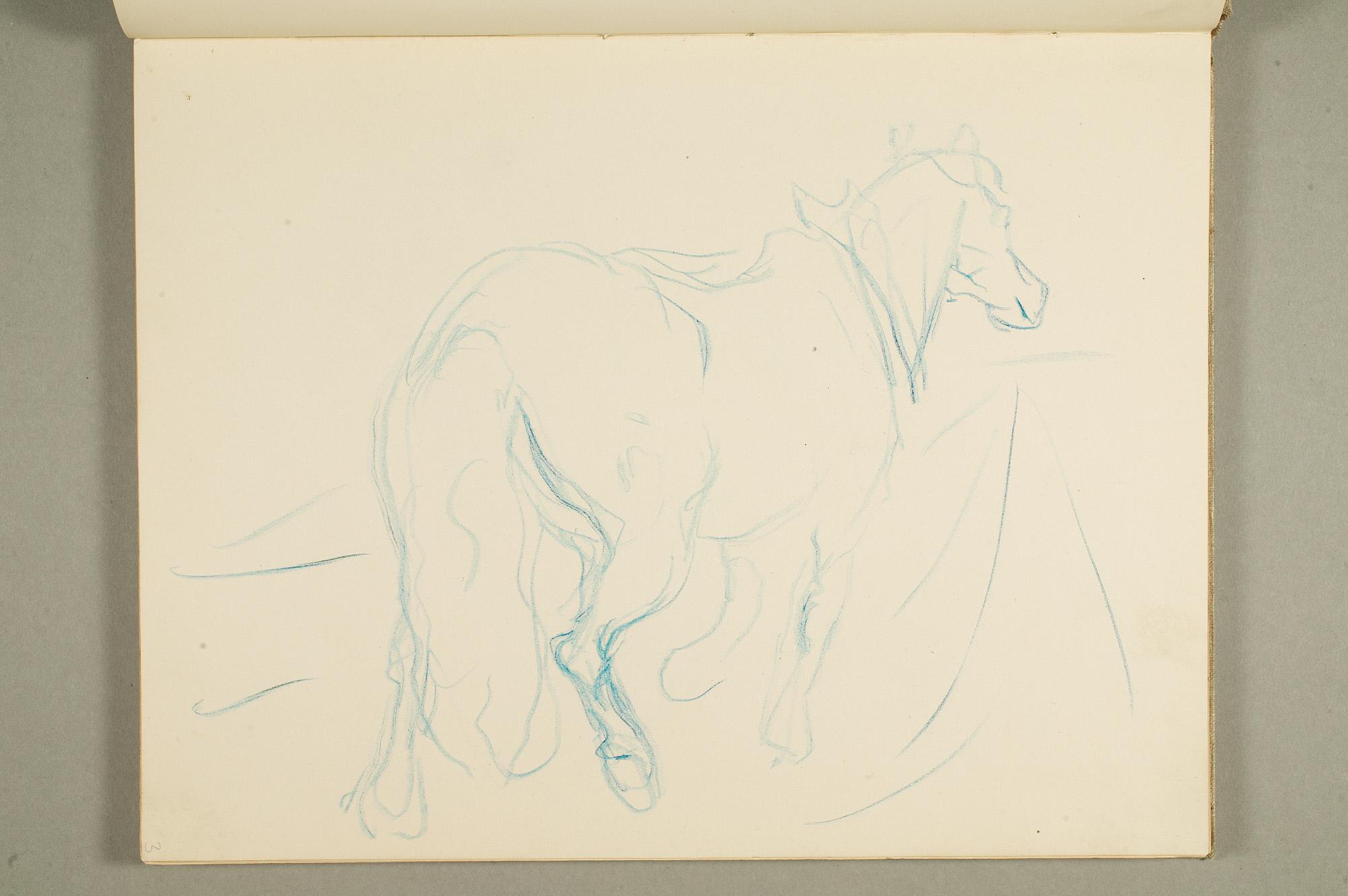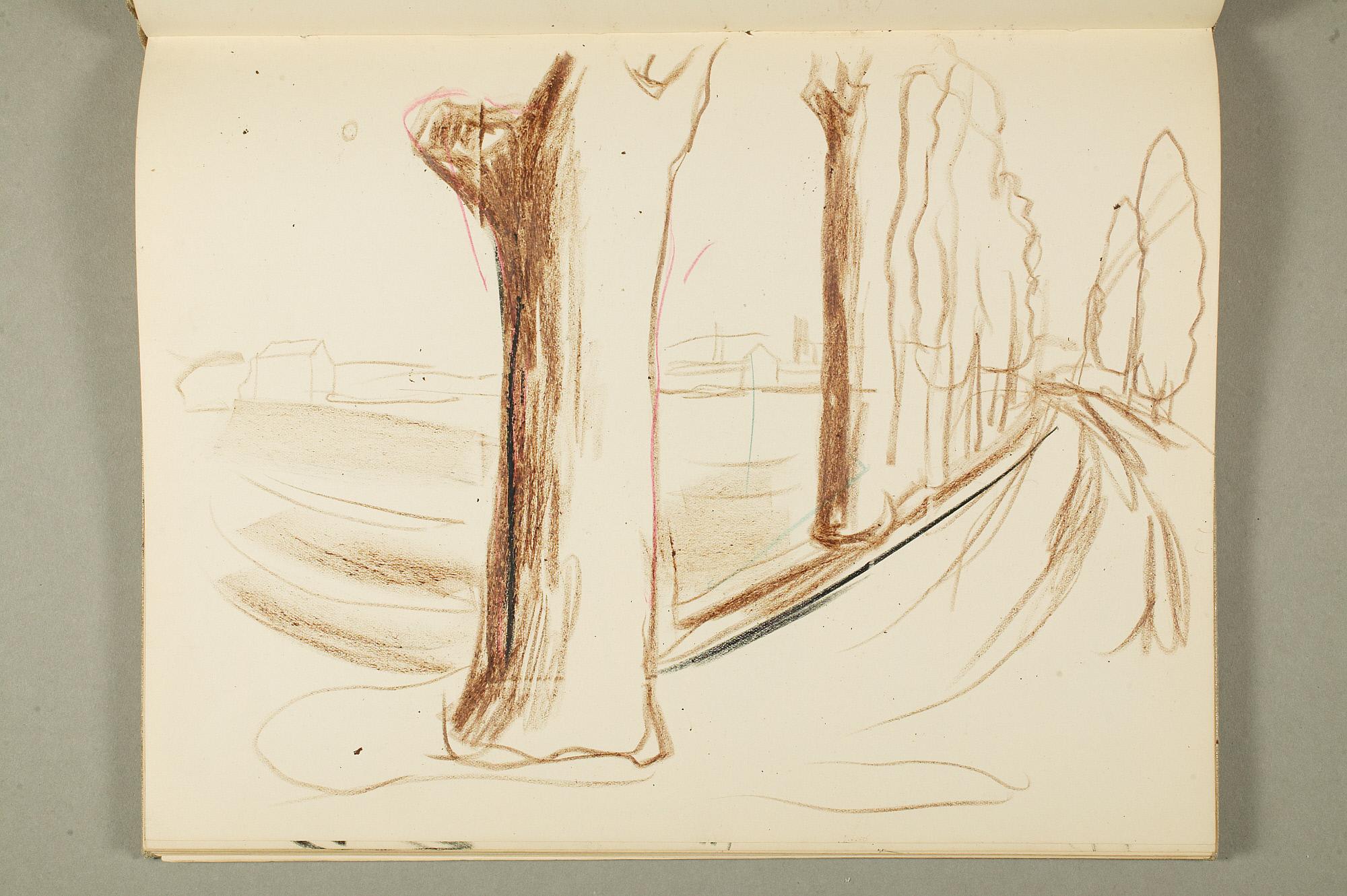 Comment:Det er særlig skisser av hester og landskap fra Ekely som danner grunnlaget for datering av denne skisseboken. Flere av tegningene kan relateres direkte til malerier, som f.eks. «Vinternatt» (side 64-verso PE.M.00231), «Treklynge i landskap» (side 69-verso PE.M.00230), «Pløyende hest» (side 1, MM.M.00356 og MM.M.00596) og andre. Tegningen «Allé» på side 63-verso ser ut til være en skisse til maleriet «Mord i alleen» signert og datert av Munch 1919 (MM.M.00268). Ut fra dette skulle skissebokens datering til 1918–19 være uproblematisk. (PP)