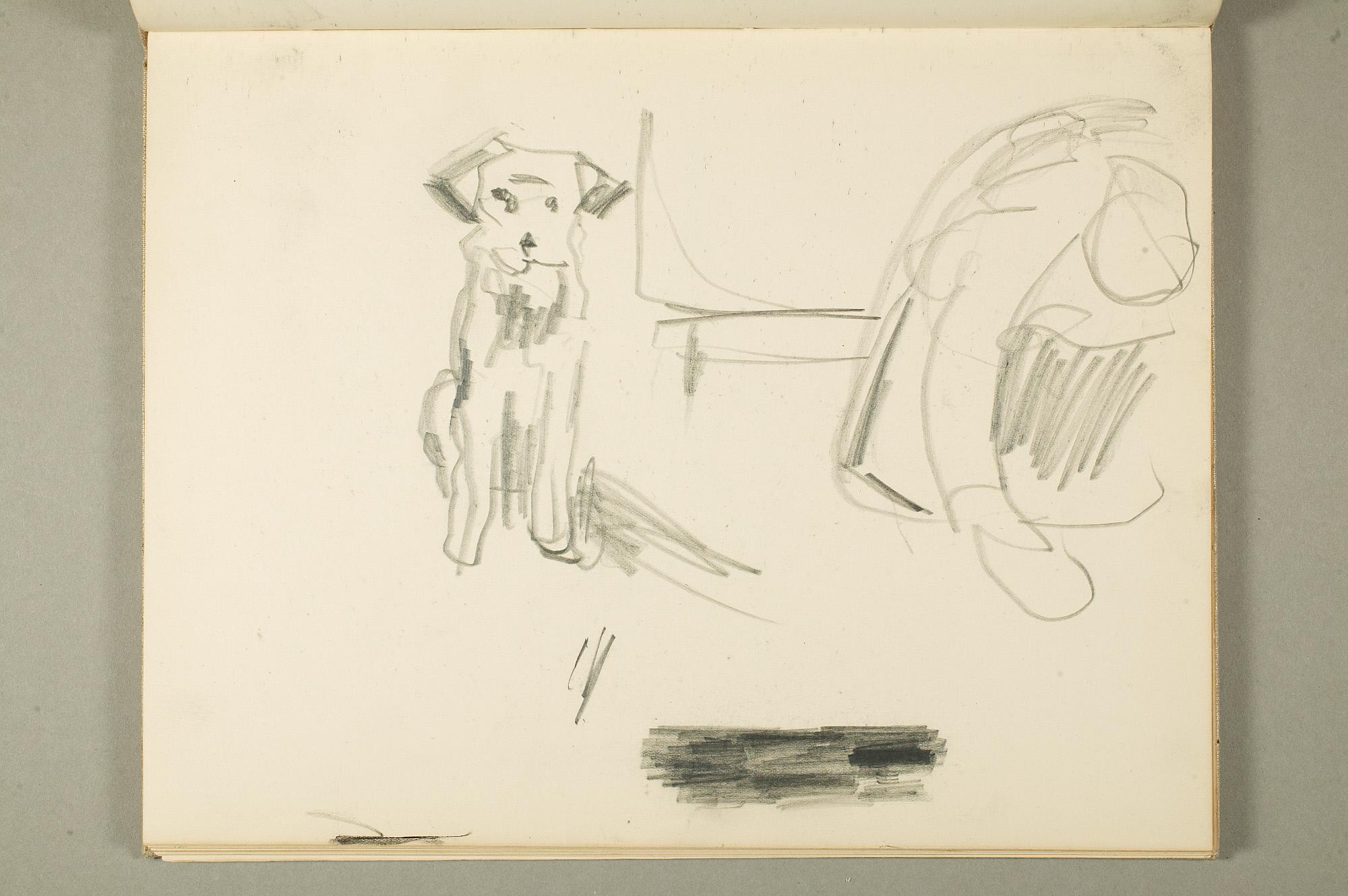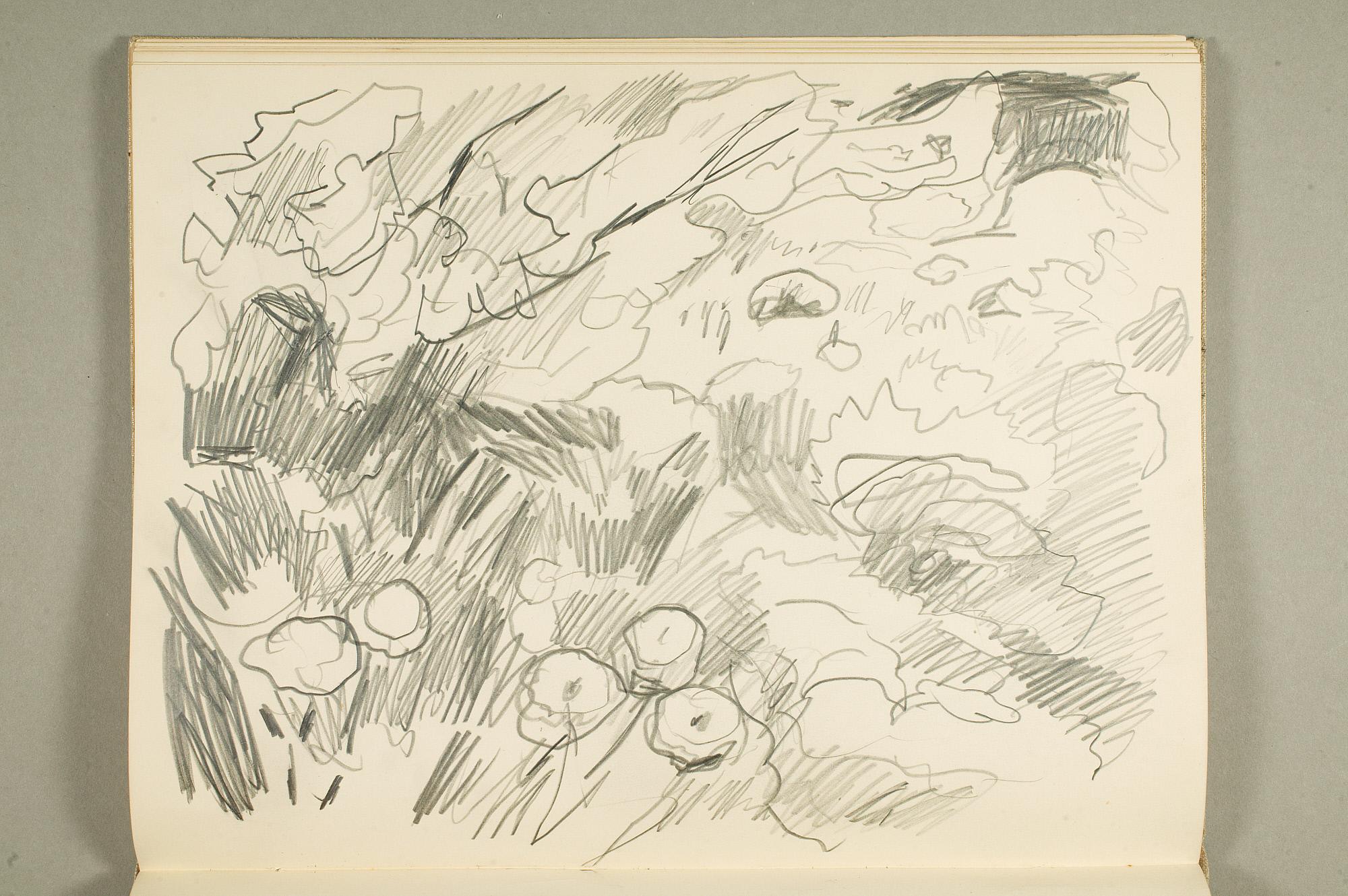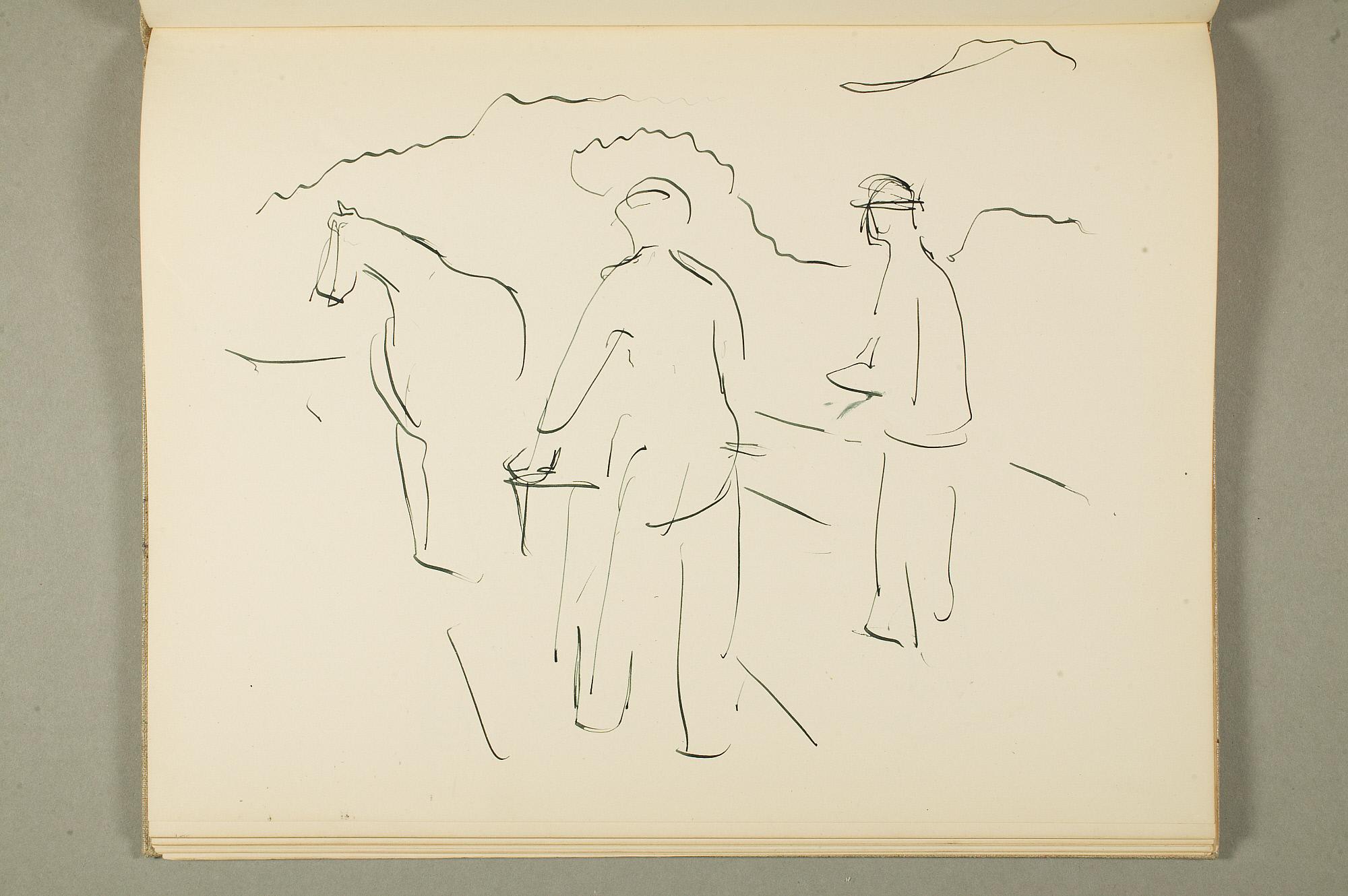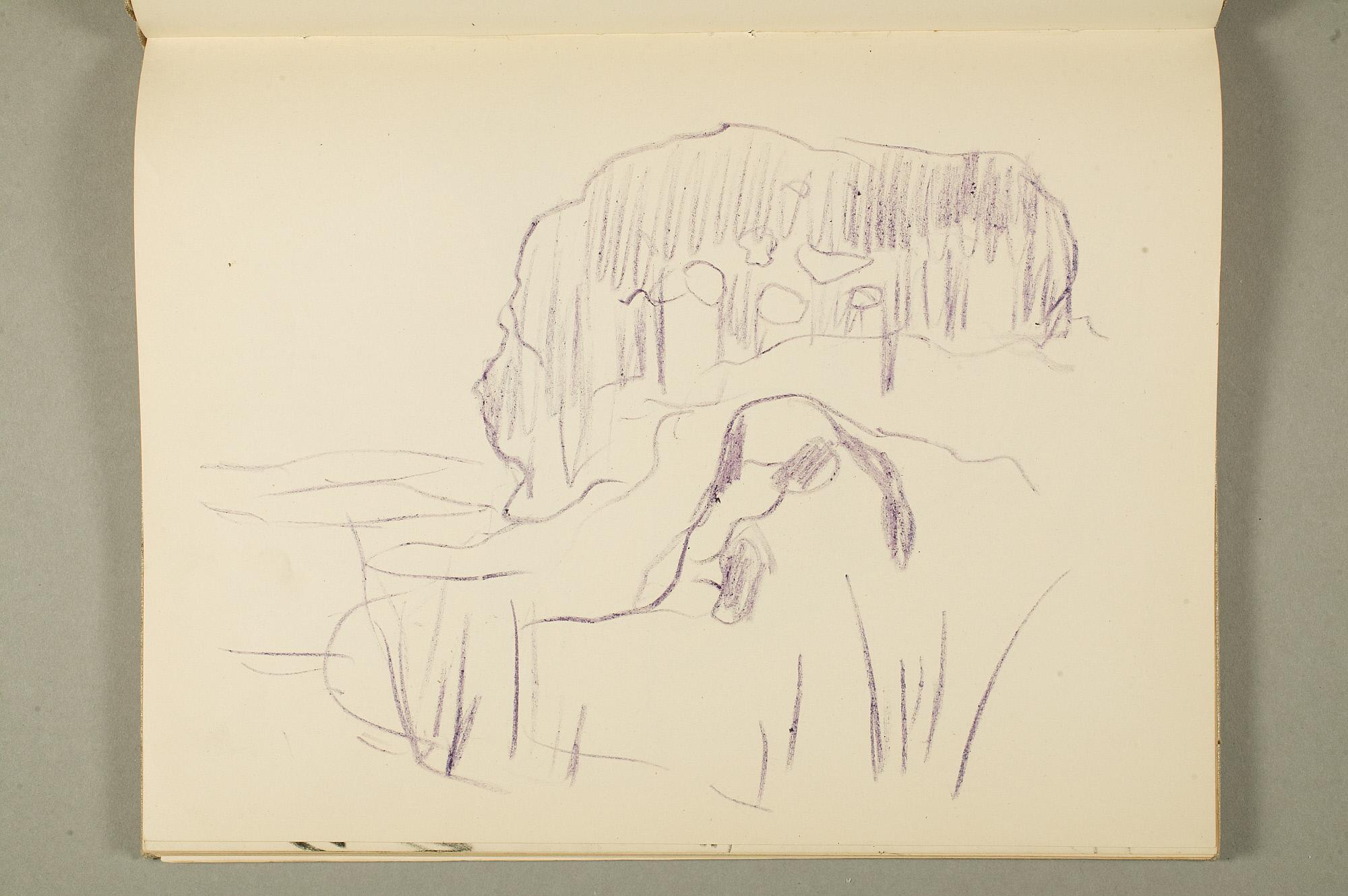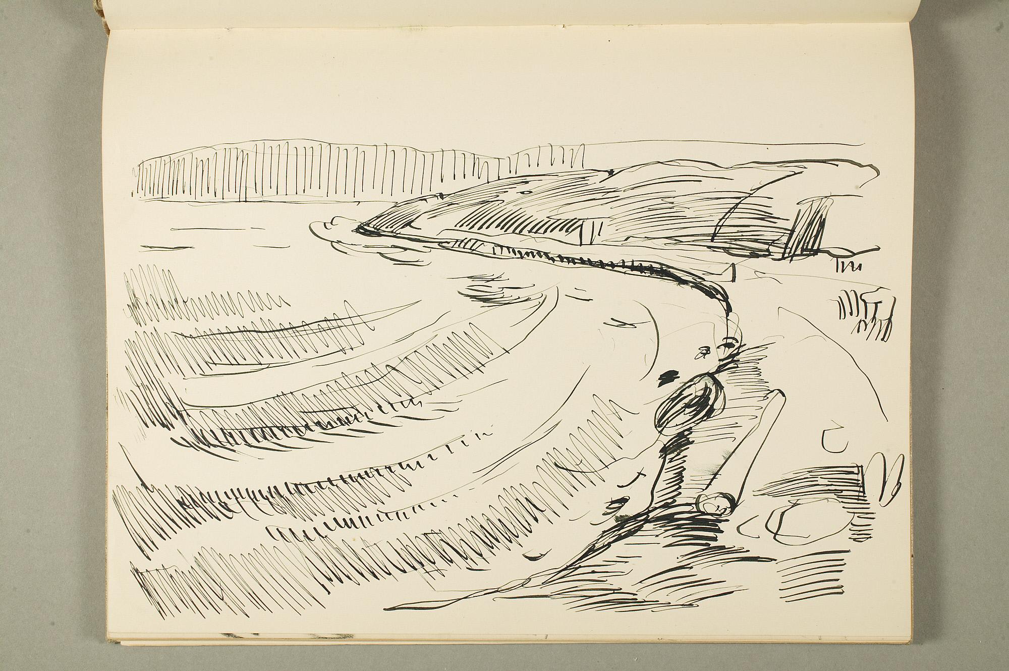 Comment:Det er særlig skisser av hester og landskap fra Ekely som danner grunnlaget for datering av denne skisseboken. Flere av tegningene kan relateres direkte til malerier, som f.eks. «Vinternatt» (side 64-verso PE.M.00231), «Treklynge i landskap» (side 69-verso PE.M.00230), «Pløyende hest» (side 1, MM.M.00356 og MM.M.00596) og andre. Tegningen «Allé» på side 63-verso ser ut til være en skisse til maleriet «Mord i alleen» signert og datert av Munch 1919 (MM.M.00268). Ut fra dette skulle skissebokens datering til 1918–19 være uproblematisk. (PP)
