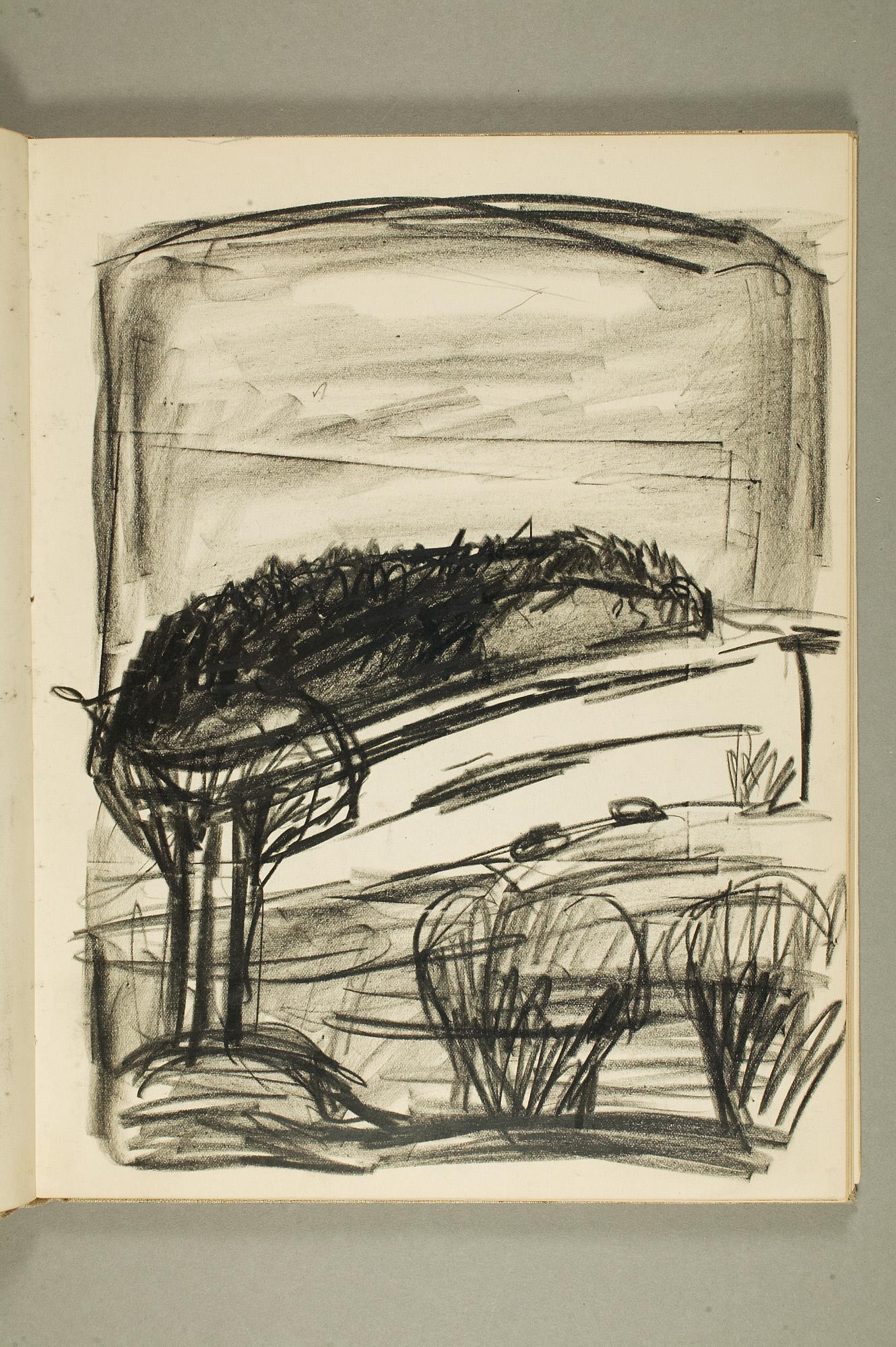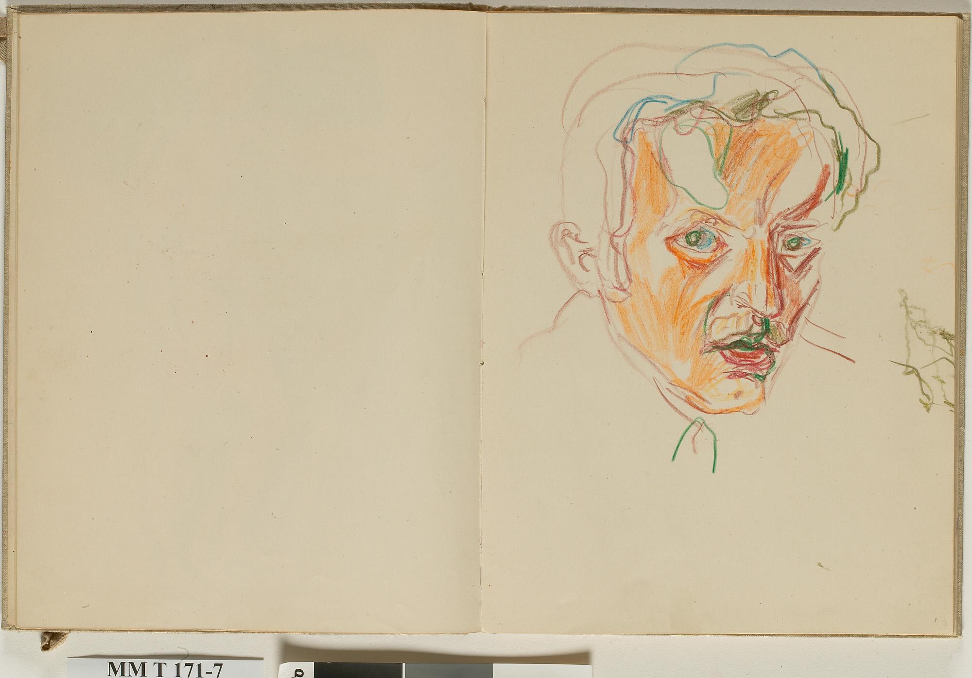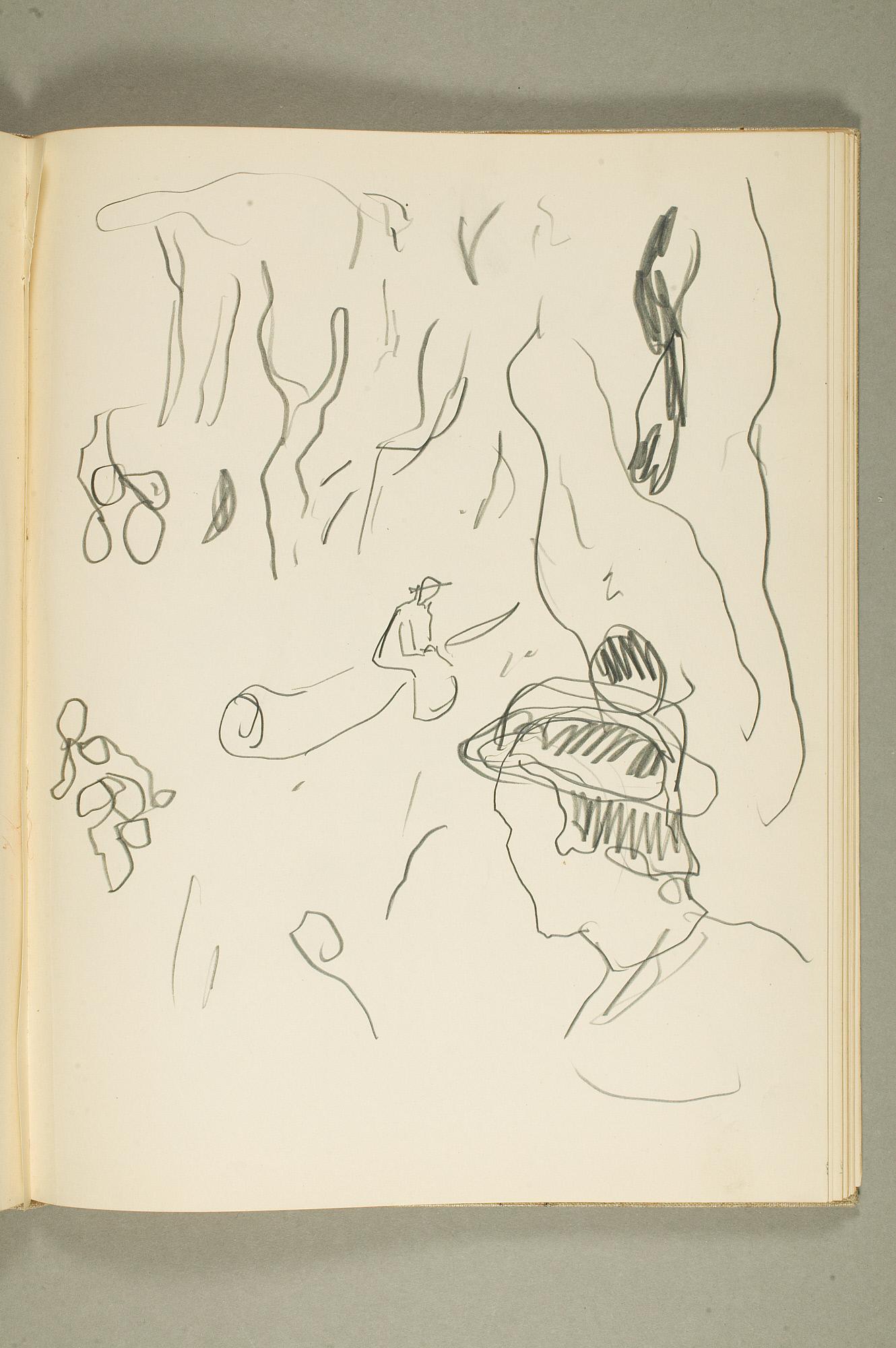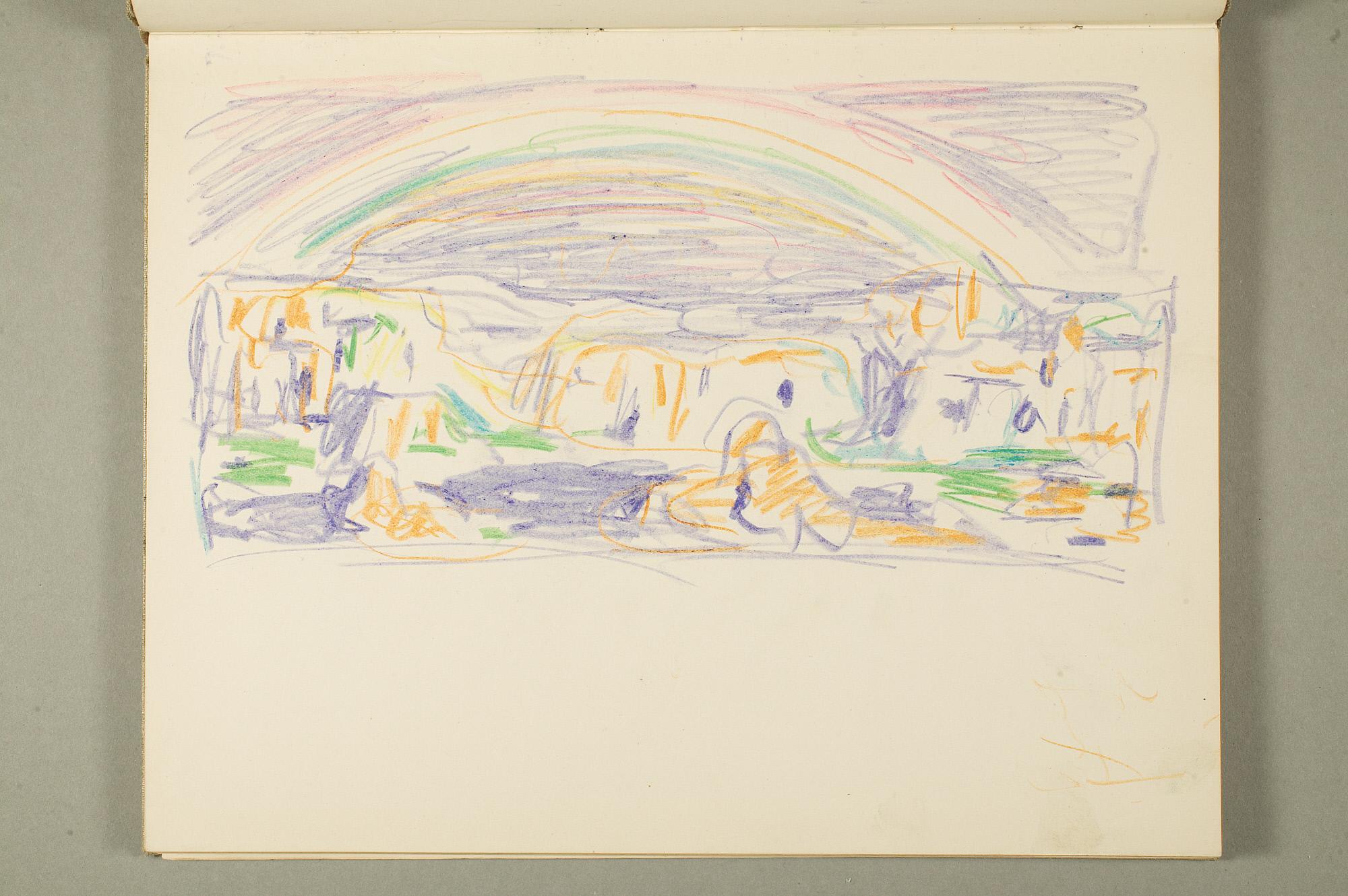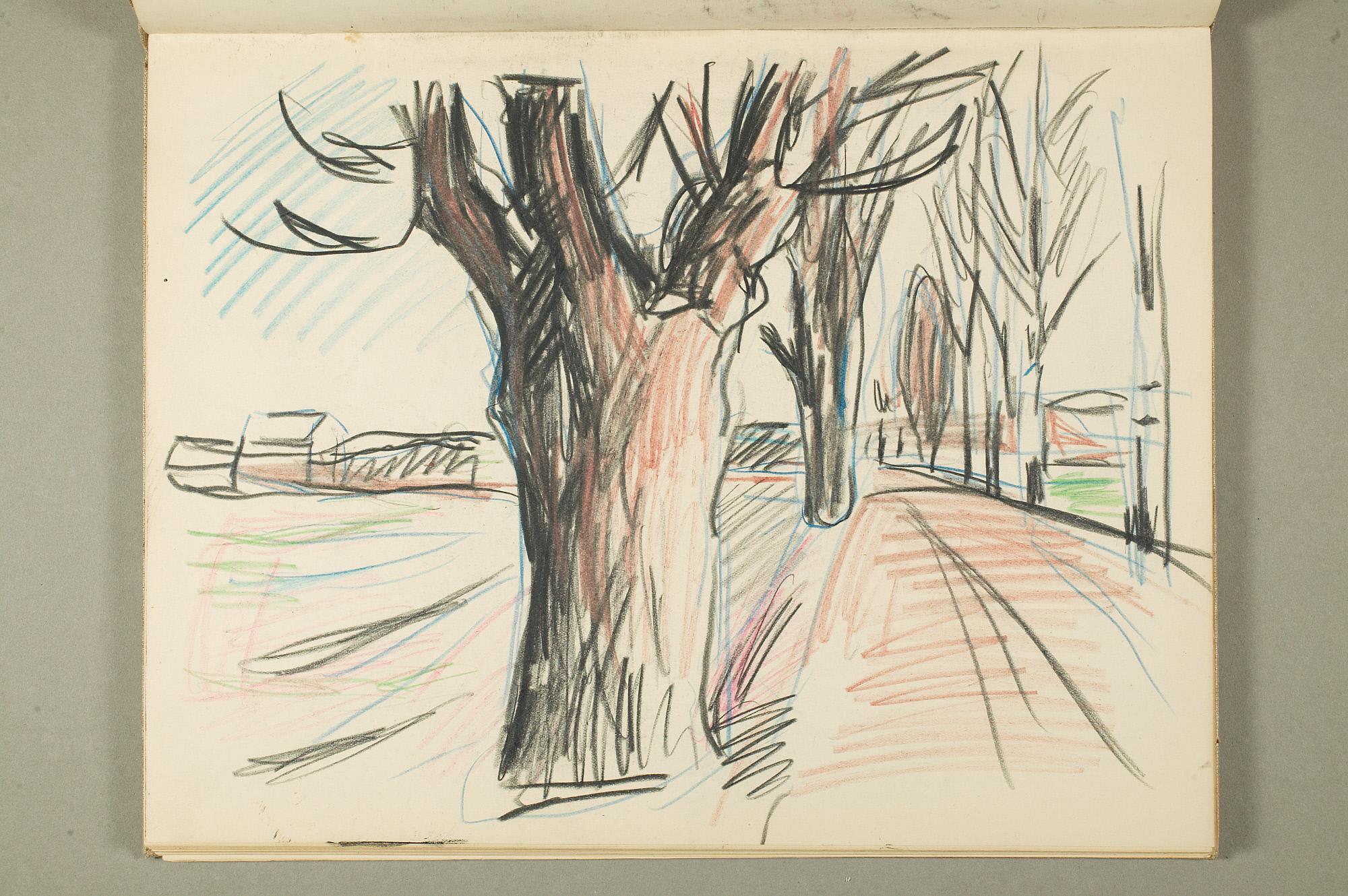 Comment:Det er særlig skisser av hester og landskap fra Ekely som danner grunnlaget for datering av denne skisseboken. Flere av tegningene kan relateres direkte til malerier, som f.eks. «Vinternatt» (side 64-verso PE.M.00231), «Treklynge i landskap» (side 69-verso PE.M.00230), «Pløyende hest» (side 1, MM.M.00356 og MM.M.00596) og andre. Tegningen «Allé» på side 63-verso ser ut til være en skisse til maleriet «Mord i alleen» signert og datert av Munch 1919 (MM.M.00268). Ut fra dette skulle skissebokens datering til 1918–19 være uproblematisk. (PP)