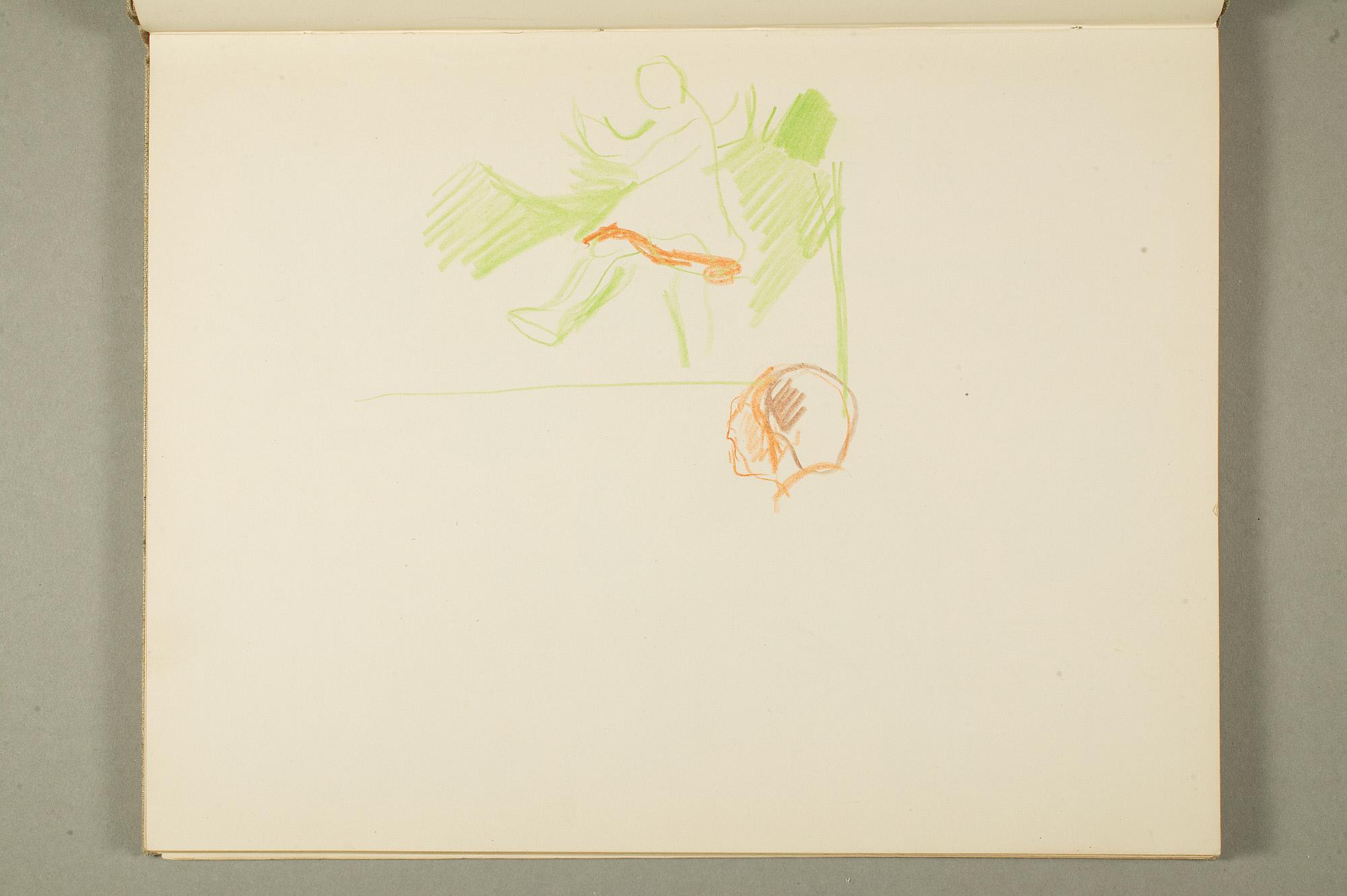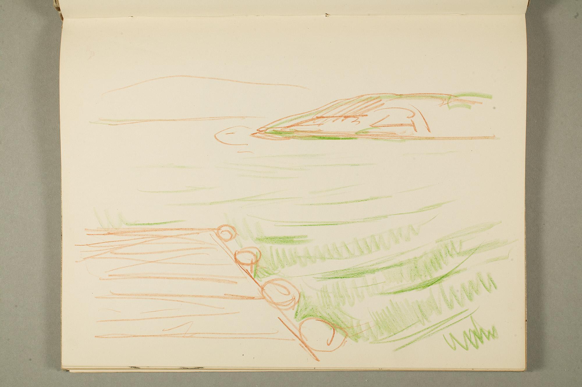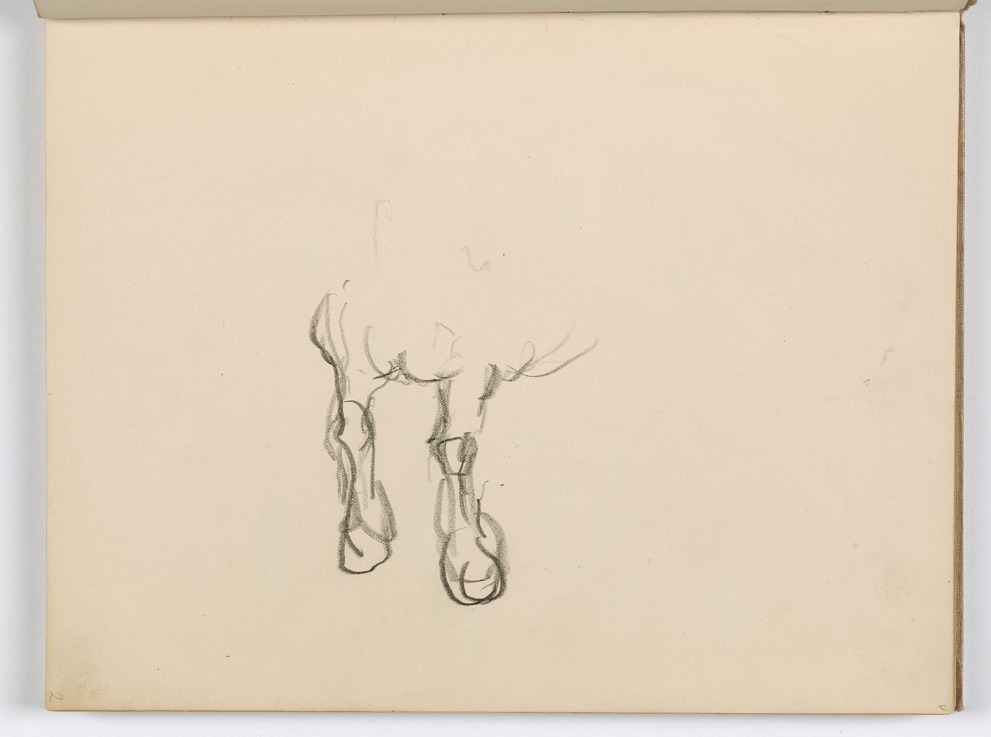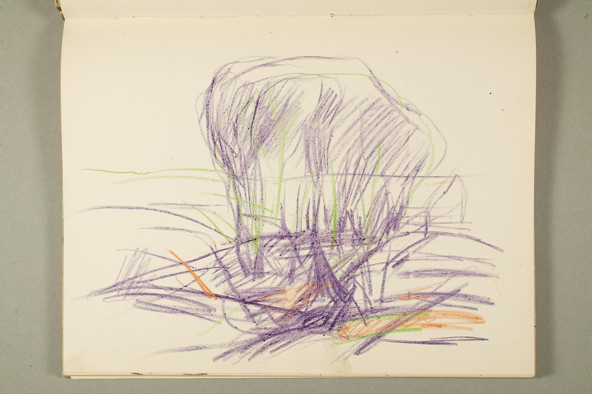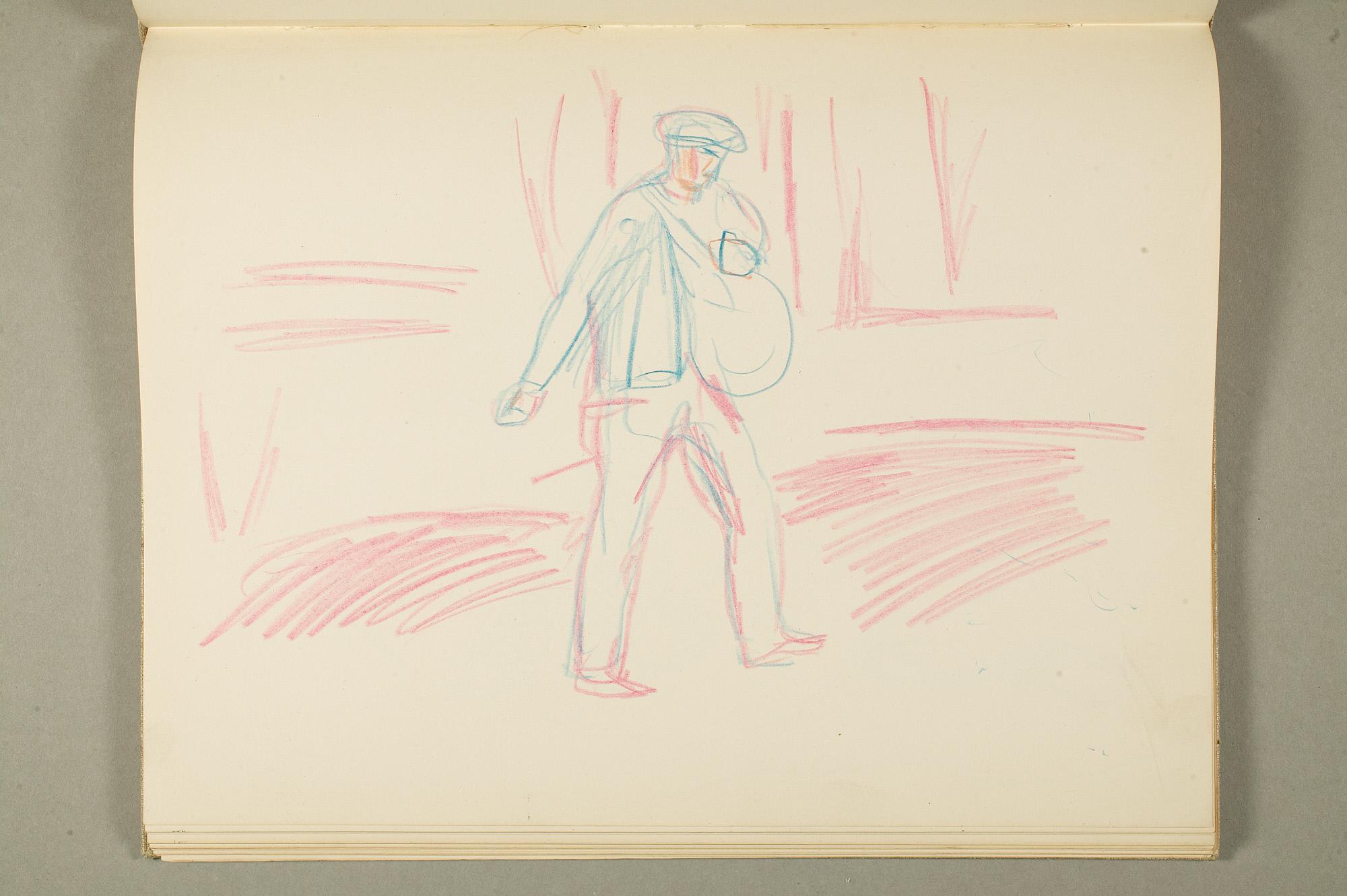 Comment:Det er særlig skisser av hester og landskap fra Ekely som danner grunnlaget for datering av denne skisseboken. Flere av tegningene kan relateres direkte til malerier, som f.eks. «Vinternatt» (side 64-verso PE.M.00231), «Treklynge i landskap» (side 69-verso PE.M.00230), «Pløyende hest» (side 1, MM.M.00356 og MM.M.00596) og andre. Tegningen «Allé» på side 63-verso ser ut til være en skisse til maleriet «Mord i alleen» signert og datert av Munch 1919 (MM.M.00268). Ut fra dette skulle skissebokens datering til 1918–19 være uproblematisk. (PP)