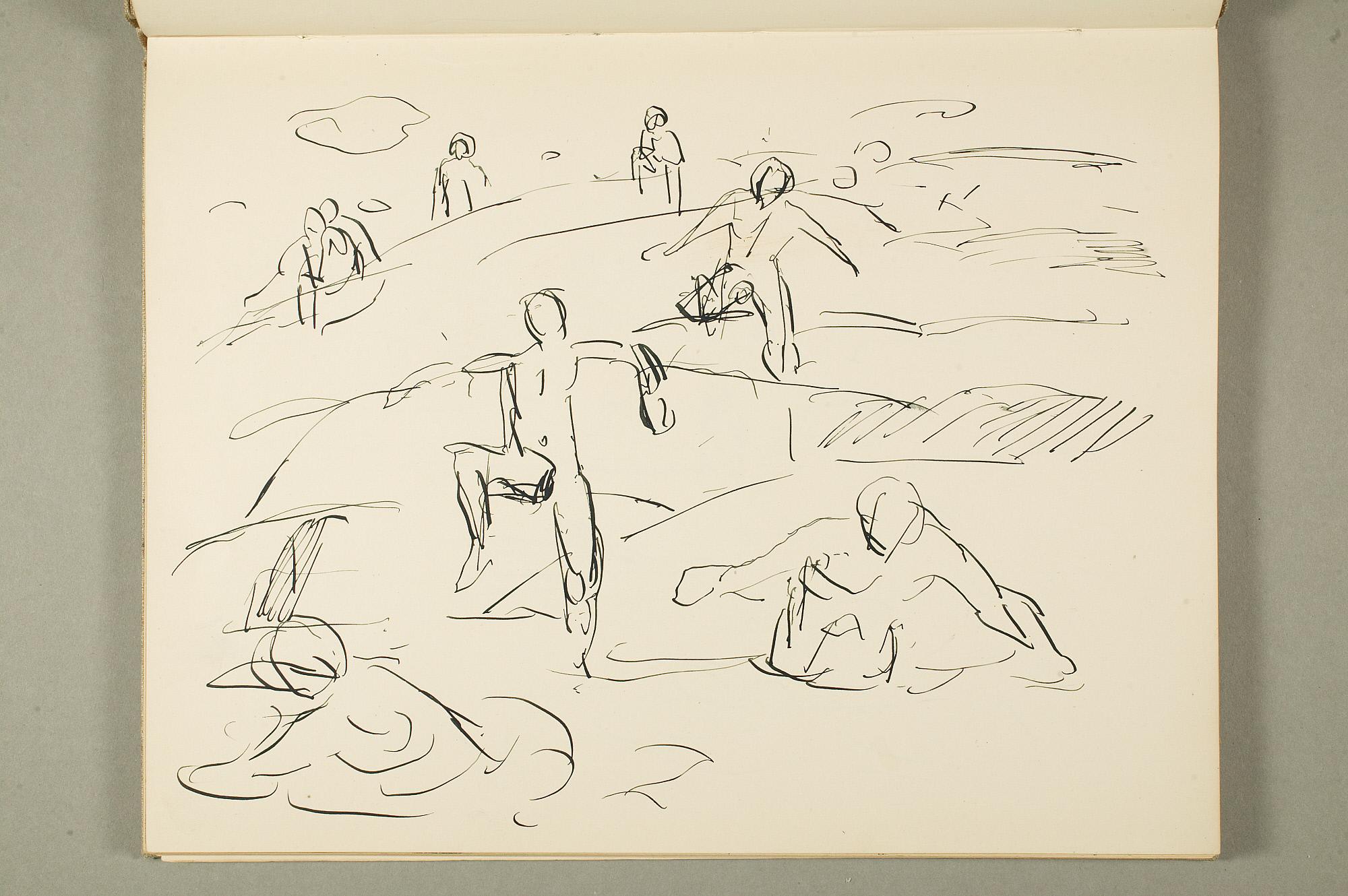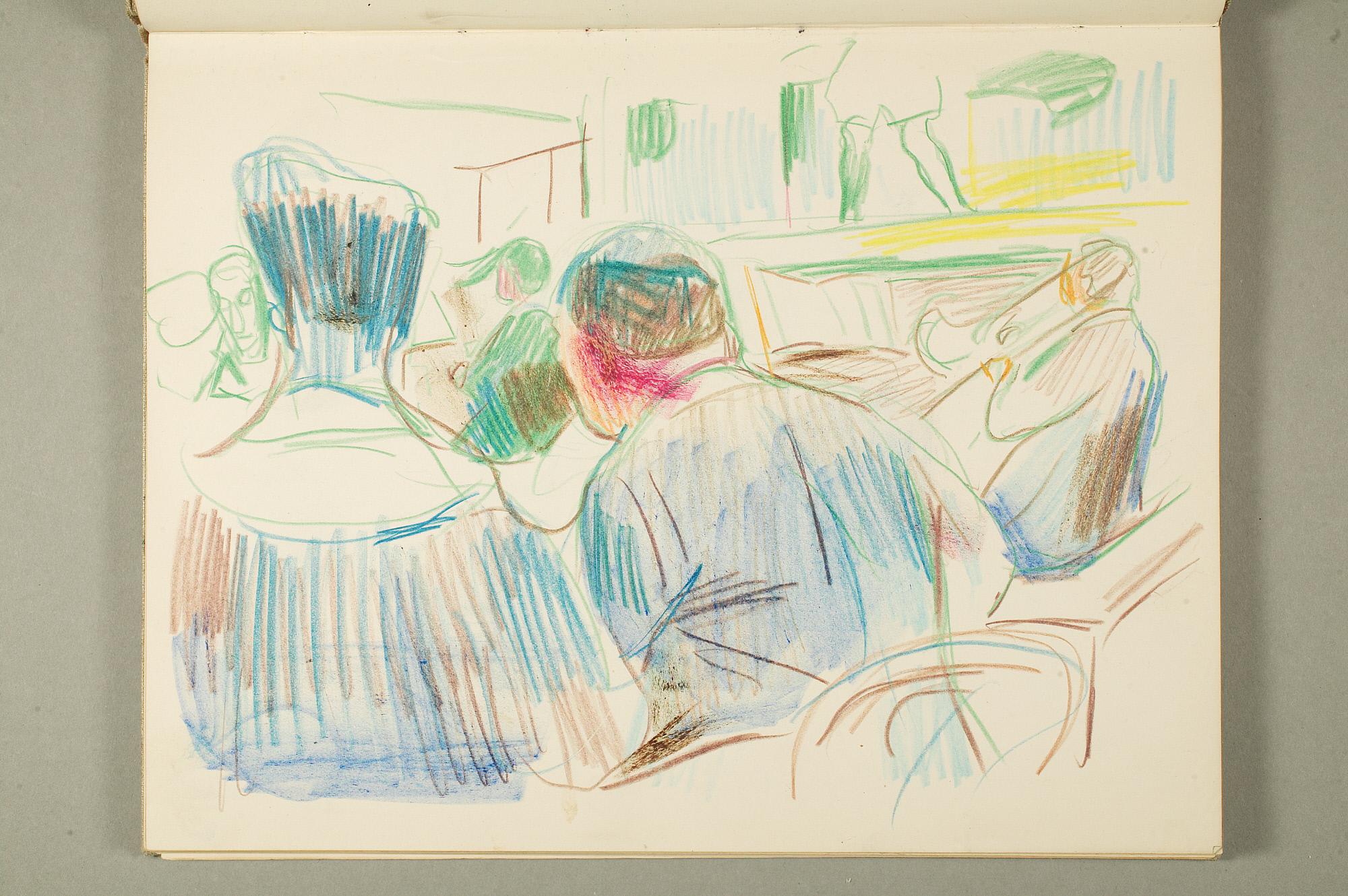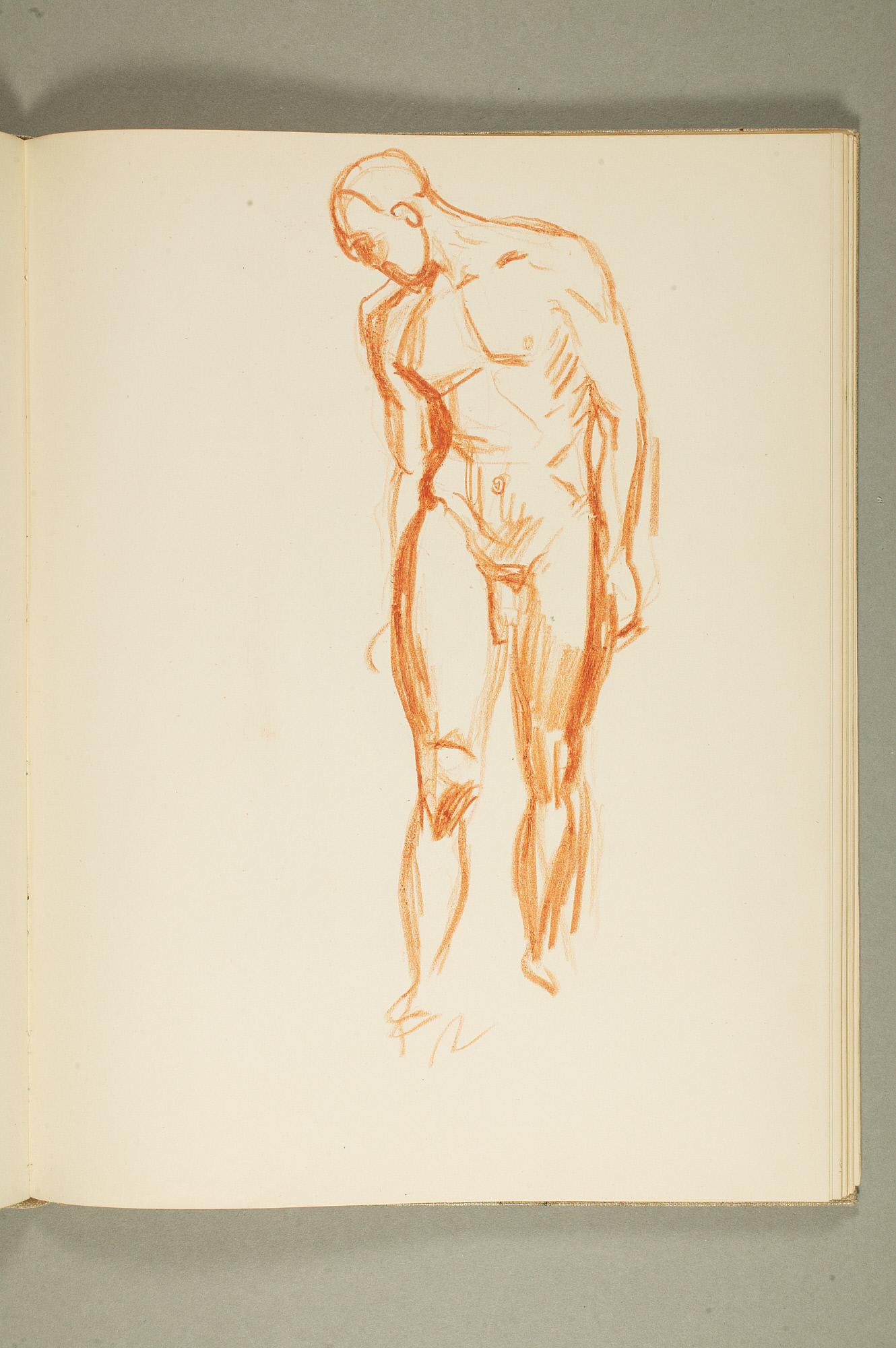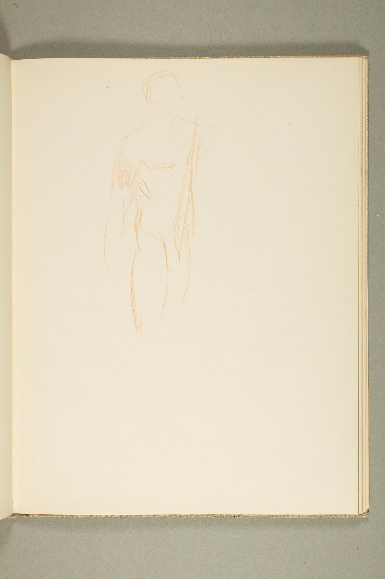 Comment:Det er særlig skisser av hester og landskap fra Ekely som danner grunnlaget for datering av denne skisseboken. Flere av tegningene kan relateres direkte til malerier, som f.eks. «Vinternatt» (side 64-verso PE.M.00231), «Treklynge i landskap» (side 69-verso PE.M.00230), «Pløyende hest» (side 1, MM.M.00356 og MM.M.00596) og andre. Tegningen «Allé» på side 63-verso ser ut til være en skisse til maleriet «Mord i alleen» signert og datert av Munch 1919 (MM.M.00268). Ut fra dette skulle skissebokens datering til 1918–19 være uproblematisk. (PP)