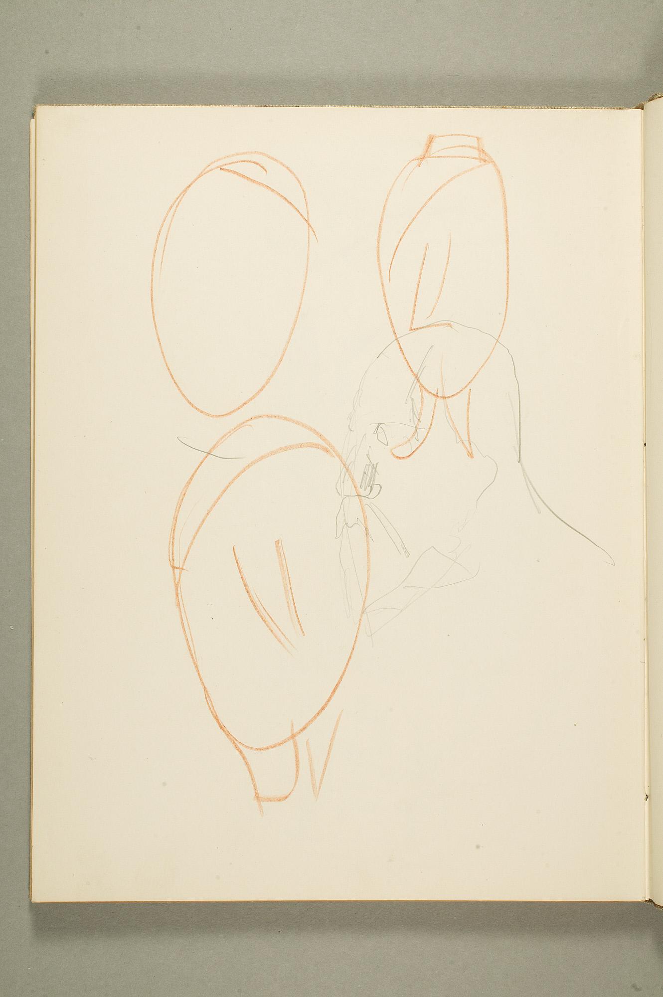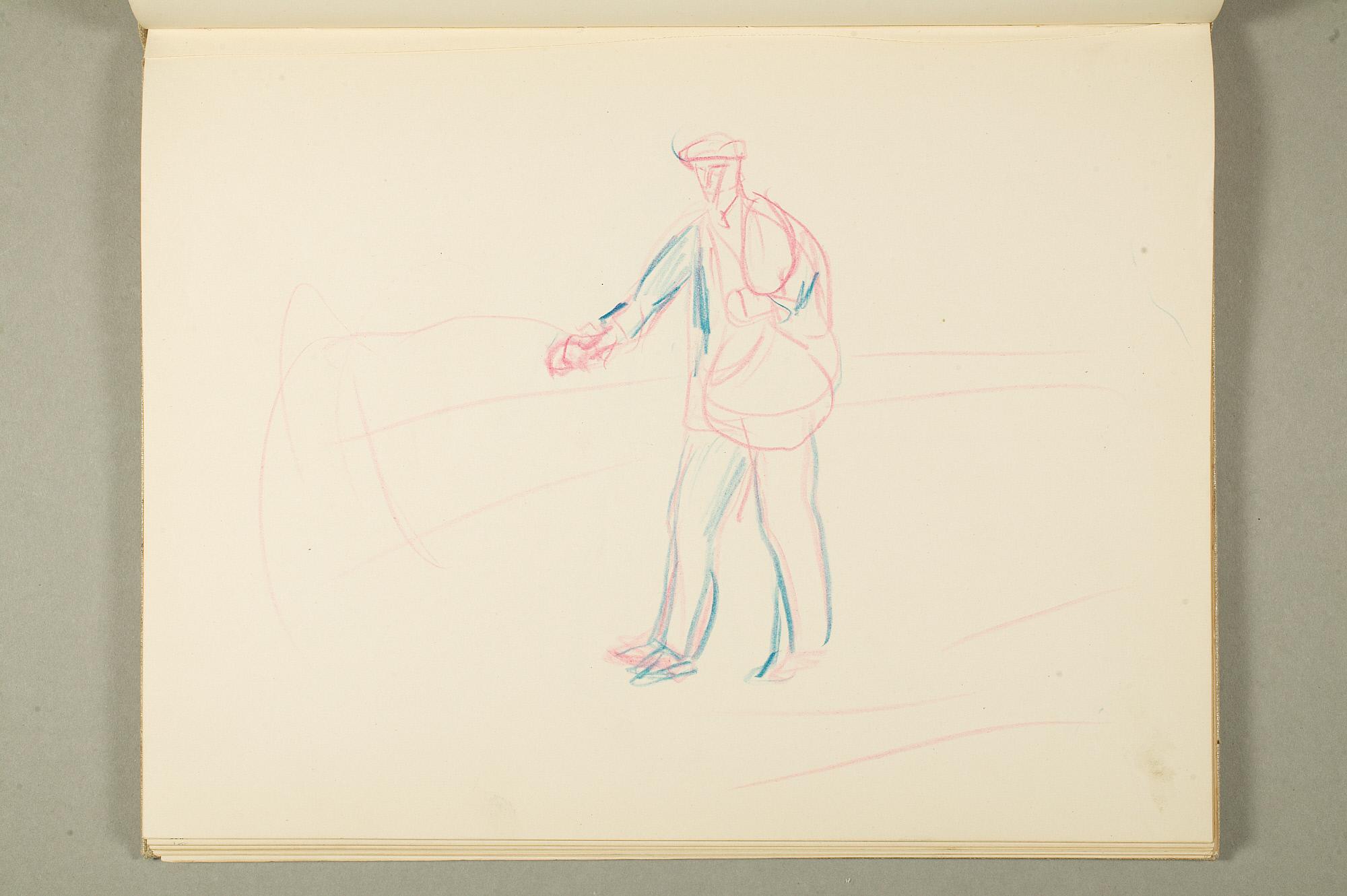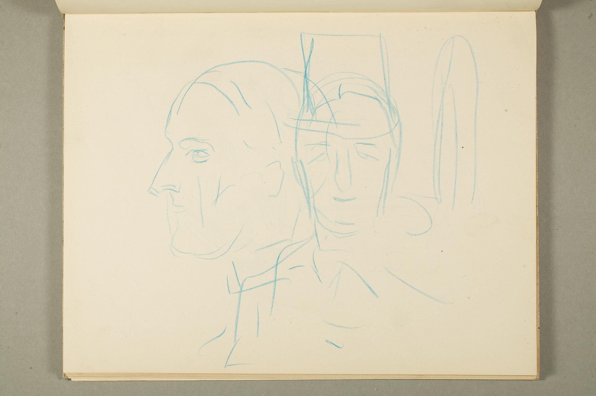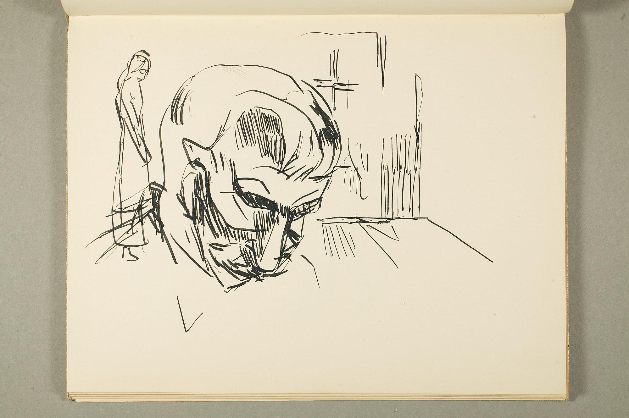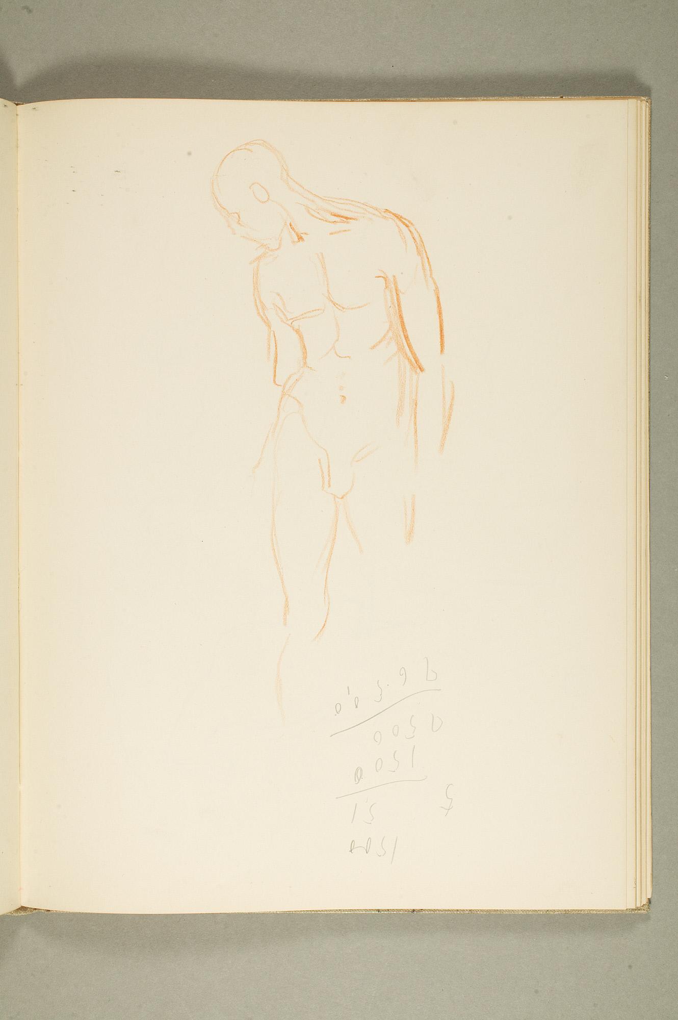 Comment:Det er særlig skisser av hester og landskap fra Ekely som danner grunnlaget for datering av denne skisseboken. Flere av tegningene kan relateres direkte til malerier, som f.eks. «Vinternatt» (side 64-verso PE.M.00231), «Treklynge i landskap» (side 69-verso PE.M.00230), «Pløyende hest» (side 1, MM.M.00356 og MM.M.00596) og andre. Tegningen «Allé» på side 63-verso ser ut til være en skisse til maleriet «Mord i alleen» signert og datert av Munch 1919 (MM.M.00268). Ut fra dette skulle skissebokens datering til 1918–19 være uproblematisk. (PP)