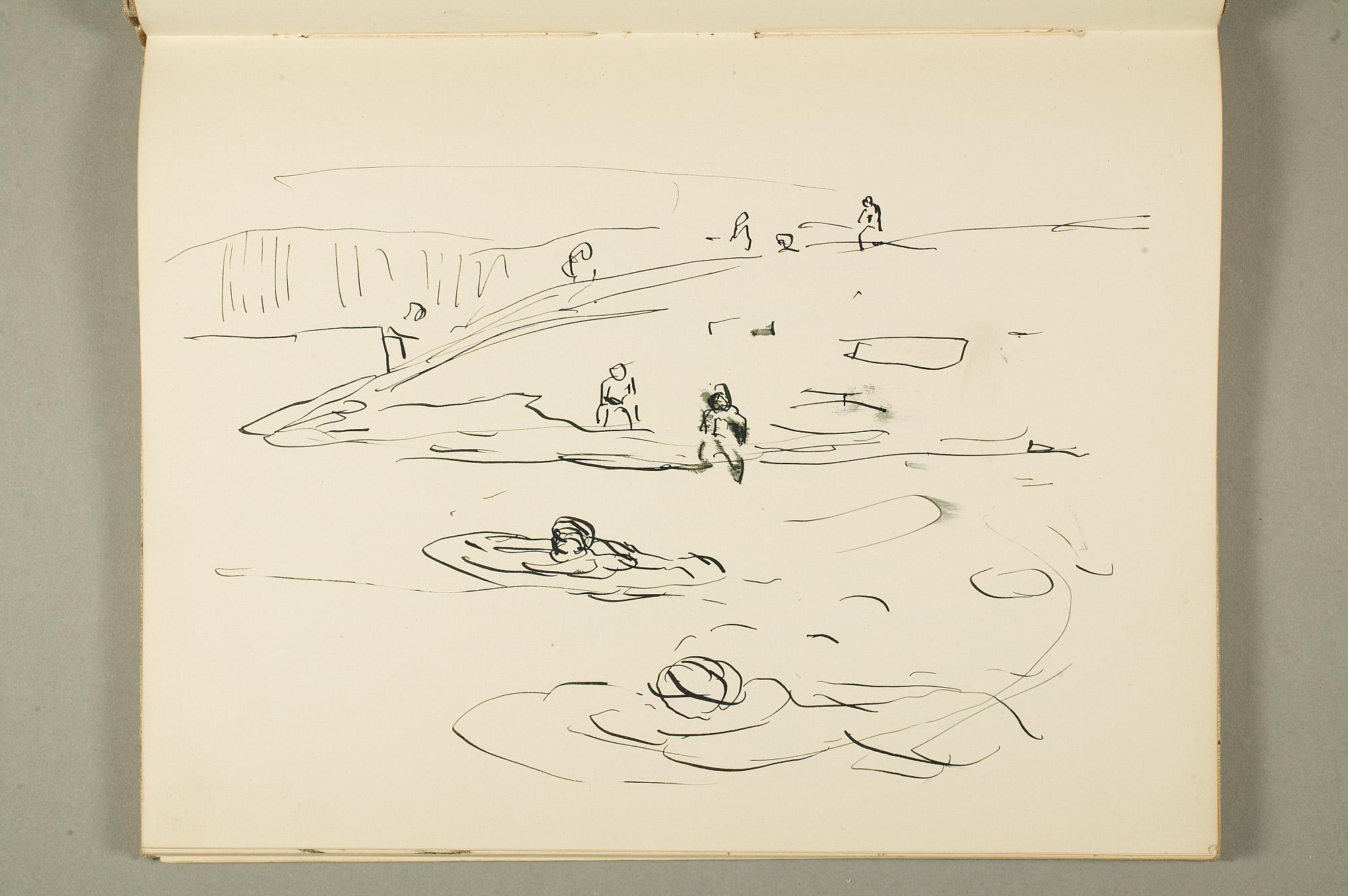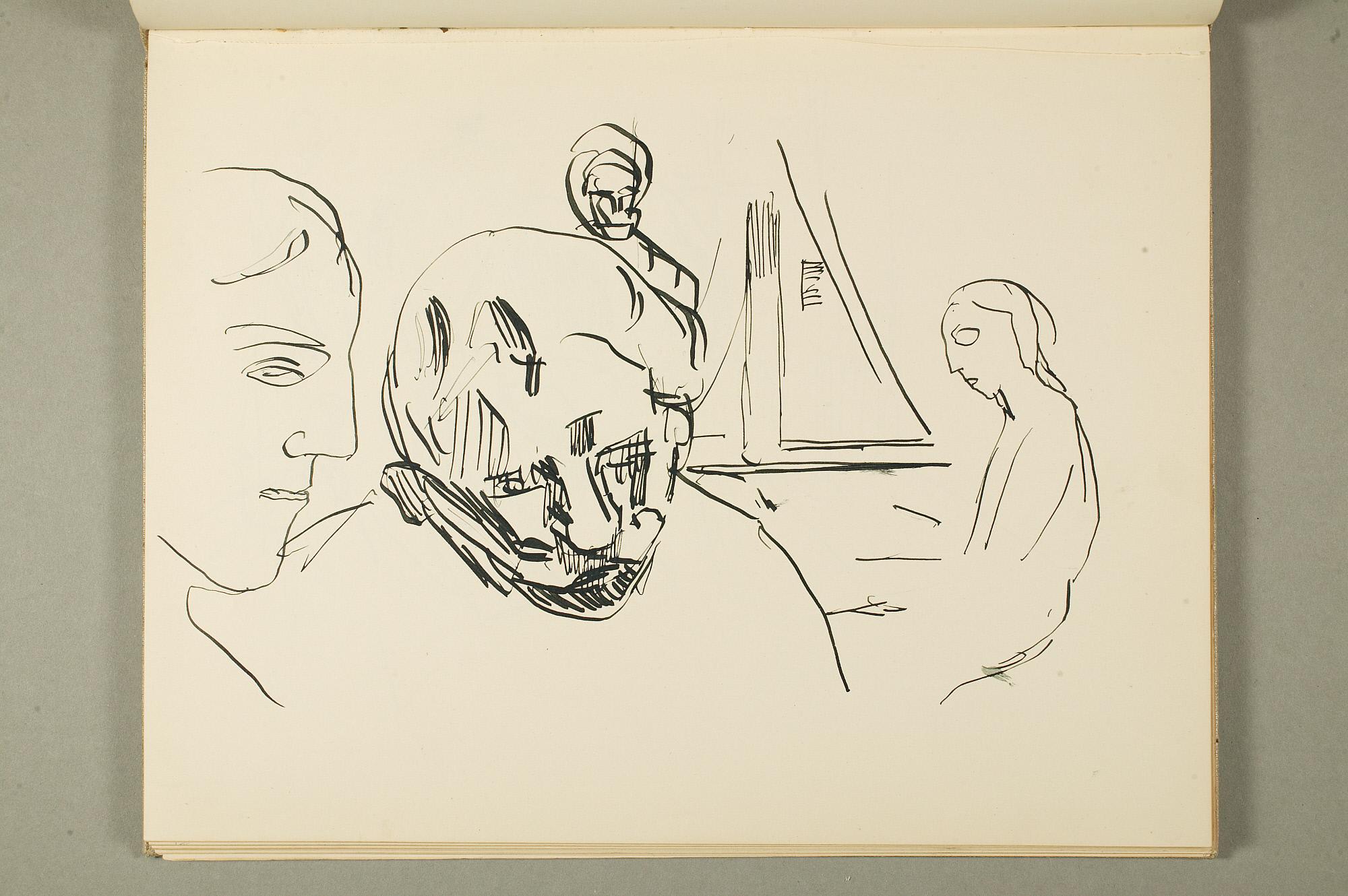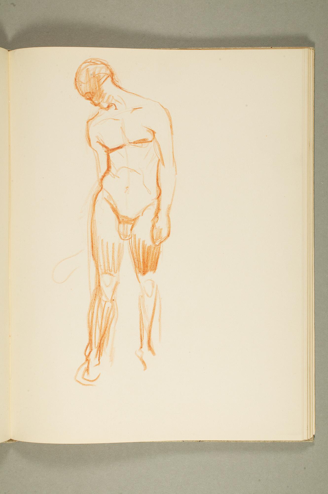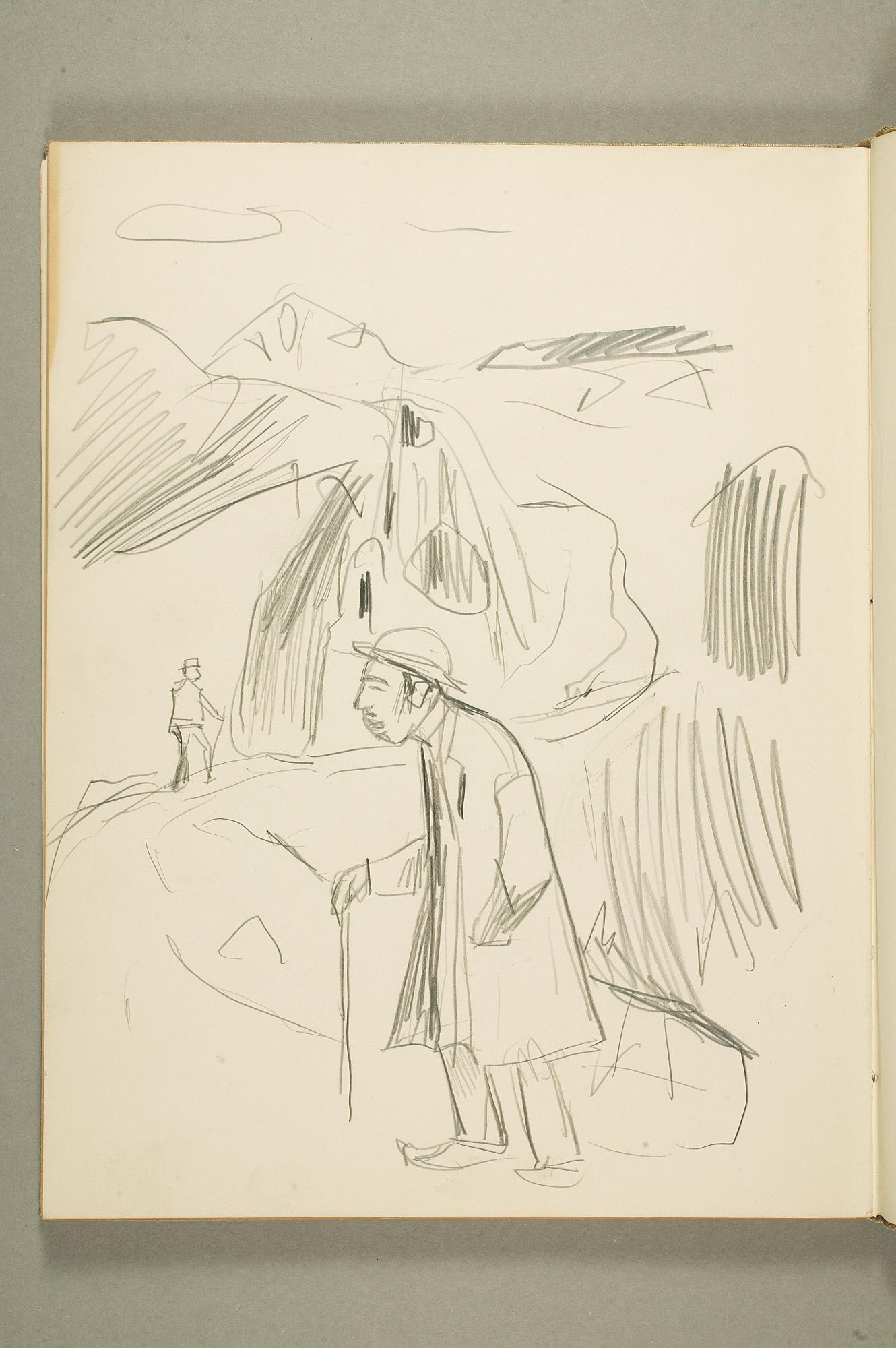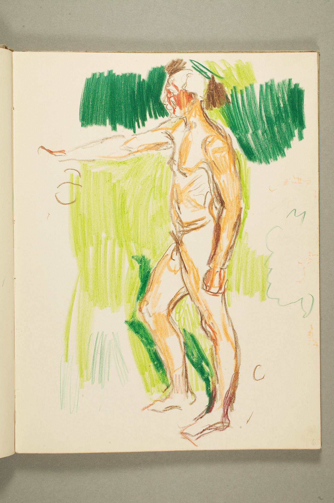 Comment:Det er særlig skisser av hester og landskap fra Ekely som danner grunnlaget for datering av denne skisseboken. Flere av tegningene kan relateres direkte til malerier, som f.eks. «Vinternatt» (side 64-verso PE.M.00231), «Treklynge i landskap» (side 69-verso PE.M.00230), «Pløyende hest» (side 1, MM.M.00356 og MM.M.00596) og andre. Tegningen «Allé» på side 63-verso ser ut til være en skisse til maleriet «Mord i alleen» signert og datert av Munch 1919 (MM.M.00268). Ut fra dette skulle skissebokens datering til 1918–19 være uproblematisk. (PP)