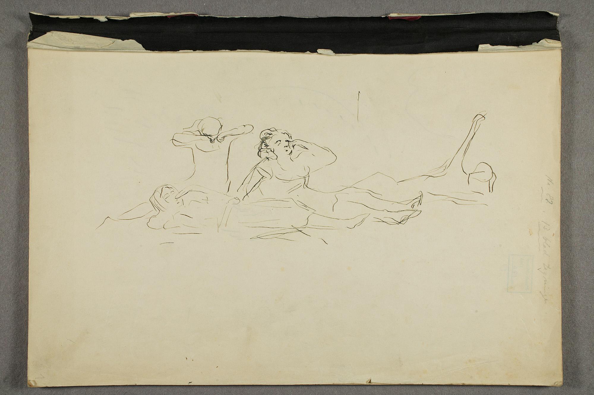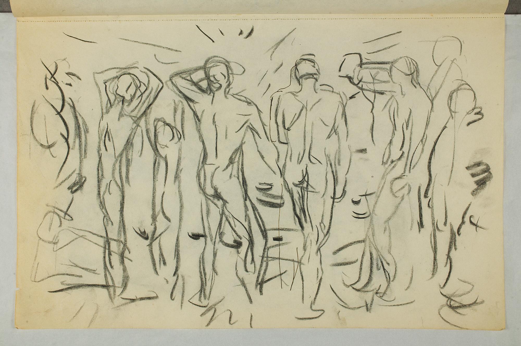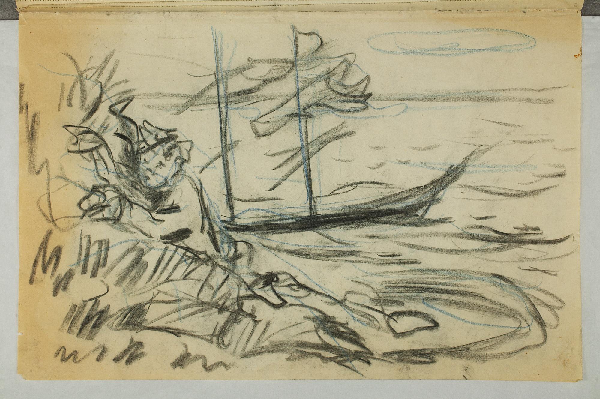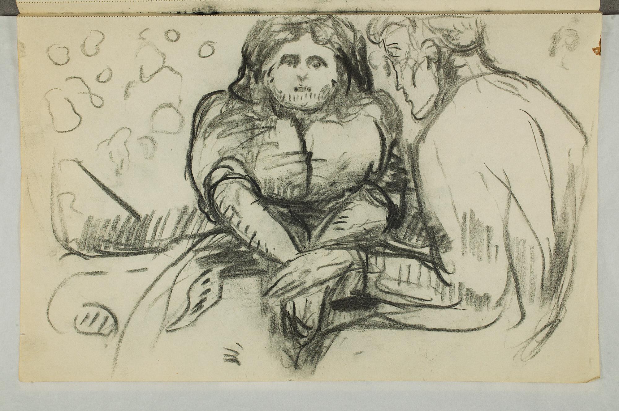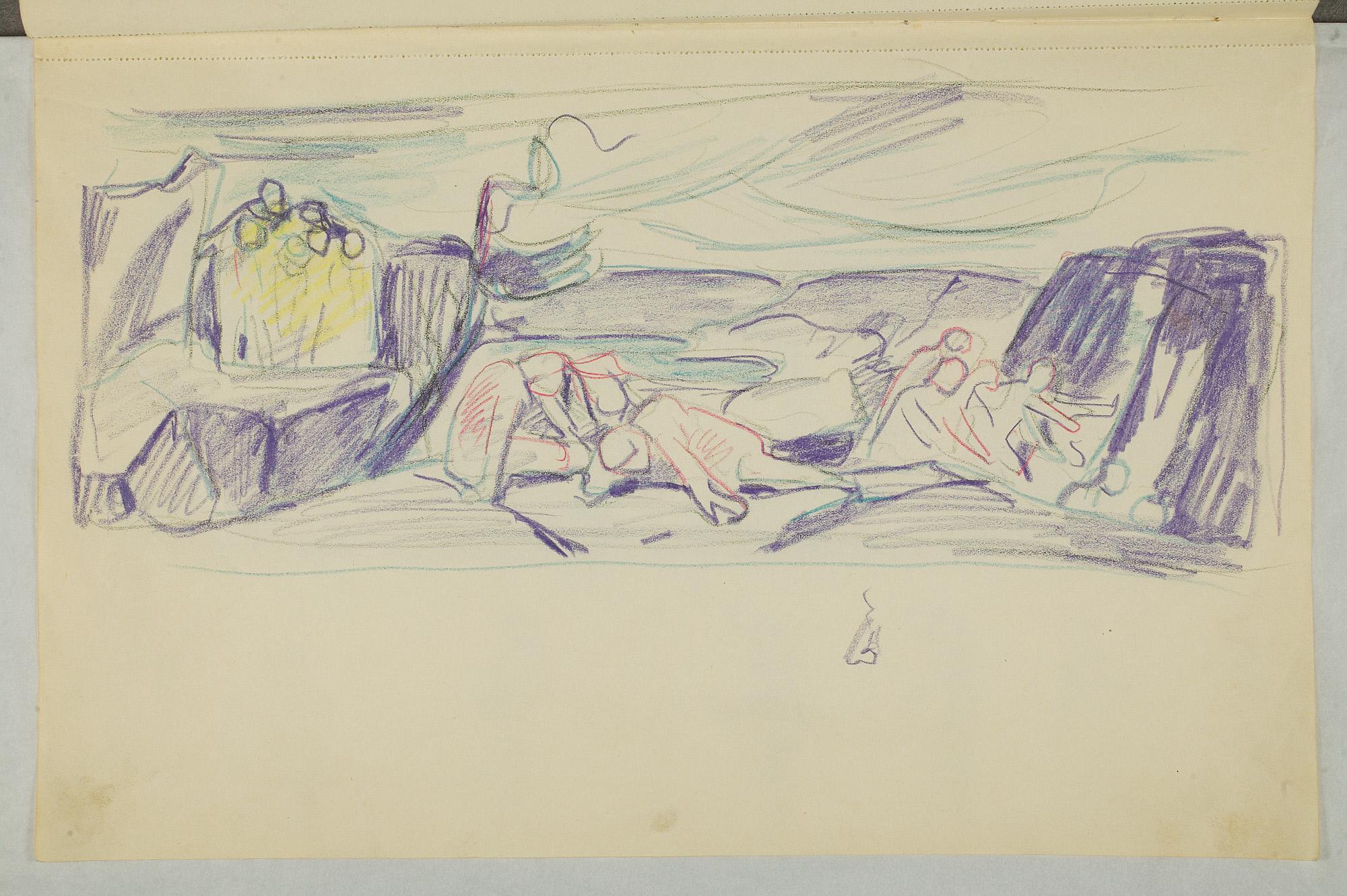 Comment:Flere tegninger i denne skisseboken kan relateres til motiver med etablert datering 1912–13, som for eksempel «Forføreren» (side 63 verso, MM.M.00055, MM.M.00785 og MM.G.00150). Skisser til «Regnbuen» og «Stormen» dateres 1916–18, sammen med plantegninger over huset på Ekely som Munch kjøpte i 1916. (PP)