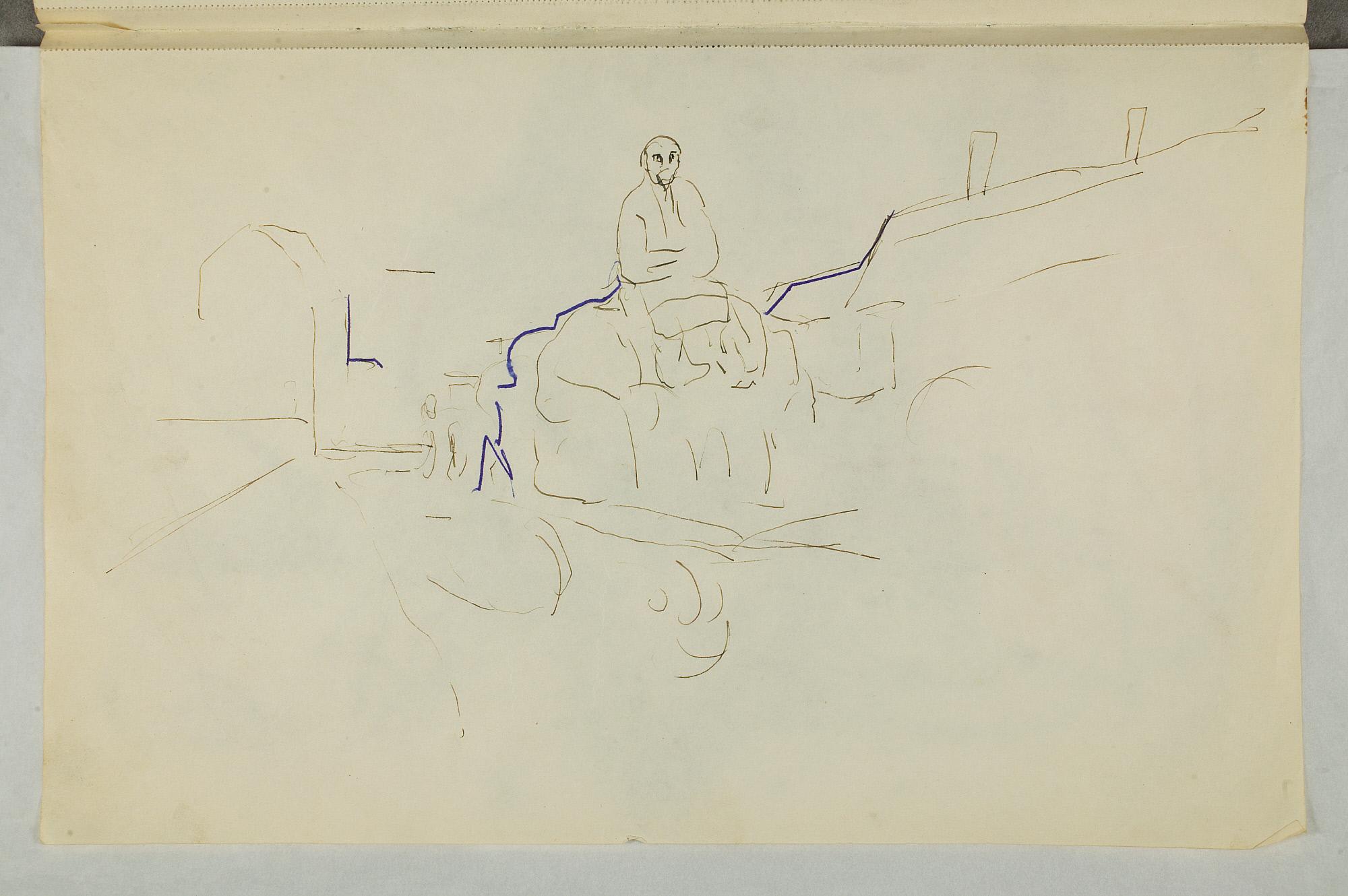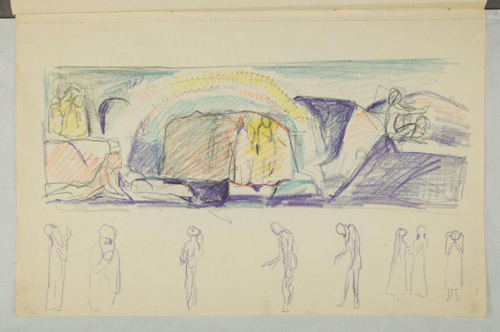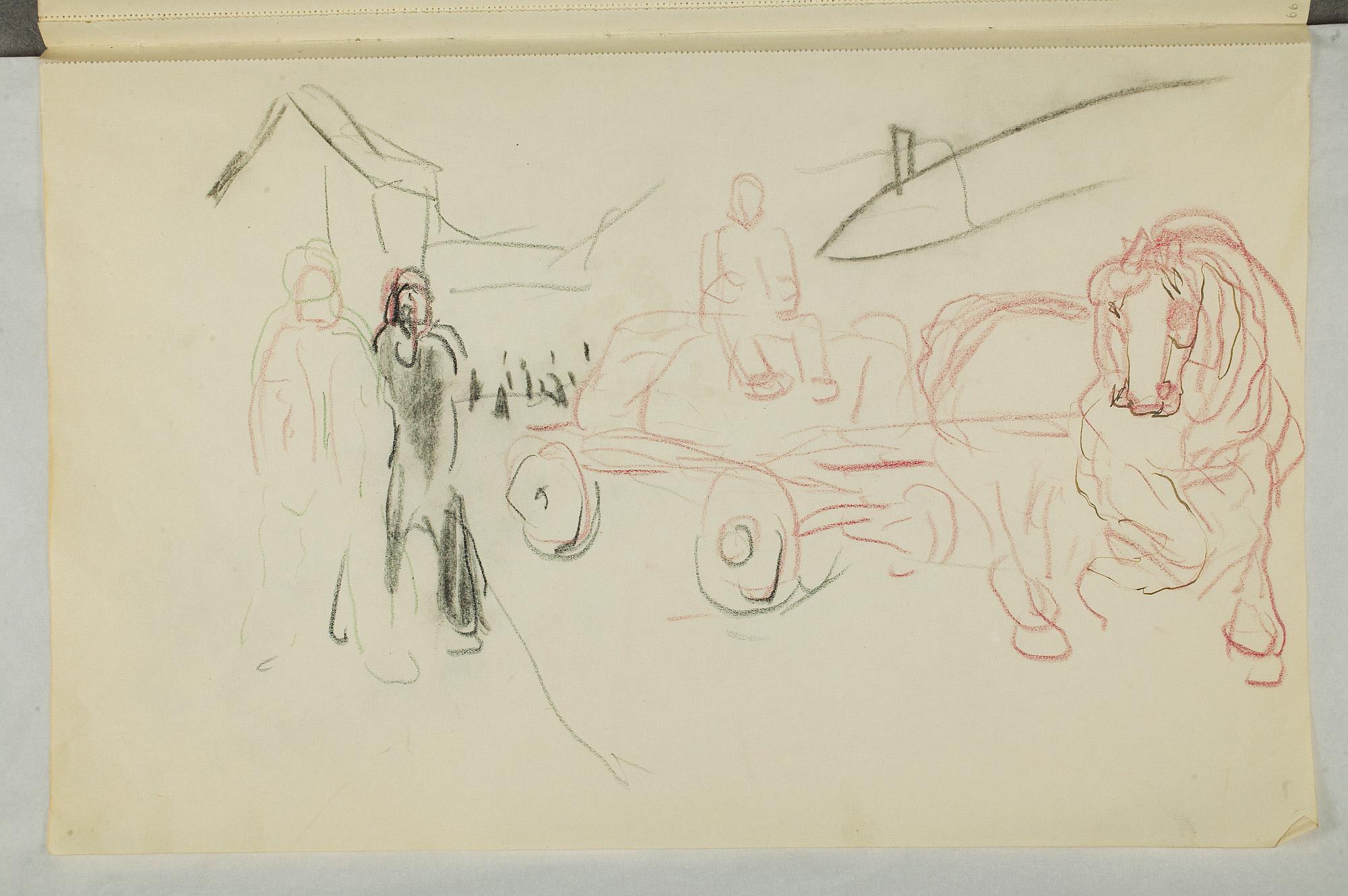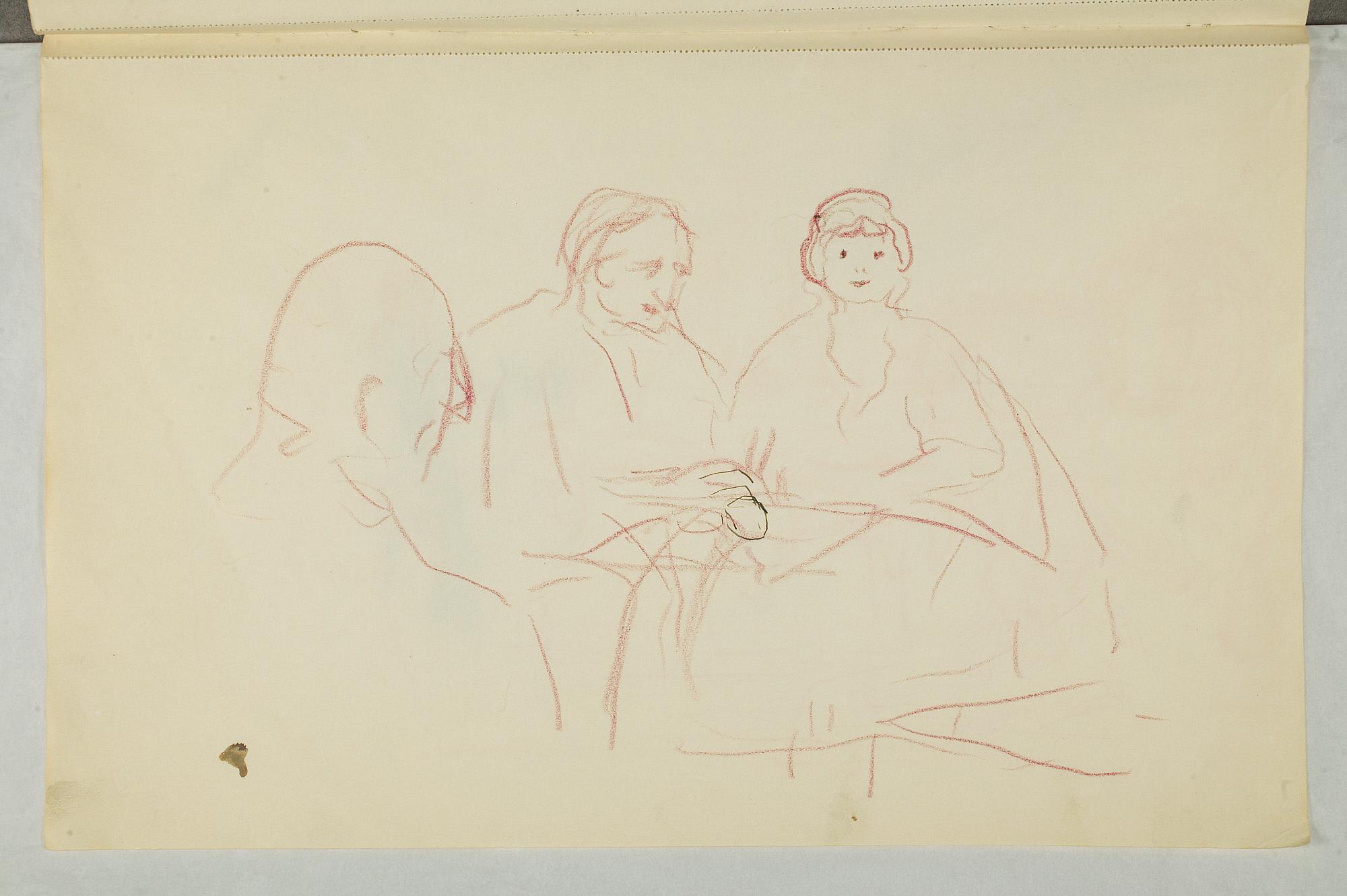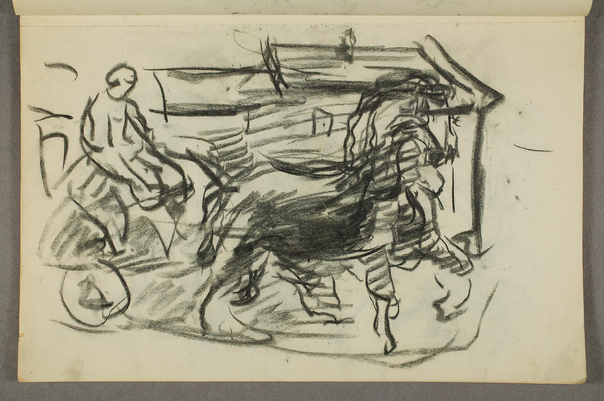 Comment:Flere tegninger i denne skisseboken kan relateres til motiver med etablert datering 1912–13, som for eksempel «Forføreren» (side 63 verso, MM.M.00055, MM.M.00785 og MM.G.00150). Skisser til «Regnbuen» og «Stormen» dateres 1916–18, sammen med plantegninger over huset på Ekely som Munch kjøpte i 1916. (PP)