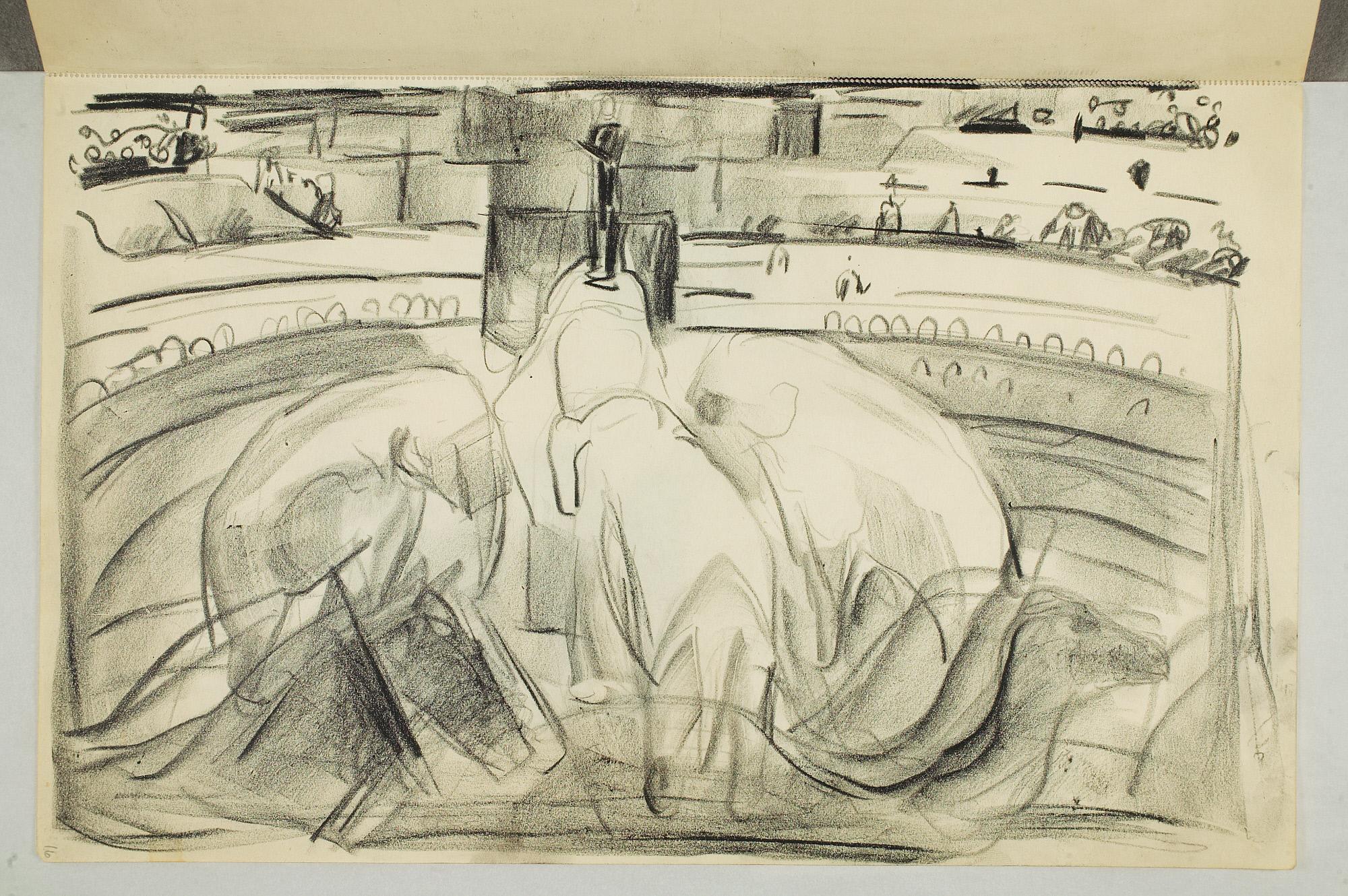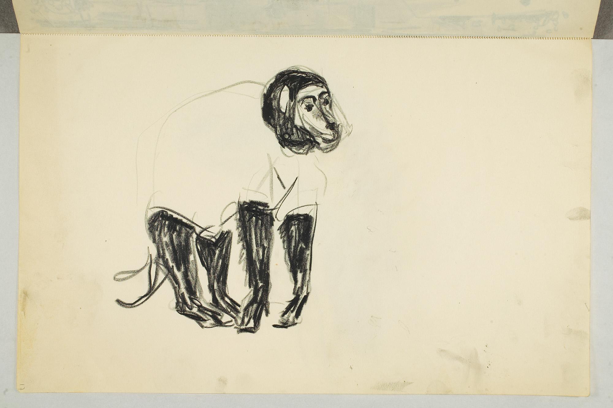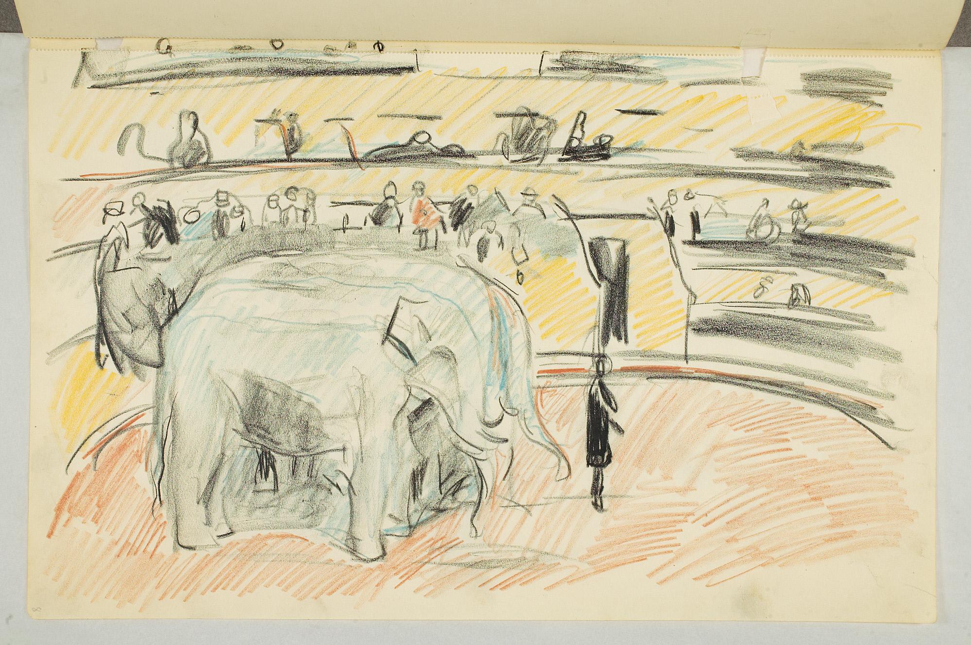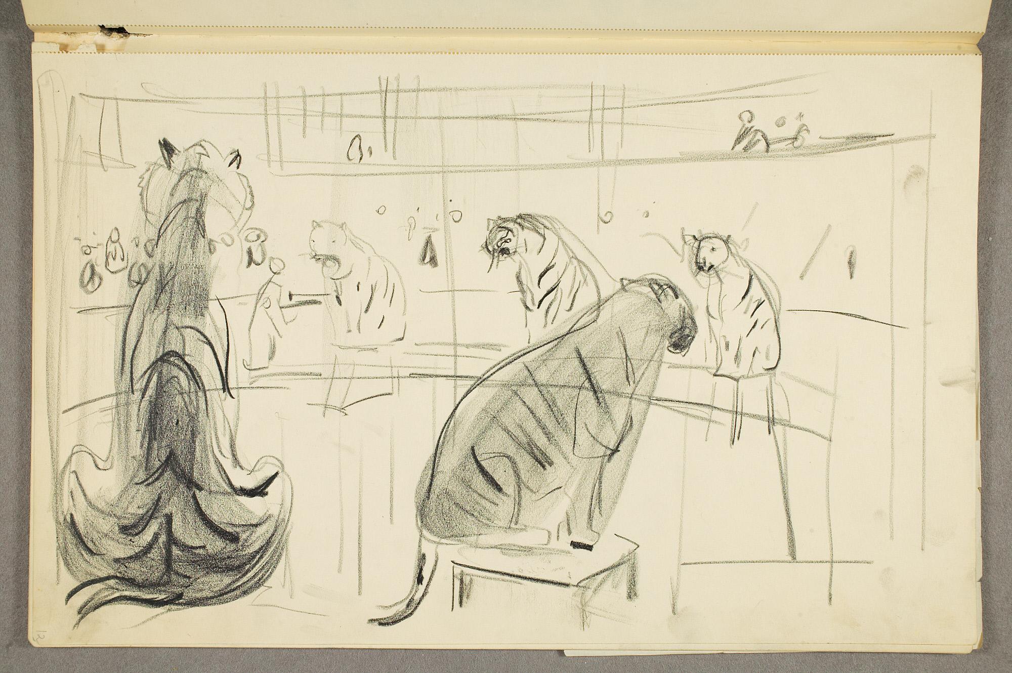 Comment:Da Cirkus Hagenbeck besøkte Kristiania i 1916, var Munch til stede ved flere forestillinger, i følge Ludvig Ravensberg. På en av disse hadde han tydeligvis med denne skisseboken, for her har han tegnet både akrobater, tigere, elefanter og apekatter. En skisse til "Alma Mater. Forskerne" kan være fra 1915, og enkelte idéskisser til atelierer på Ekely kan være opp mot 1918, men hovedtyngden av skisseboken kan altså med stor sikkerhet tidfestes til 1916. (MB)