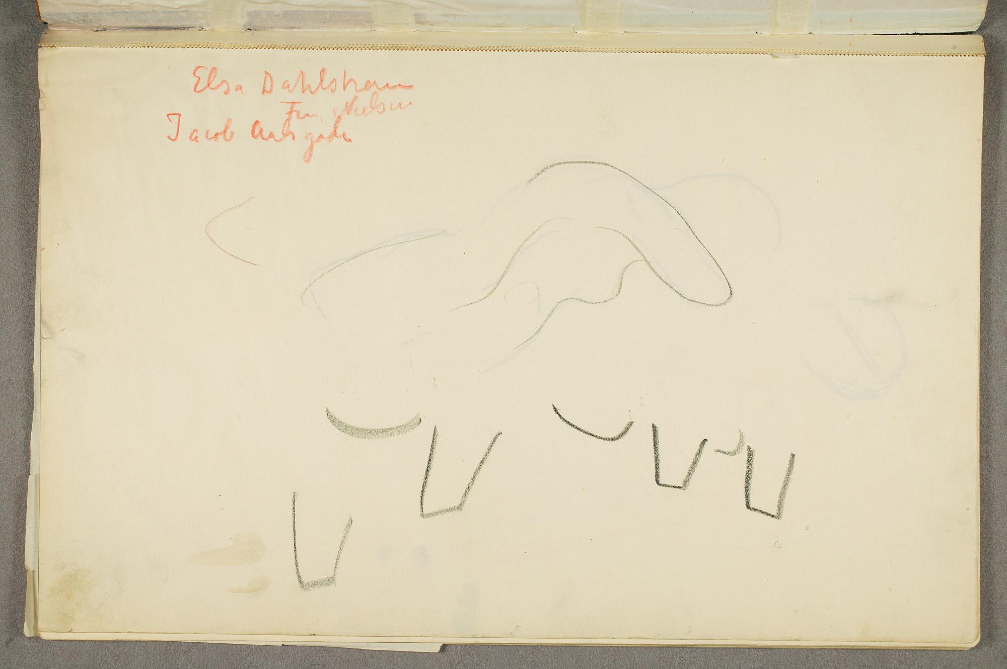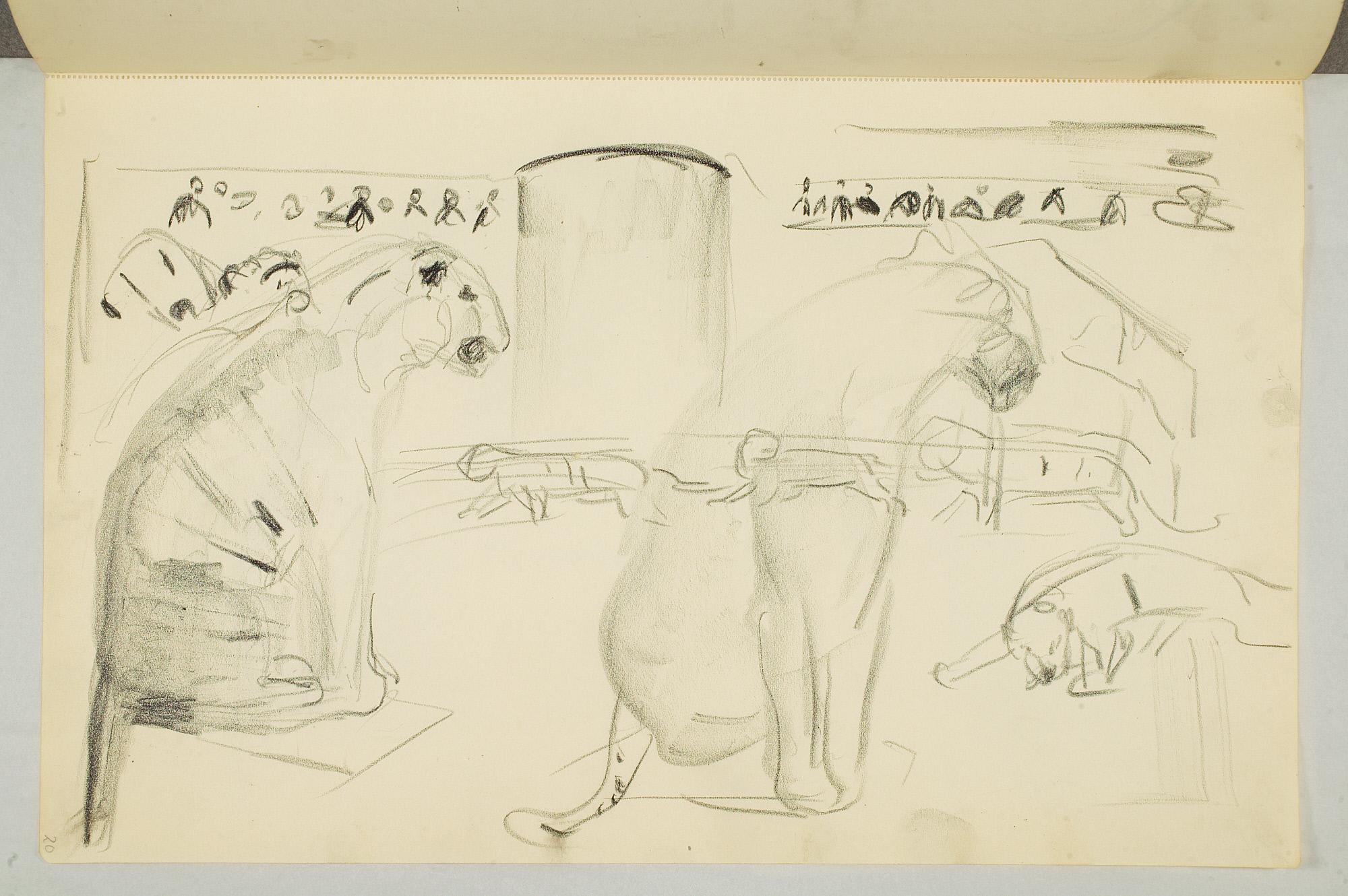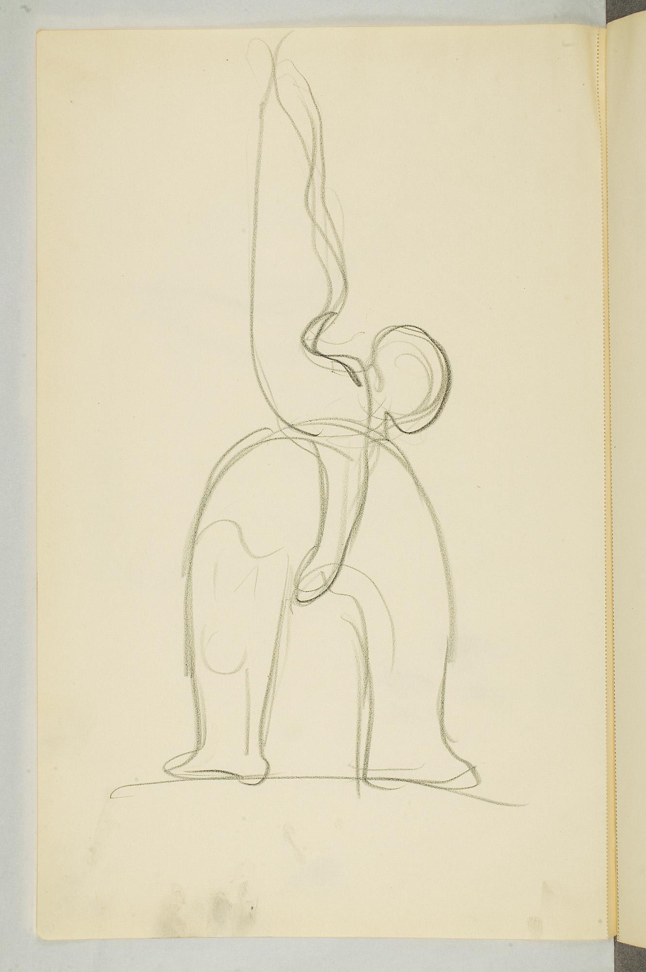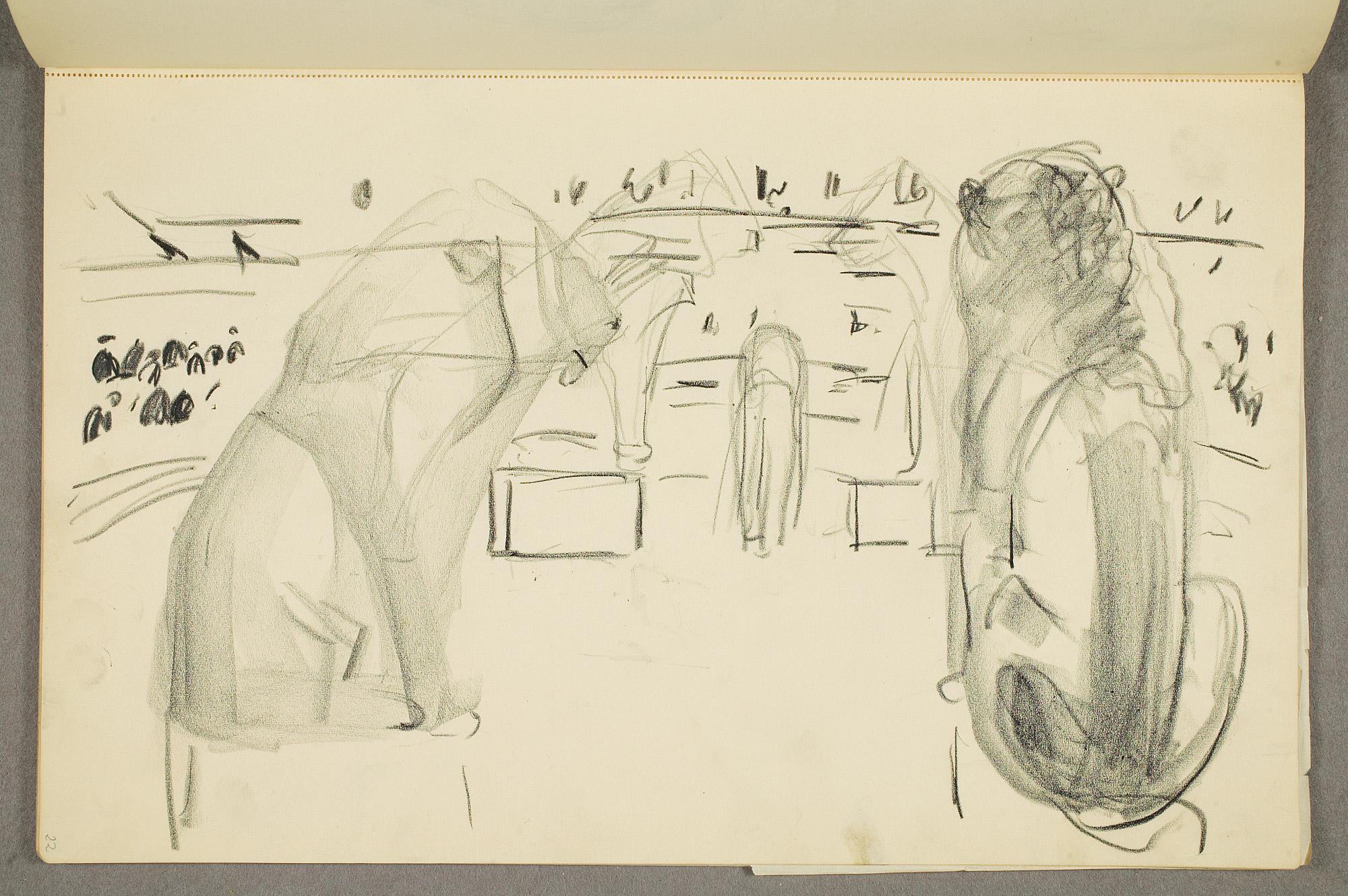 Comment:Da Cirkus Hagenbeck besøkte Kristiania i 1916, var Munch til stede ved flere forestillinger, i følge Ludvig Ravensberg. På en av disse hadde han tydeligvis med denne skisseboken, for her har han tegnet både akrobater, tigere, elefanter og apekatter. En skisse til "Alma Mater. Forskerne" kan være fra 1915, og enkelte idéskisser til atelierer på Ekely kan være opp mot 1918, men hovedtyngden av skisseboken kan altså med stor sikkerhet tidfestes til 1916. (MB)