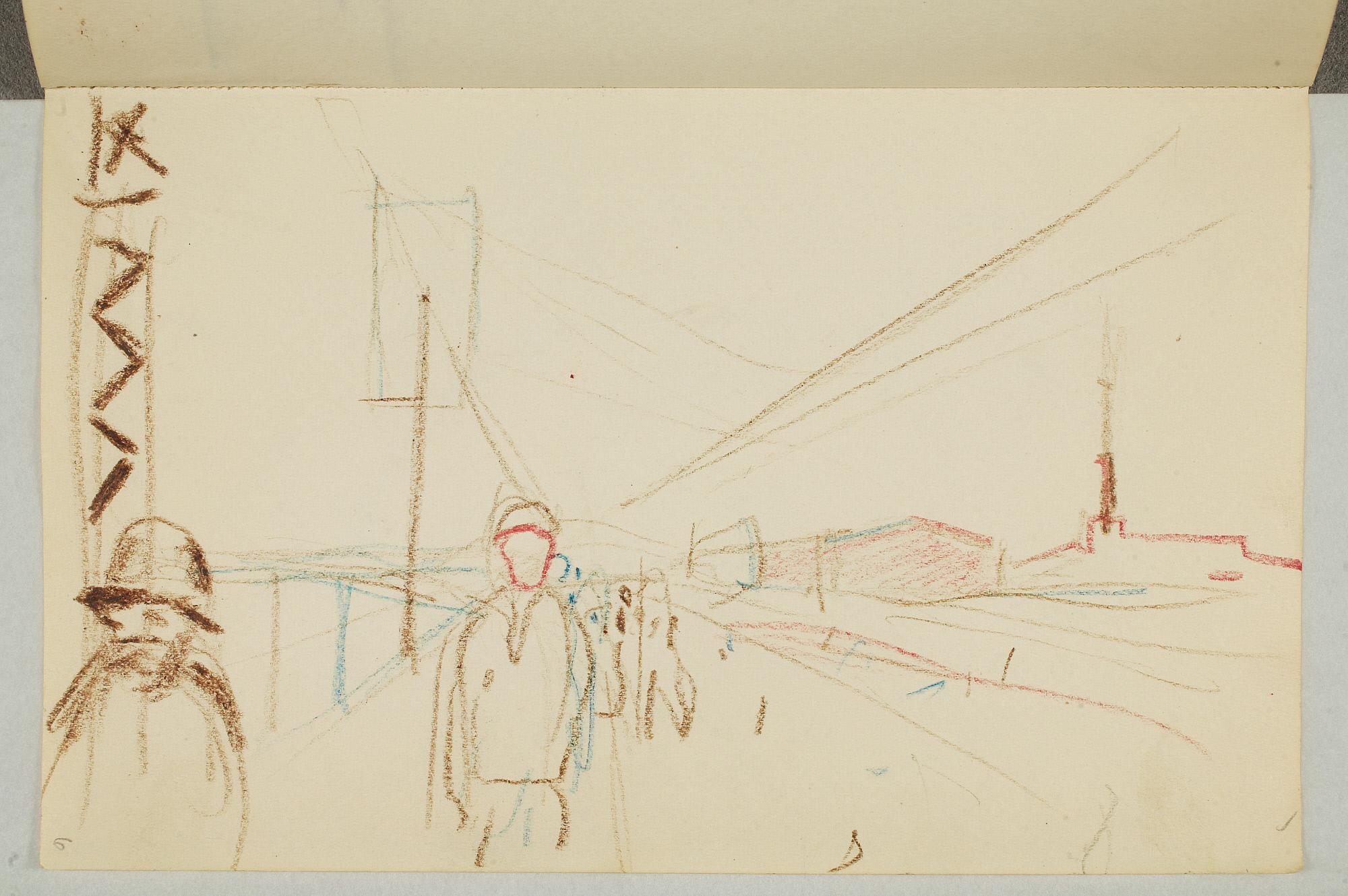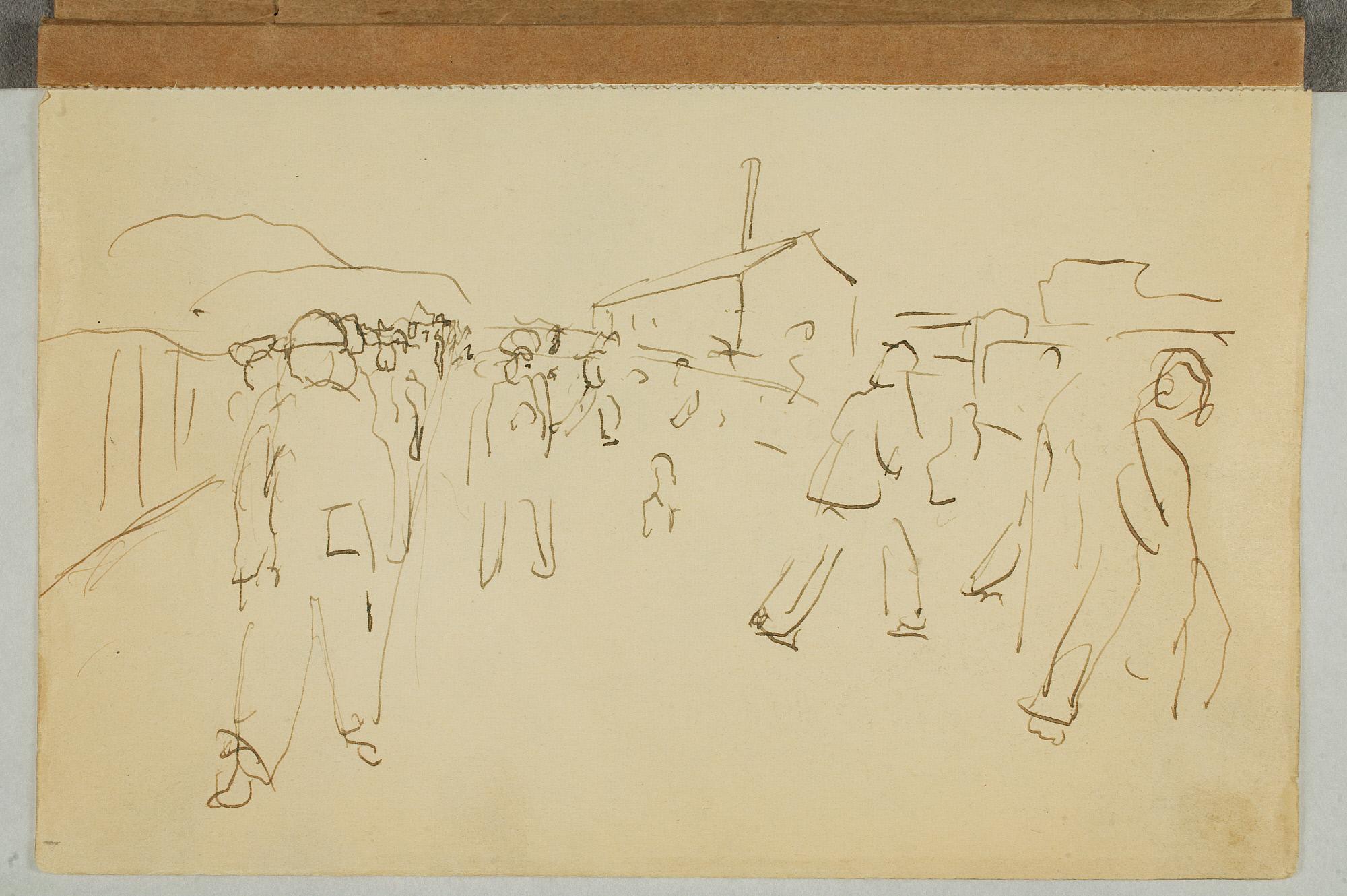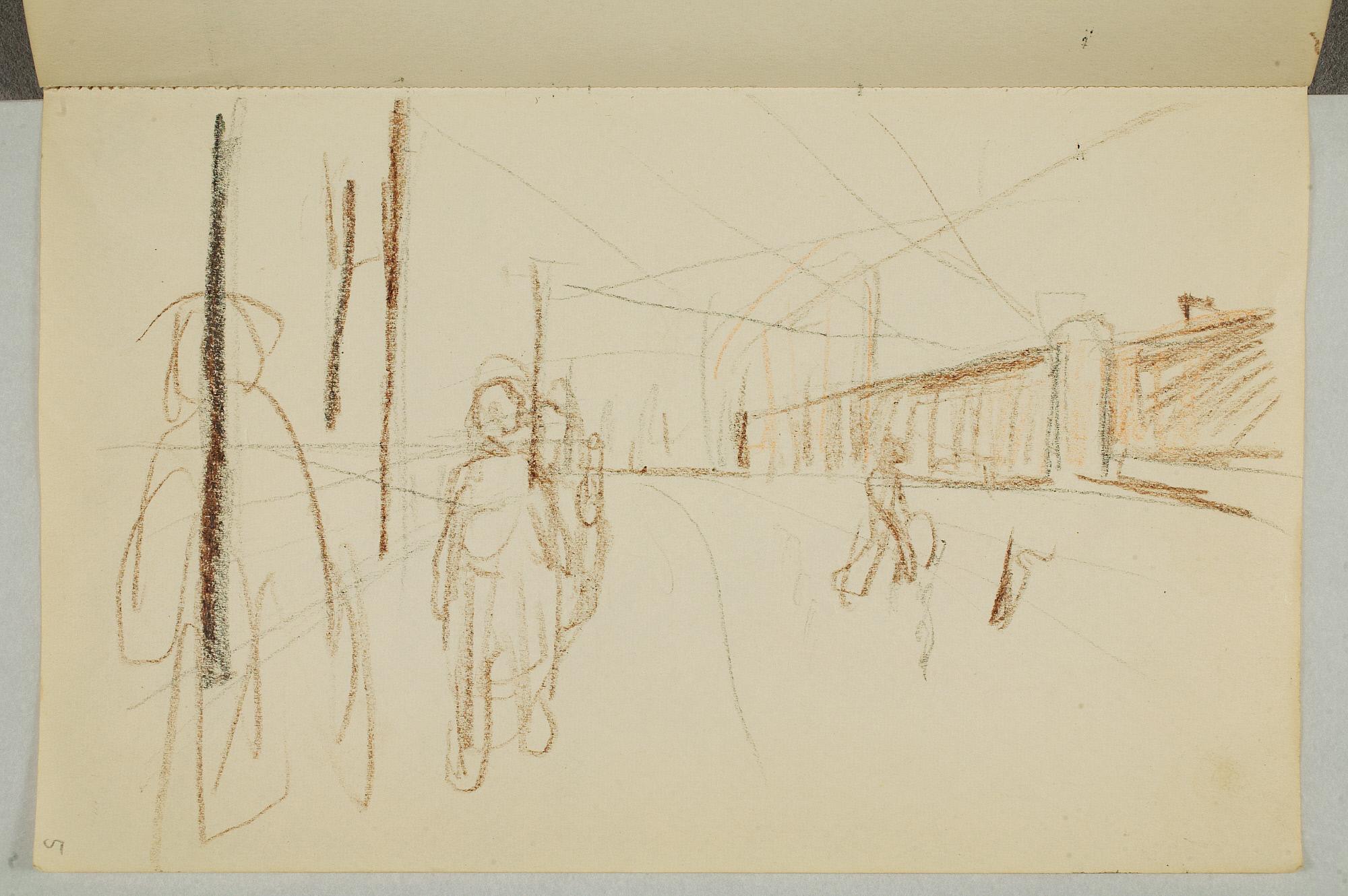 Comment:Denne skisseboken har fått dateringen 1920, på grunnlag av flere tegninger av arbeidere på hjemvei, som kan knyttes til maleriet PE.M.00234. Dette er datert av kunstneren, og det ble utstilt i januar 1921, så dateringen anses som sikker. Stedet er sannsynligvis Eurekas Mek. Verksted på Skøyen, i nærheten av Munchs bolig på Ekely. Han har også laget en stor akvarell av samme motiv (MM.T.01855), og i forbindelse med et utsmykningsoppdrag for Freia Sjokoladefabrikk tok han utgangspunkt i dette motivet i et lite utkast i fargeblyant (MM.T.02025).