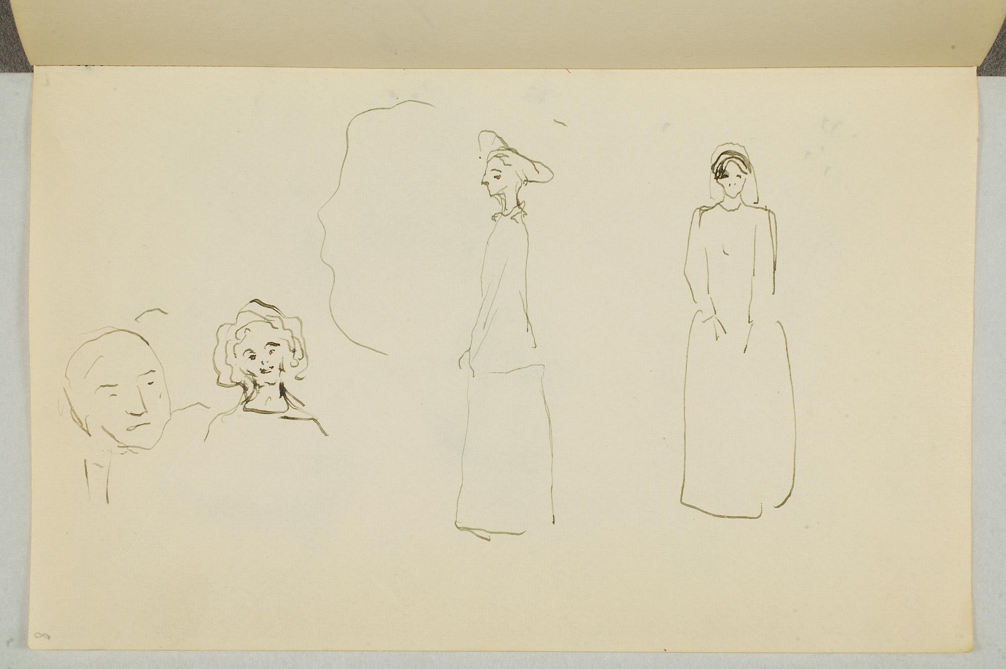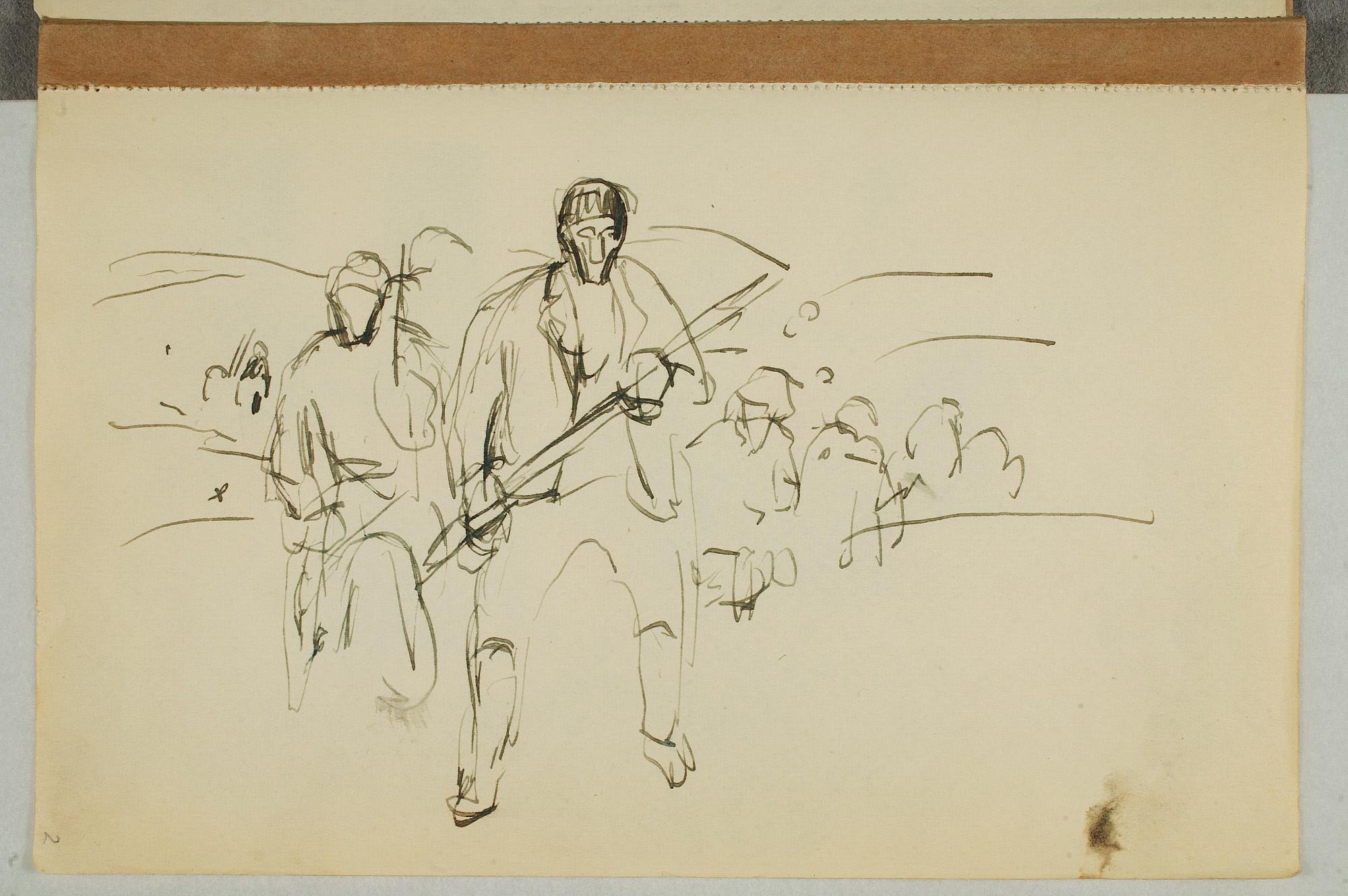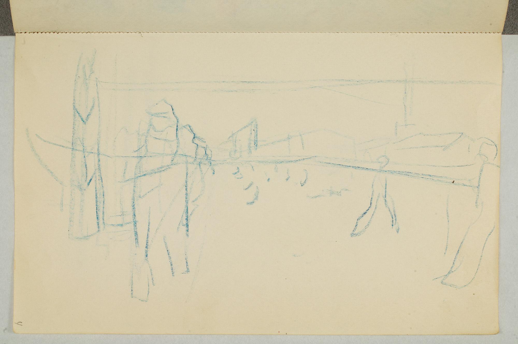 Comment:Denne skisseboken har fått dateringen 1920, på grunnlag av flere tegninger av arbeidere på hjemvei, som kan knyttes til maleriet PE.M.00234. Dette er datert av kunstneren, og det ble utstilt i januar 1921, så dateringen anses som sikker. Stedet er sannsynligvis Eurekas Mek. Verksted på Skøyen, i nærheten av Munchs bolig på Ekely. Han har også laget en stor akvarell av samme motiv (MM.T.01855), og i forbindelse med et utsmykningsoppdrag for Freia Sjokoladefabrikk tok han utgangspunkt i dette motivet i et lite utkast i fargeblyant (MM.T.02025).