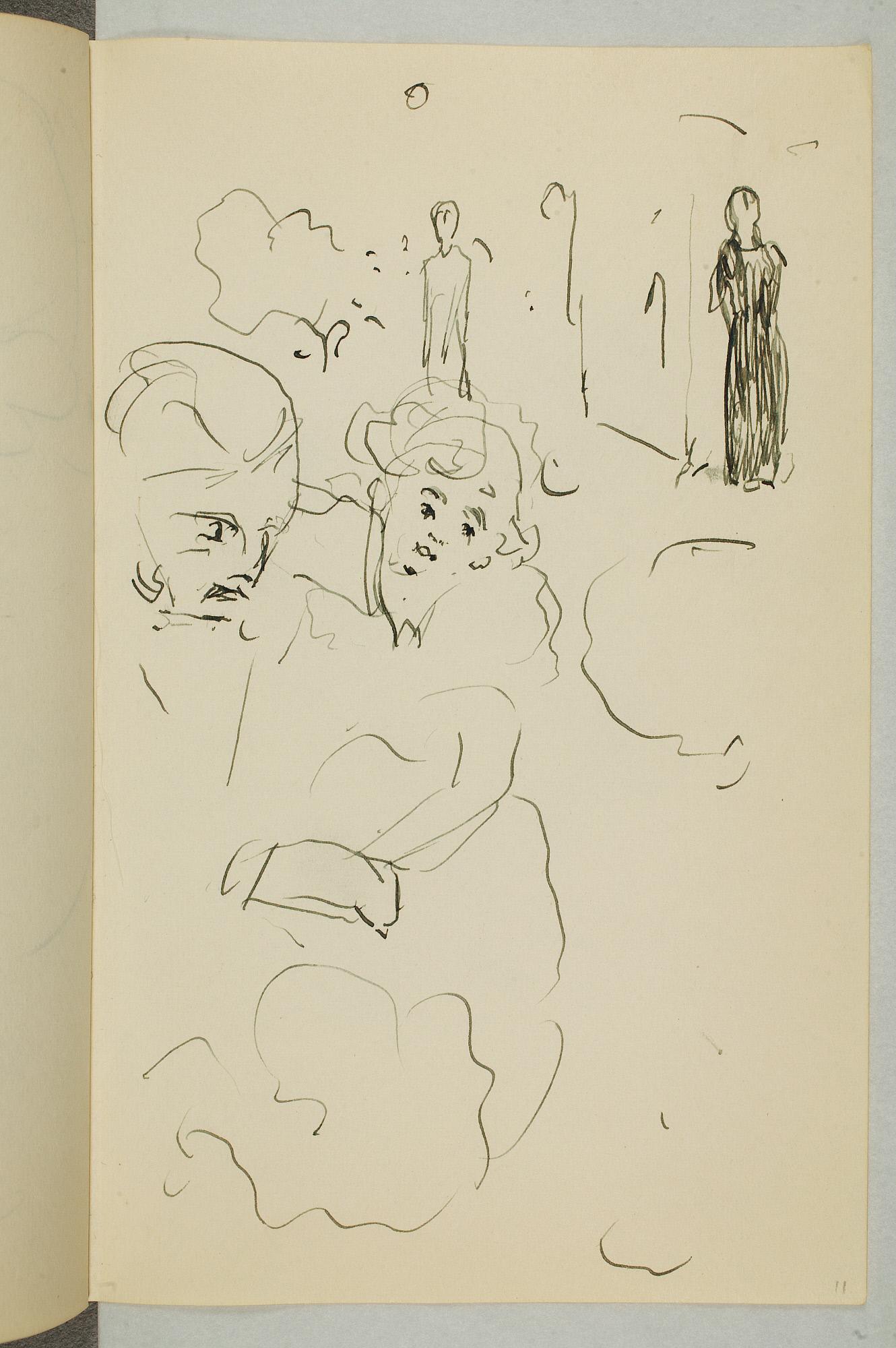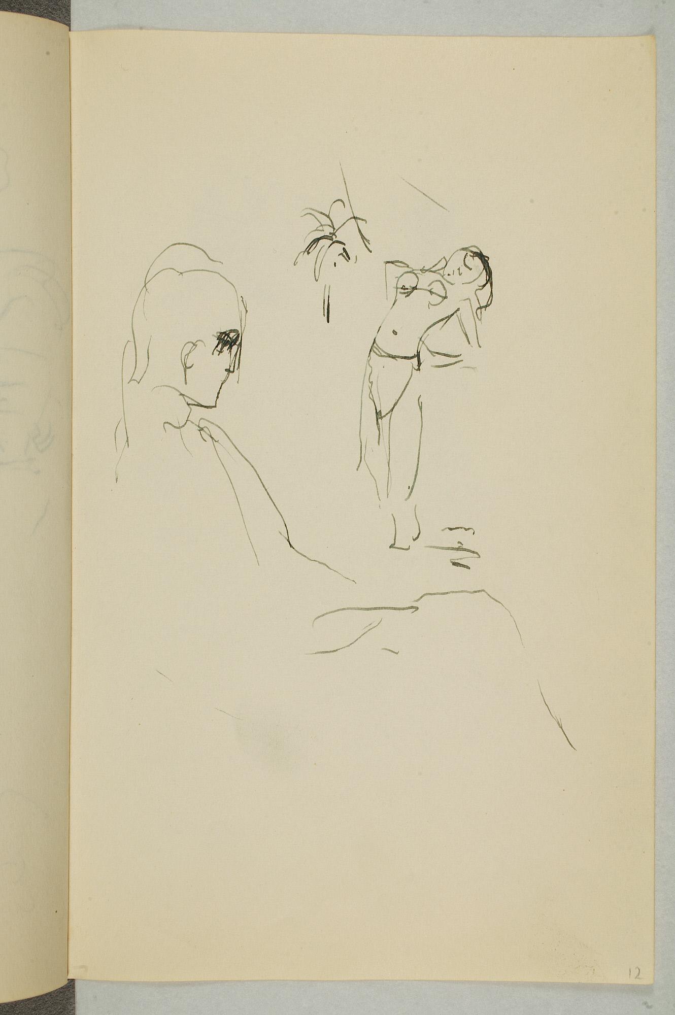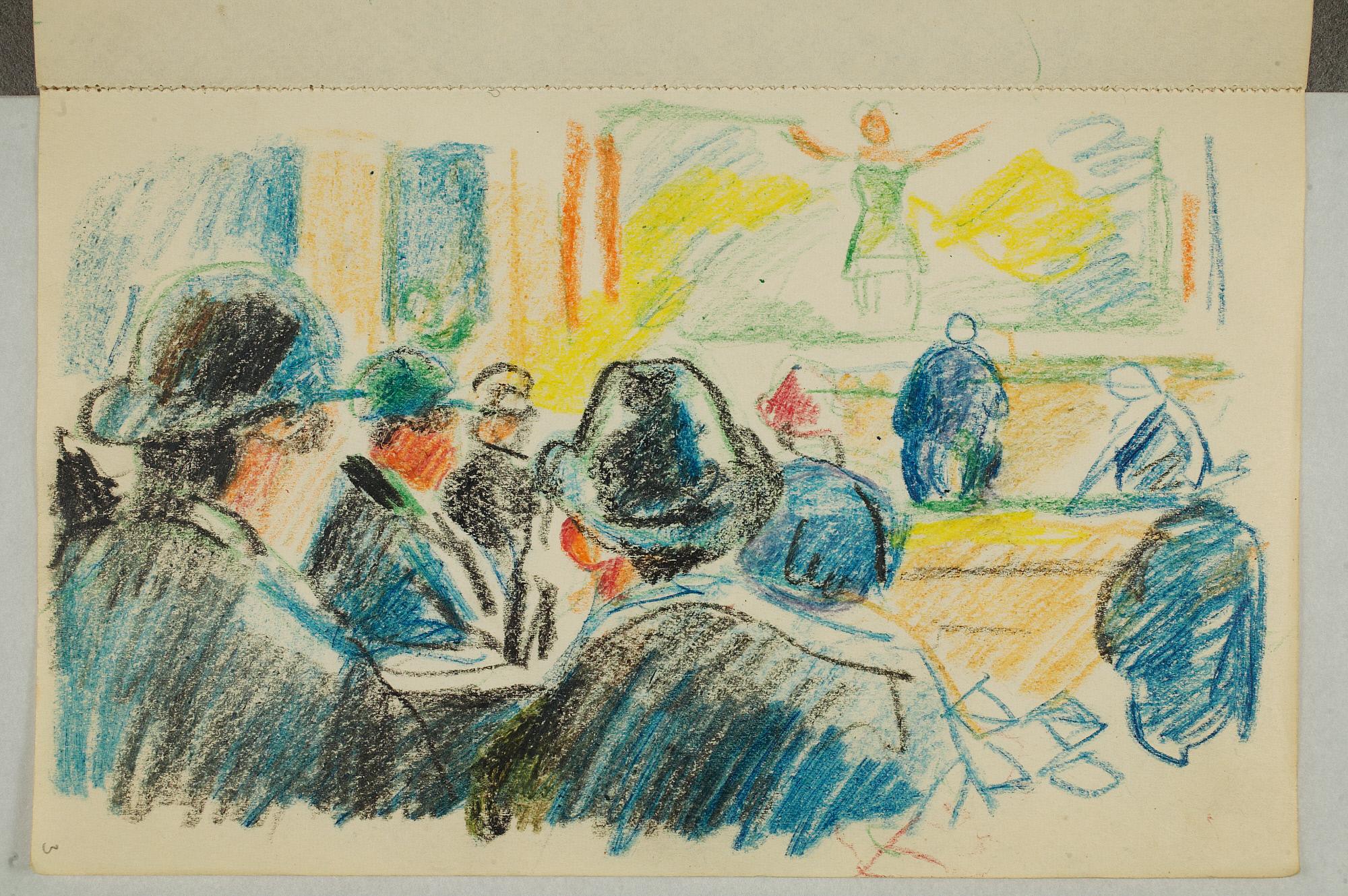 Det er to tegninger med kabaretmotiv her; den ene kommer mellom skissene av hjemvendende arbeidere, den andre er plassert helt sist. Dette indikerer at alle tegningene har blitt utført omtrent samtidig. (MB/GW)