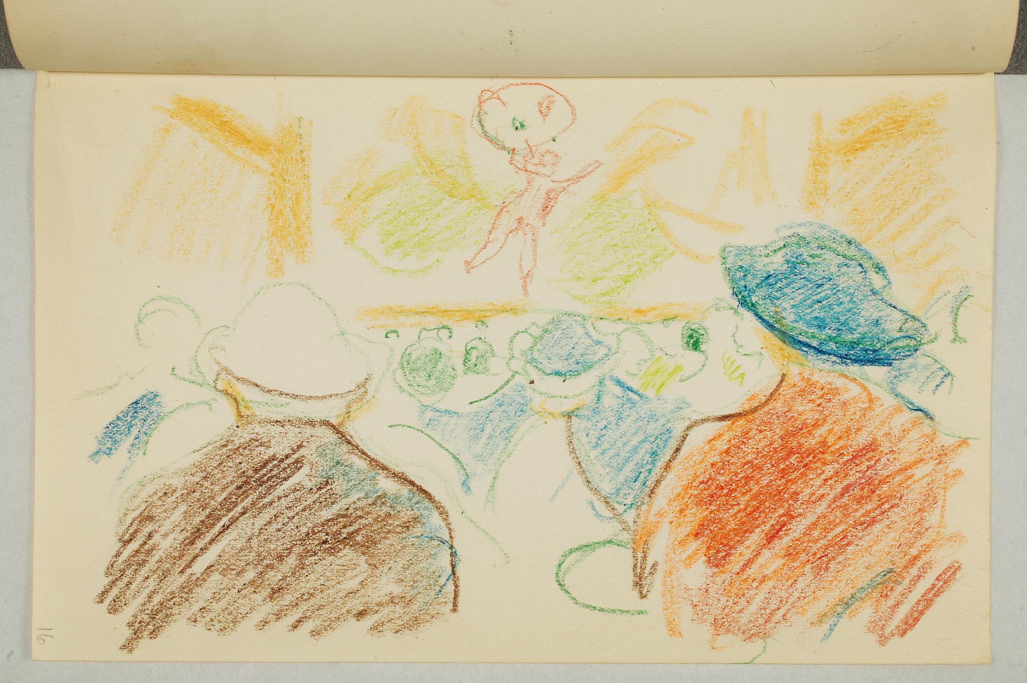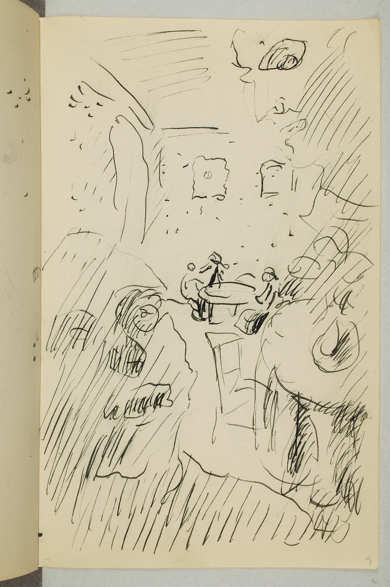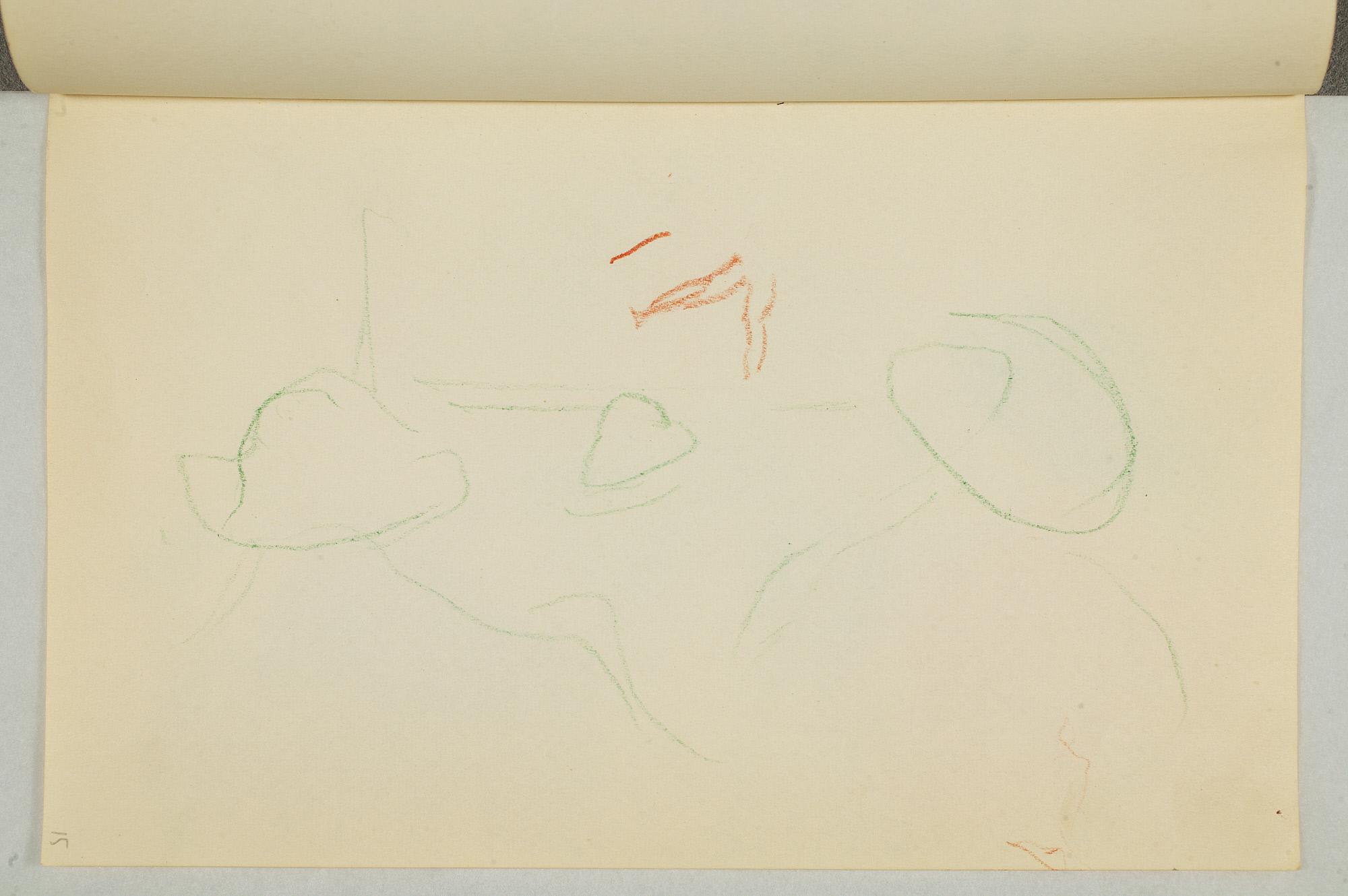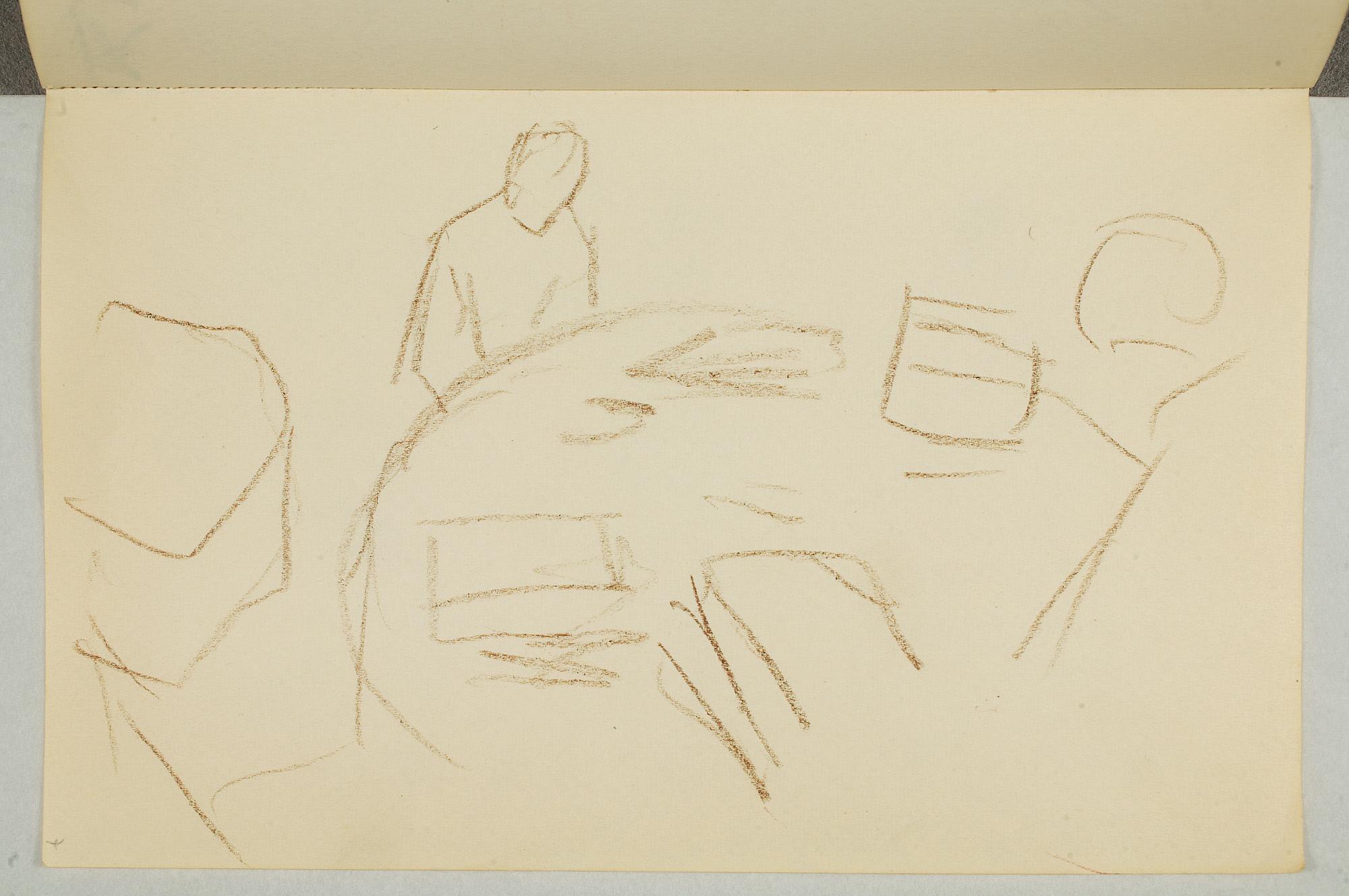 Det er to tegninger med kabaretmotiv her; den ene kommer mellom skissene av hjemvendende arbeidere, den andre er plassert helt sist. Dette indikerer at alle tegningene har blitt utført omtrent samtidig. (MB/GW)