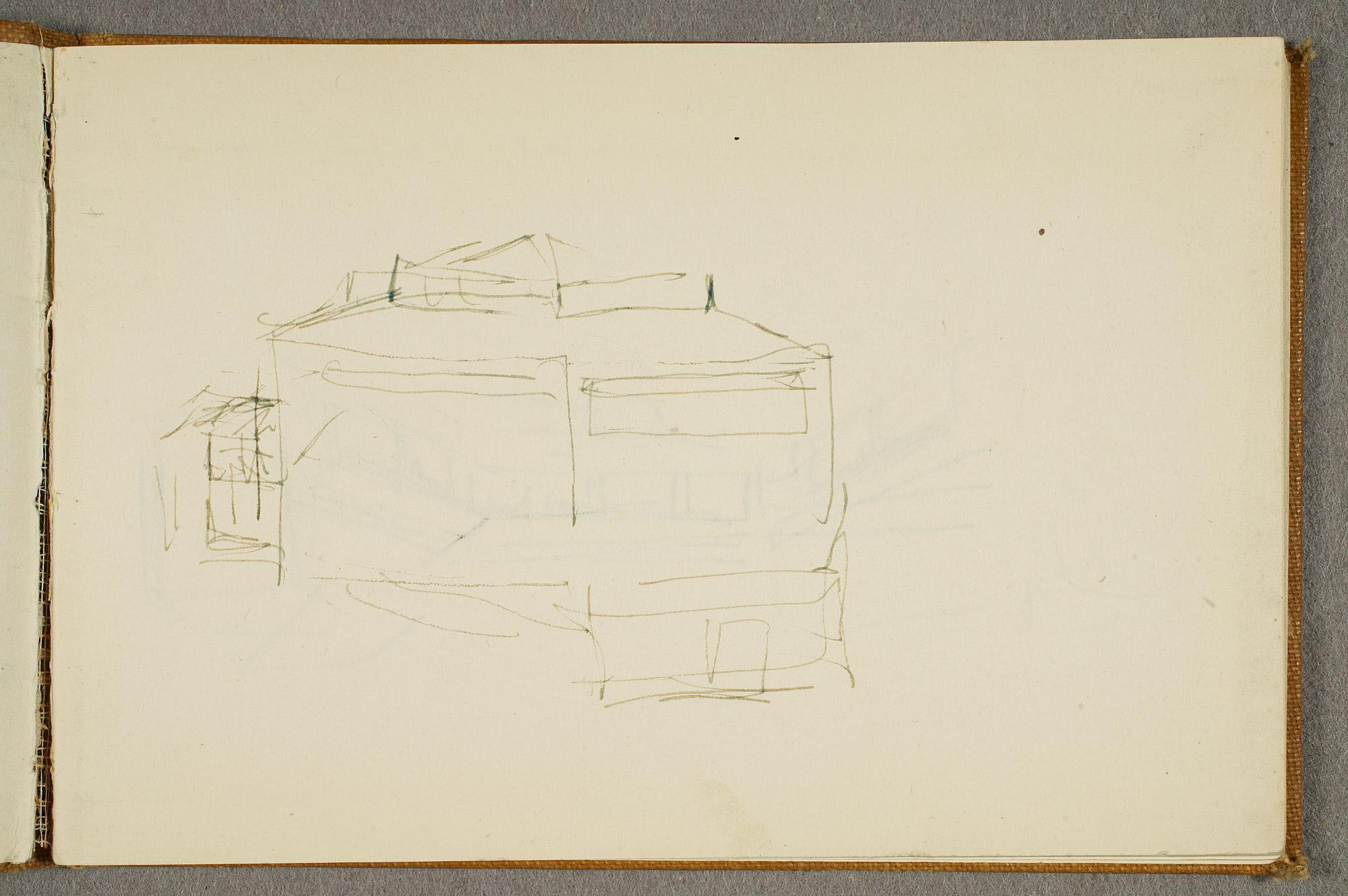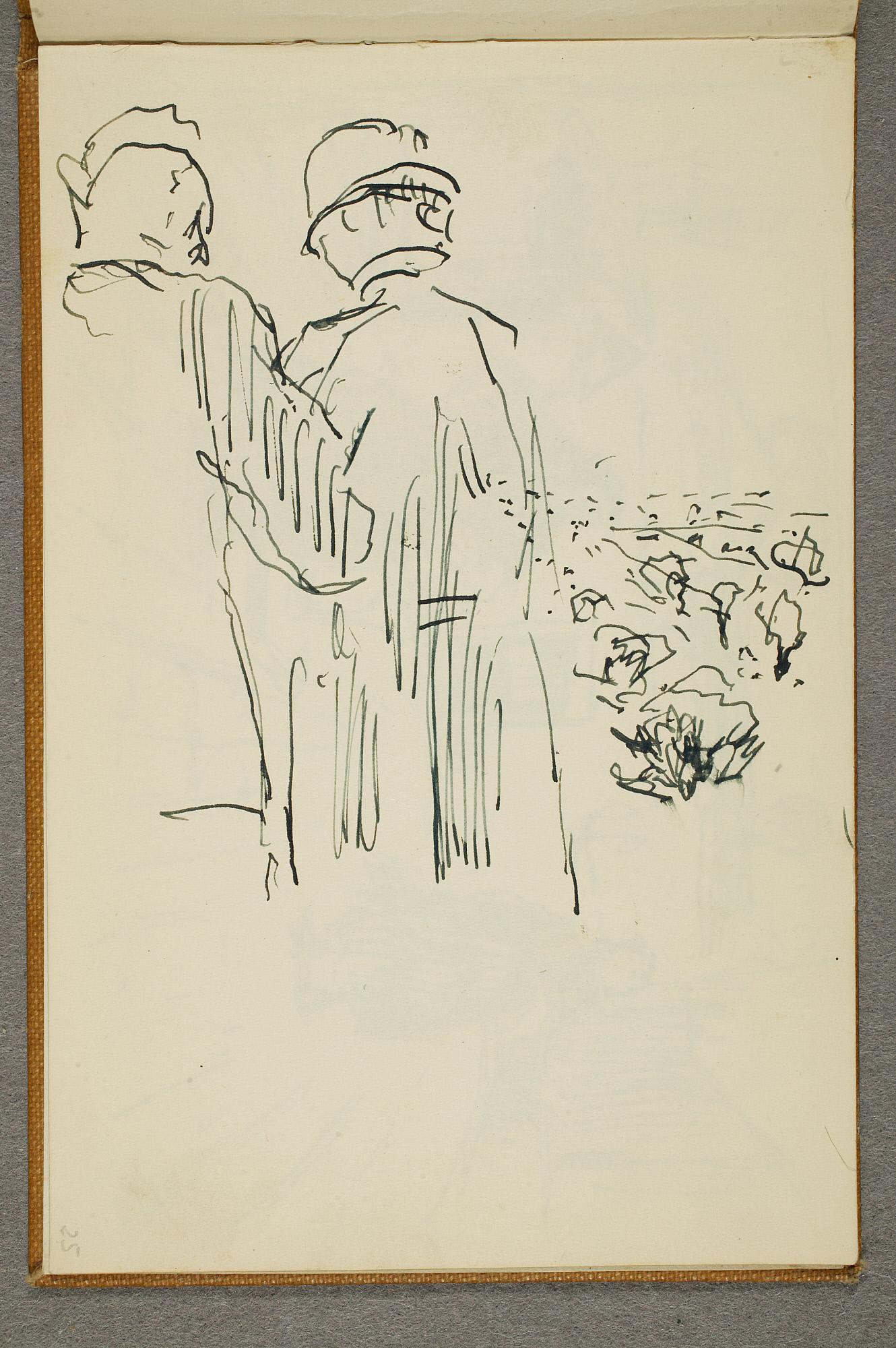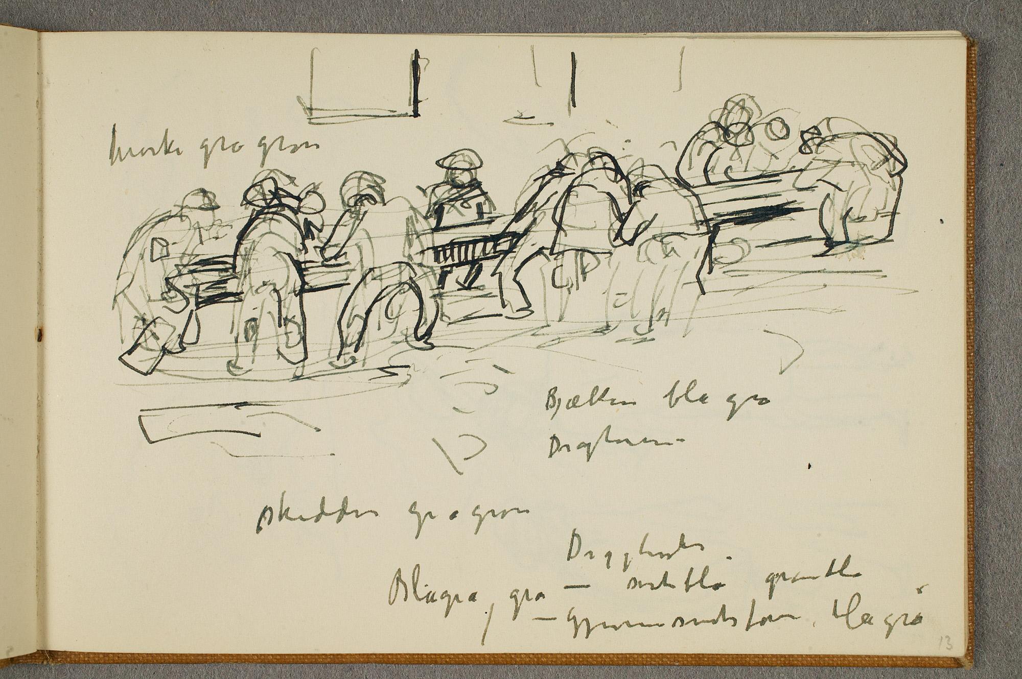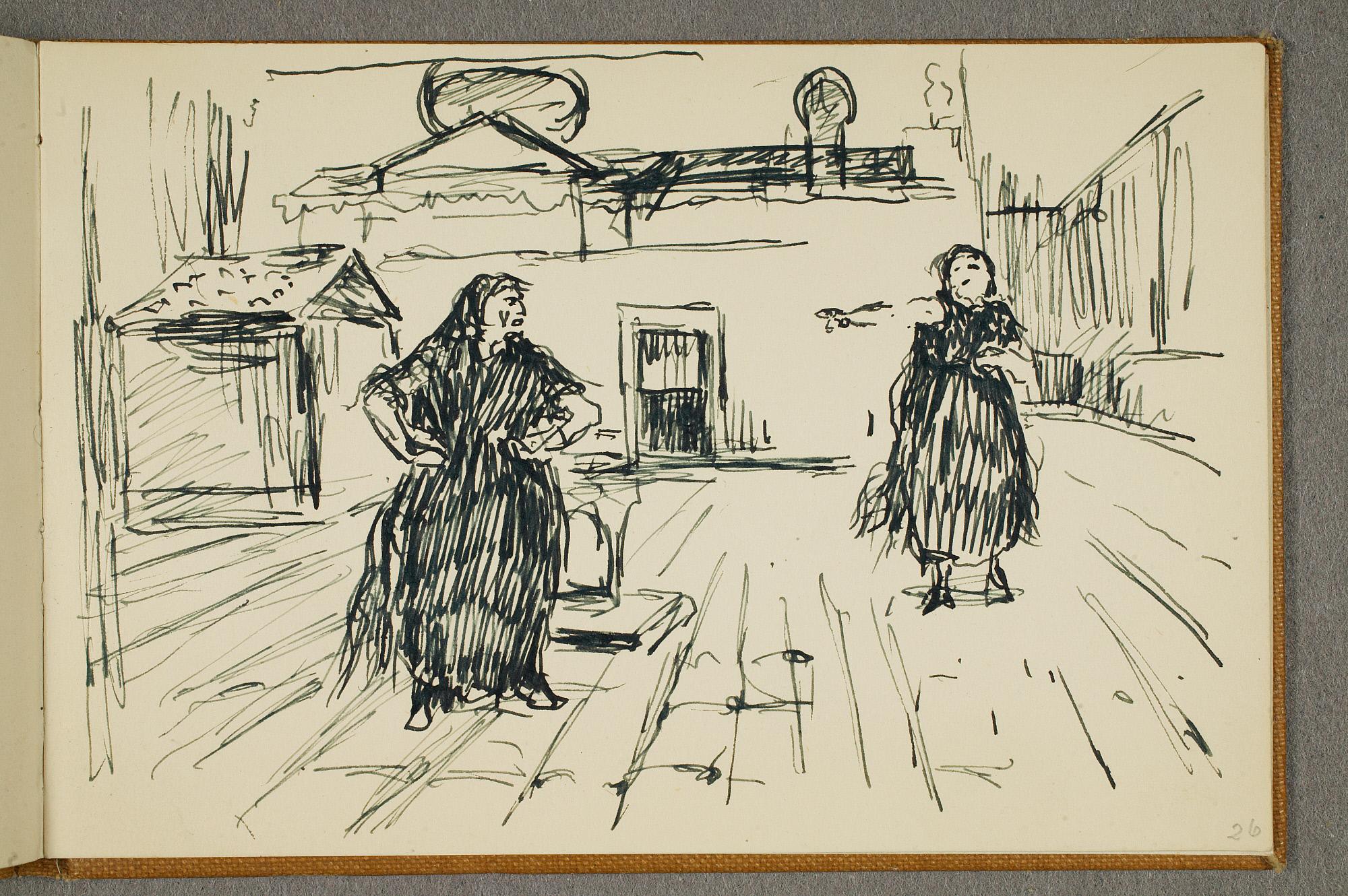 Comment:Flere notater i denne skisseboken knytter den til Munchs Italiareise i 1926. På side 24 verso er det en tegning med motiv fra Markusplassen med basilikaen i bakgrunnen. At alle tegningene er utført med penn og svart blekk gjør det sannsynlig at de er blitt til på denne reisen, med unntak av de siste to skissene, som forestiller atelier og uteatelier på Ekely. (MB)