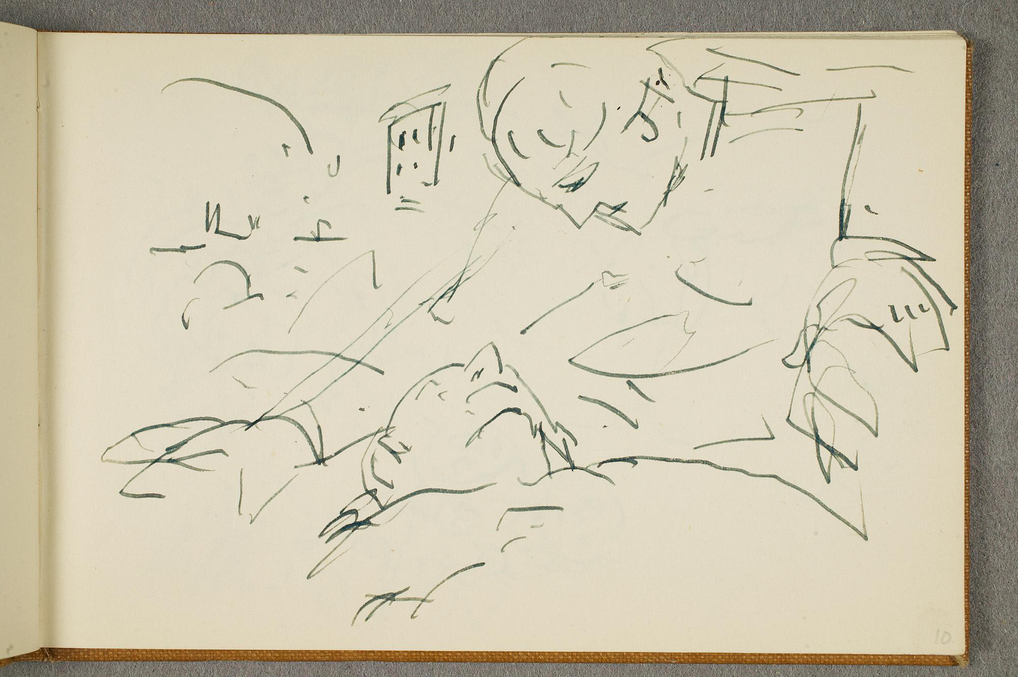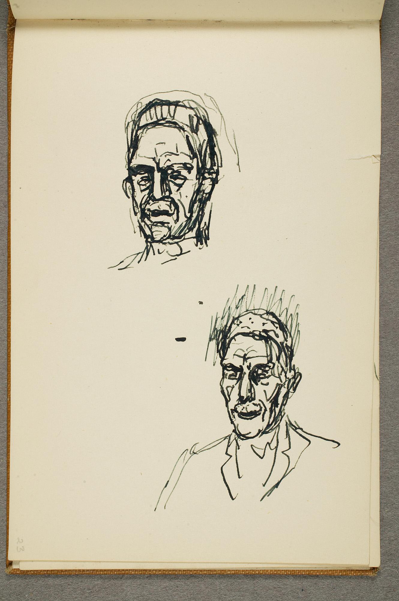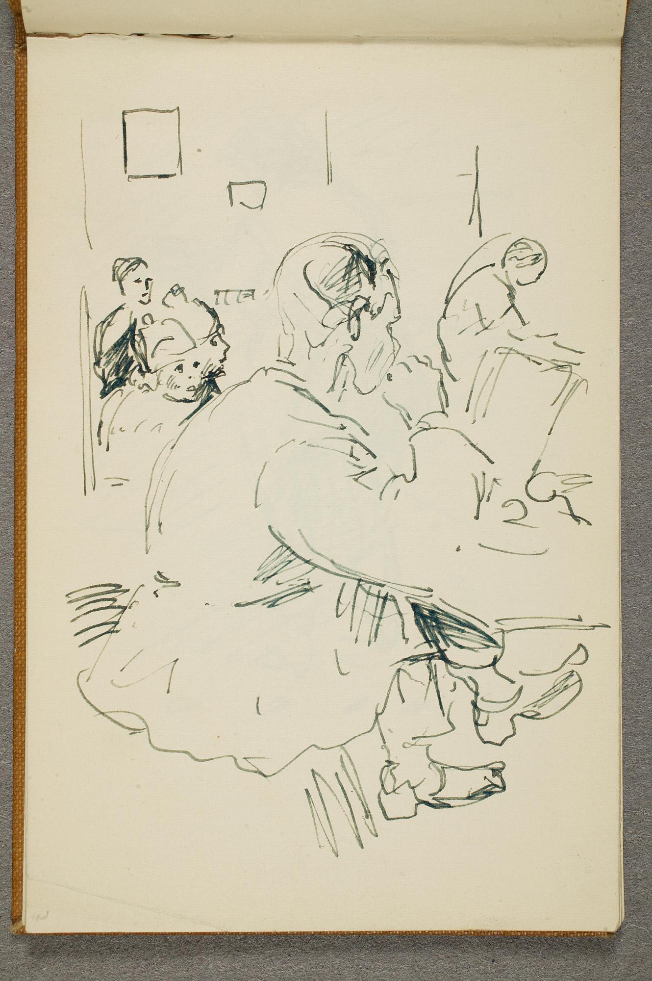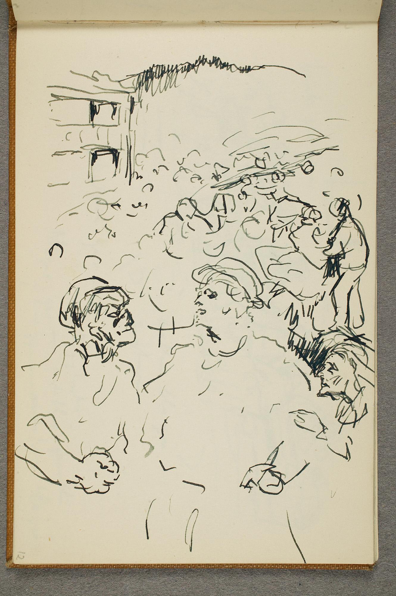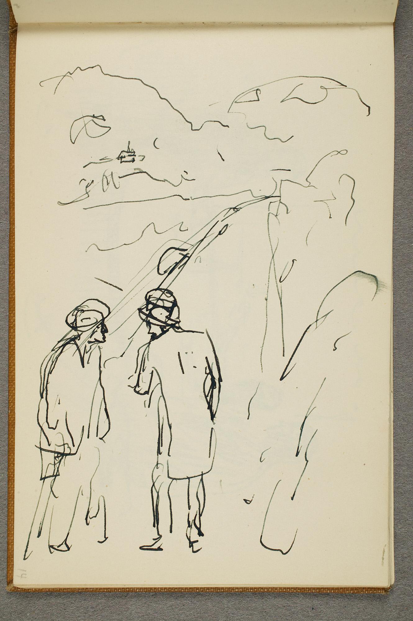 Comment:Flere notater i denne skisseboken knytter den til Munchs Italiareise i 1926. På side 24 verso er det en tegning med motiv fra Markusplassen med basilikaen i bakgrunnen. At alle tegningene er utført med penn og svart blekk gjør det sannsynlig at de er blitt til på denne reisen, med unntak av de siste to skissene, som forestiller atelier og uteatelier på Ekely. (MB)