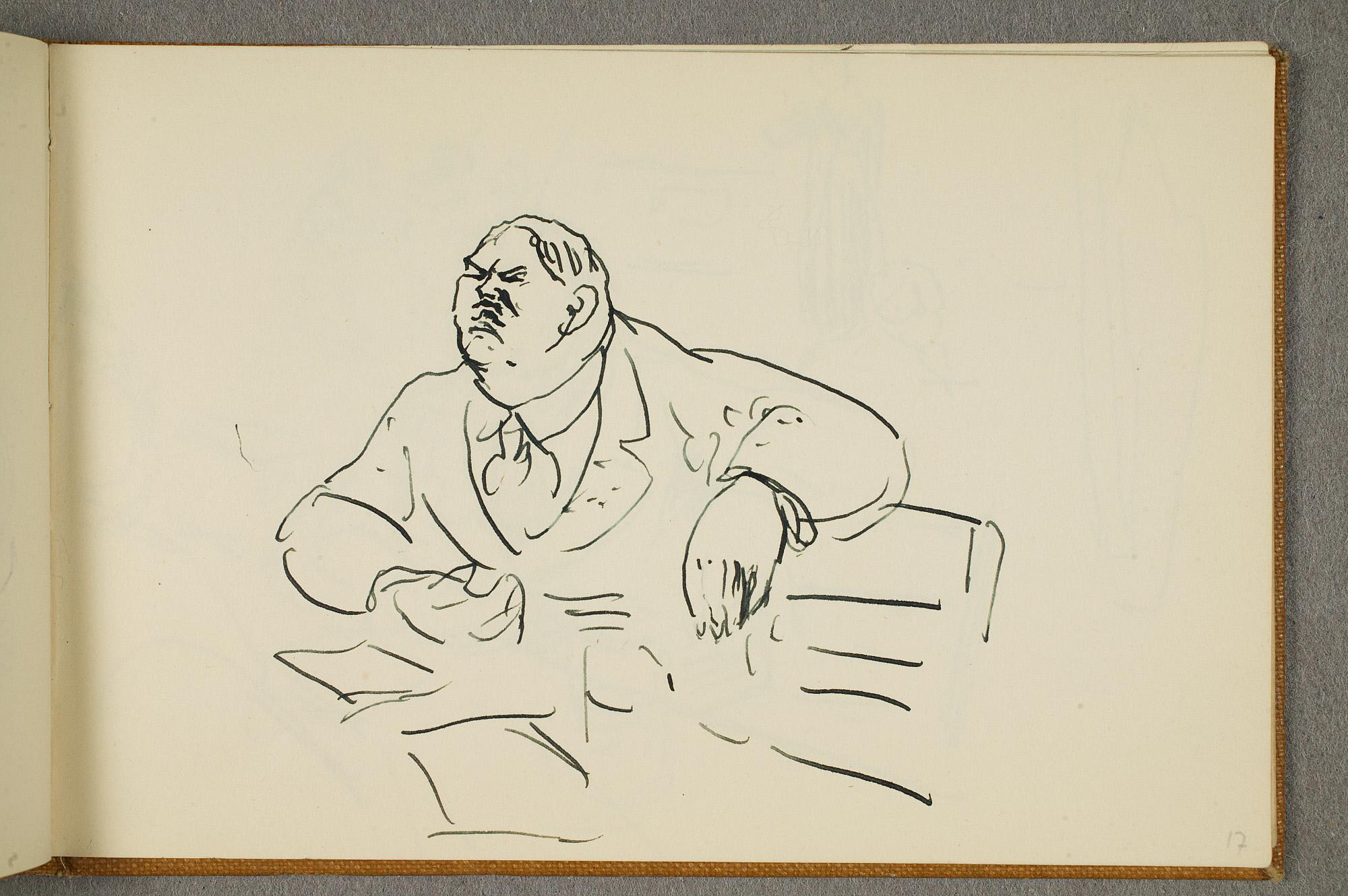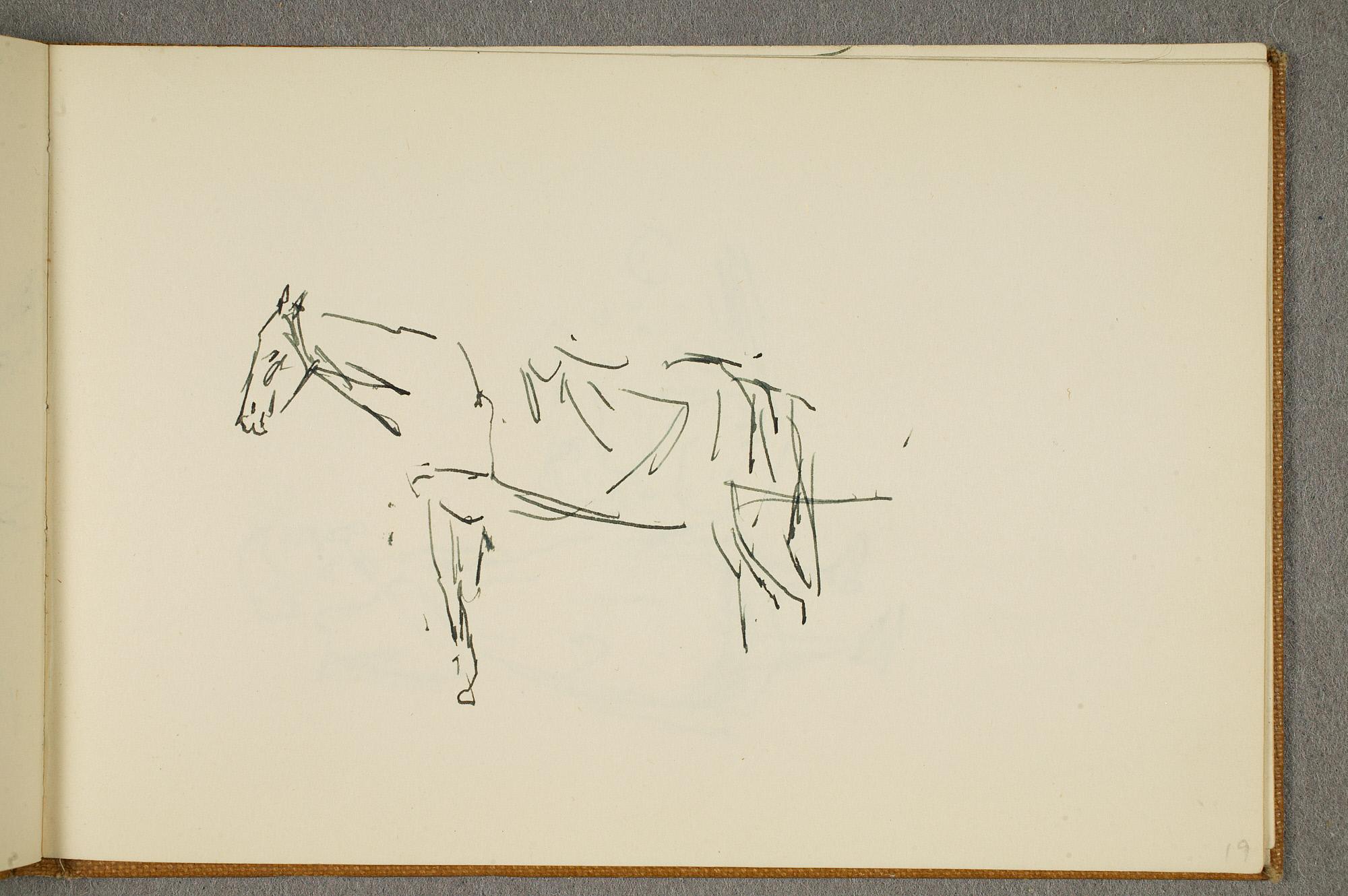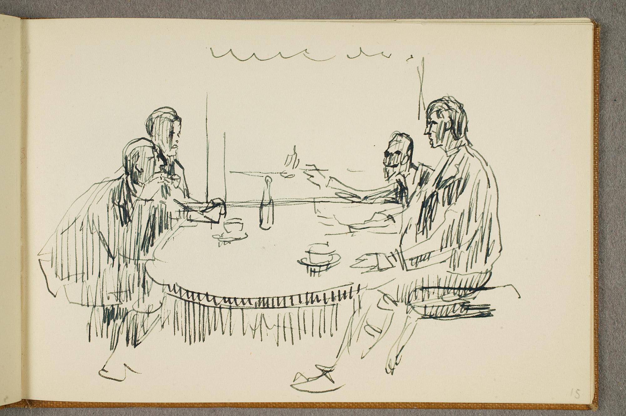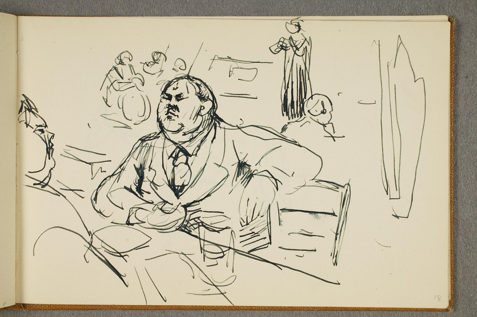 Comment:Flere notater i denne skisseboken knytter den til Munchs Italiareise i 1926. På side 24 verso er det en tegning med motiv fra Markusplassen med basilikaen i bakgrunnen. At alle tegningene er utført med penn og svart blekk gjør det sannsynlig at de er blitt til på denne reisen, med unntak av de siste to skissene, som forestiller atelier og uteatelier på Ekely. (MB)