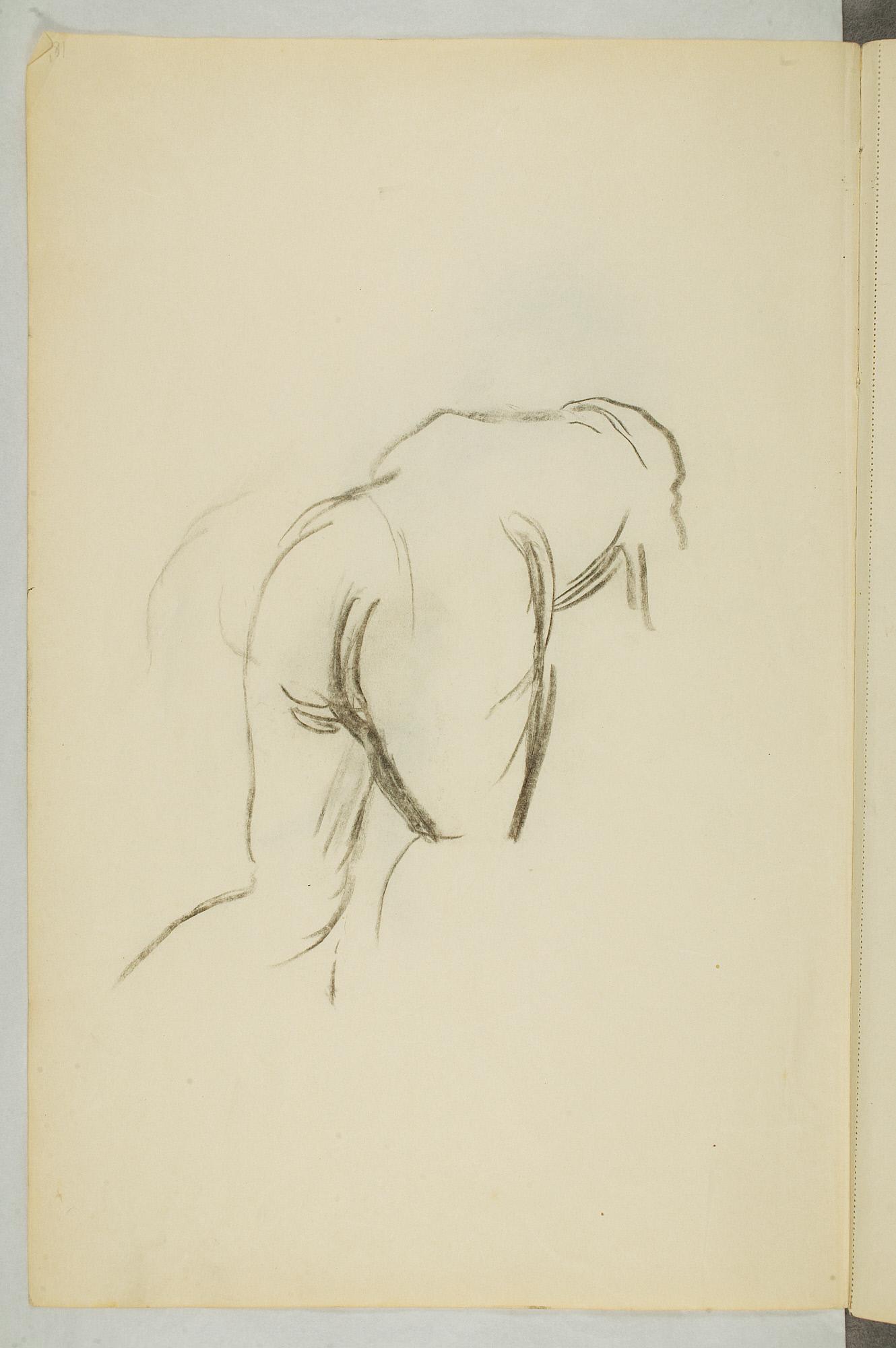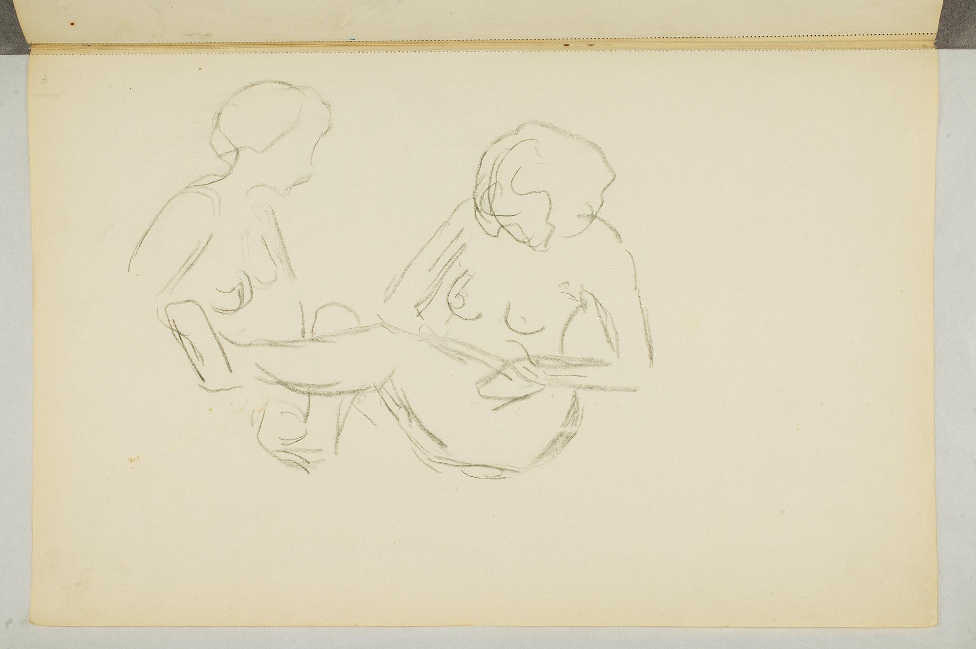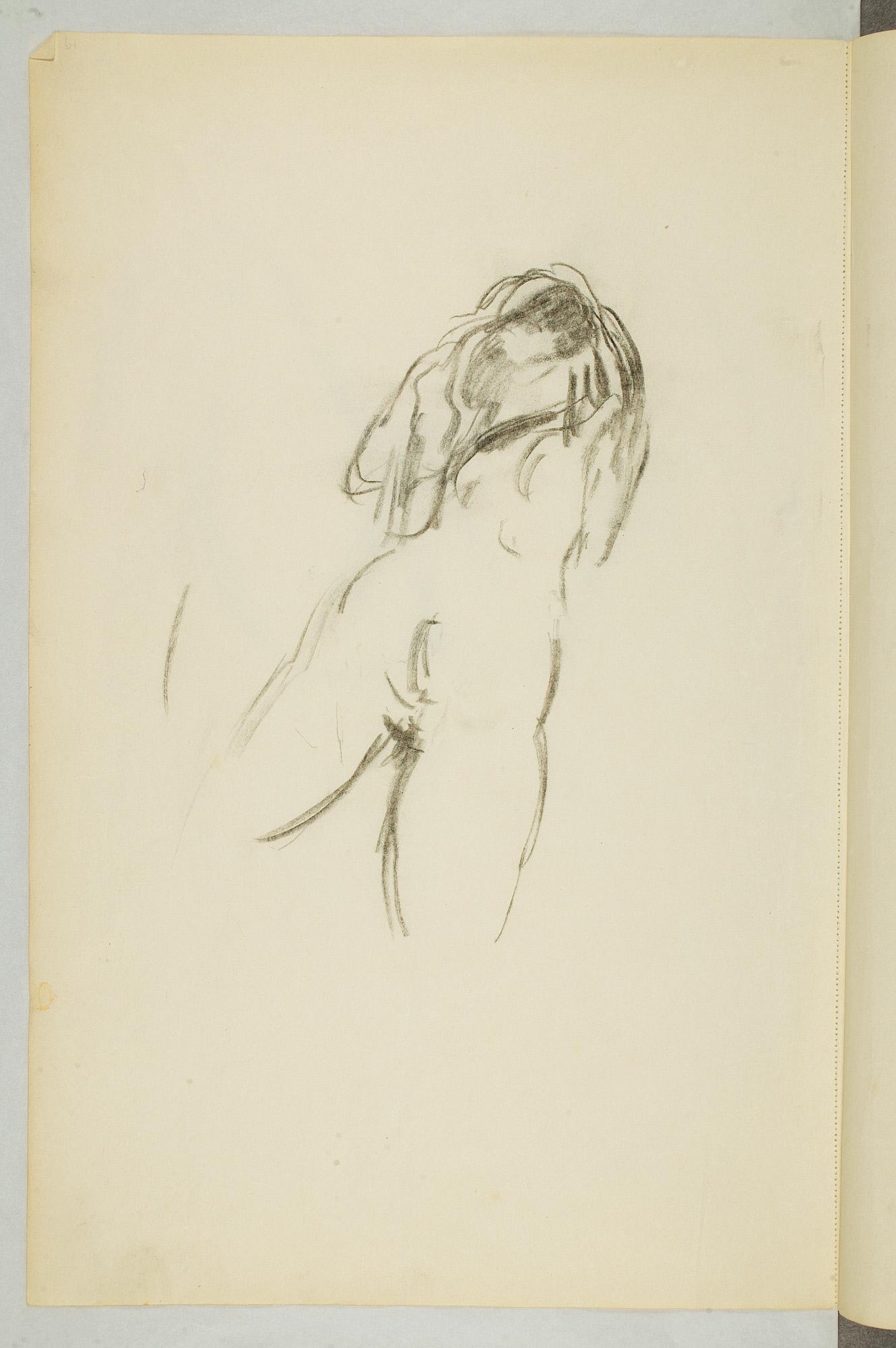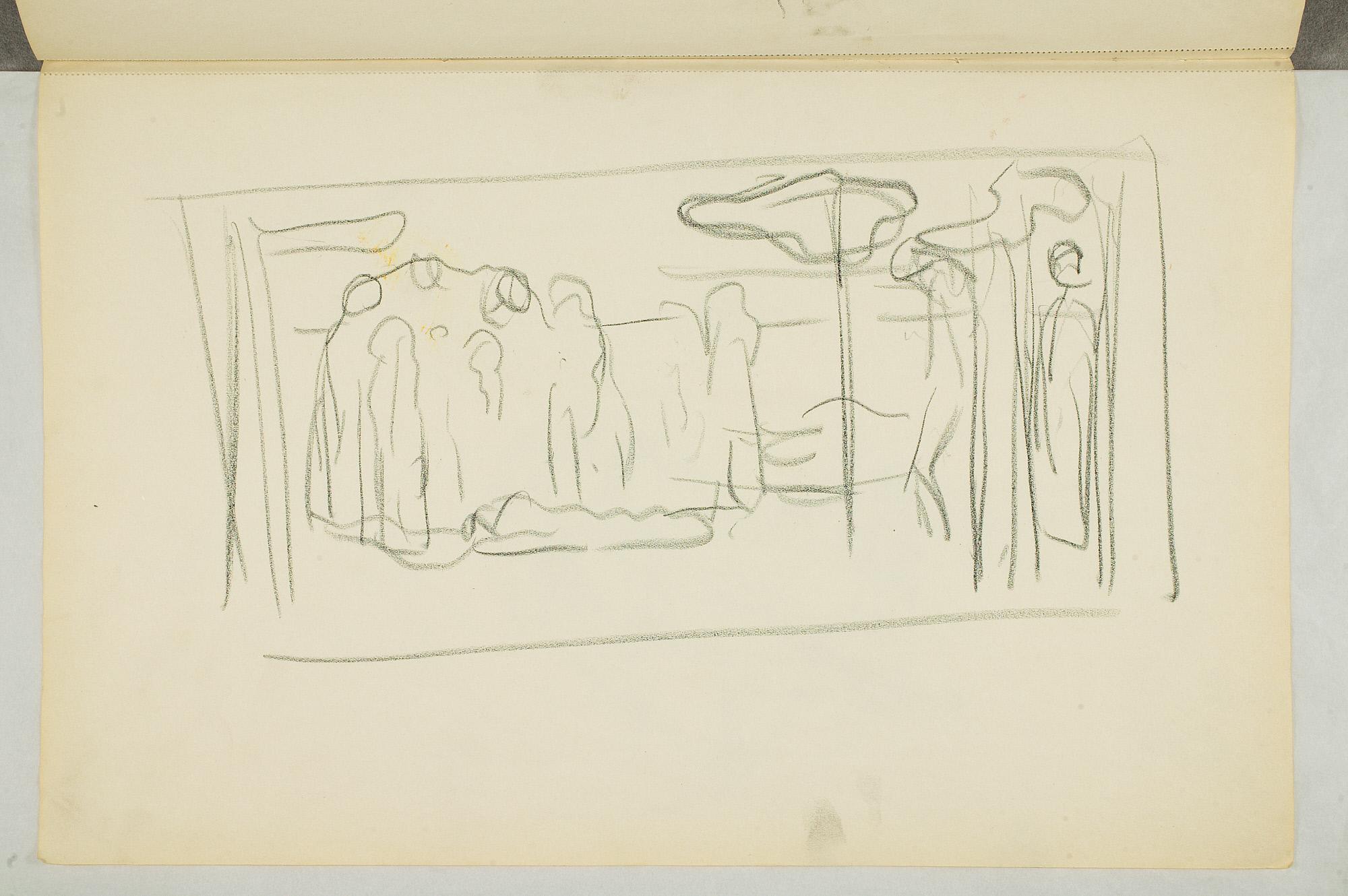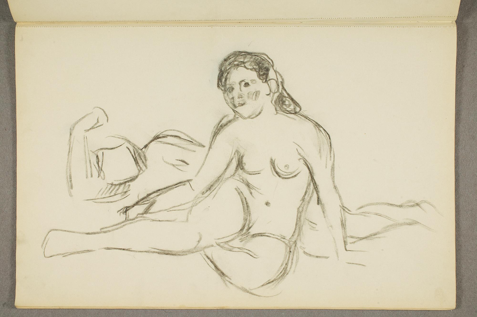 Comment:Tegningen på side 3 verso i denne skisseboken er et forarbeid til maleriet "Gammel mann med naken kvinne i fanget" (MM.M.00289) fra 1913–15, mens tegningen på side 65 verso har en klar sammenheng med de tre litografiene "Treet I", Treet II" og "Treet III" (MM.G.00382, MM.G.00444 og MM.G.00445) fra 1917. Det sannsynligs tidsspennet for boken blir da 1913–18. (MB)
