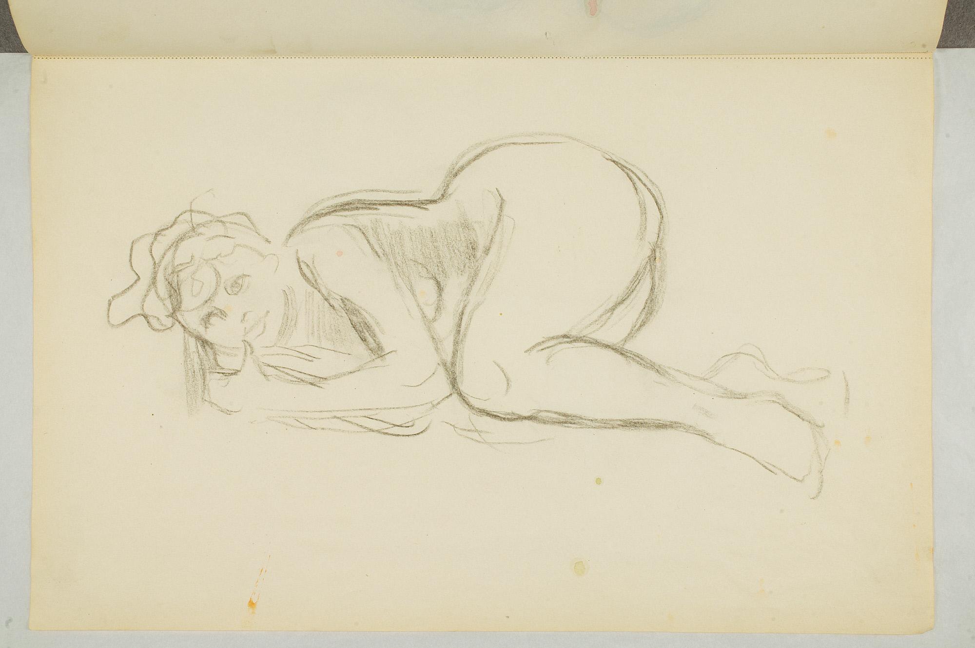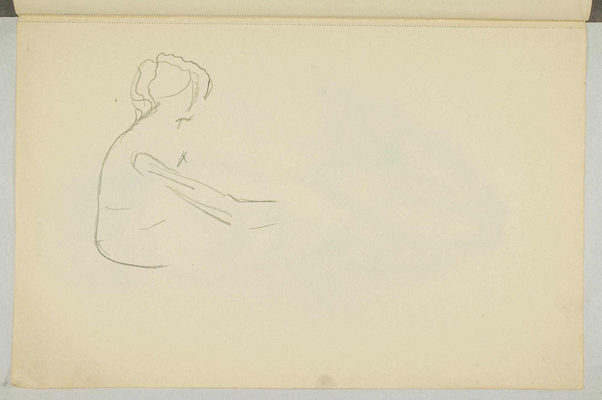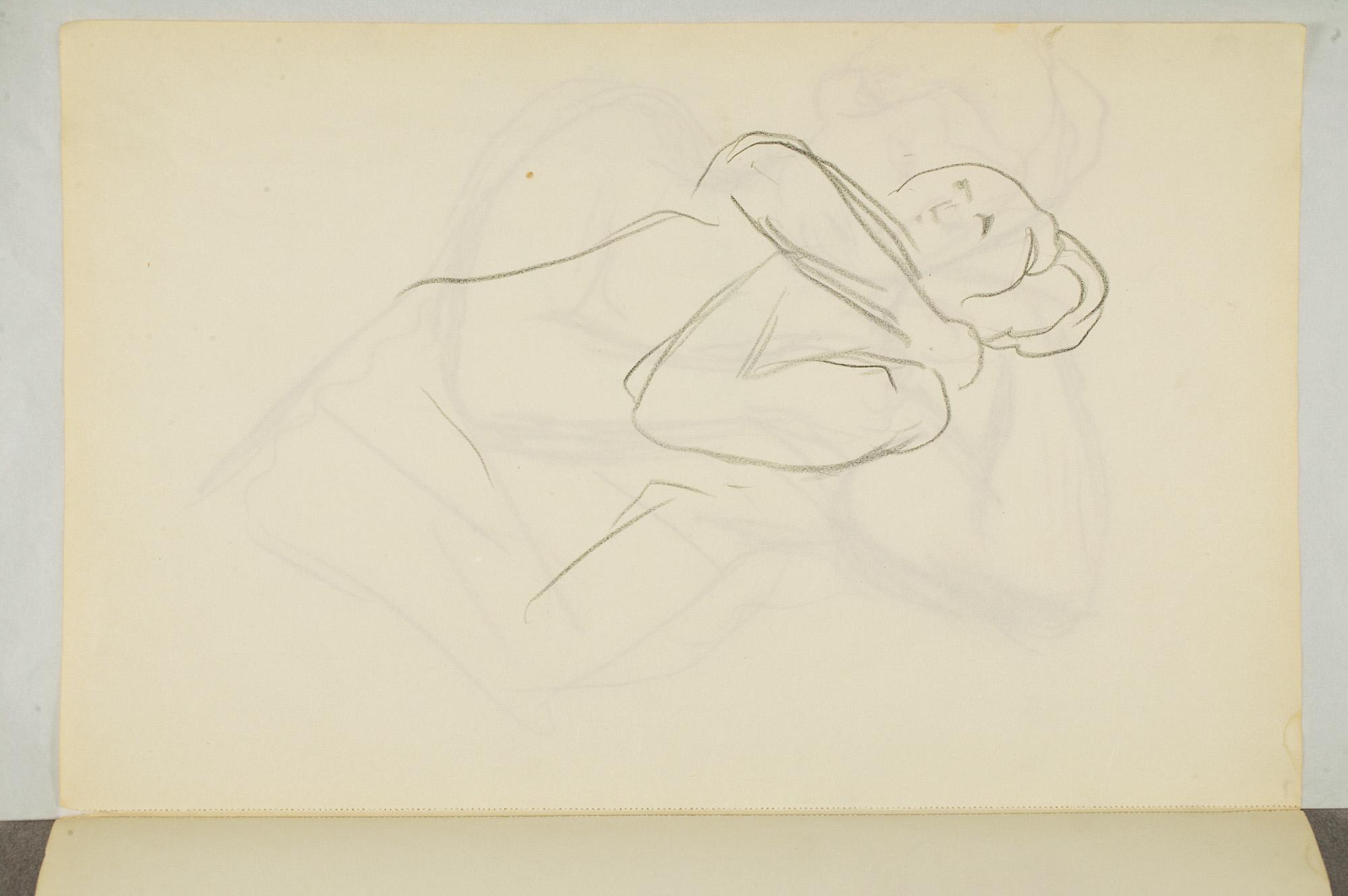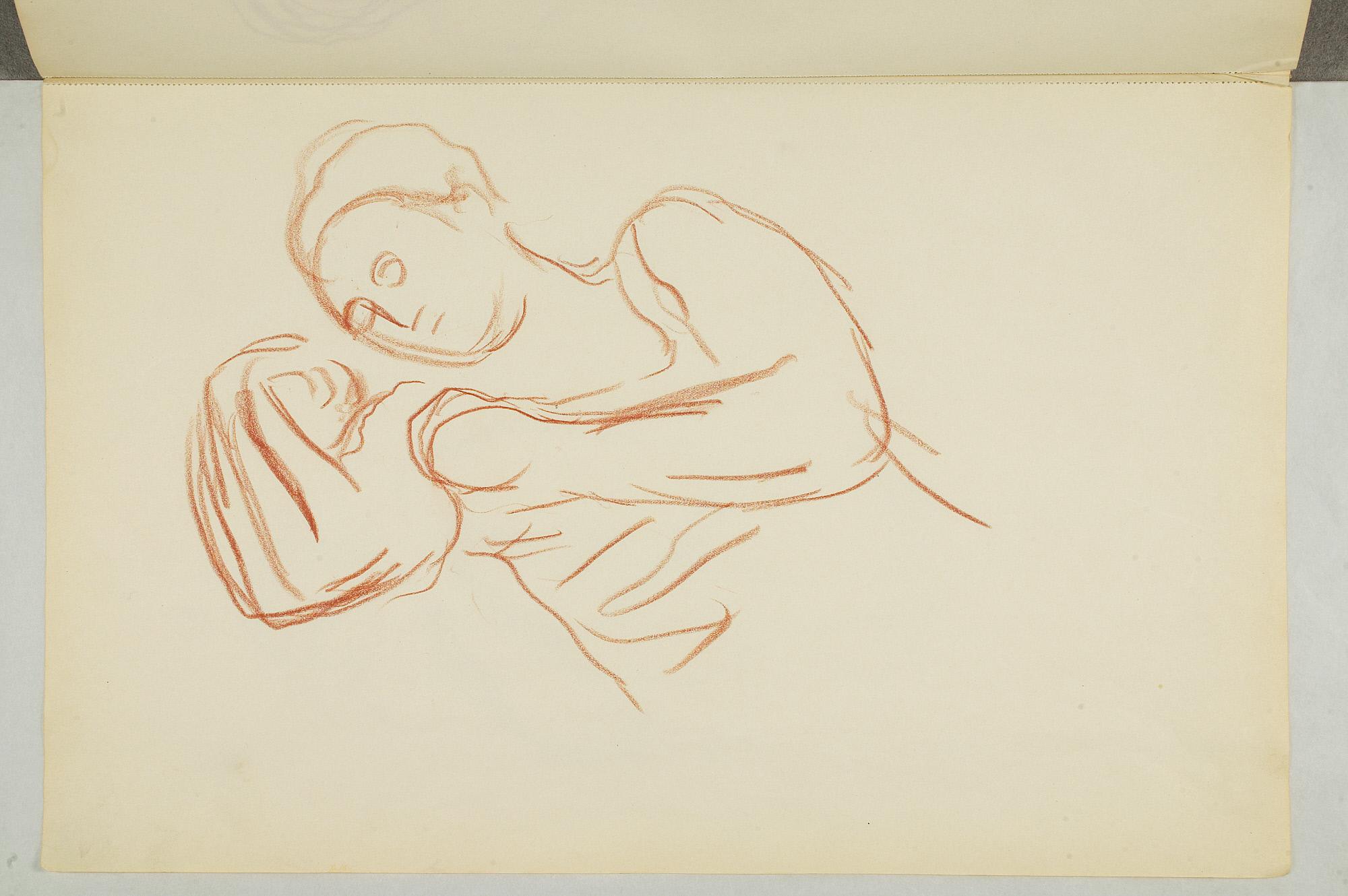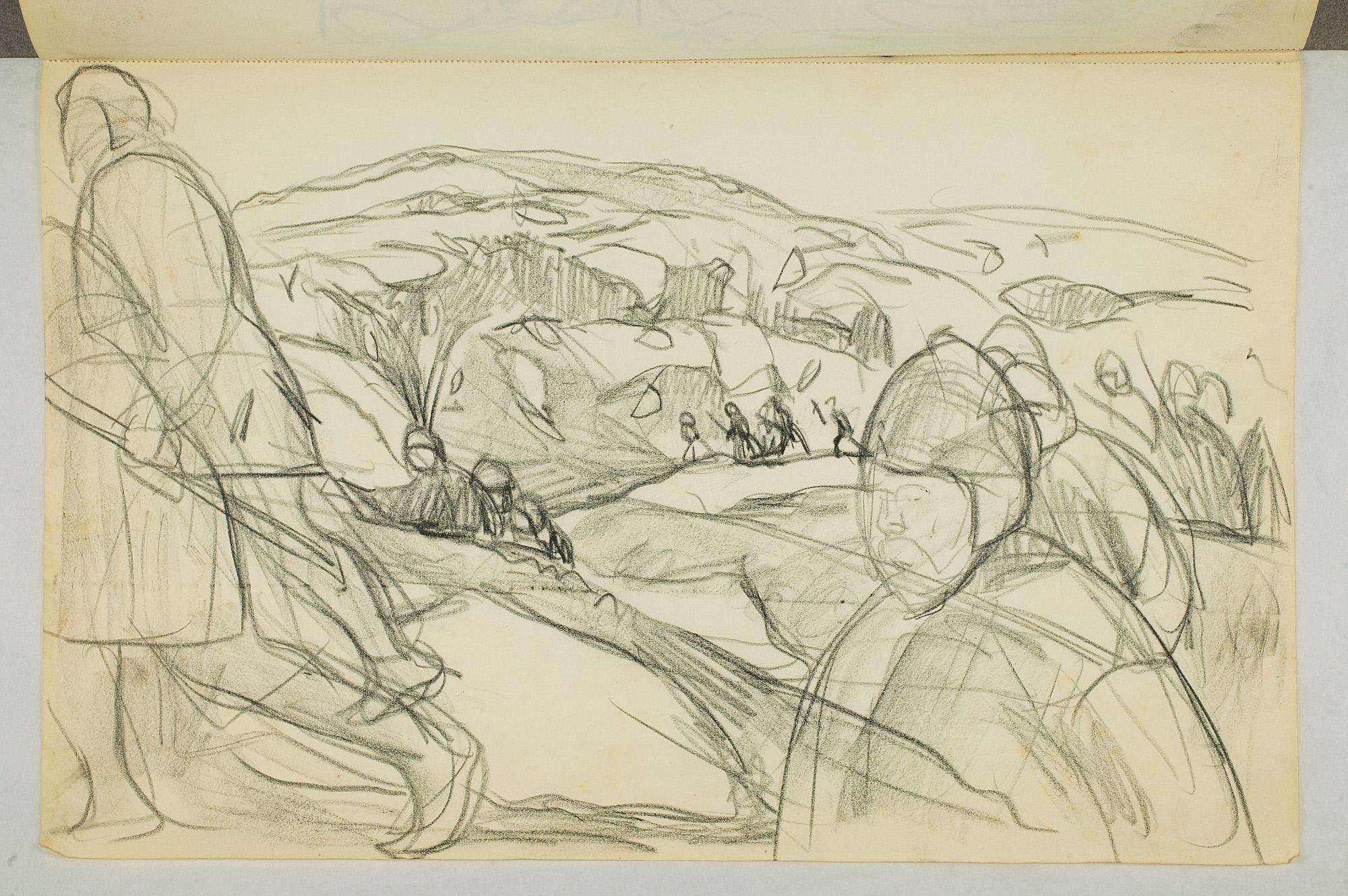 Comment:Tegningen på side 3 verso i denne skisseboken er et forarbeid til maleriet "Gammel mann med naken kvinne i fanget" (MM.M.00289) fra 1913–15, mens tegningen på side 65 verso har en klar sammenheng med de tre litografiene "Treet I", Treet II" og "Treet III" (MM.G.00382, MM.G.00444 og MM.G.00445) fra 1917. Det sannsynligs tidsspennet for boken blir da 1913–18. (MB)
