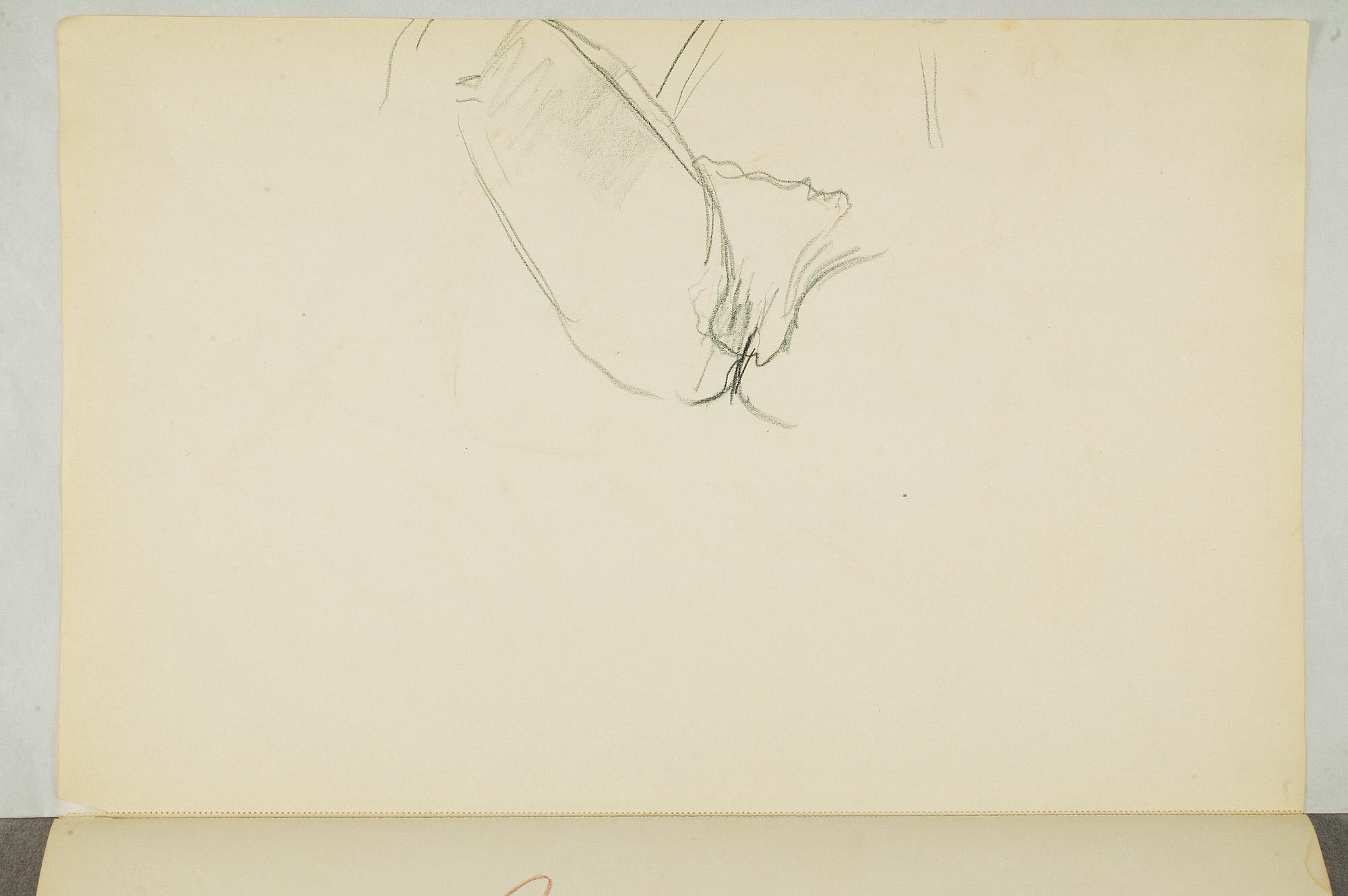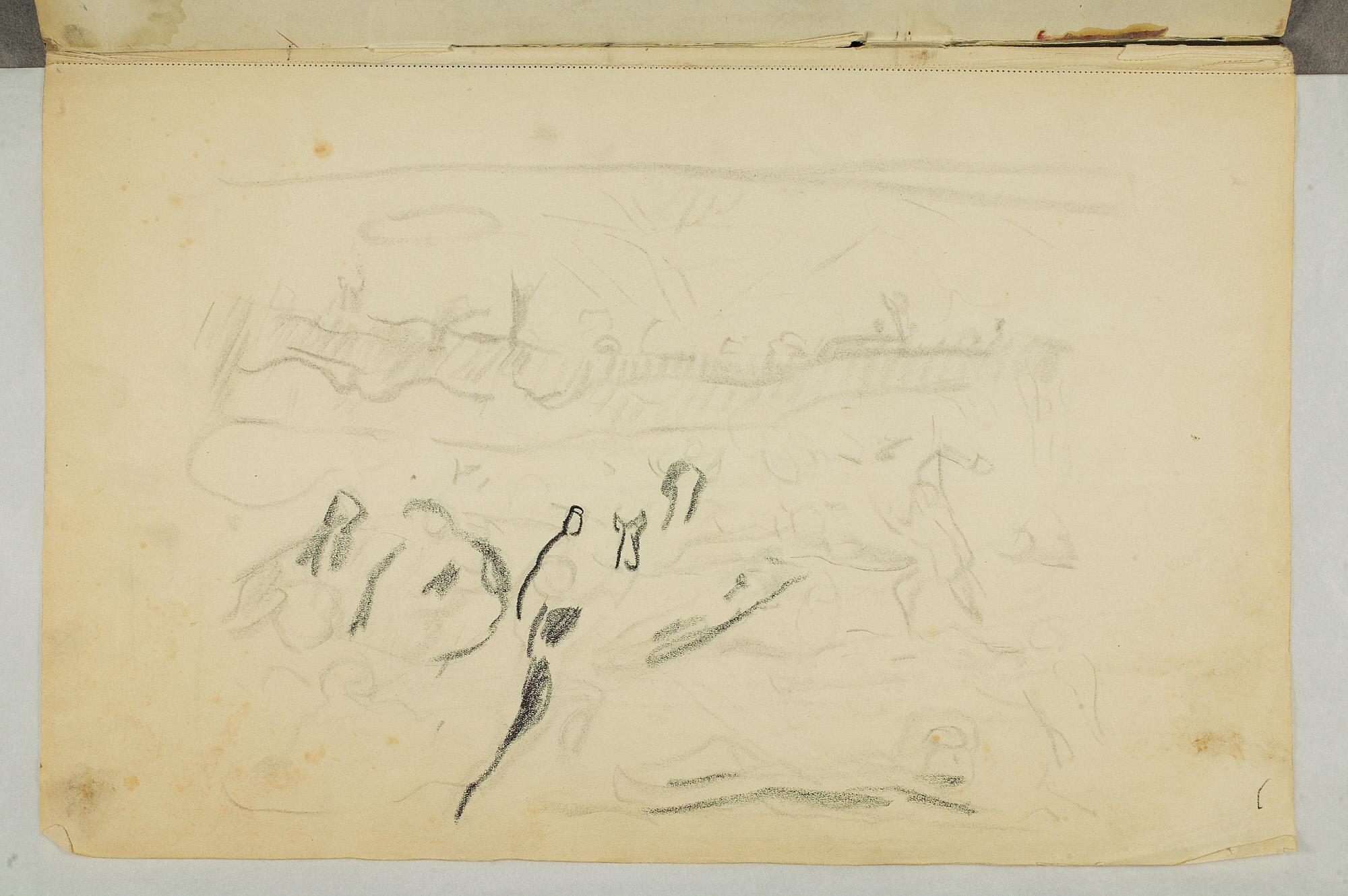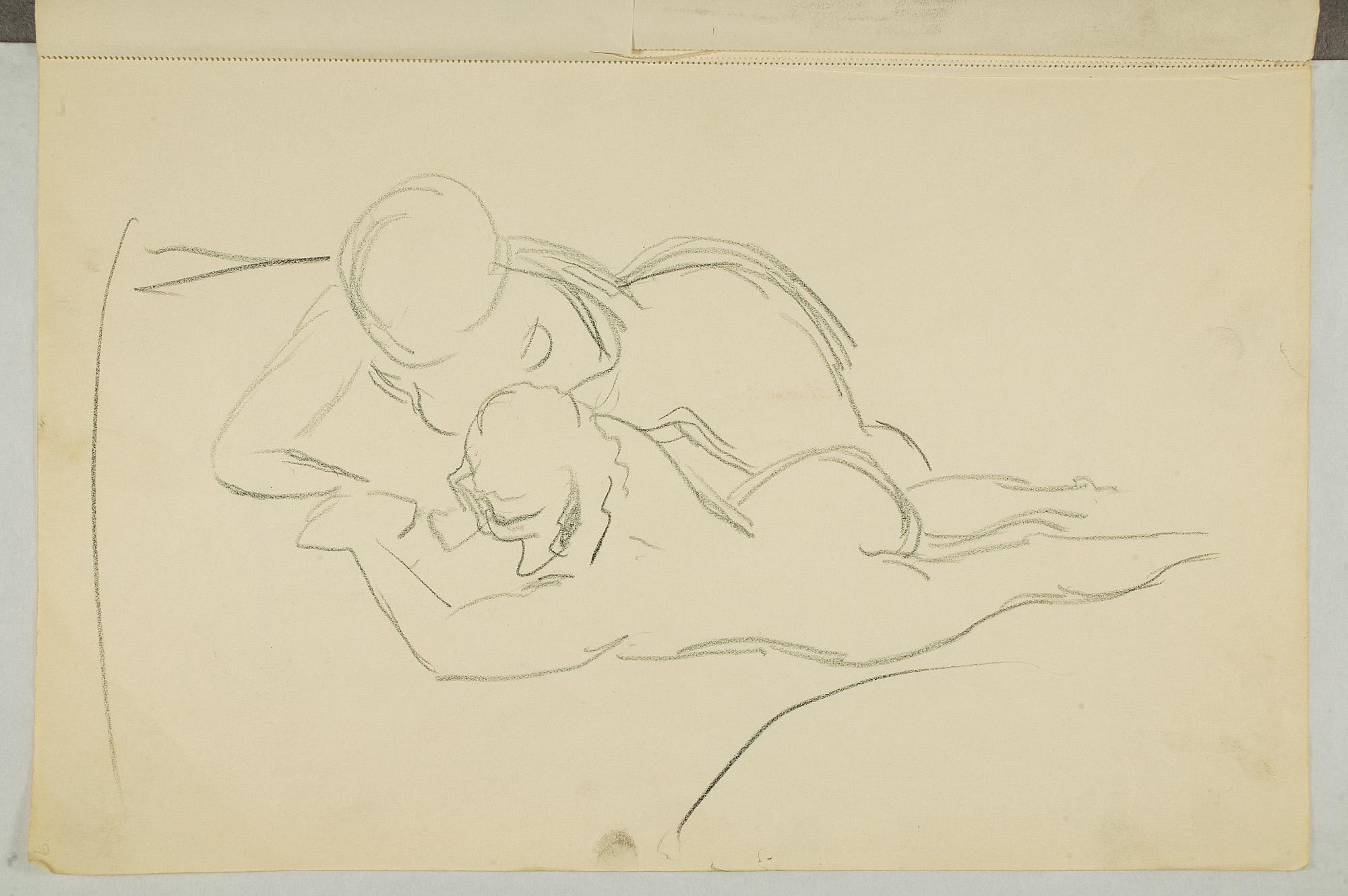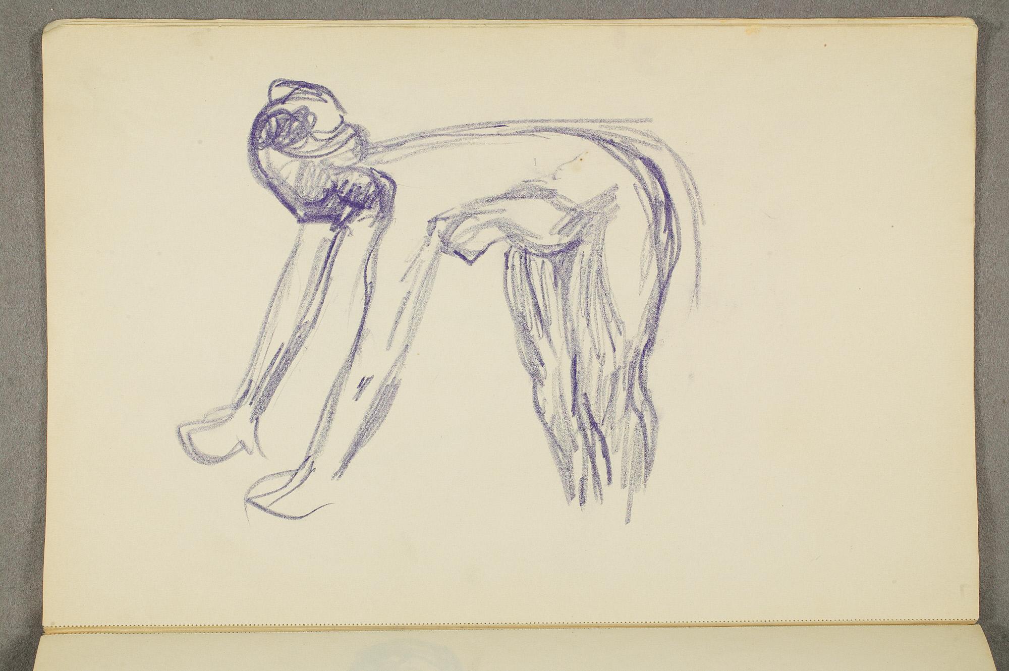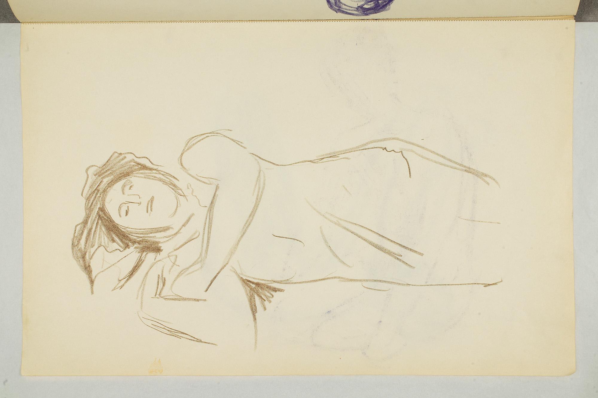 Comment:Tegningen på side 3 verso i denne skisseboken er et forarbeid til maleriet "Gammel mann med naken kvinne i fanget" (MM.M.00289) fra 1913–15, mens tegningen på side 65 verso har en klar sammenheng med de tre litografiene "Treet I", Treet II" og "Treet III" (MM.G.00382, MM.G.00444 og MM.G.00445) fra 1917. Det sannsynligs tidsspennet for boken blir da 1913–18. (MB)
