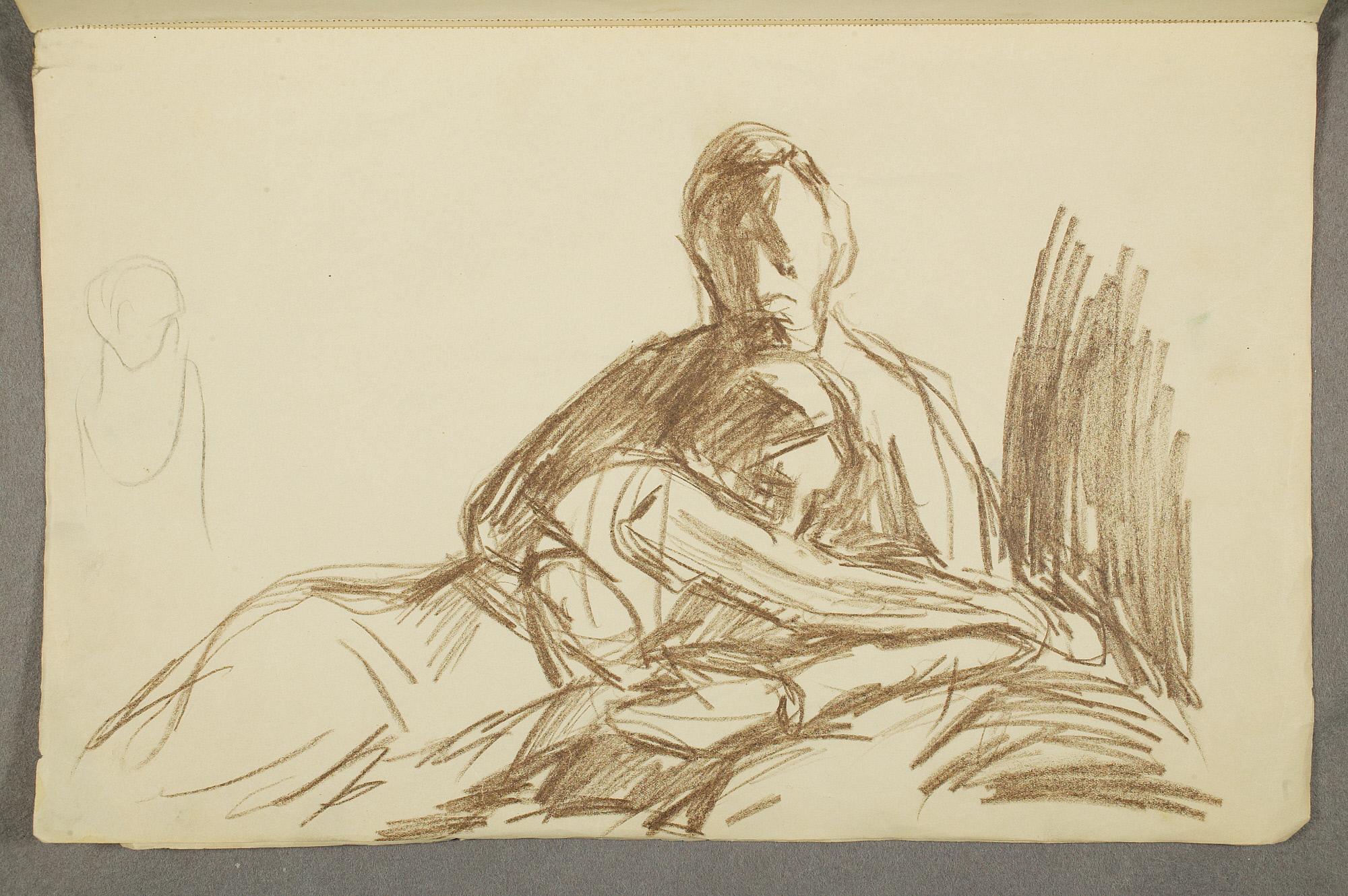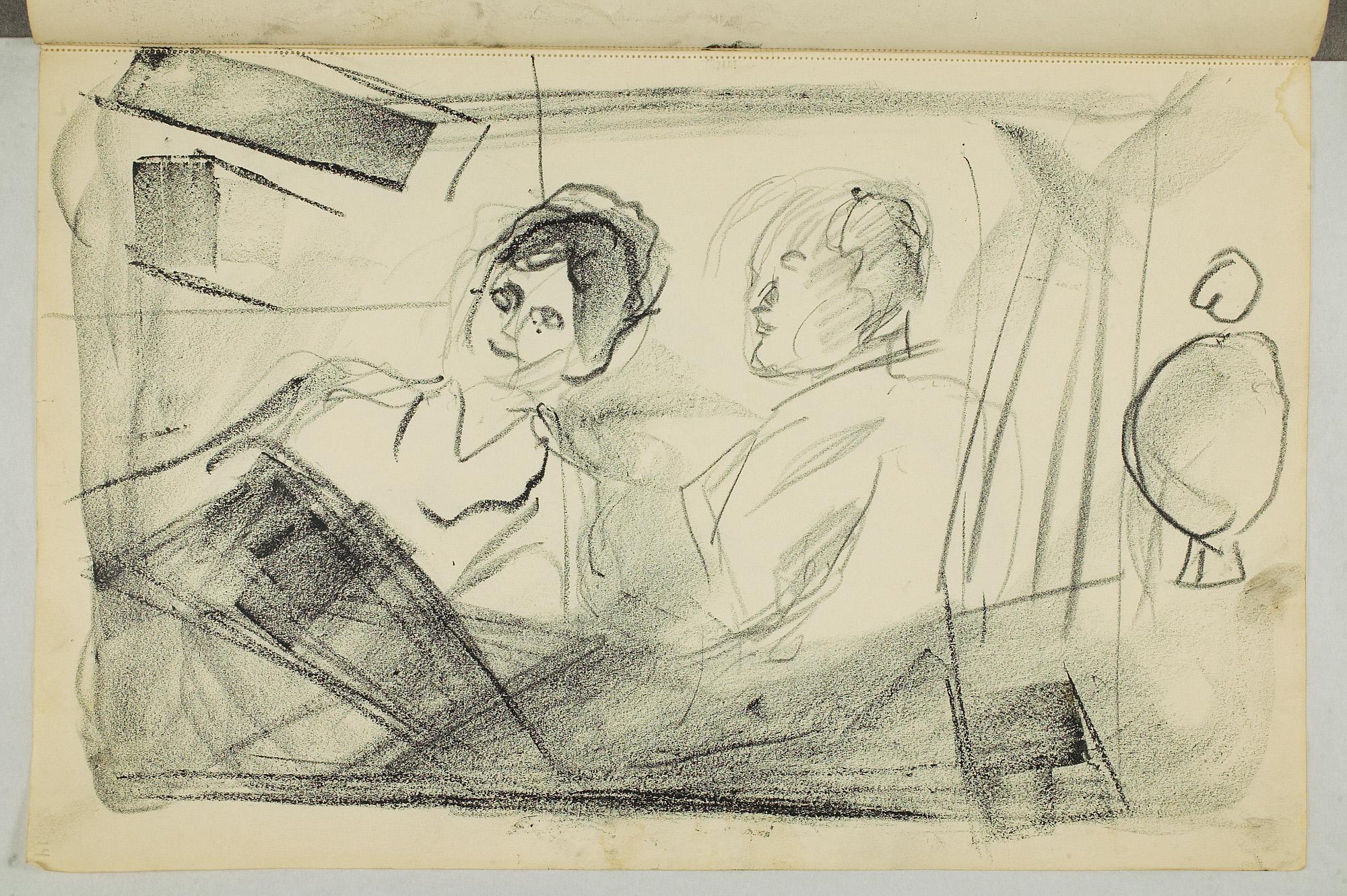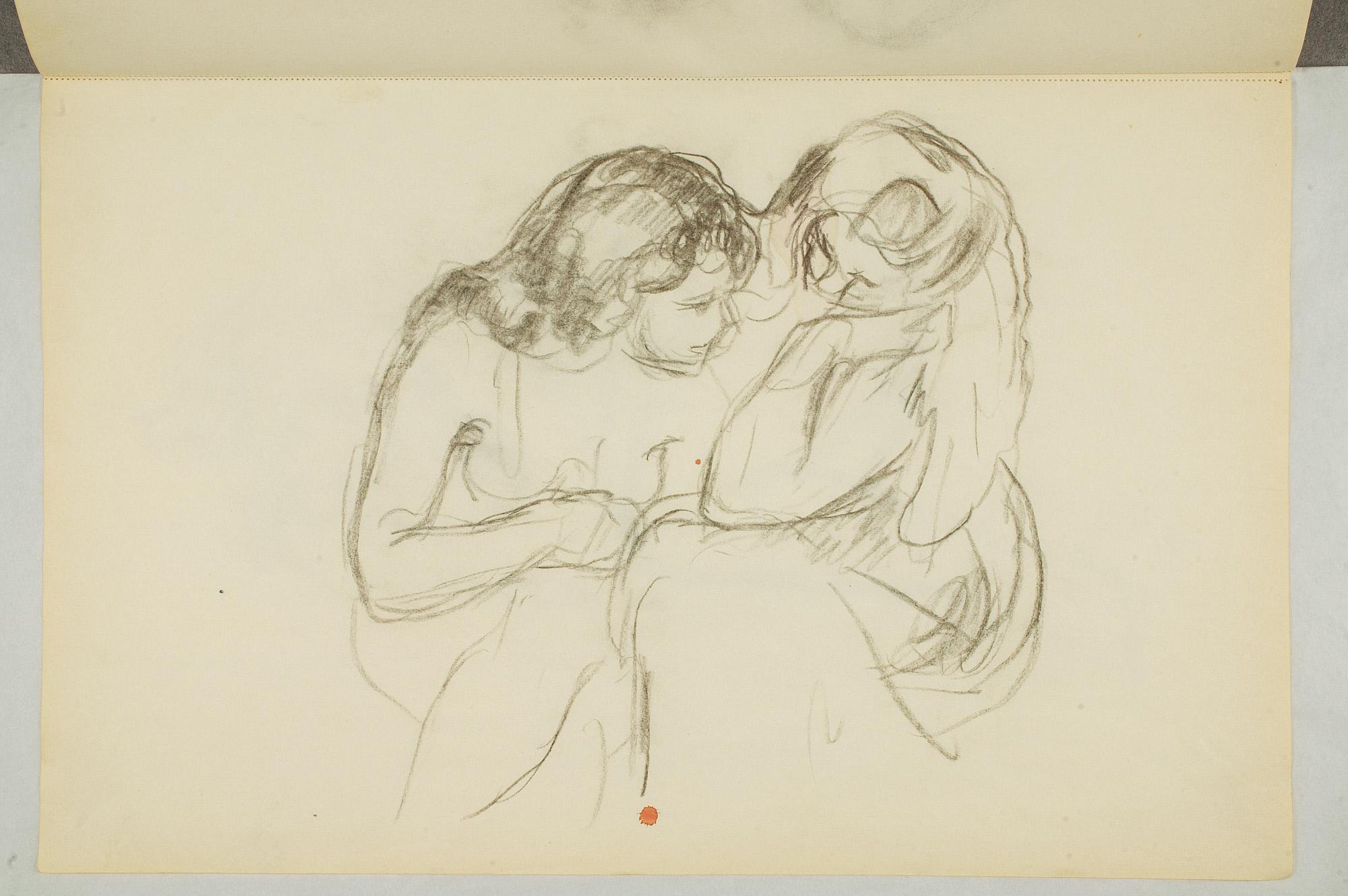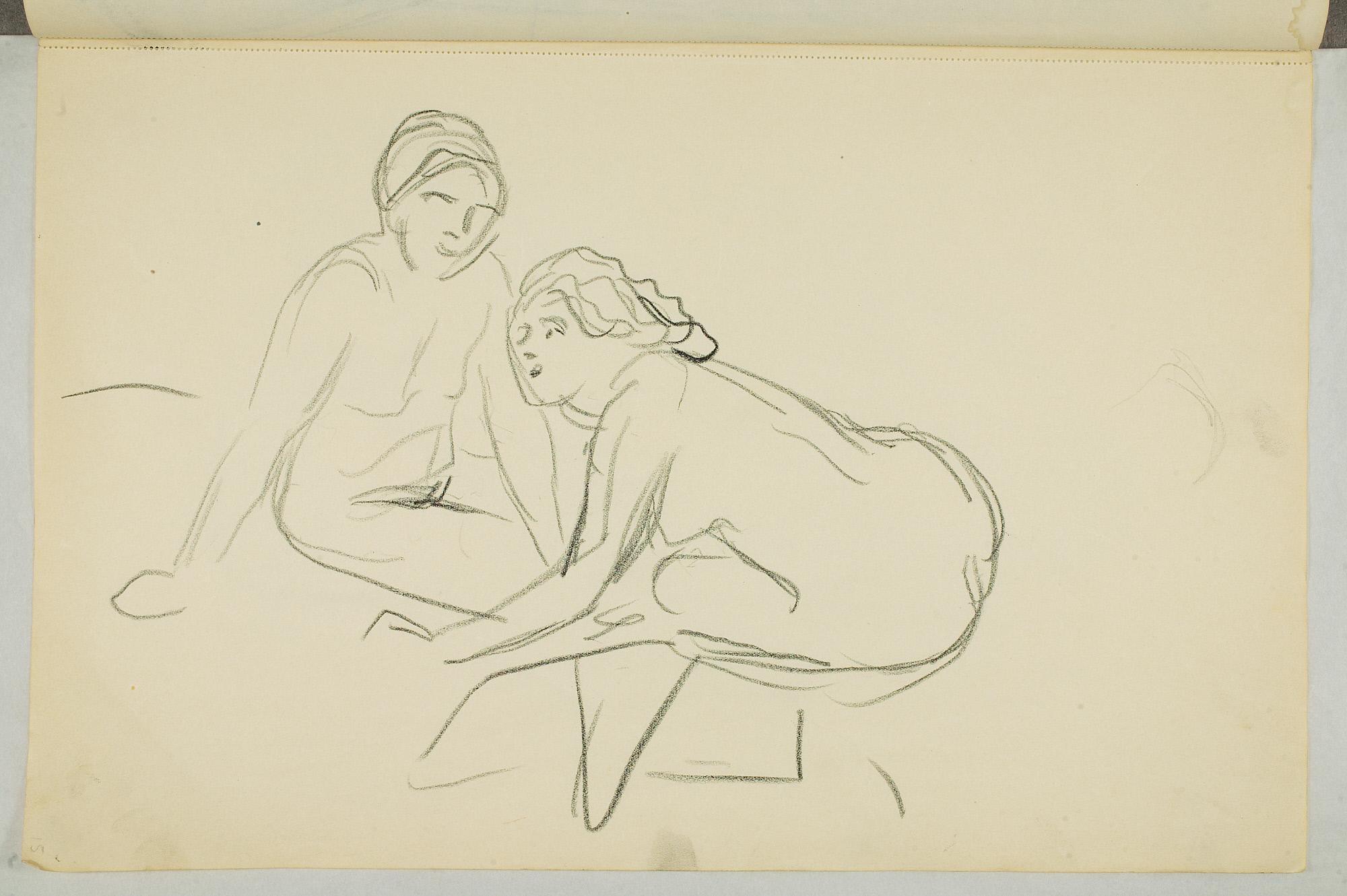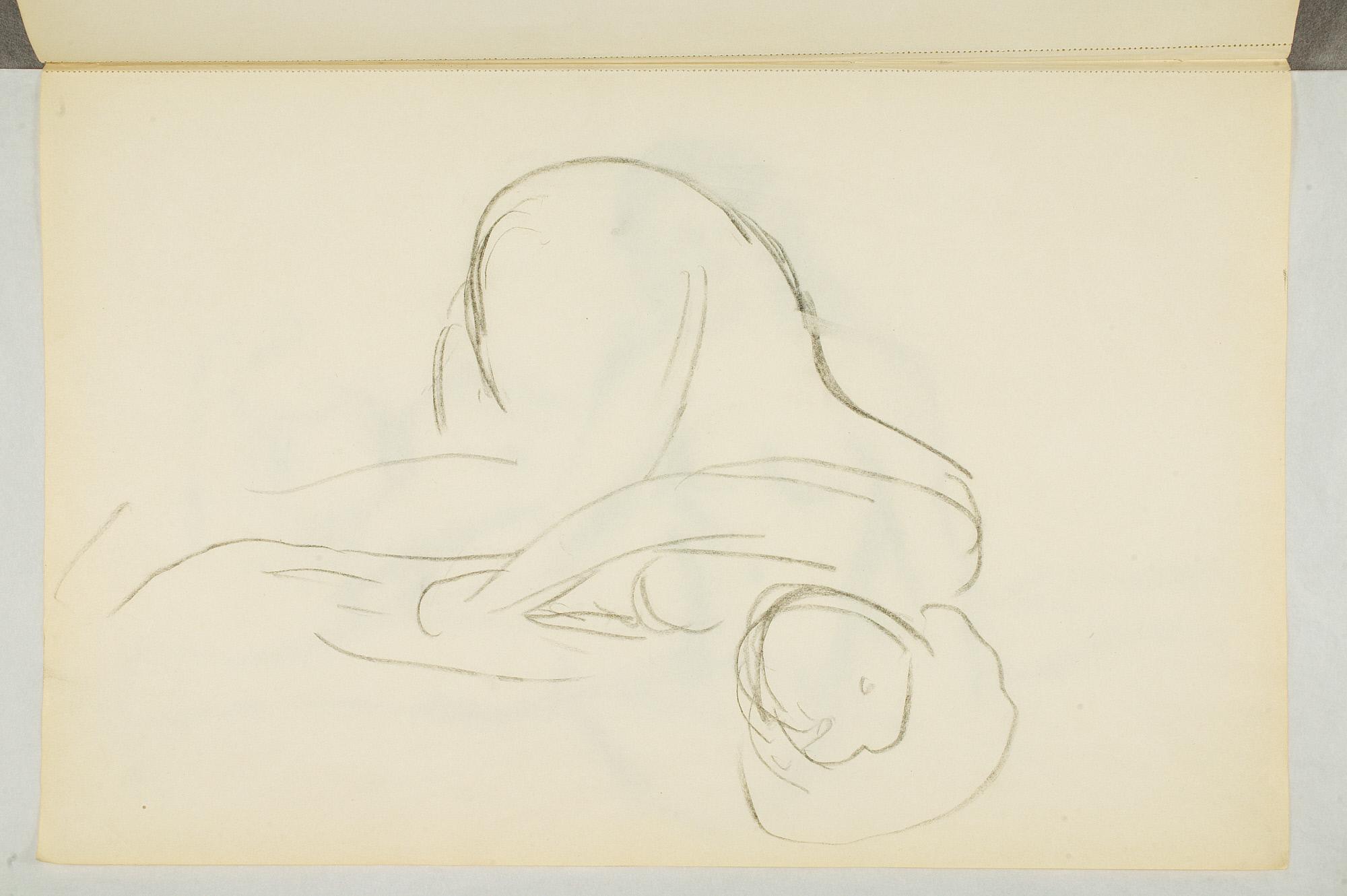 Comment:Tegningen på side 3 verso i denne skisseboken er et forarbeid til maleriet "Gammel mann med naken kvinne i fanget" (MM.M.00289) fra 1913–15, mens tegningen på side 65 verso har en klar sammenheng med de tre litografiene "Treet I", Treet II" og "Treet III" (MM.G.00382, MM.G.00444 og MM.G.00445) fra 1917. Det sannsynligs tidsspennet for boken blir da 1913–18. (MB)
