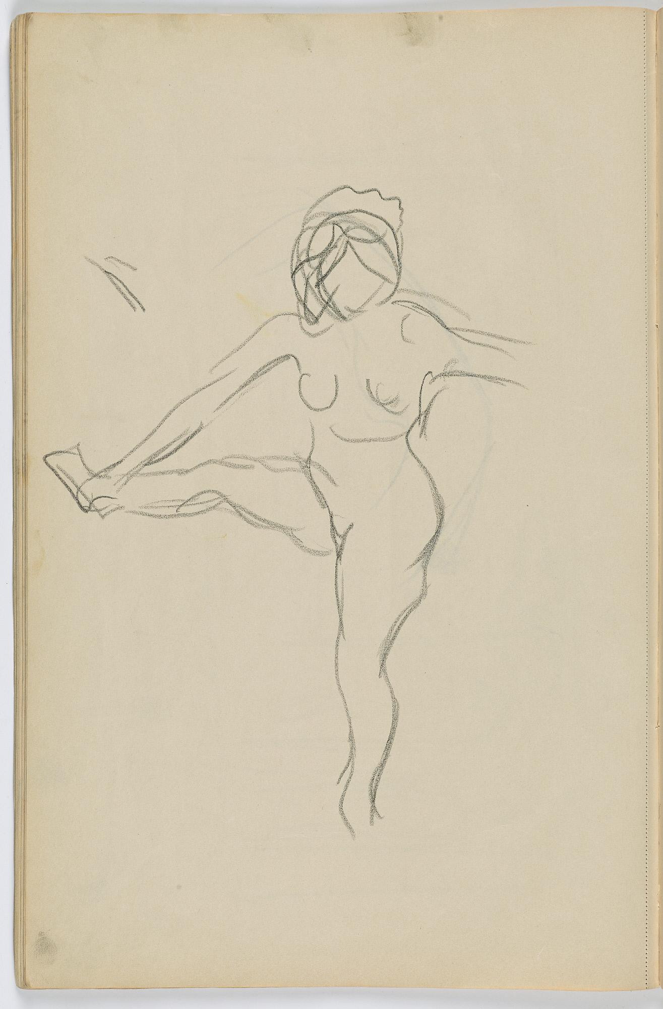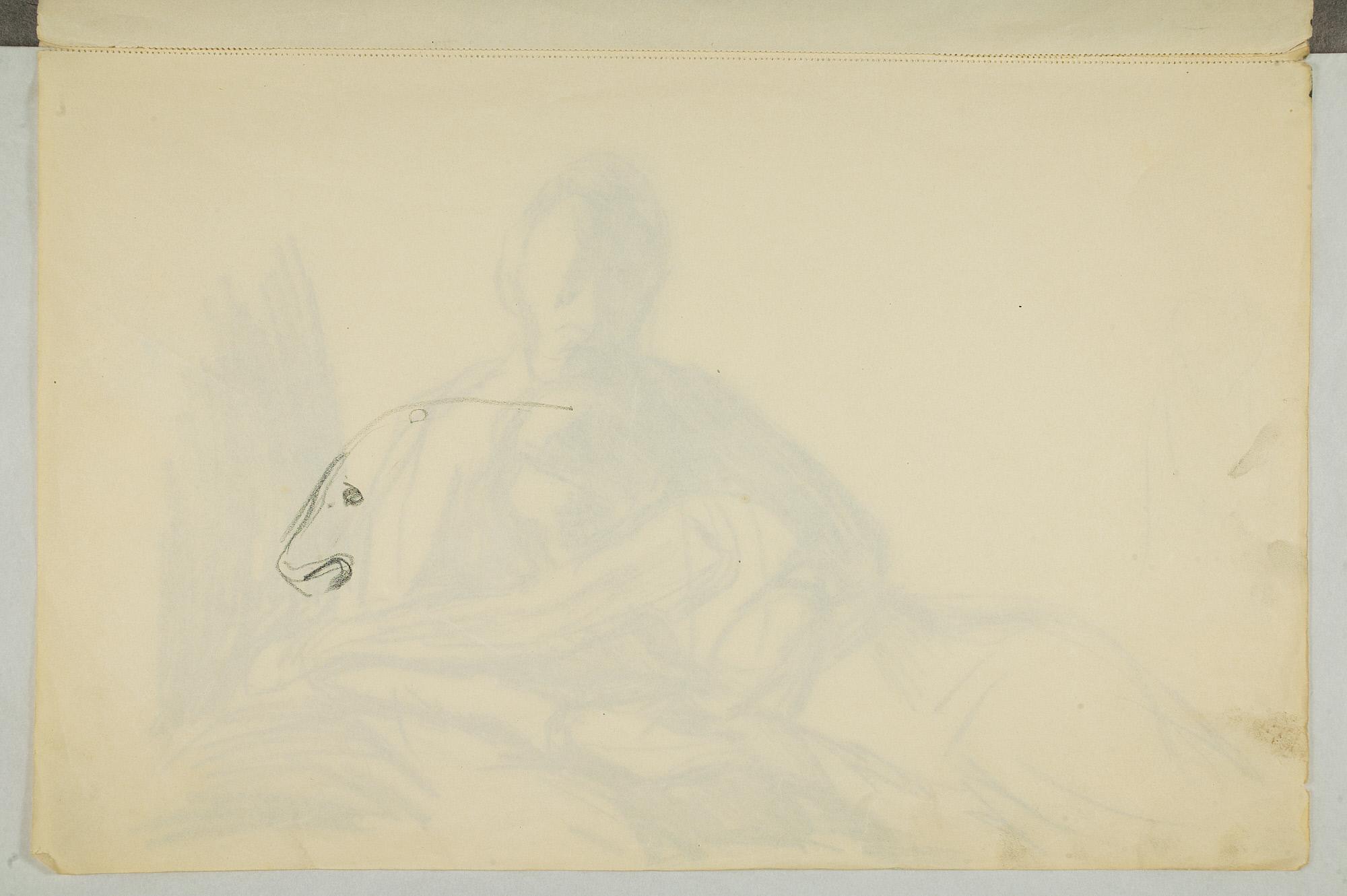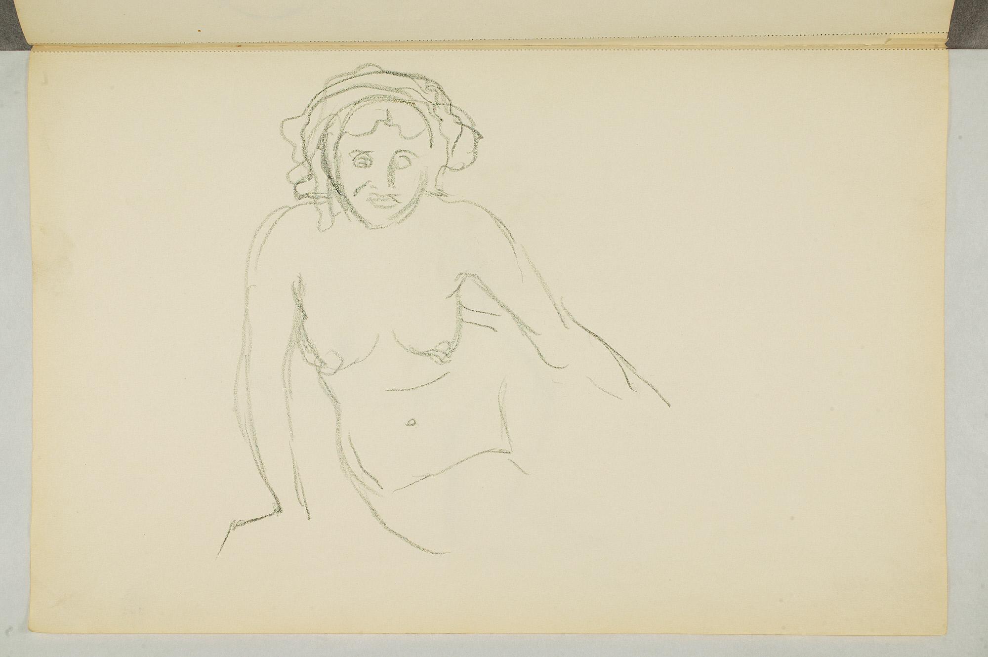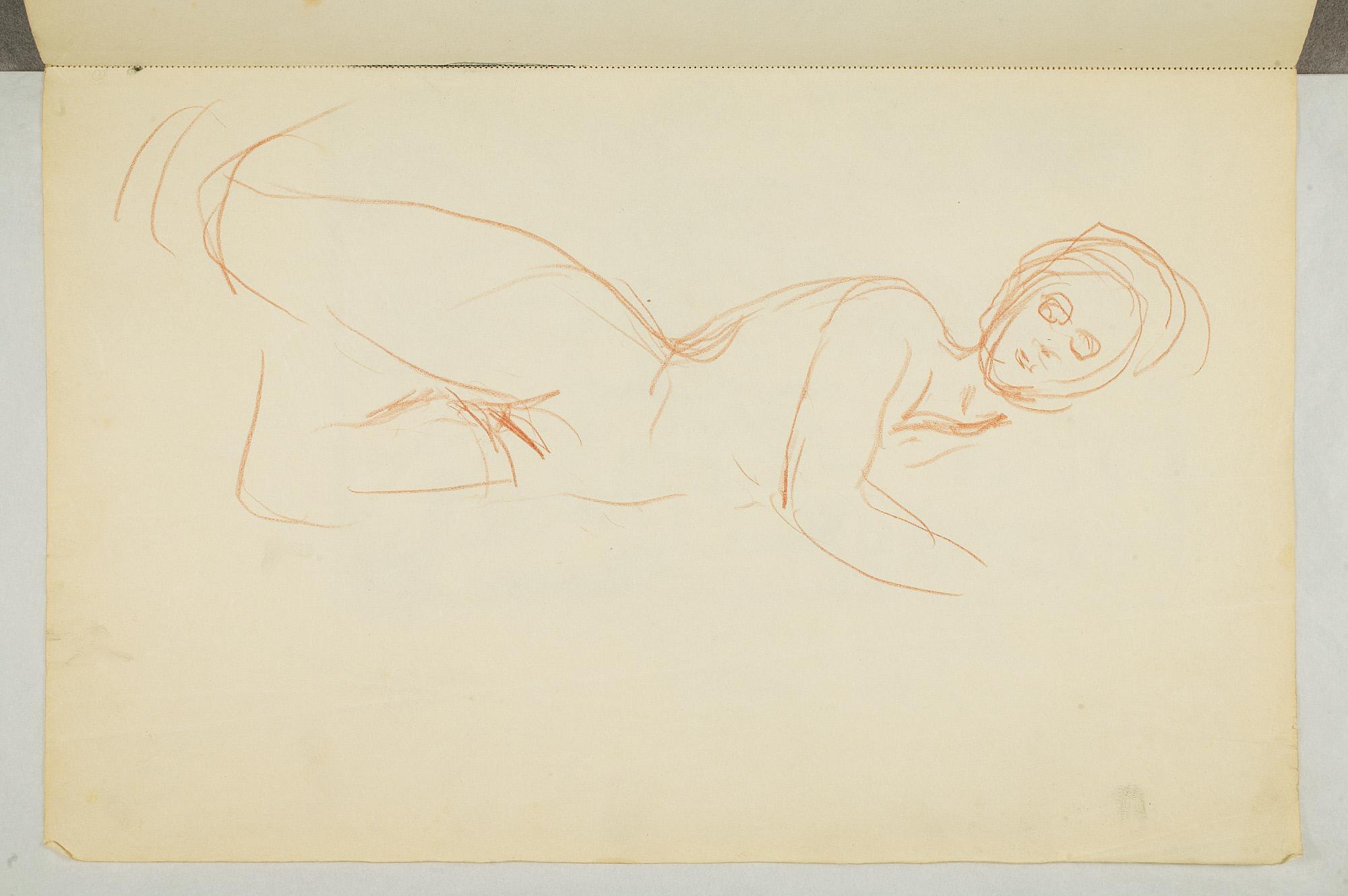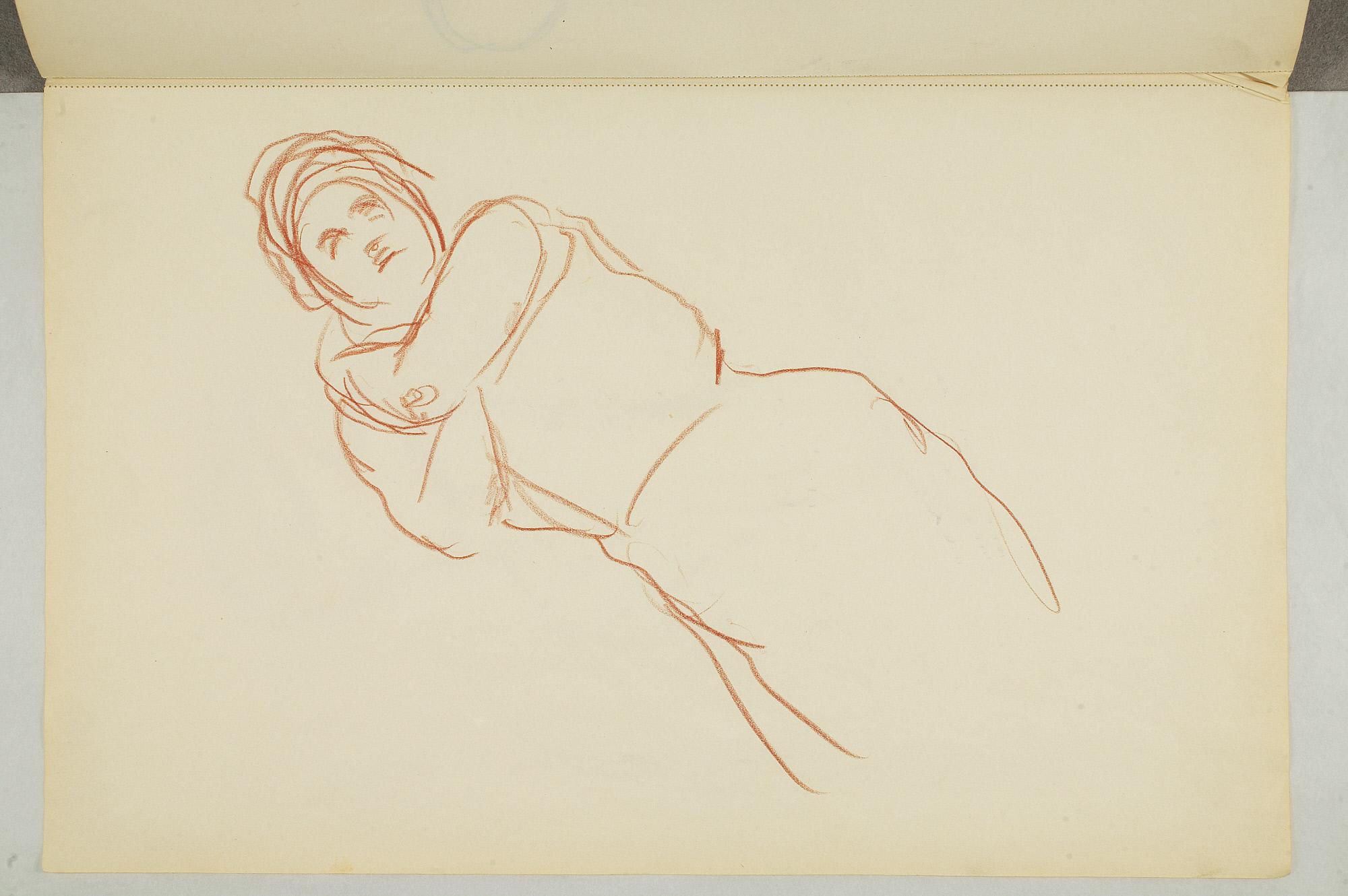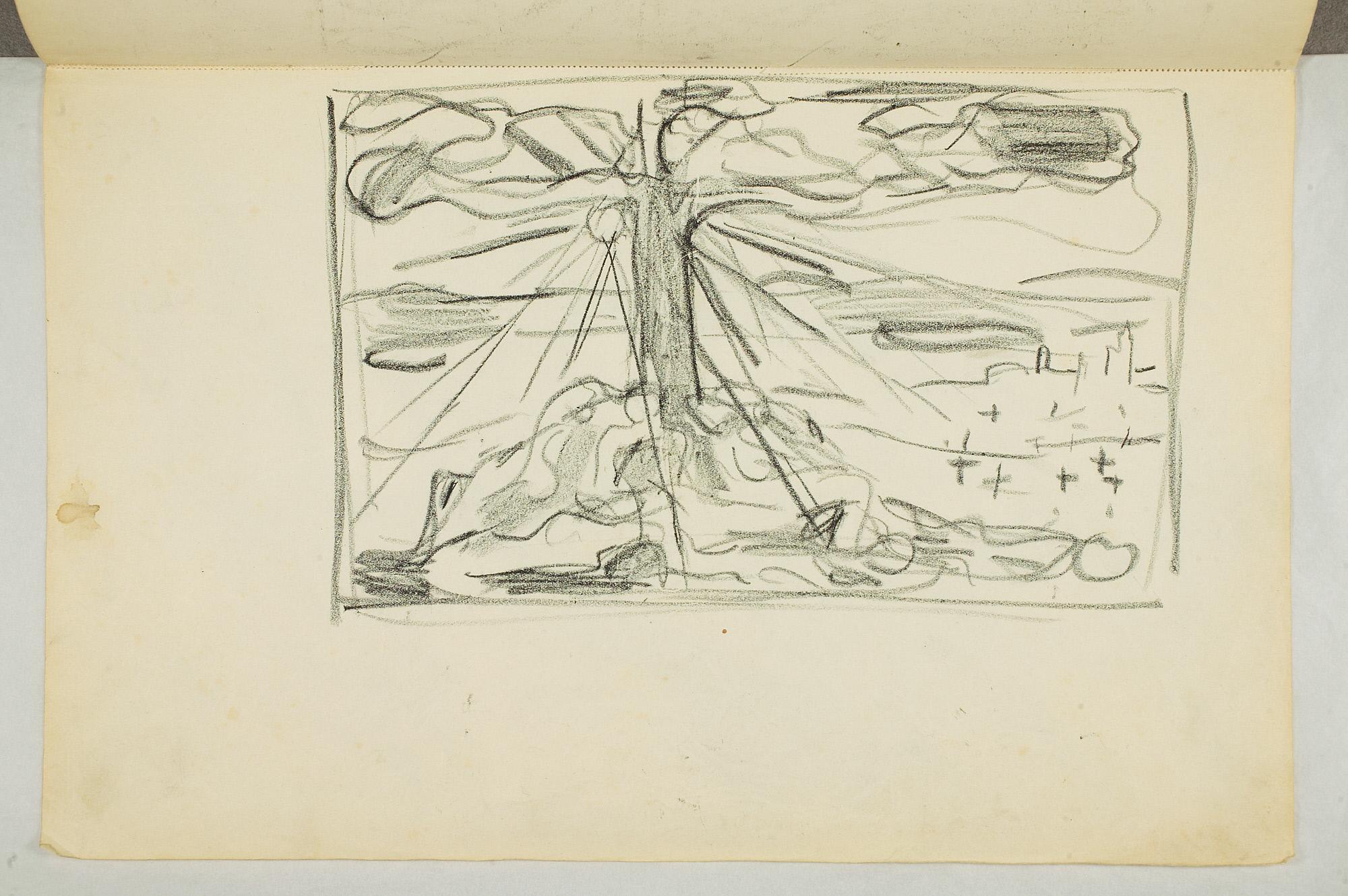 Comment:Tegningen på side 3 verso i denne skisseboken er et forarbeid til maleriet "Gammel mann med naken kvinne i fanget" (MM.M.00289) fra 1913–15, mens tegningen på side 65 verso har en klar sammenheng med de tre litografiene "Treet I", Treet II" og "Treet III" (MM.G.00382, MM.G.00444 og MM.G.00445) fra 1917. Det sannsynligs tidsspennet for boken blir da 1913–18. (MB)
