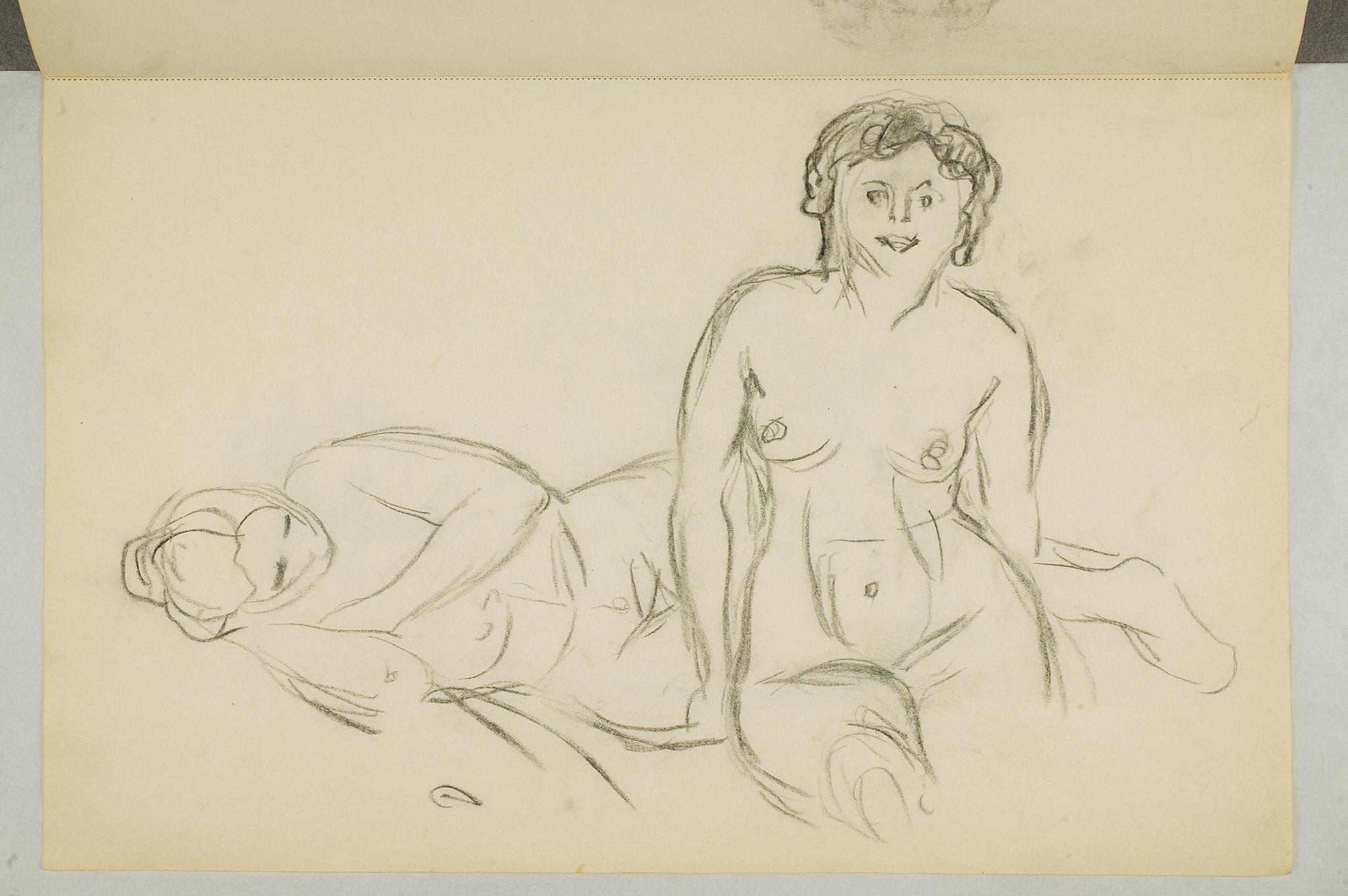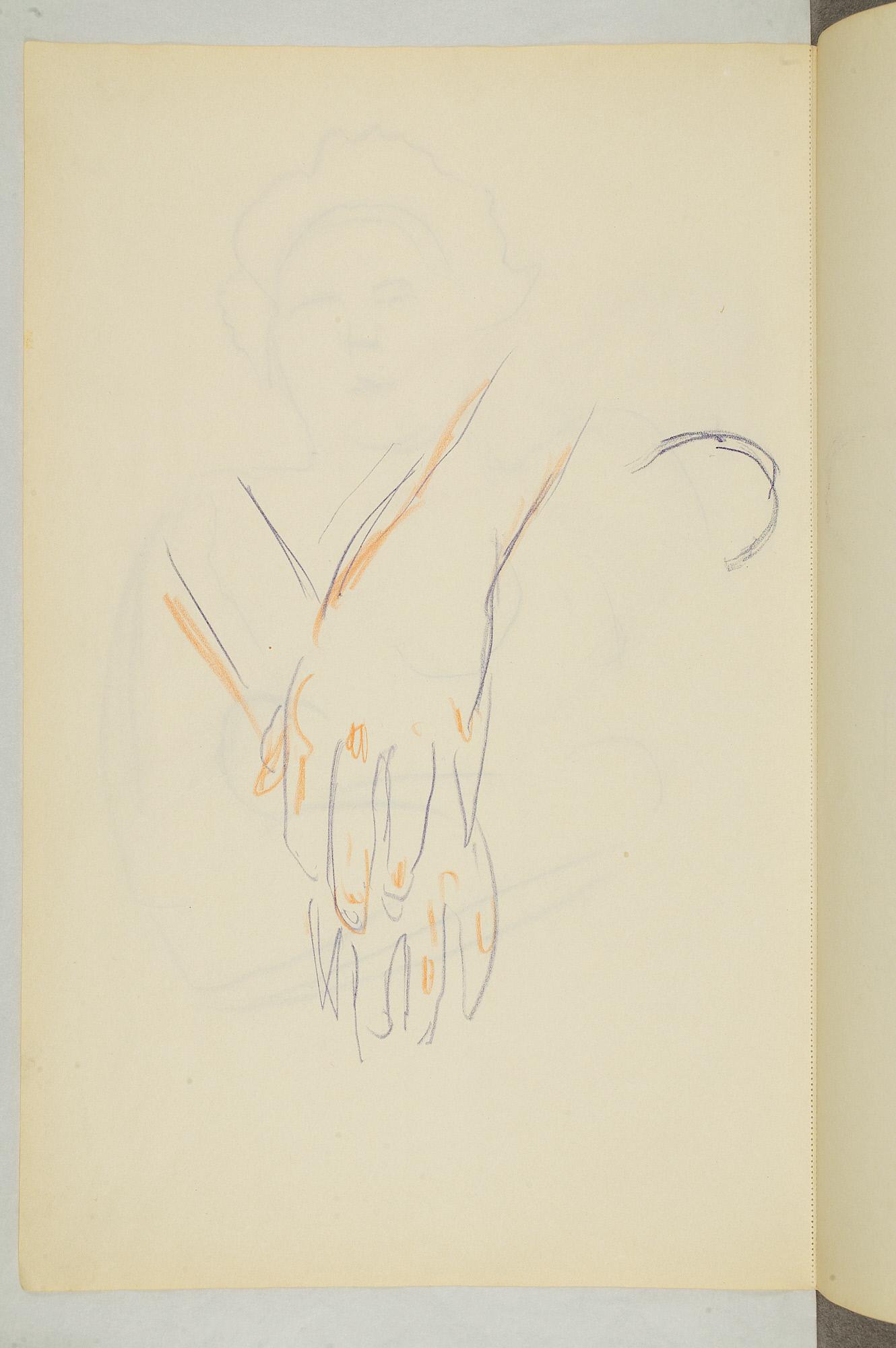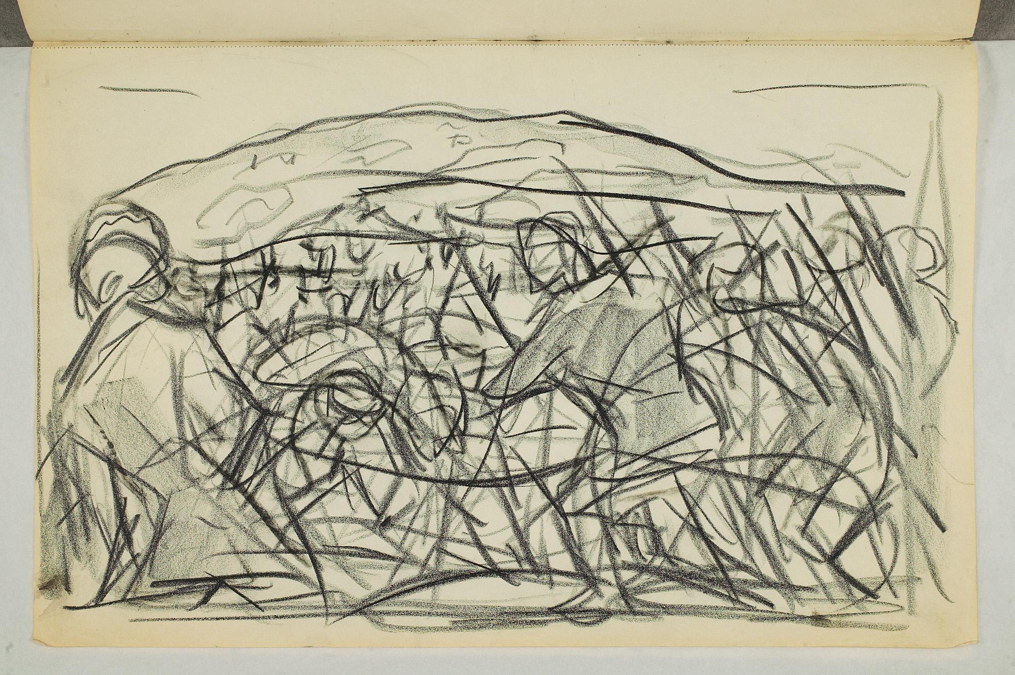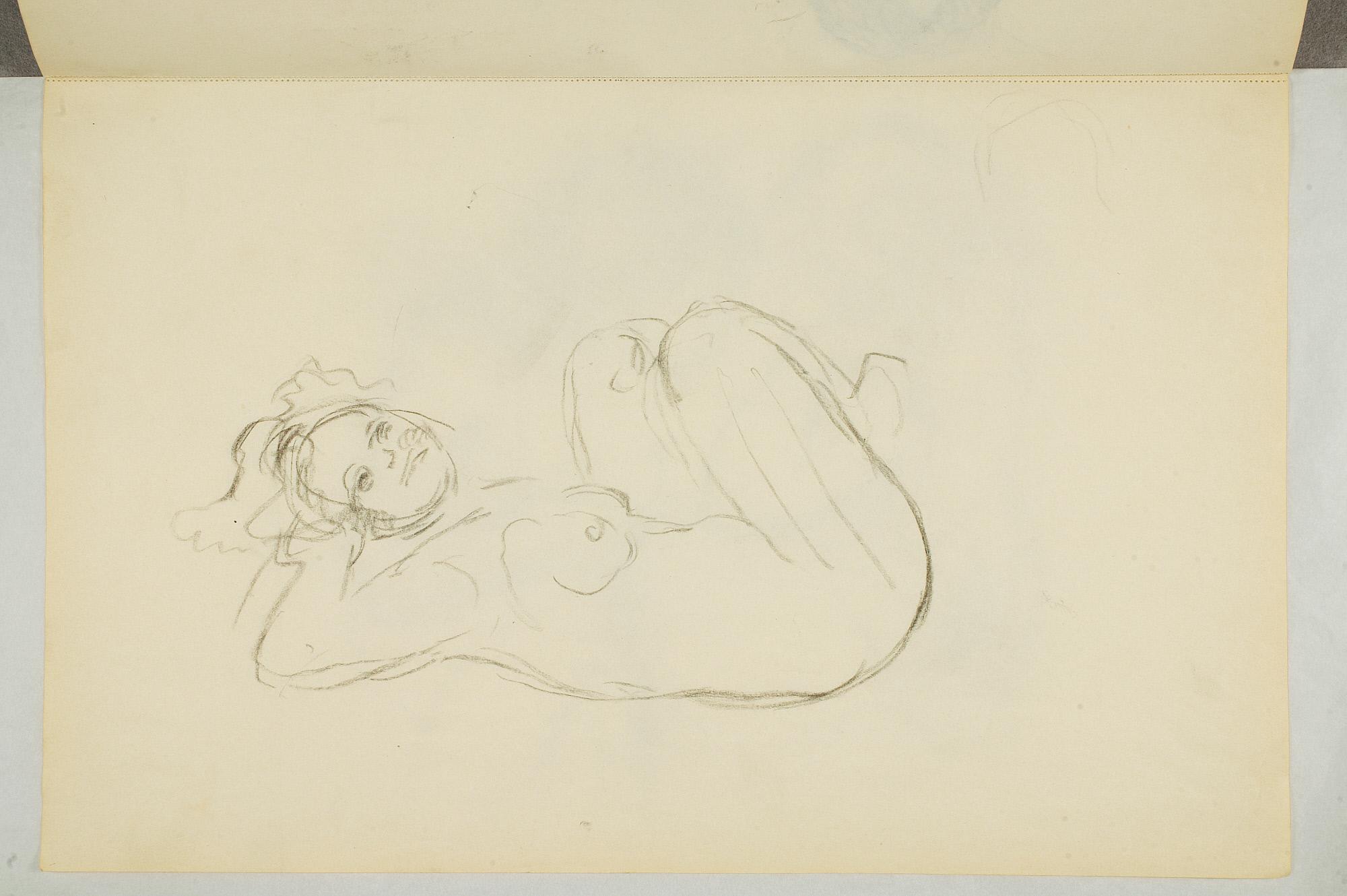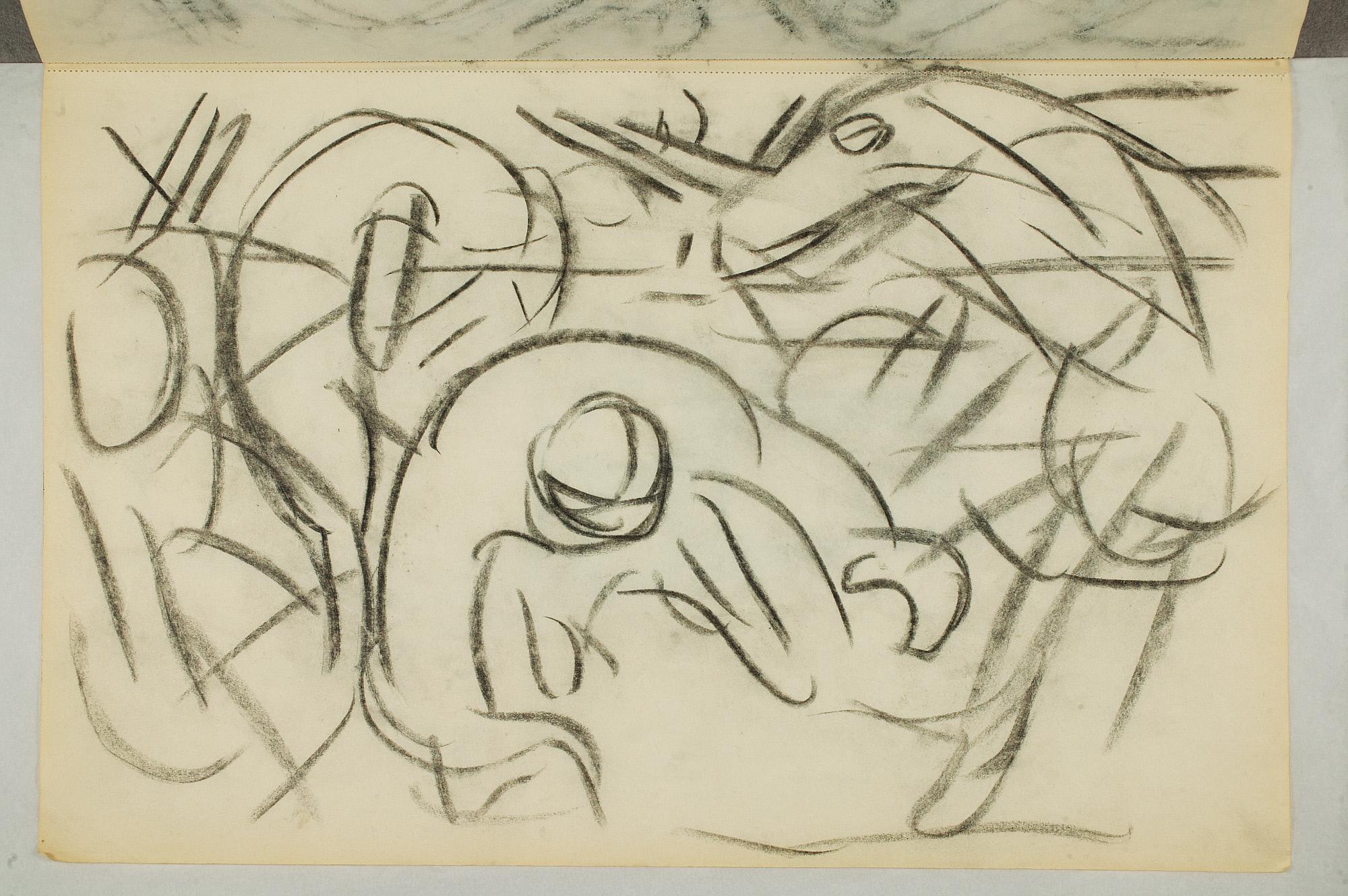 Comment:Tegningen på side 3 verso i denne skisseboken er et forarbeid til maleriet "Gammel mann med naken kvinne i fanget" (MM.M.00289) fra 1913–15, mens tegningen på side 65 verso har en klar sammenheng med de tre litografiene "Treet I", Treet II" og "Treet III" (MM.G.00382, MM.G.00444 og MM.G.00445) fra 1917. Det sannsynligs tidsspennet for boken blir da 1913–18. (MB)