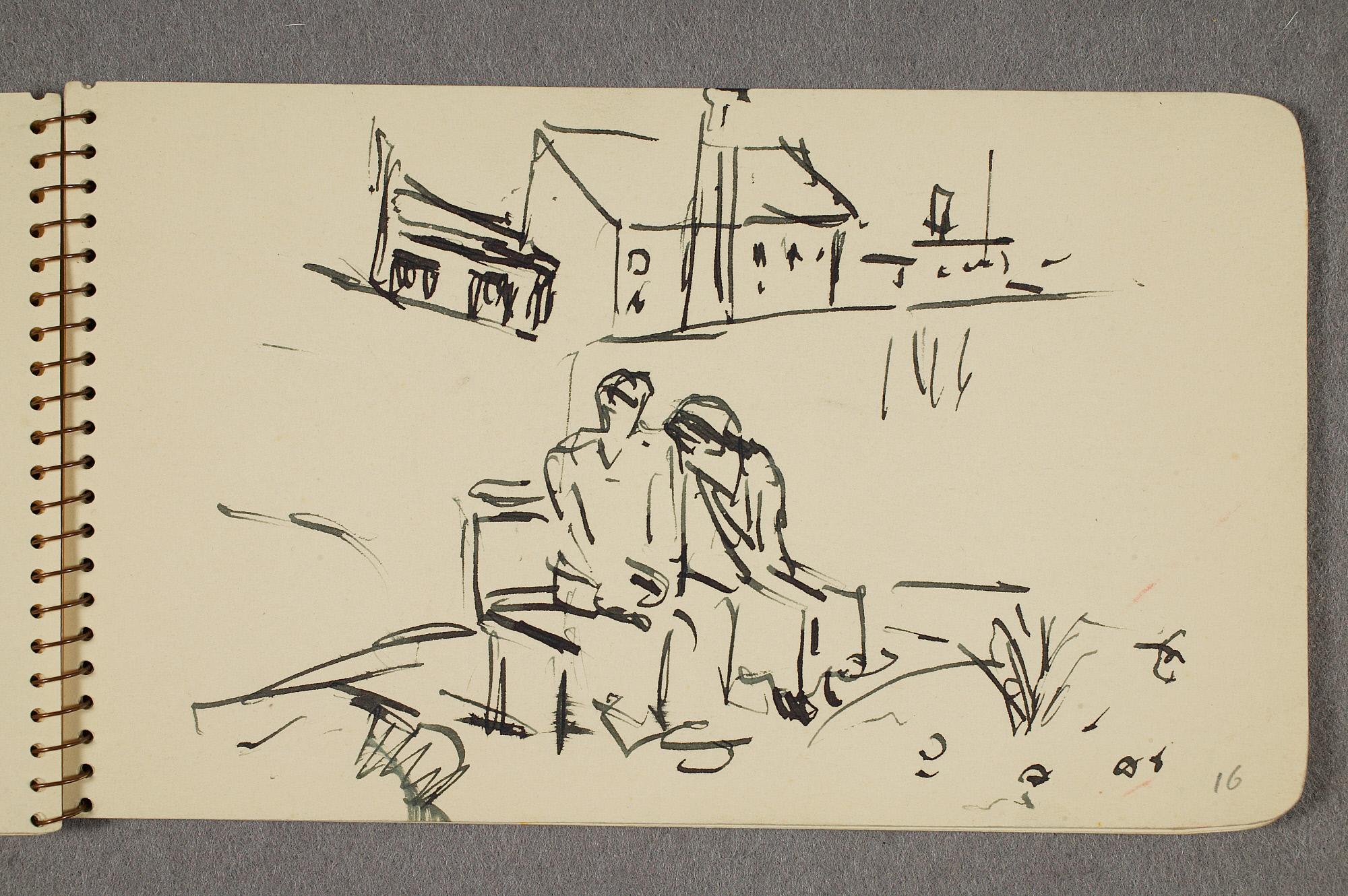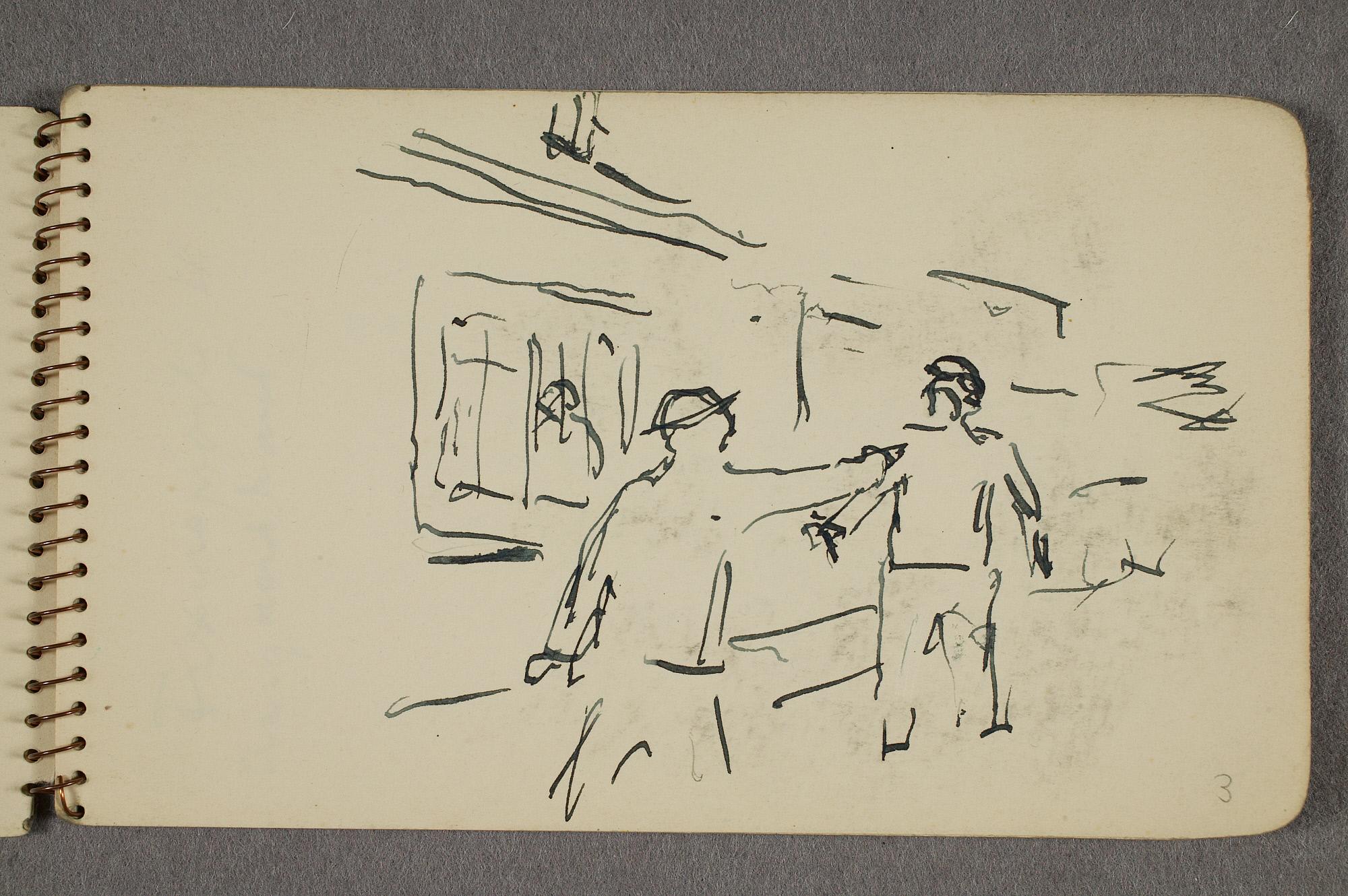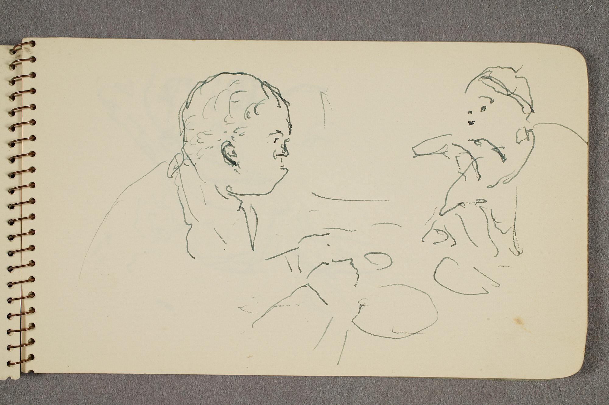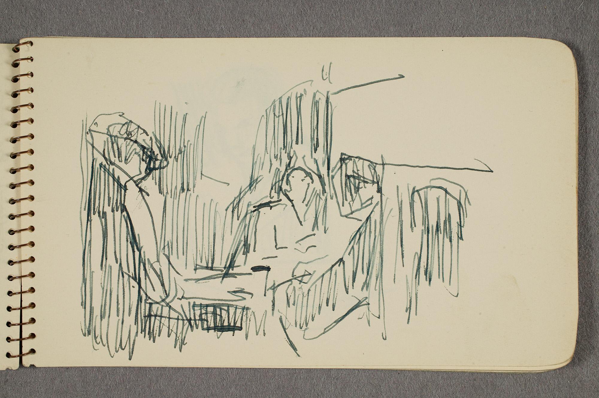Perm: grågrønn papp med spiralrygg, merket Croquis Dessin. 106 × 179 × 0,17 mm (h × b × t)
