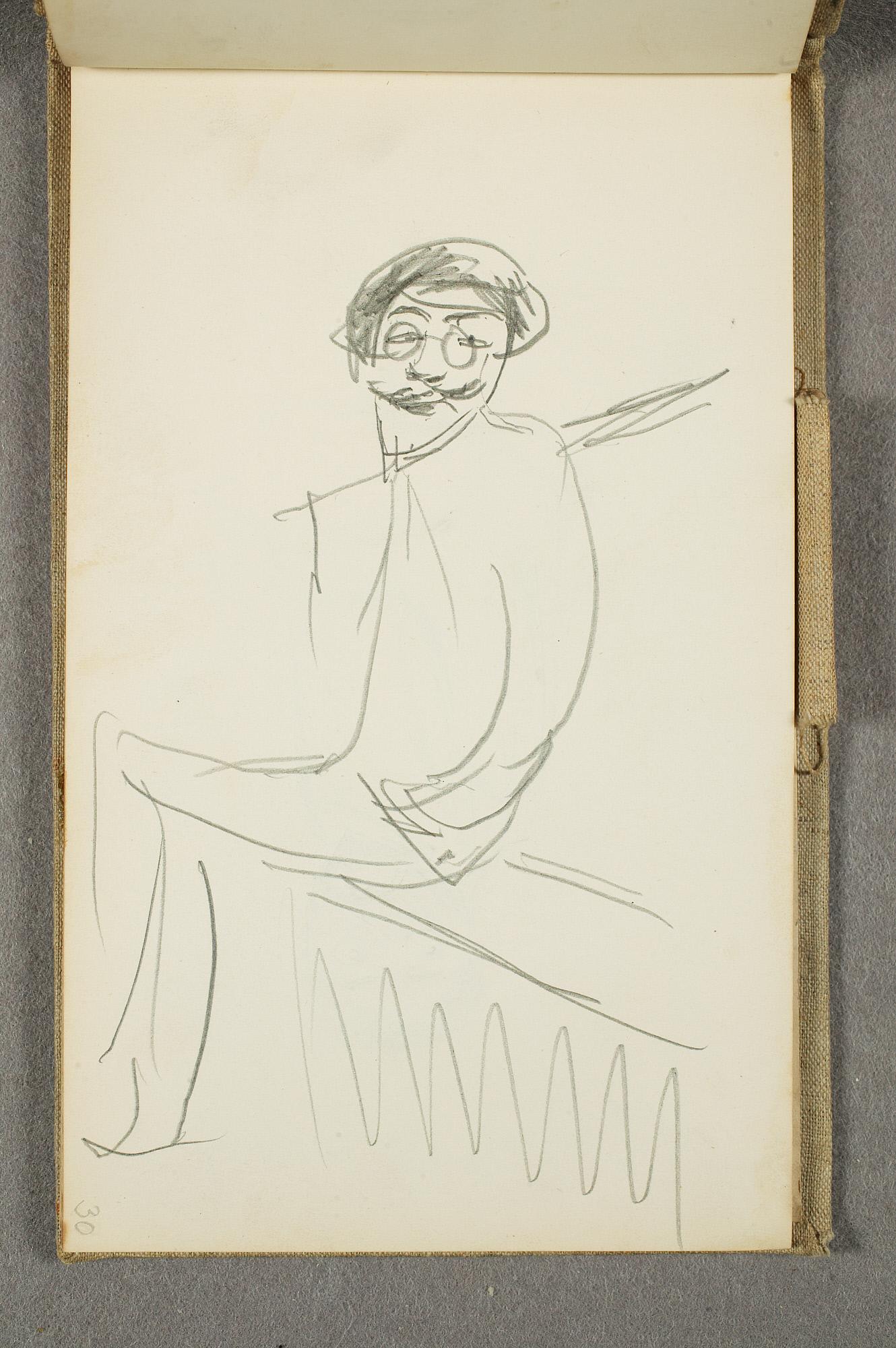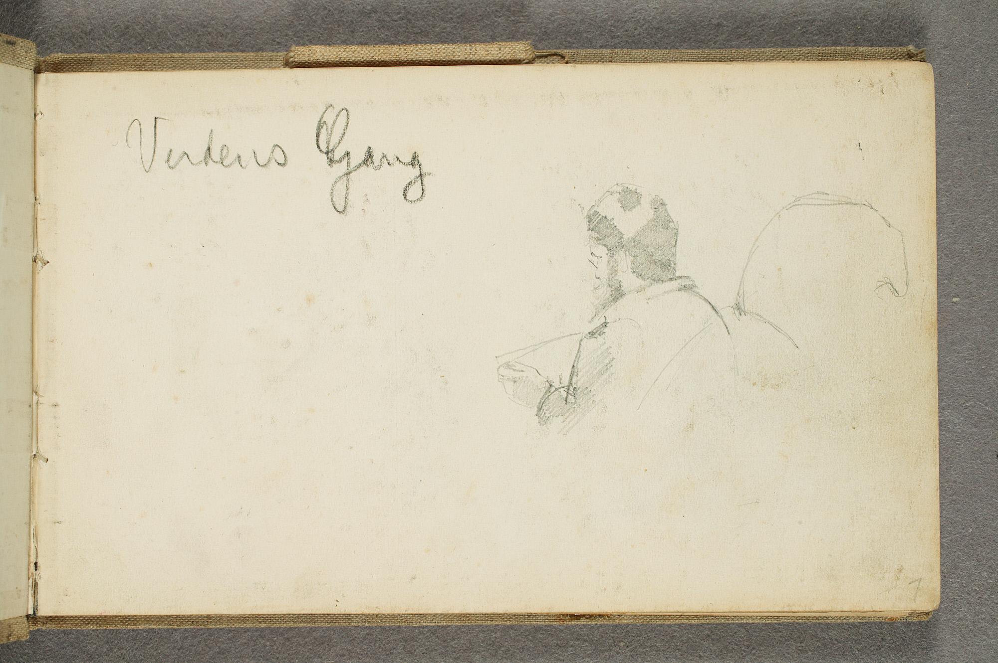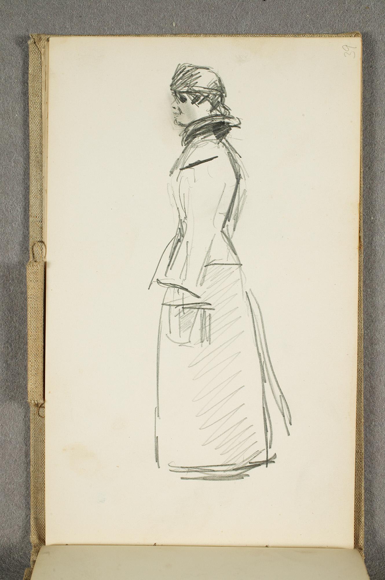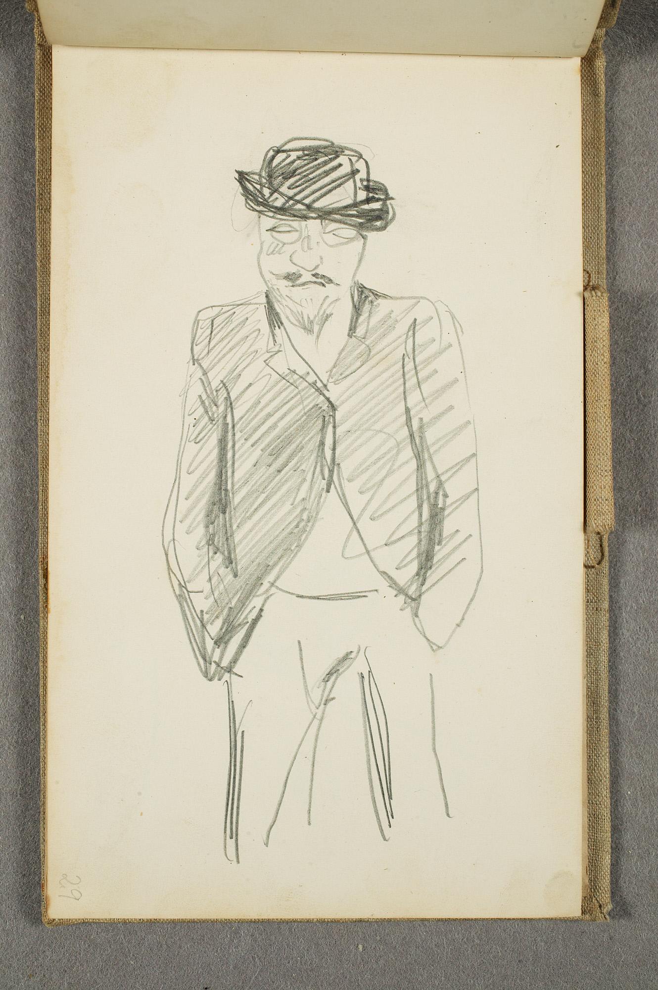 Comment:Denne skisseboken ser ut til å ha vært brukt parallellt med MM.T.00126; mer enn halvparten av tegningene er fra Paris / St. Cloud 1890. Portrettet av komponisten Fredrick Delius (MM.T.00127-25-verso) er trolig laget i forbindelse med en artikkel i VG 12.10.1891, mens de siste tegningene synes å ha en annen karakter, og en noe senere datering. (MB)