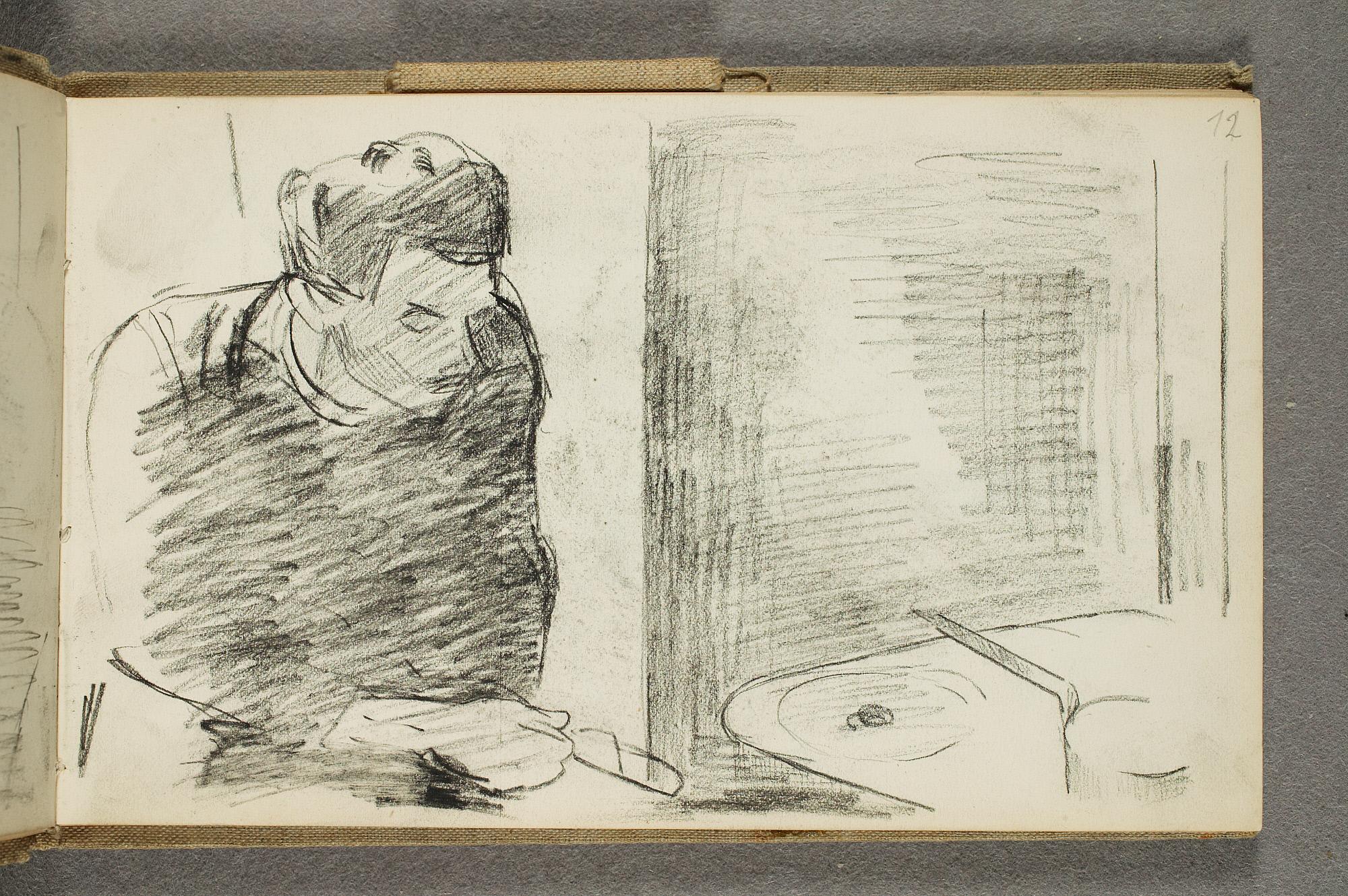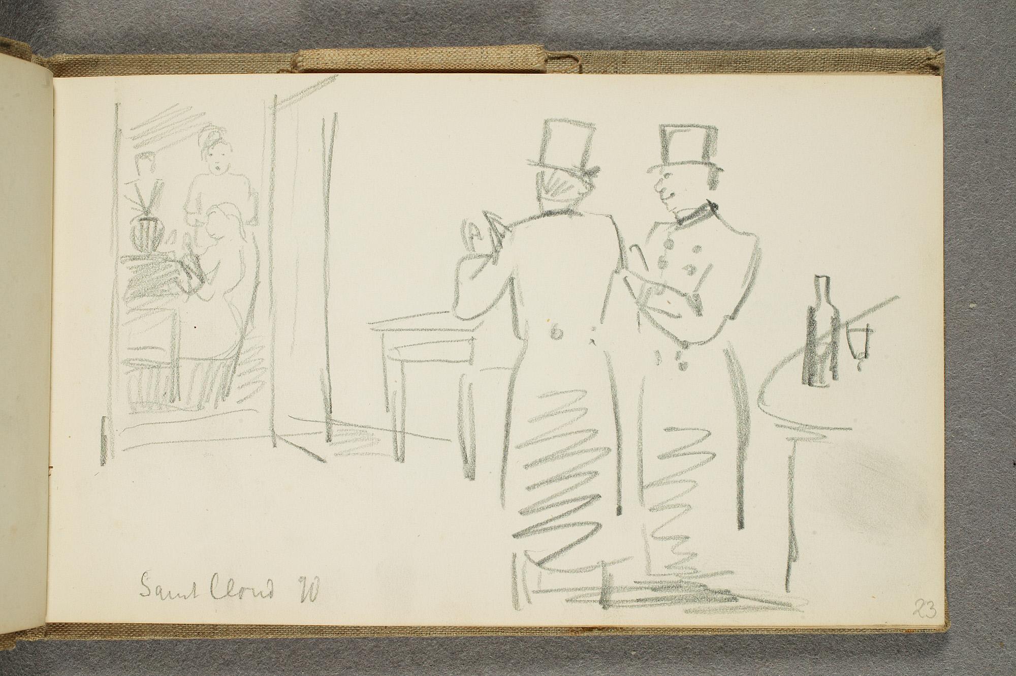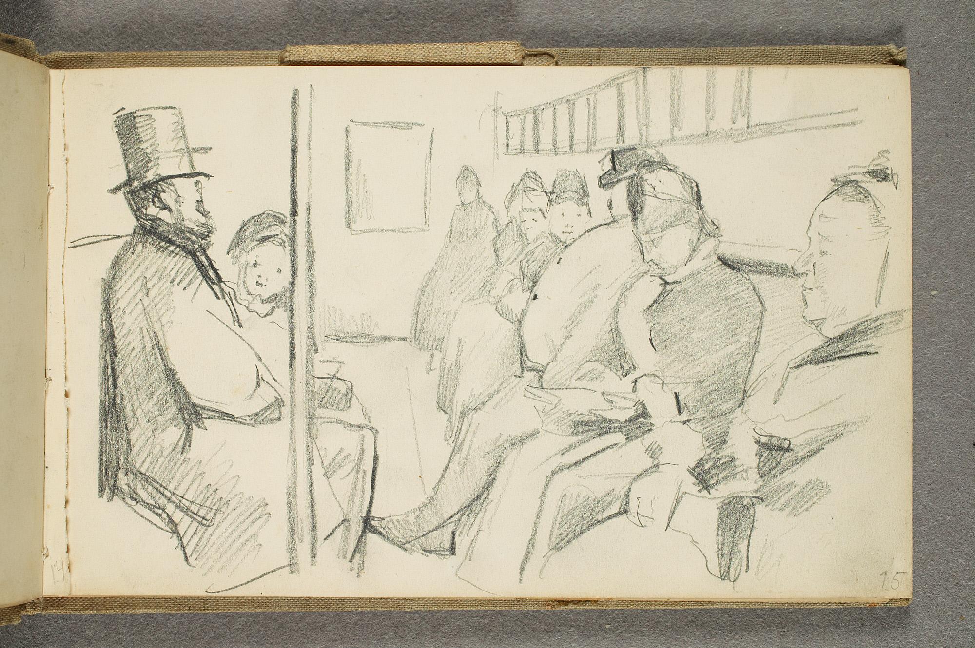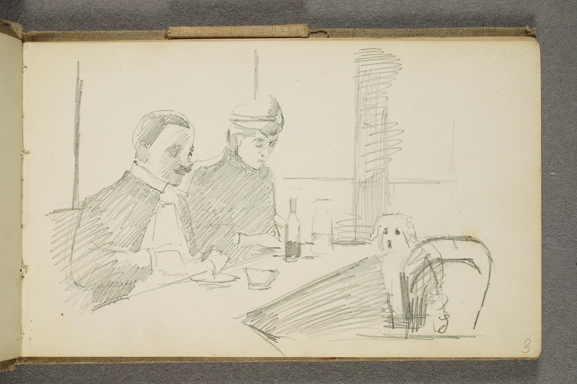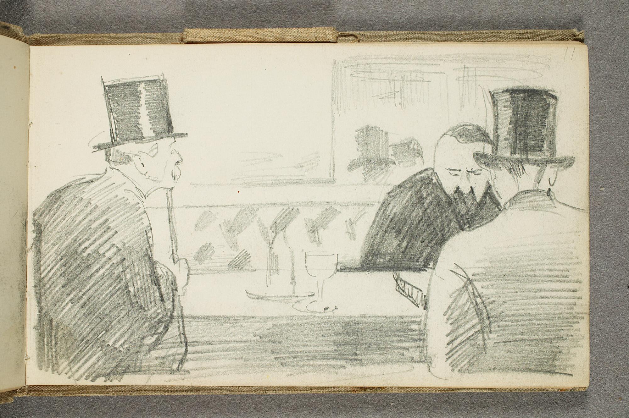Comment:Denne skisseboken ser ut til å ha vært brukt parallellt med MM.T.00126; mer enn halvparten av tegningene er fra Paris / St. Cloud 1890. Portrettet av komponisten Fredrick Delius (MM.T.00127-25-verso) er trolig laget i forbindelse med en artikkel i VG 12.10.1891, mens de siste tegningene synes å ha en annen karakter, og en noe senere datering. (MB)